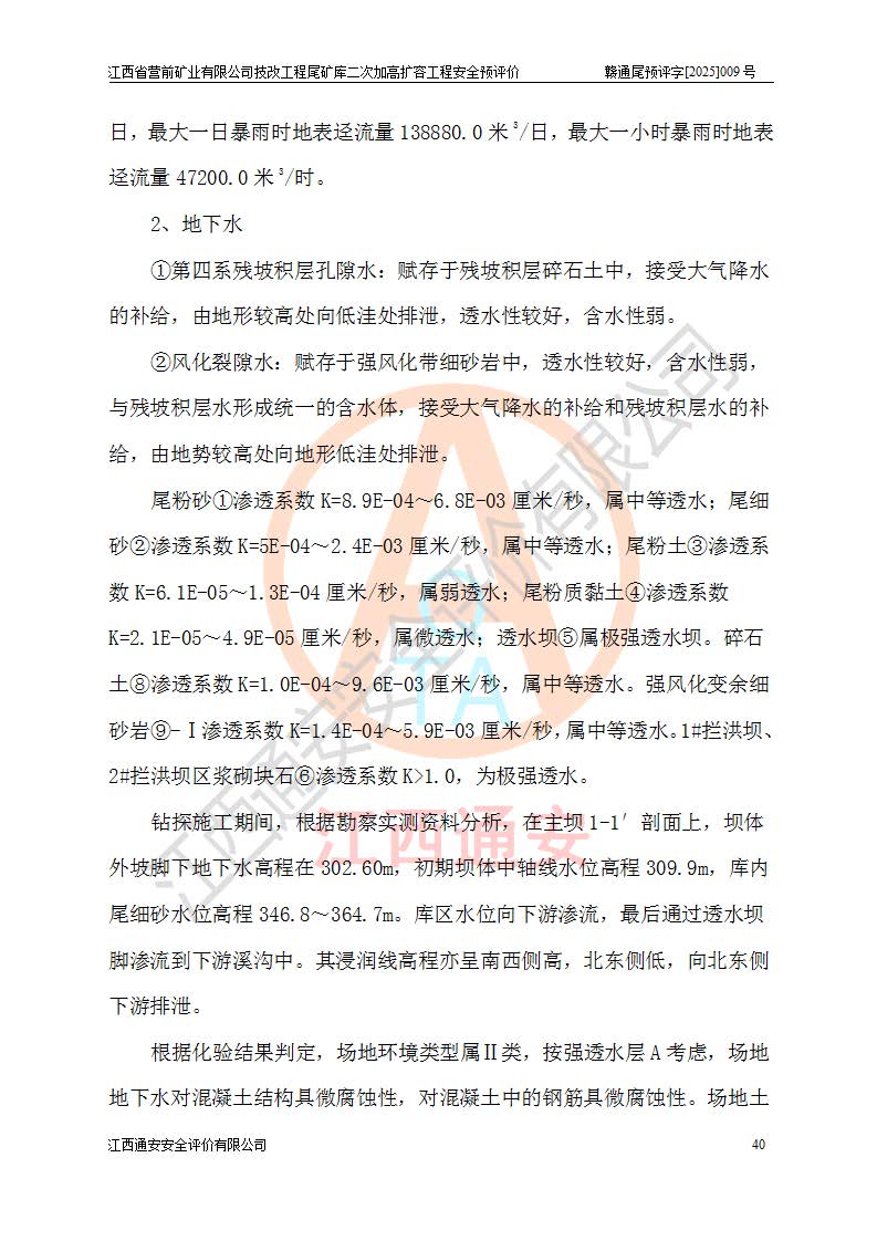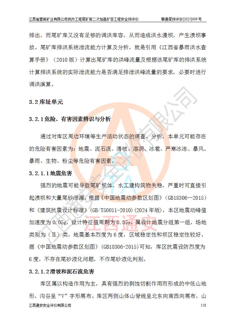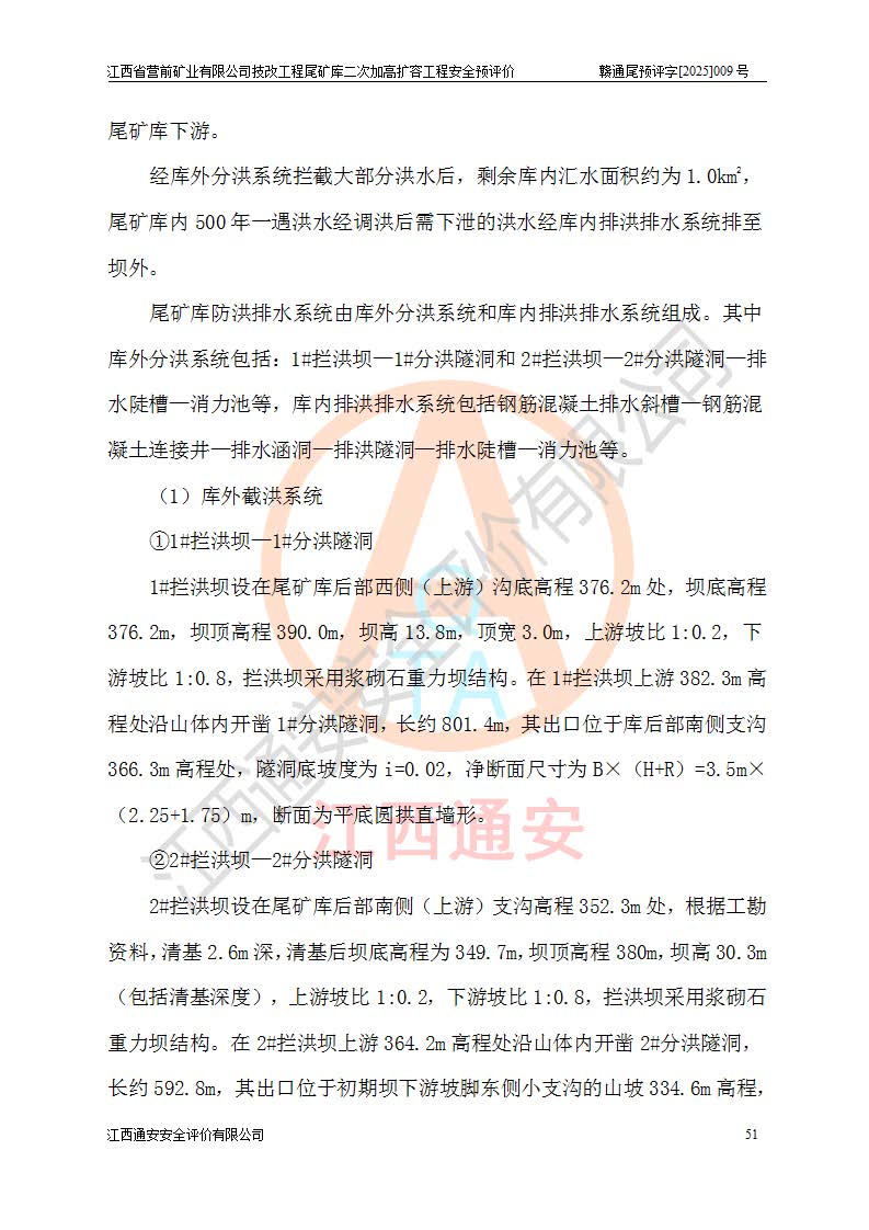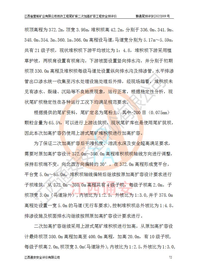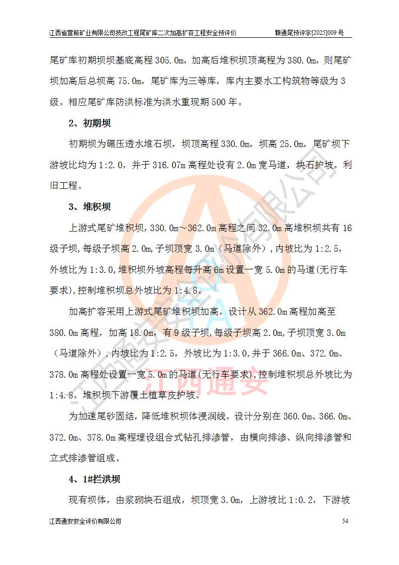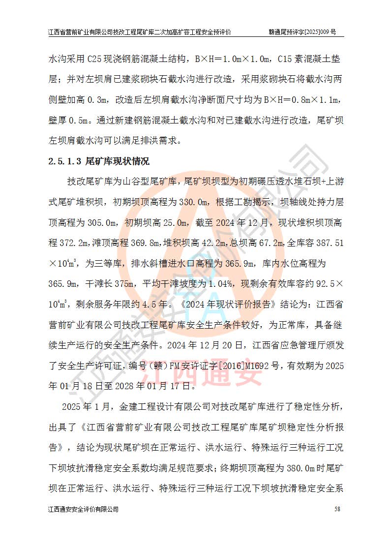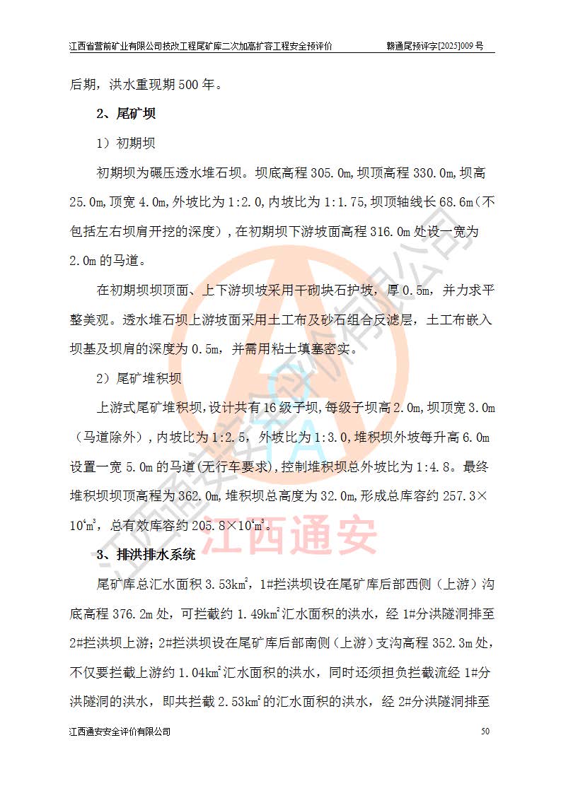 江西省營前礦業(yè)有限公司于2003年12月16日成立,位于贛州市上猶縣營前鎮(zhèn)焦里村境內(nèi),公司注冊資本10000萬元,法定**人陳雅博,礦區(qū)地理坐標(biāo):東經(jīng)114°18′30″~114°19′00″,北緯25°52′35″~25°53′47″。公司經(jīng)營范圍包括:鉛礦、鋅、鎢、銀地下開采、銷售。 江西省營前礦業(yè)有限公司技改工程尾礦庫位于焦里鎢銀鉛鋅礦區(qū),處于上猶縣水巖鄉(xiāng)井子村坑尾自然村境內(nèi),為山谷型尾礦庫。 江西省營前礦業(yè)有限公司技改工程尾礦庫于2013年由福建省冶金工業(yè)設(shè)計(jì)院設(shè)計(jì),2014年8月開始施工建設(shè),2015年4月竣工開始試運(yùn)行,2015年11月完成竣工驗(yàn)收,2016年1月首次取得安全生產(chǎn)許可證,2019年1月完成延期換證,2020年8月委托金建工程設(shè)計(jì)有限公司進(jìn)行尾礦庫加高擴(kuò)容工作,2020年10月21日取得了江西省應(yīng)急管理廳下發(fā)的《關(guān)于江西省營前礦業(yè)有限公司技改工程尾礦庫加高擴(kuò)容工程安全設(shè)施設(shè)計(jì)的審查意見》(贛應(yīng)急非煤項(xiàng)目設(shè)審〔2020〕46號),之后委托駐馬店市黃淮建設(shè)工程有限公司負(fù)責(zé)施工,云南潤滇工程技術(shù)有限公司負(fù)責(zé)監(jiān)理,2021年12月完成加高擴(kuò)容竣工驗(yàn)收工作,經(jīng)過延期,現(xiàn)尾礦庫安全生產(chǎn)許可證編號(贛)FM安許證字[2016]M1692號,**期為2025年01月18日至2028年01月17日。 江西省營前礦業(yè)有限公司技改工程尾礦庫為山谷型尾礦庫,初期壩為透水堆石壩,壩頂高程為330.0m,初期壩高25.0m,后期采用上游式尾礦堆積壩,加高擴(kuò)容后*終壩頂高程為380.0m,堆積壩高50.0m,總壩高為75.0m,總庫容為為503.14×104m3,尾礦庫為三等庫。尾礦庫初期壩以上總匯水面積3.53km2,防洪標(biāo)準(zhǔn)取500年一遇。 目前尾礦庫由初期壩、堆積壩、庫內(nèi)排洪系統(tǒng)(雙格排水斜槽+連接井+排水涵洞+排洪隧洞+排水陡槽+消力池)、1#攔洪壩、1#分洪隧洞、2#攔洪壩、2#分洪隧洞和安全監(jiān)測設(shè)施組成。根據(jù)建設(shè)單位提供的尾礦庫平面布置圖,截至2024年12月,現(xiàn)狀尾礦庫堆積壩頂高程為372.2m,現(xiàn)狀總壩高67.2m,灘頂高程為369.8m,現(xiàn)狀全庫容387.51×104m3,現(xiàn)狀尾礦庫為三等庫,原加高擴(kuò)容設(shè)計(jì)*終堆積壩頂高程為380.0m,現(xiàn)剩余庫容115.63×104m3,剩余**庫容約92.5×104m3,剩余服務(wù)年限約4.5年;礦山現(xiàn)有儲(chǔ)量較大,剩余庫容及服務(wù)年限不滿足礦山后期生產(chǎn)需要。 技改工程尾礦庫尾礦壩下游1**范圍無居民,不存在工礦企業(yè)等建構(gòu)筑物,不屬于“頭頂庫”;尾礦庫不壓礦;距贛江直線距離60**;不涉及保護(hù)區(qū)及生態(tài)紅線;尾礦庫所在溝谷較長,谷底平均縱坡9%,上游周邊山體地形有利于尾礦庫二次加高擴(kuò)容工程的實(shí)施,因此為了增加尾礦庫庫容,延長服務(wù)年限,充分利用尾礦庫所在溝谷地形,江西省營前礦業(yè)有限公司對技改尾礦庫進(jìn)行二次加高擴(kuò)容。 2024年12月,江西省營前礦業(yè)有限公司委托地礦贛西地質(zhì)工程勘察院編制了《江西省營前礦業(yè)有限公司技改工程尾礦庫二次擴(kuò)容工程(水文)地質(zhì)勘察報(bào)告》,2025年4月,江西省營前礦業(yè)有限公司委托金建工程設(shè)計(jì)有限公司編制了《江西省營前礦業(yè)有限公司技改工程尾礦庫二次加高擴(kuò)容工程可行性研究報(bào)告》。 按照非煤礦山建設(shè)項(xiàng)目安全設(shè)施“三同時(shí)”的規(guī)定要求,技改工程尾礦庫為二次加高擴(kuò)容工程,**進(jìn)行安全預(yù)評價(jià);江西省營前礦業(yè)有限公司委托我公司承擔(dān)技改工程尾礦庫二次加高擴(kuò)容工程建設(shè)項(xiàng)目的安全預(yù)評價(jià)工作。 |