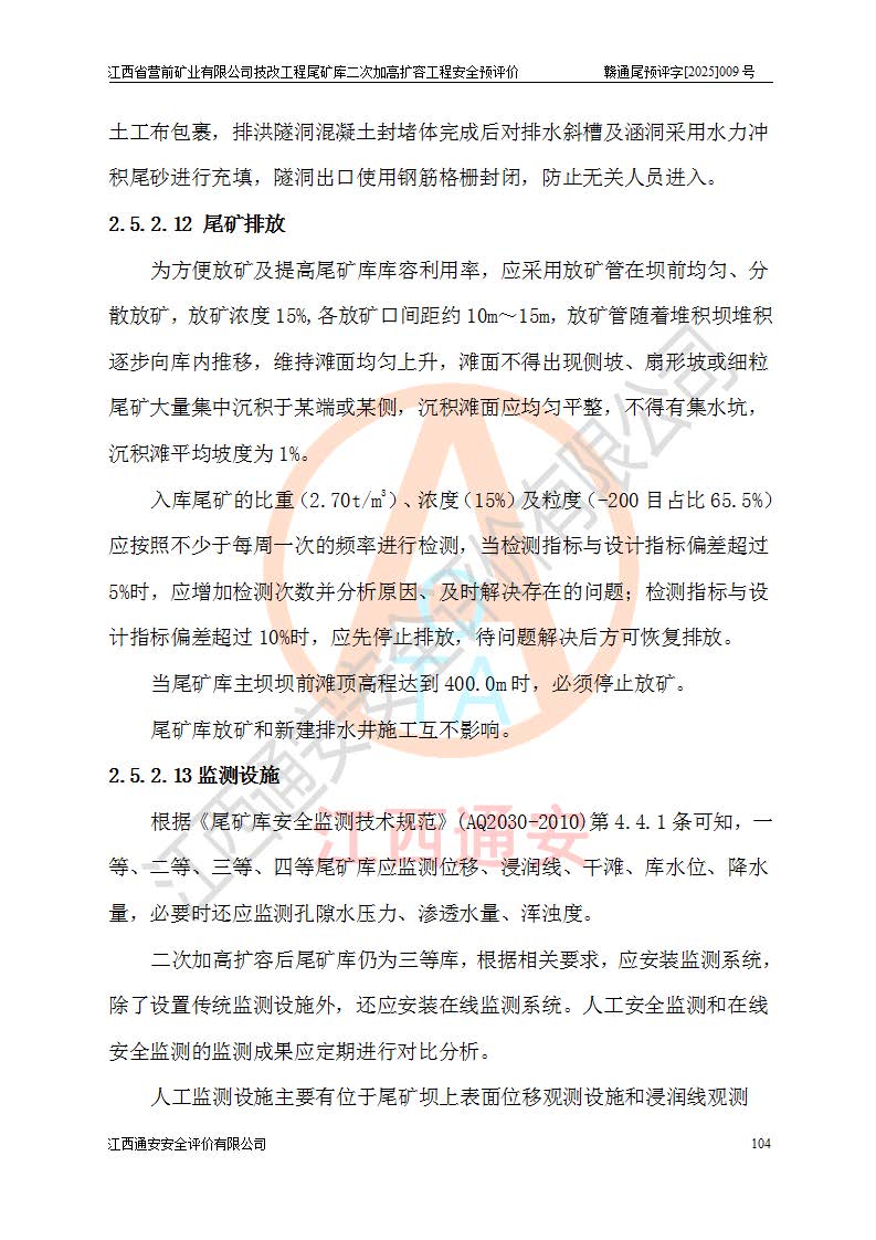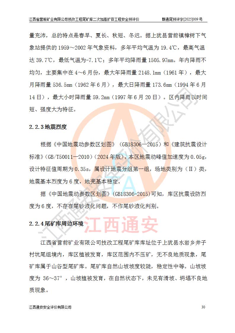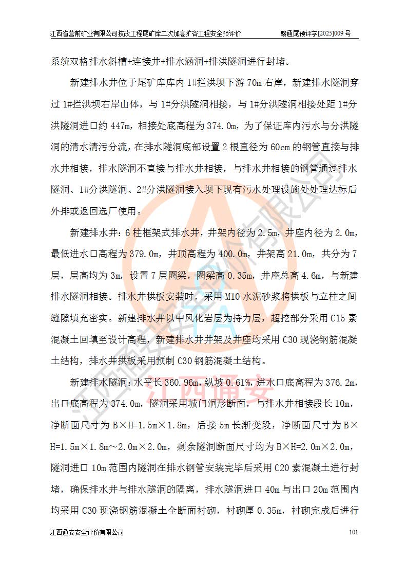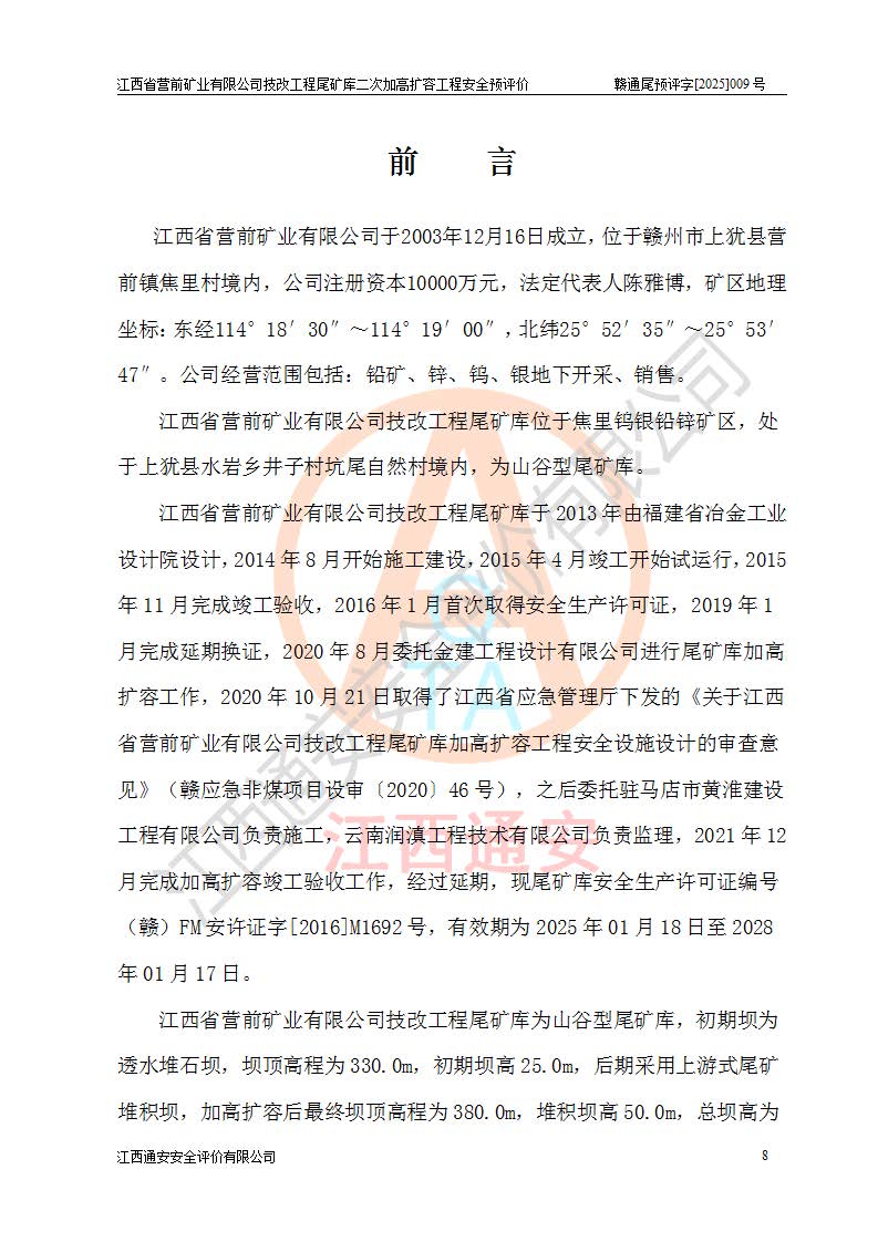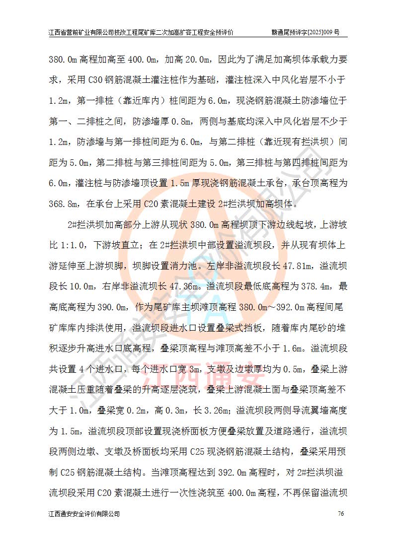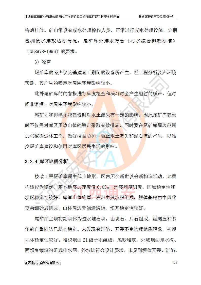 江西省營前礦業(yè)有限公司于2003年12月16日成立,位于贛州市上猶縣營前鎮(zhèn)焦里村境內(nèi),公司注冊資本10000萬元,法定**人陳雅博,礦區(qū)地理坐標(biāo):東經(jīng)114°18′30″~114°19′00″,北緯25°52′35″~25°53′47″。公司經(jīng)營范圍包括:鉛礦、鋅、鎢、銀地下開采、銷售。 江西省營前礦業(yè)有限公司技改工程尾礦庫位于焦里鎢銀鉛鋅礦區(qū),處于上猶縣水巖鄉(xiāng)井子村坑尾自然村境內(nèi),為山谷型尾礦庫。 江西省營前礦業(yè)有限公司技改工程尾礦庫于2013年由福建省冶金工業(yè)設(shè)計(jì)院設(shè)計(jì),2014年8月開始施工建設(shè),2015年4月竣工開始試運(yùn)行,2015年11月完成竣工驗(yàn)收,2016年1月首次取得安全生產(chǎn)許可證,2019年1月完成延期換證,2020年8月委托金建工程設(shè)計(jì)有限公司進(jìn)行尾礦庫加高擴(kuò)容工作,2020年10月21日取得了江西省應(yīng)急管理廳下發(fā)的《關(guān)于江西省營前礦業(yè)有限公司技改工程尾礦庫加高擴(kuò)容工程安全設(shè)施設(shè)計(jì)的審查意見》(贛應(yīng)急非煤項(xiàng)目設(shè)審〔2020〕46號),之后委托駐馬店市黃淮建設(shè)工程有限公司負(fù)責(zé)施工,云南潤滇工程技術(shù)有限公司負(fù)責(zé)監(jiān)理,2021年12月完成加高擴(kuò)容竣工驗(yàn)收工作,經(jīng)過延期,現(xiàn)尾礦庫安全生產(chǎn)許可證編號(贛)FM安許證字[2016]M1692號,**期為2025年01月18日至2028年01月17日。 江西省營前礦業(yè)有限公司技改工程尾礦庫為山谷型尾礦庫,初期壩為透水堆石壩,壩頂高程為330.0m,初期壩高25.0m,后期采用上游式尾礦堆積壩,加高擴(kuò)容后*終壩頂高程為380.0m,堆積壩高50.0m,總壩高為75.0m,總庫容為為503.14×104m3,尾礦庫為三等庫。尾礦庫初期壩以上總匯水面積3.53km2,防洪標(biāo)準(zhǔn)取500年一遇。 目前尾礦庫由初期壩、堆積壩、庫內(nèi)排洪系統(tǒng)(雙格排水斜槽+連接井+排水涵洞+排洪隧洞+排水陡槽+消力池)、1#攔洪壩、1#分洪隧洞、2#攔洪壩、2#分洪隧洞和安全監(jiān)測設(shè)施組成。根據(jù)建設(shè)單位提供的尾礦庫平面布置圖,截至2024年12月,現(xiàn)狀尾礦庫堆積壩頂高程為372.2m,現(xiàn)狀總壩高67.2m,灘頂高程為369.8m,現(xiàn)狀全庫容387.51×104m3,現(xiàn)狀尾礦庫為三等庫,原加高擴(kuò)容設(shè)計(jì)*終堆積壩頂高程為380.0m,現(xiàn)剩余庫容115.63×104m3,剩余**庫容約92.5×104m3,剩余服務(wù)年限約4.5年;礦山現(xiàn)有儲(chǔ)量較大,剩余庫容及服務(wù)年限不滿足礦山后期生產(chǎn)需要。 技改工程尾礦庫尾礦壩下游1**范圍無居民,不存在工礦企業(yè)等建構(gòu)筑物,不屬于“頭頂庫”;尾礦庫不壓礦;距贛江直線距離60**;不涉及保護(hù)區(qū)及生態(tài)紅線;尾礦庫所在溝谷較長,谷底平均縱坡9%,上游周邊山體地形有利于尾礦庫二次加高擴(kuò)容工程的實(shí)施,因此為了增加尾礦庫庫容,延長服務(wù)年限,充分利用尾礦庫所在溝谷地形,江西省營前礦業(yè)有限公司對技改尾礦庫進(jìn)行二次加高擴(kuò)容。 2024年12月,江西省營前礦業(yè)有限公司委托地礦贛西地質(zhì)工程勘察院編制了《江西省營前礦業(yè)有限公司技改工程尾礦庫二次擴(kuò)容工程(水文)地質(zhì)勘察報(bào)告》,2025年4月,江西省營前礦業(yè)有限公司委托金建工程設(shè)計(jì)有限公司編制了《江西省營前礦業(yè)有限公司技改工程尾礦庫二次加高擴(kuò)容工程可行性研究報(bào)告》。 按照非煤礦山建設(shè)項(xiàng)目安全設(shè)施“三同時(shí)”的規(guī)定要求,技改工程尾礦庫為二次加高擴(kuò)容工程,**進(jìn)行安全預(yù)評價(jià);江西省營前礦業(yè)有限公司委托我公司承擔(dān)技改工程尾礦庫二次加高擴(kuò)容工程建設(shè)項(xiàng)目的安全預(yù)評價(jià)工作。 |