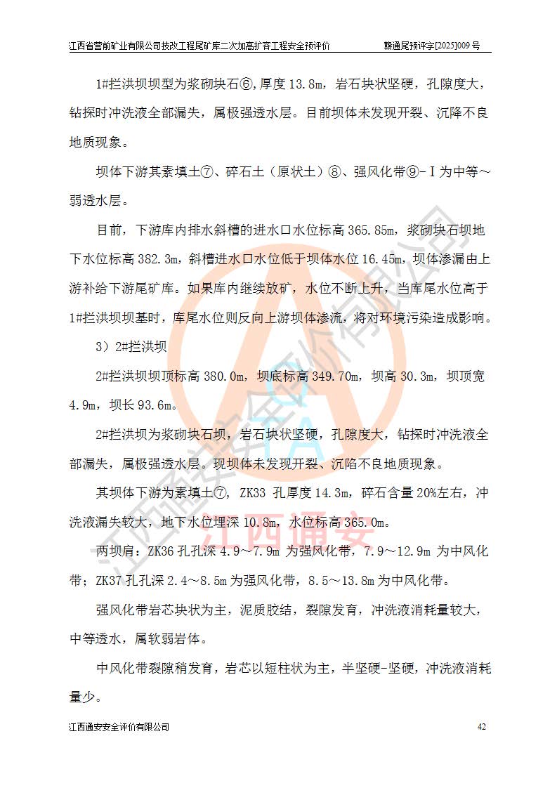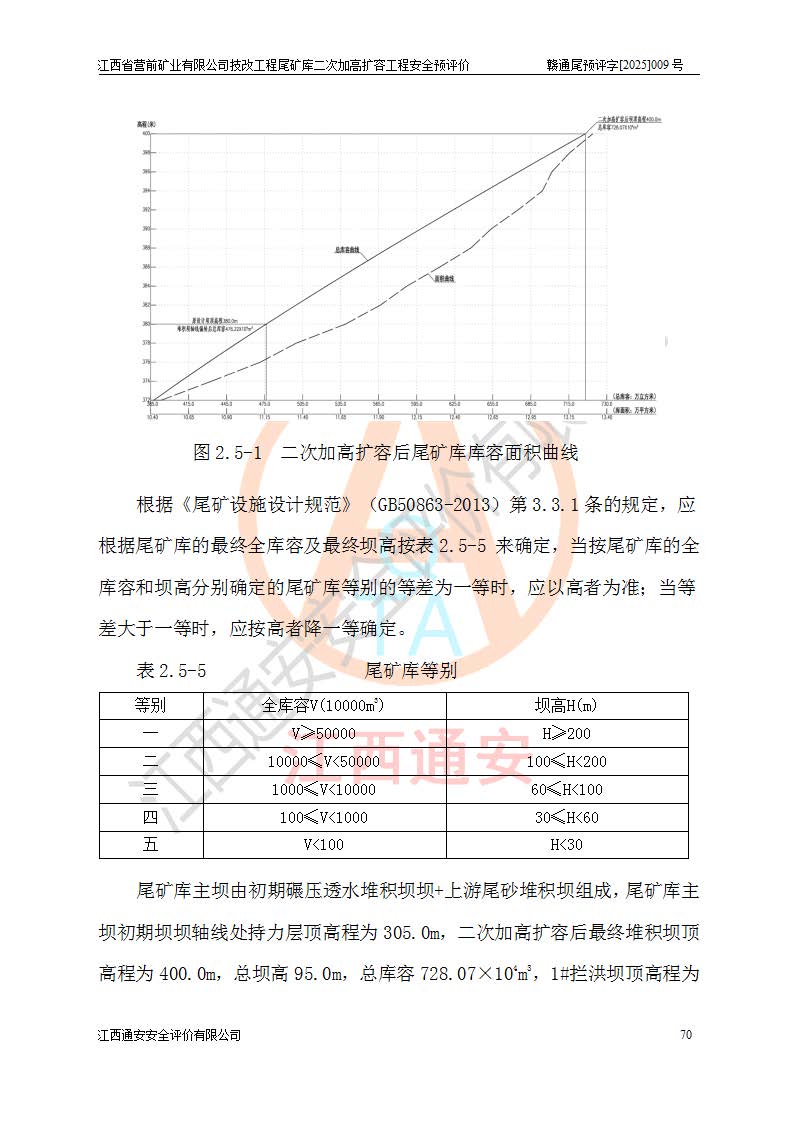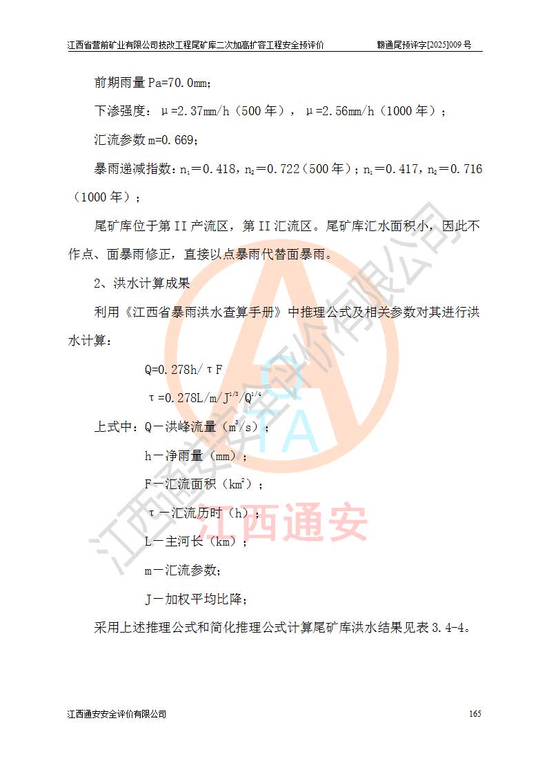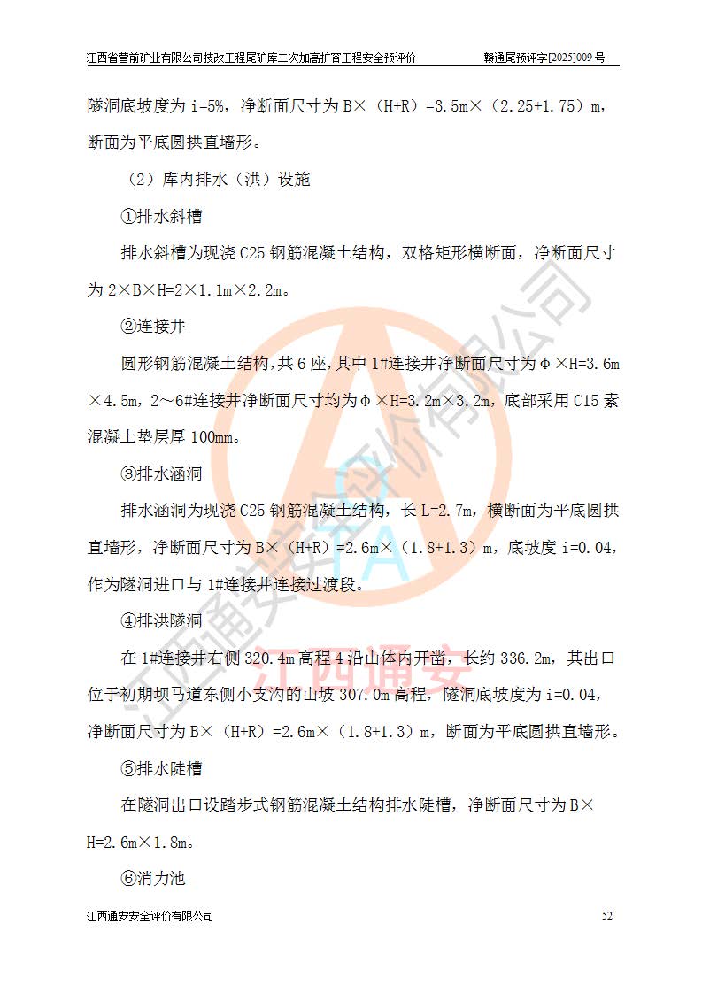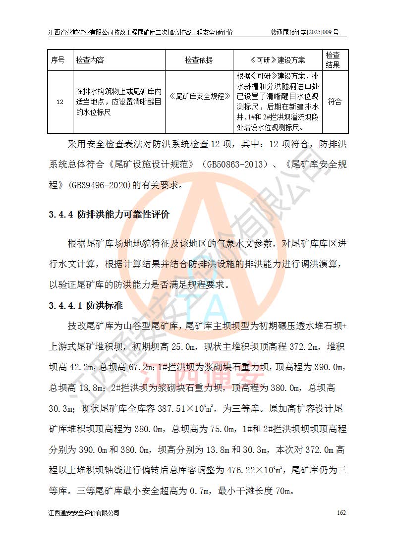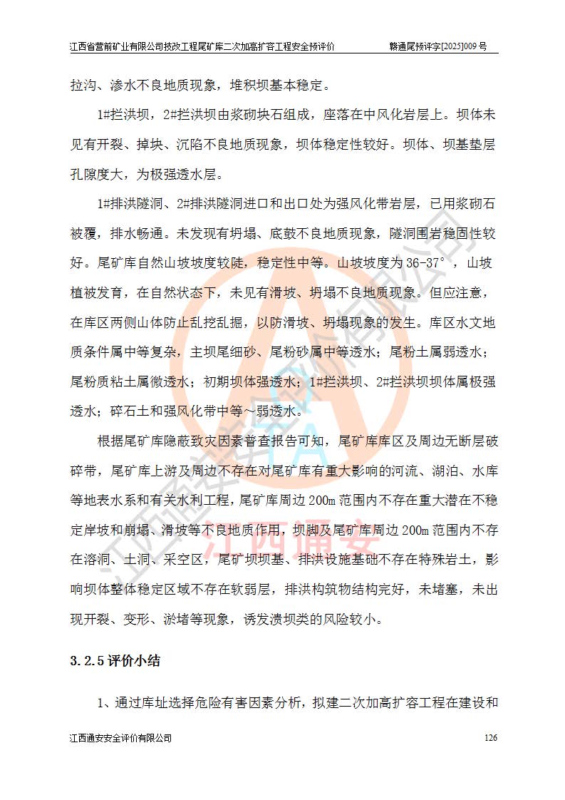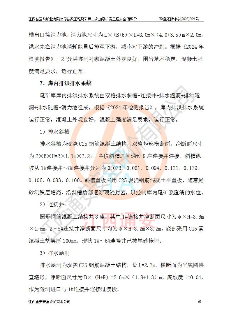 江西省營前礦業(yè)有限公司于2003年12月16日成立,位于贛州市上猶縣營前鎮(zhèn)焦里村境內(nèi),公司注冊資本10000萬元,法定**人陳雅博,礦區(qū)地理坐標(biāo):東經(jīng)114°18′30″~114°19′00″,北緯25°52′35″~25°53′47″。公司經(jīng)營范圍包括:鉛礦、鋅、鎢、銀地下開采、銷售。 江西省營前礦業(yè)有限公司技改工程尾礦庫位于焦里鎢銀鉛鋅礦區(qū),處于上猶縣水巖鄉(xiāng)井子村坑尾自然村境內(nèi),為山谷型尾礦庫。 江西省營前礦業(yè)有限公司技改工程尾礦庫于2013年由福建省冶金工業(yè)設(shè)計(jì)院設(shè)計(jì),2014年8月開始施工建設(shè),2015年4月竣工開始試運(yùn)行,2015年11月完成竣工驗(yàn)收,2016年1月首次取得安全生產(chǎn)許可證,2019年1月完成延期換證,2020年8月委托金建工程設(shè)計(jì)有限公司進(jìn)行尾礦庫加高擴(kuò)容工作,2020年10月21日取得了江西省應(yīng)急管理廳下發(fā)的《關(guān)于江西省營前礦業(yè)有限公司技改工程尾礦庫加高擴(kuò)容工程安全設(shè)施設(shè)計(jì)的審查意見》(贛應(yīng)急非煤項(xiàng)目設(shè)審〔2020〕46號),之后委托駐馬店市黃淮建設(shè)工程有限公司負(fù)責(zé)施工,云南潤滇工程技術(shù)有限公司負(fù)責(zé)監(jiān)理,2021年12月完成加高擴(kuò)容竣工驗(yàn)收工作,經(jīng)過延期,現(xiàn)尾礦庫安全生產(chǎn)許可證編號(贛)FM安許證字[2016]M1692號,**期為2025年01月18日至2028年01月17日。 江西省營前礦業(yè)有限公司技改工程尾礦庫為山谷型尾礦庫,初期壩為透水堆石壩,壩頂高程為330.0m,初期壩高25.0m,后期采用上游式尾礦堆積壩,加高擴(kuò)容后*終壩頂高程為380.0m,堆積壩高50.0m,總壩高為75.0m,總庫容為為503.14×104m3,尾礦庫為三等庫。尾礦庫初期壩以上總匯水面積3.53km2,防洪標(biāo)準(zhǔn)取500年一遇。 目前尾礦庫由初期壩、堆積壩、庫內(nèi)排洪系統(tǒng)(雙格排水斜槽+連接井+排水涵洞+排洪隧洞+排水陡槽+消力池)、1#攔洪壩、1#分洪隧洞、2#攔洪壩、2#分洪隧洞和安全監(jiān)測設(shè)施組成。根據(jù)建設(shè)單位提供的尾礦庫平面布置圖,截至2024年12月,現(xiàn)狀尾礦庫堆積壩頂高程為372.2m,現(xiàn)狀總壩高67.2m,灘頂高程為369.8m,現(xiàn)狀全庫容387.51×104m3,現(xiàn)狀尾礦庫為三等庫,原加高擴(kuò)容設(shè)計(jì)*終堆積壩頂高程為380.0m,現(xiàn)剩余庫容115.63×104m3,剩余**庫容約92.5×104m3,剩余服務(wù)年限約4.5年;礦山現(xiàn)有儲(chǔ)量較大,剩余庫容及服務(wù)年限不滿足礦山后期生產(chǎn)需要。 技改工程尾礦庫尾礦壩下游1**范圍無居民,不存在工礦企業(yè)等建構(gòu)筑物,不屬于“頭頂庫”;尾礦庫不壓礦;距贛江直線距離60**;不涉及保護(hù)區(qū)及生態(tài)紅線;尾礦庫所在溝谷較長,谷底平均縱坡9%,上游周邊山體地形有利于尾礦庫二次加高擴(kuò)容工程的實(shí)施,因此為了增加尾礦庫庫容,延長服務(wù)年限,充分利用尾礦庫所在溝谷地形,江西省營前礦業(yè)有限公司對技改尾礦庫進(jìn)行二次加高擴(kuò)容。 2024年12月,江西省營前礦業(yè)有限公司委托地礦贛西地質(zhì)工程勘察院編制了《江西省營前礦業(yè)有限公司技改工程尾礦庫二次擴(kuò)容工程(水文)地質(zhì)勘察報(bào)告》,2025年4月,江西省營前礦業(yè)有限公司委托金建工程設(shè)計(jì)有限公司編制了《江西省營前礦業(yè)有限公司技改工程尾礦庫二次加高擴(kuò)容工程可行性研究報(bào)告》。 按照非煤礦山建設(shè)項(xiàng)目安全設(shè)施“三同時(shí)”的規(guī)定要求,技改工程尾礦庫為二次加高擴(kuò)容工程,**進(jìn)行安全預(yù)評價(jià);江西省營前礦業(yè)有限公司委托我公司承擔(dān)技改工程尾礦庫二次加高擴(kuò)容工程建設(shè)項(xiàng)目的安全預(yù)評價(jià)工作。 |
