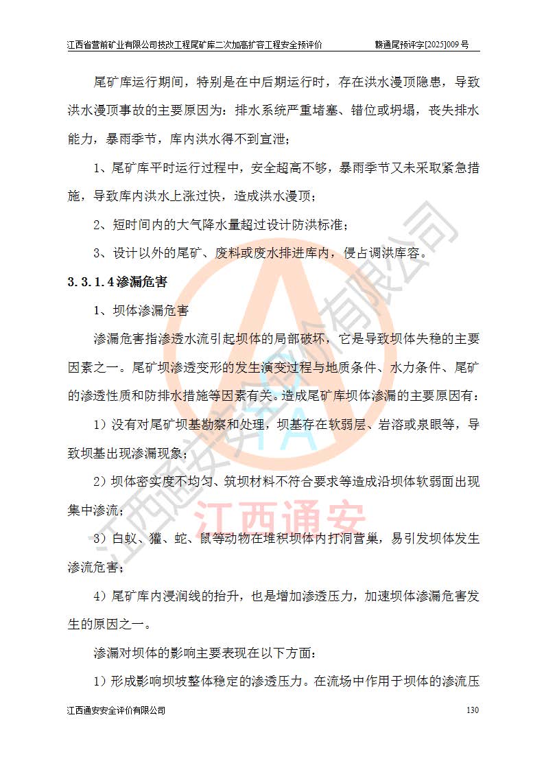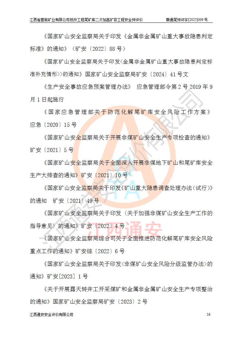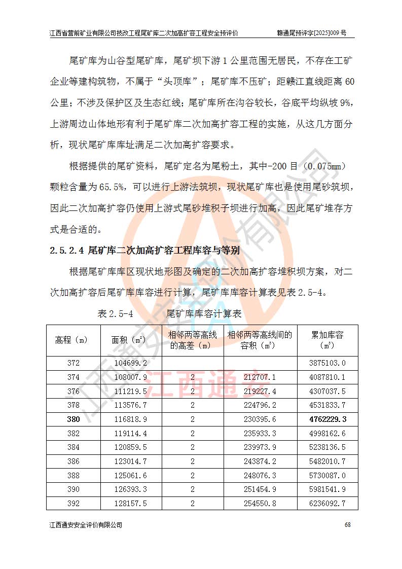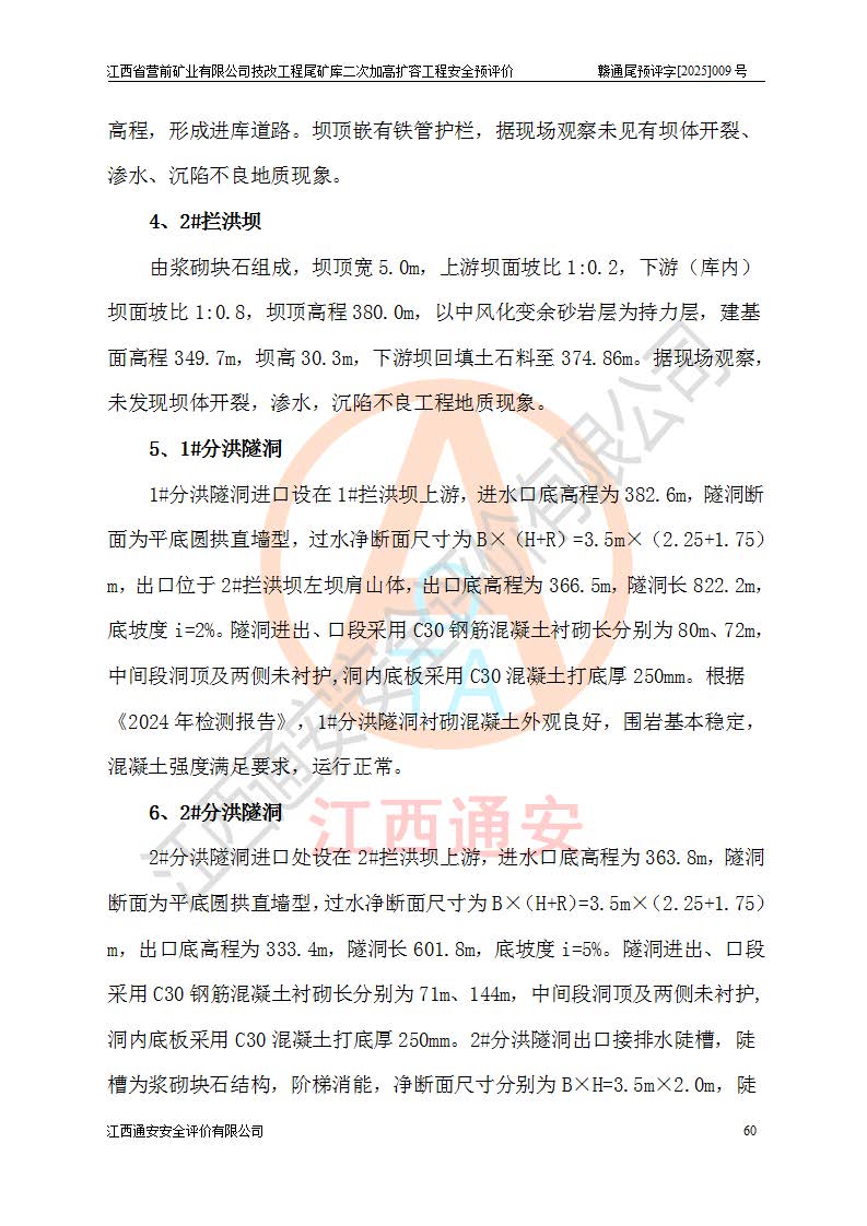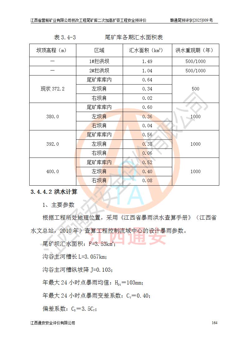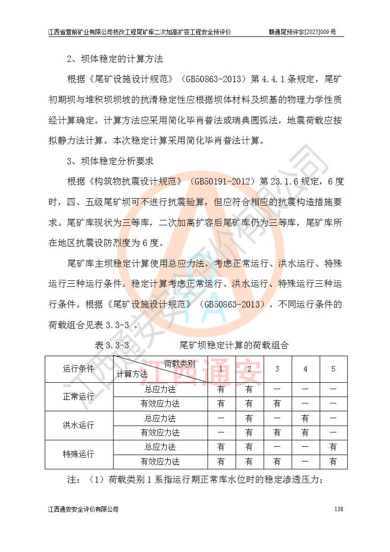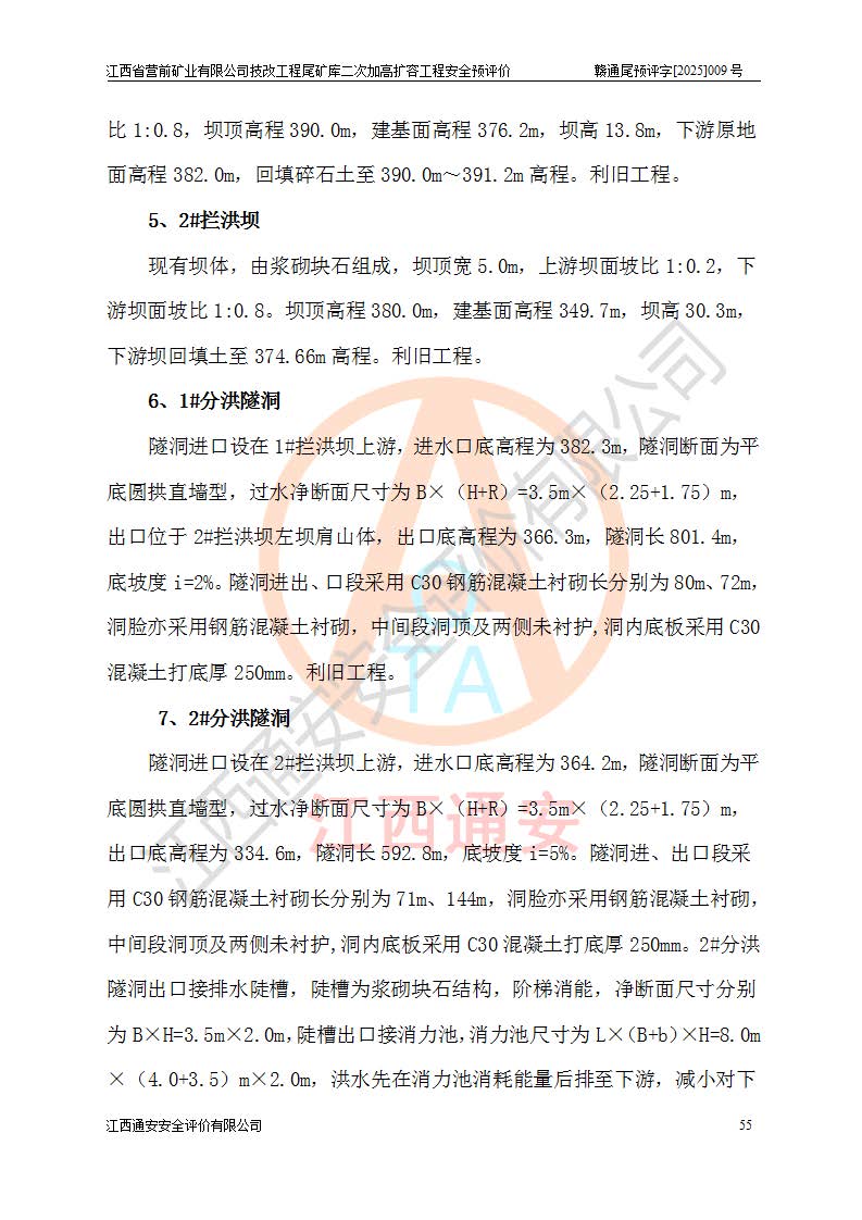 江西省營前礦業(yè)有限公司于2003年12月16日成立,位于贛州市上猶縣營前鎮(zhèn)焦里村境內(nèi),公司注冊資本10000萬元,法定**人陳雅博,礦區(qū)地理坐標(biāo):東經(jīng)114°18′30″~114°19′00″,北緯25°52′35″~25°53′47″。公司經(jīng)營范圍包括:鉛礦、鋅、鎢、銀地下開采、銷售。 江西省營前礦業(yè)有限公司技改工程尾礦庫位于焦里鎢銀鉛鋅礦區(qū),處于上猶縣水巖鄉(xiāng)井子村坑尾自然村境內(nèi),為山谷型尾礦庫。 江西省營前礦業(yè)有限公司技改工程尾礦庫于2013年由福建省冶金工業(yè)設(shè)計(jì)院設(shè)計(jì),2014年8月開始施工建設(shè),2015年4月竣工開始試運(yùn)行,2015年11月完成竣工驗(yàn)收,2016年1月首次取得安全生產(chǎn)許可證,2019年1月完成延期換證,2020年8月委托金建工程設(shè)計(jì)有限公司進(jìn)行尾礦庫加高擴(kuò)容工作,2020年10月21日取得了江西省應(yīng)急管理廳下發(fā)的《關(guān)于江西省營前礦業(yè)有限公司技改工程尾礦庫加高擴(kuò)容工程安全設(shè)施設(shè)計(jì)的審查意見》(贛應(yīng)急非煤項(xiàng)目設(shè)審〔2020〕46號),之后委托駐馬店市黃淮建設(shè)工程有限公司負(fù)責(zé)施工,云南潤滇工程技術(shù)有限公司負(fù)責(zé)監(jiān)理,2021年12月完成加高擴(kuò)容竣工驗(yàn)收工作,經(jīng)過延期,現(xiàn)尾礦庫安全生產(chǎn)許可證編號(贛)FM安許證字[2016]M1692號,**期為2025年01月18日至2028年01月17日。 江西省營前礦業(yè)有限公司技改工程尾礦庫為山谷型尾礦庫,初期壩為透水堆石壩,壩頂高程為330.0m,初期壩高25.0m,后期采用上游式尾礦堆積壩,加高擴(kuò)容后*終壩頂高程為380.0m,堆積壩高50.0m,總壩高為75.0m,總庫容為為503.14×104m3,尾礦庫為三等庫。尾礦庫初期壩以上總匯水面積3.53km2,防洪標(biāo)準(zhǔn)取500年一遇。 目前尾礦庫由初期壩、堆積壩、庫內(nèi)排洪系統(tǒng)(雙格排水斜槽+連接井+排水涵洞+排洪隧洞+排水陡槽+消力池)、1#攔洪壩、1#分洪隧洞、2#攔洪壩、2#分洪隧洞和安全監(jiān)測設(shè)施組成。根據(jù)建設(shè)單位提供的尾礦庫平面布置圖,截至2024年12月,現(xiàn)狀尾礦庫堆積壩頂高程為372.2m,現(xiàn)狀總壩高67.2m,灘頂高程為369.8m,現(xiàn)狀全庫容387.51×104m3,現(xiàn)狀尾礦庫為三等庫,原加高擴(kuò)容設(shè)計(jì)*終堆積壩頂高程為380.0m,現(xiàn)剩余庫容115.63×104m3,剩余**庫容約92.5×104m3,剩余服務(wù)年限約4.5年;礦山現(xiàn)有儲(chǔ)量較大,剩余庫容及服務(wù)年限不滿足礦山后期生產(chǎn)需要。 技改工程尾礦庫尾礦壩下游1**范圍無居民,不存在工礦企業(yè)等建構(gòu)筑物,不屬于“頭頂庫”;尾礦庫不壓礦;距贛江直線距離60**;不涉及保護(hù)區(qū)及生態(tài)紅線;尾礦庫所在溝谷較長,谷底平均縱坡9%,上游周邊山體地形有利于尾礦庫二次加高擴(kuò)容工程的實(shí)施,因此為了增加尾礦庫庫容,延長服務(wù)年限,充分利用尾礦庫所在溝谷地形,江西省營前礦業(yè)有限公司對技改尾礦庫進(jìn)行二次加高擴(kuò)容。 2024年12月,江西省營前礦業(yè)有限公司委托地礦贛西地質(zhì)工程勘察院編制了《江西省營前礦業(yè)有限公司技改工程尾礦庫二次擴(kuò)容工程(水文)地質(zhì)勘察報(bào)告》,2025年4月,江西省營前礦業(yè)有限公司委托金建工程設(shè)計(jì)有限公司編制了《江西省營前礦業(yè)有限公司技改工程尾礦庫二次加高擴(kuò)容工程可行性研究報(bào)告》。 按照非煤礦山建設(shè)項(xiàng)目安全設(shè)施“三同時(shí)”的規(guī)定要求,技改工程尾礦庫為二次加高擴(kuò)容工程,**進(jìn)行安全預(yù)評價(jià);江西省營前礦業(yè)有限公司委托我公司承擔(dān)技改工程尾礦庫二次加高擴(kuò)容工程建設(shè)項(xiàng)目的安全預(yù)評價(jià)工作。 |