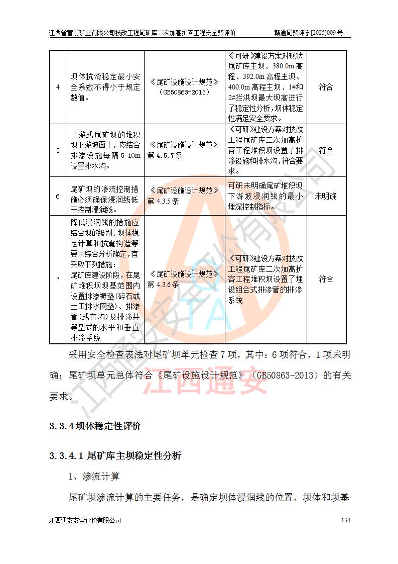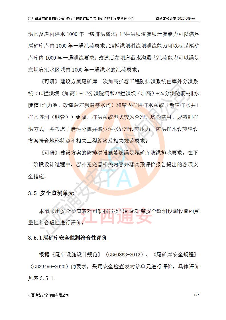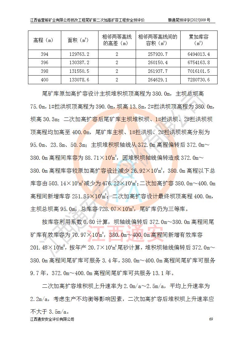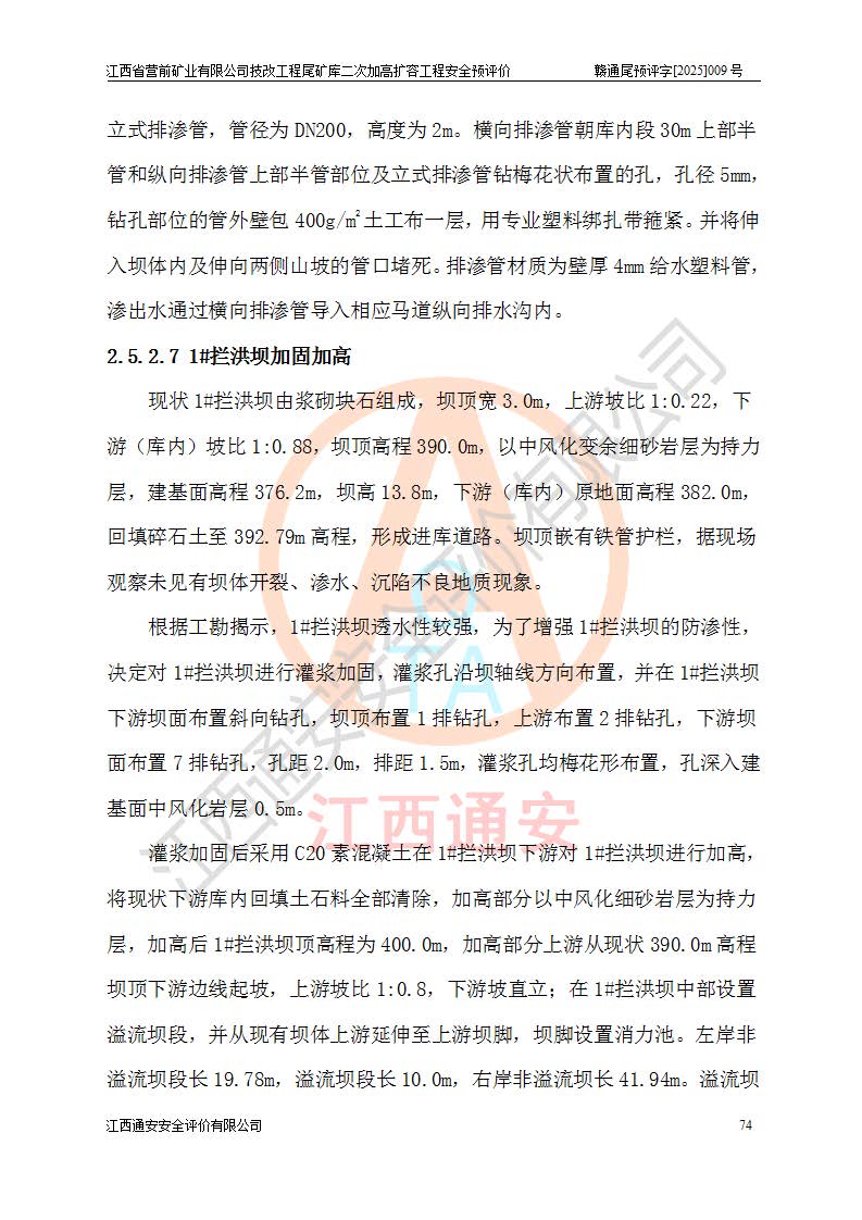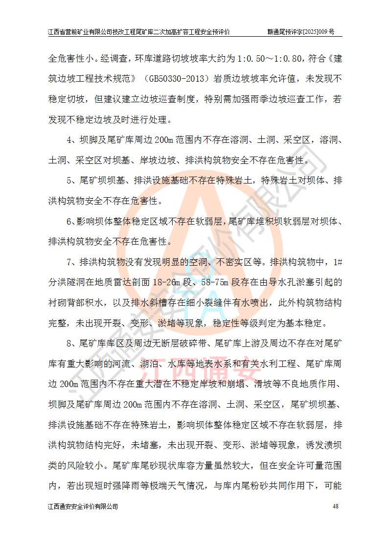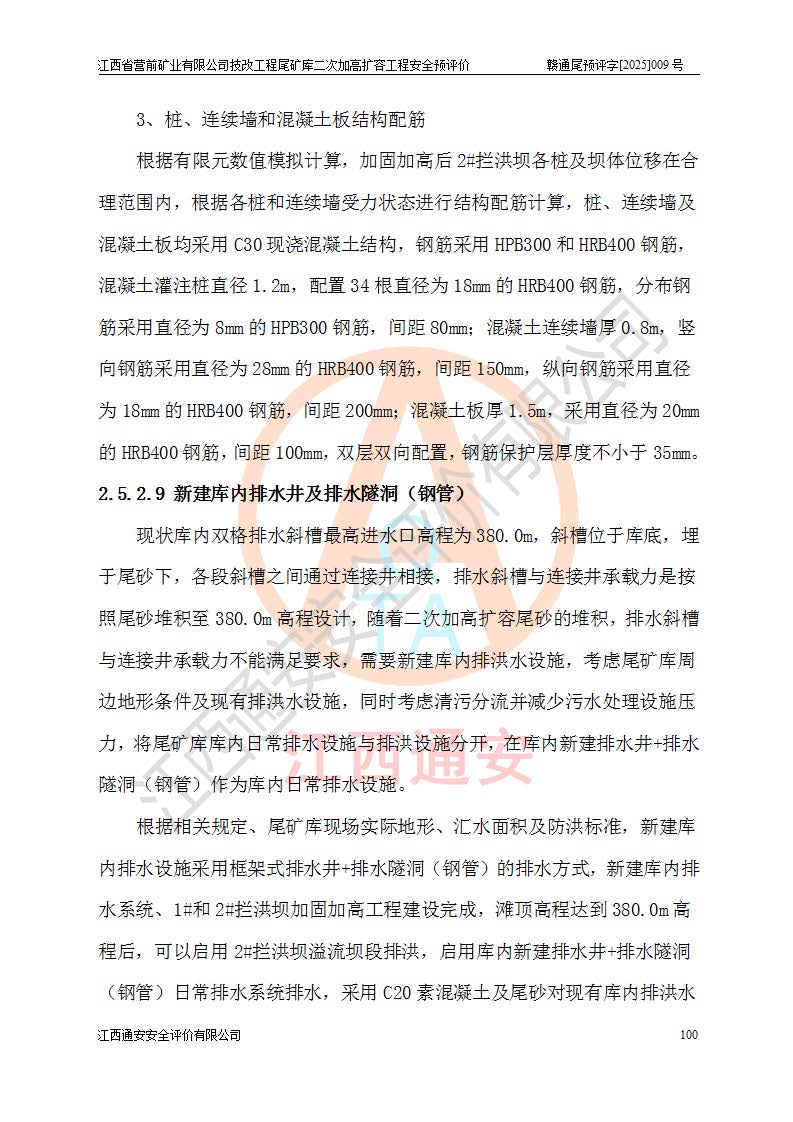 江西省營前礦業(yè)有限公司于2003年12月16日成立,位于贛州市上猶縣營前鎮(zhèn)焦里村境內(nèi),公司注冊資本10000萬元,法定**人陳雅博,礦區(qū)地理坐標(biāo):東經(jīng)114°18′30″~114°19′00″,北緯25°52′35″~25°53′47″。公司經(jīng)營范圍包括:鉛礦、鋅、鎢、銀地下開采、銷售。 江西省營前礦業(yè)有限公司技改工程尾礦庫位于焦里鎢銀鉛鋅礦區(qū),處于上猶縣水巖鄉(xiāng)井子村坑尾自然村境內(nèi),為山谷型尾礦庫。 江西省營前礦業(yè)有限公司技改工程尾礦庫于2013年由福建省冶金工業(yè)設(shè)計(jì)院設(shè)計(jì),2014年8月開始施工建設(shè),2015年4月竣工開始試運(yùn)行,2015年11月完成竣工驗(yàn)收,2016年1月首次取得安全生產(chǎn)許可證,2019年1月完成延期換證,2020年8月委托金建工程設(shè)計(jì)有限公司進(jìn)行尾礦庫加高擴(kuò)容工作,2020年10月21日取得了江西省應(yīng)急管理廳下發(fā)的《關(guān)于江西省營前礦業(yè)有限公司技改工程尾礦庫加高擴(kuò)容工程安全設(shè)施設(shè)計(jì)的審查意見》(贛應(yīng)急非煤項(xiàng)目設(shè)審〔2020〕46號),之后委托駐馬店市黃淮建設(shè)工程有限公司負(fù)責(zé)施工,云南潤滇工程技術(shù)有限公司負(fù)責(zé)監(jiān)理,2021年12月完成加高擴(kuò)容竣工驗(yàn)收工作,經(jīng)過延期,現(xiàn)尾礦庫安全生產(chǎn)許可證編號(贛)FM安許證字[2016]M1692號,**期為2025年01月18日至2028年01月17日。 江西省營前礦業(yè)有限公司技改工程尾礦庫為山谷型尾礦庫,初期壩為透水堆石壩,壩頂高程為330.0m,初期壩高25.0m,后期采用上游式尾礦堆積壩,加高擴(kuò)容后*終壩頂高程為380.0m,堆積壩高50.0m,總壩高為75.0m,總庫容為為503.14×104m3,尾礦庫為三等庫。尾礦庫初期壩以上總匯水面積3.53km2,防洪標(biāo)準(zhǔn)取500年一遇。 目前尾礦庫由初期壩、堆積壩、庫內(nèi)排洪系統(tǒng)(雙格排水斜槽+連接井+排水涵洞+排洪隧洞+排水陡槽+消力池)、1#攔洪壩、1#分洪隧洞、2#攔洪壩、2#分洪隧洞和安全監(jiān)測設(shè)施組成。根據(jù)建設(shè)單位提供的尾礦庫平面布置圖,截至2024年12月,現(xiàn)狀尾礦庫堆積壩頂高程為372.2m,現(xiàn)狀總壩高67.2m,灘頂高程為369.8m,現(xiàn)狀全庫容387.51×104m3,現(xiàn)狀尾礦庫為三等庫,原加高擴(kuò)容設(shè)計(jì)*終堆積壩頂高程為380.0m,現(xiàn)剩余庫容115.63×104m3,剩余**庫容約92.5×104m3,剩余服務(wù)年限約4.5年;礦山現(xiàn)有儲(chǔ)量較大,剩余庫容及服務(wù)年限不滿足礦山后期生產(chǎn)需要。 技改工程尾礦庫尾礦壩下游1**范圍無居民,不存在工礦企業(yè)等建構(gòu)筑物,不屬于“頭頂庫”;尾礦庫不壓礦;距贛江直線距離60**;不涉及保護(hù)區(qū)及生態(tài)紅線;尾礦庫所在溝谷較長,谷底平均縱坡9%,上游周邊山體地形有利于尾礦庫二次加高擴(kuò)容工程的實(shí)施,因此為了增加尾礦庫庫容,延長服務(wù)年限,充分利用尾礦庫所在溝谷地形,江西省營前礦業(yè)有限公司對技改尾礦庫進(jìn)行二次加高擴(kuò)容。 2024年12月,江西省營前礦業(yè)有限公司委托地礦贛西地質(zhì)工程勘察院編制了《江西省營前礦業(yè)有限公司技改工程尾礦庫二次擴(kuò)容工程(水文)地質(zhì)勘察報(bào)告》,2025年4月,江西省營前礦業(yè)有限公司委托金建工程設(shè)計(jì)有限公司編制了《江西省營前礦業(yè)有限公司技改工程尾礦庫二次加高擴(kuò)容工程可行性研究報(bào)告》。 按照非煤礦山建設(shè)項(xiàng)目安全設(shè)施“三同時(shí)”的規(guī)定要求,技改工程尾礦庫為二次加高擴(kuò)容工程,**進(jìn)行安全預(yù)評價(jià);江西省營前礦業(yè)有限公司委托我公司承擔(dān)技改工程尾礦庫二次加高擴(kuò)容工程建設(shè)項(xiàng)目的安全預(yù)評價(jià)工作。 |