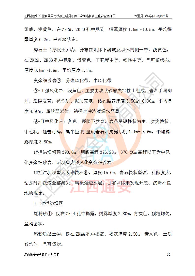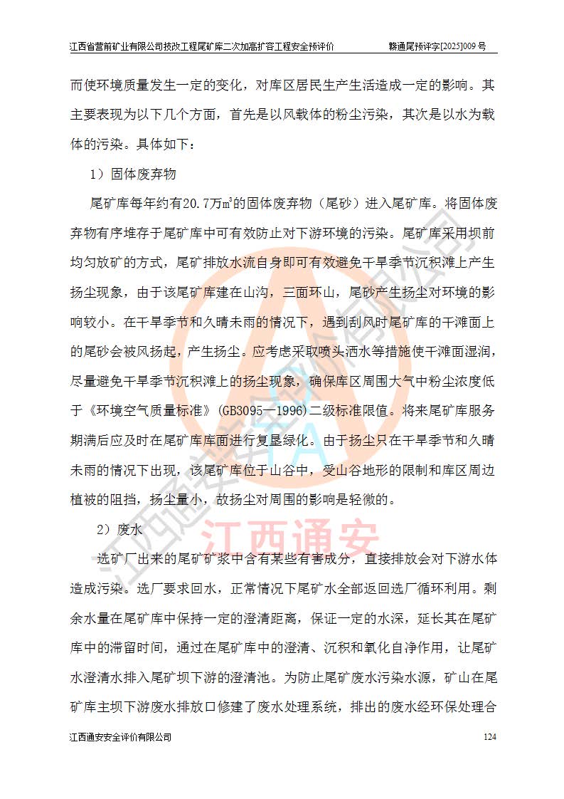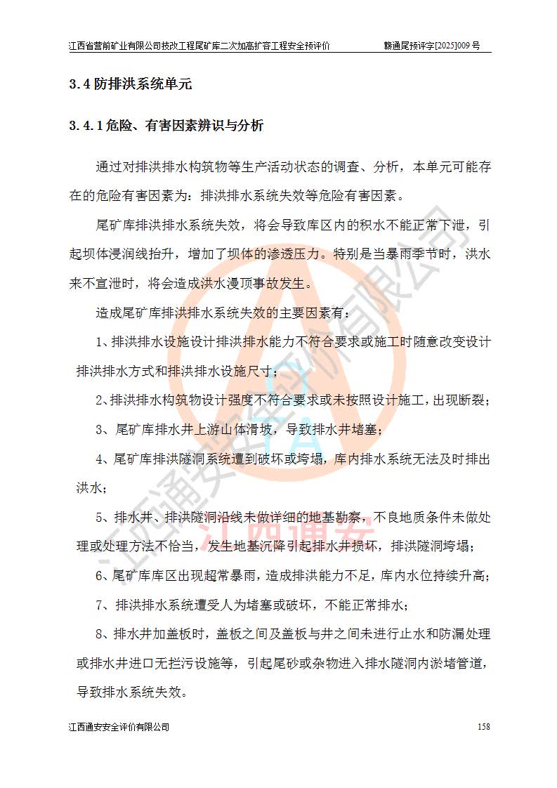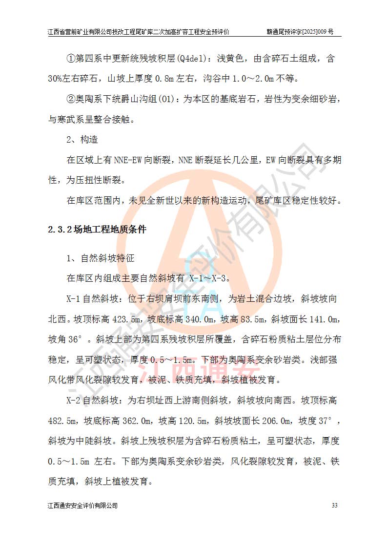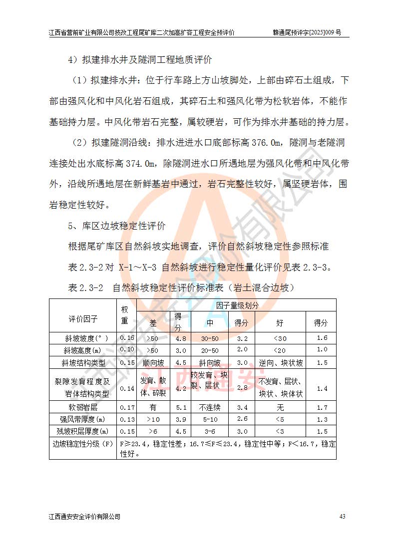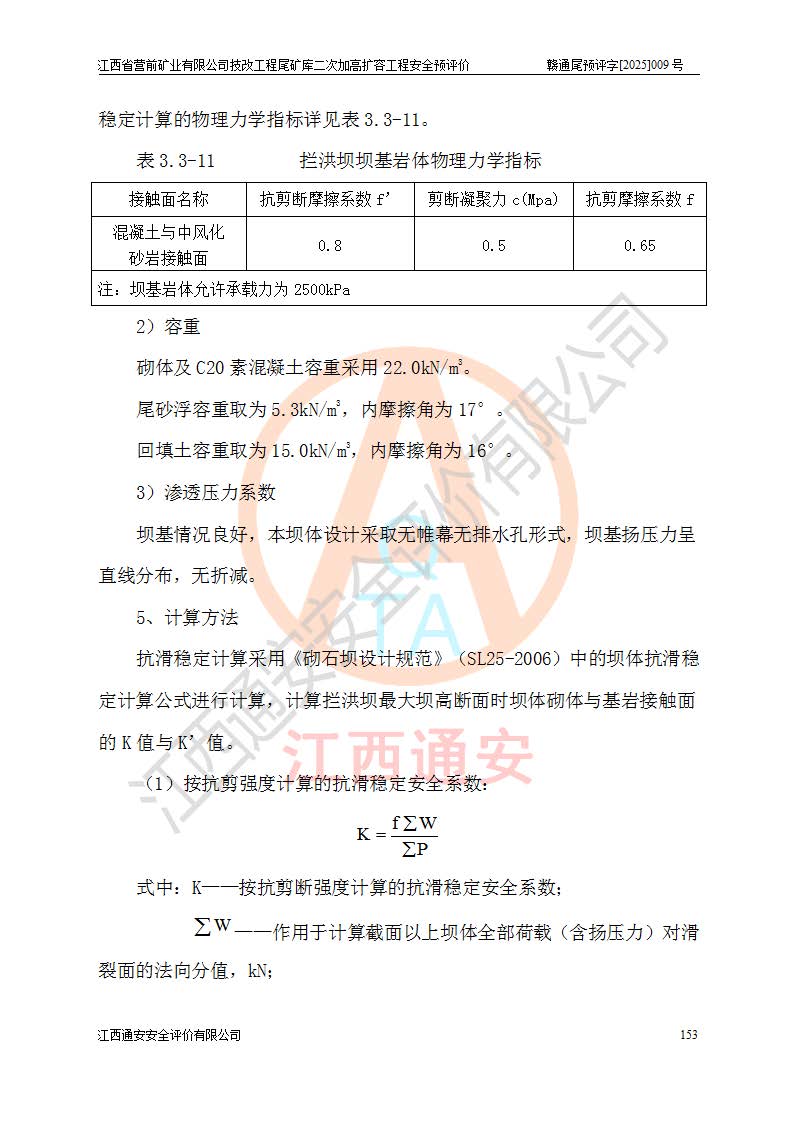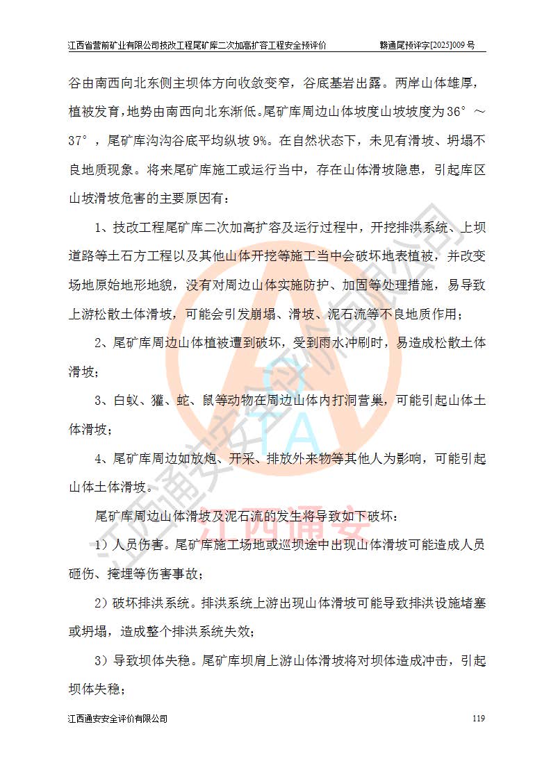 江西省營前礦業(yè)有限公司于2003年12月16日成立,位于贛州市上猶縣營前鎮(zhèn)焦里村境內(nèi),公司注冊資本10000萬元,法定**人陳雅博,礦區(qū)地理坐標(biāo):東經(jīng)114°18′30″~114°19′00″,北緯25°52′35″~25°53′47″。公司經(jīng)營范圍包括:鉛礦、鋅、鎢、銀地下開采、銷售。 江西省營前礦業(yè)有限公司技改工程尾礦庫位于焦里鎢銀鉛鋅礦區(qū),處于上猶縣水巖鄉(xiāng)井子村坑尾自然村境內(nèi),為山谷型尾礦庫。 江西省營前礦業(yè)有限公司技改工程尾礦庫于2013年由福建省冶金工業(yè)設(shè)計(jì)院設(shè)計(jì),2014年8月開始施工建設(shè),2015年4月竣工開始試運(yùn)行,2015年11月完成竣工驗(yàn)收,2016年1月首次取得安全生產(chǎn)許可證,2019年1月完成延期換證,2020年8月委托金建工程設(shè)計(jì)有限公司進(jìn)行尾礦庫加高擴(kuò)容工作,2020年10月21日取得了江西省應(yīng)急管理廳下發(fā)的《關(guān)于江西省營前礦業(yè)有限公司技改工程尾礦庫加高擴(kuò)容工程安全設(shè)施設(shè)計(jì)的審查意見》(贛應(yīng)急非煤項(xiàng)目設(shè)審〔2020〕46號),之后委托駐馬店市黃淮建設(shè)工程有限公司負(fù)責(zé)施工,云南潤滇工程技術(shù)有限公司負(fù)責(zé)監(jiān)理,2021年12月完成加高擴(kuò)容竣工驗(yàn)收工作,經(jīng)過延期,現(xiàn)尾礦庫安全生產(chǎn)許可證編號(贛)FM安許證字[2016]M1692號,**期為2025年01月18日至2028年01月17日。 江西省營前礦業(yè)有限公司技改工程尾礦庫為山谷型尾礦庫,初期壩為透水堆石壩,壩頂高程為330.0m,初期壩高25.0m,后期采用上游式尾礦堆積壩,加高擴(kuò)容后*終壩頂高程為380.0m,堆積壩高50.0m,總壩高為75.0m,總庫容為為503.14×104m3,尾礦庫為三等庫。尾礦庫初期壩以上總匯水面積3.53km2,防洪標(biāo)準(zhǔn)取500年一遇。 目前尾礦庫由初期壩、堆積壩、庫內(nèi)排洪系統(tǒng)(雙格排水斜槽+連接井+排水涵洞+排洪隧洞+排水陡槽+消力池)、1#攔洪壩、1#分洪隧洞、2#攔洪壩、2#分洪隧洞和安全監(jiān)測設(shè)施組成。根據(jù)建設(shè)單位提供的尾礦庫平面布置圖,截至2024年12月,現(xiàn)狀尾礦庫堆積壩頂高程為372.2m,現(xiàn)狀總壩高67.2m,灘頂高程為369.8m,現(xiàn)狀全庫容387.51×104m3,現(xiàn)狀尾礦庫為三等庫,原加高擴(kuò)容設(shè)計(jì)*終堆積壩頂高程為380.0m,現(xiàn)剩余庫容115.63×104m3,剩余**庫容約92.5×104m3,剩余服務(wù)年限約4.5年;礦山現(xiàn)有儲(chǔ)量較大,剩余庫容及服務(wù)年限不滿足礦山后期生產(chǎn)需要。 技改工程尾礦庫尾礦壩下游1**范圍無居民,不存在工礦企業(yè)等建構(gòu)筑物,不屬于“頭頂庫”;尾礦庫不壓礦;距贛江直線距離60**;不涉及保護(hù)區(qū)及生態(tài)紅線;尾礦庫所在溝谷較長,谷底平均縱坡9%,上游周邊山體地形有利于尾礦庫二次加高擴(kuò)容工程的實(shí)施,因此為了增加尾礦庫庫容,延長服務(wù)年限,充分利用尾礦庫所在溝谷地形,江西省營前礦業(yè)有限公司對技改尾礦庫進(jìn)行二次加高擴(kuò)容。 2024年12月,江西省營前礦業(yè)有限公司委托地礦贛西地質(zhì)工程勘察院編制了《江西省營前礦業(yè)有限公司技改工程尾礦庫二次擴(kuò)容工程(水文)地質(zhì)勘察報(bào)告》,2025年4月,江西省營前礦業(yè)有限公司委托金建工程設(shè)計(jì)有限公司編制了《江西省營前礦業(yè)有限公司技改工程尾礦庫二次加高擴(kuò)容工程可行性研究報(bào)告》。 按照非煤礦山建設(shè)項(xiàng)目安全設(shè)施“三同時(shí)”的規(guī)定要求,技改工程尾礦庫為二次加高擴(kuò)容工程,**進(jìn)行安全預(yù)評價(jià);江西省營前礦業(yè)有限公司委托我公司承擔(dān)技改工程尾礦庫二次加高擴(kuò)容工程建設(shè)項(xiàng)目的安全預(yù)評價(jià)工作。 |