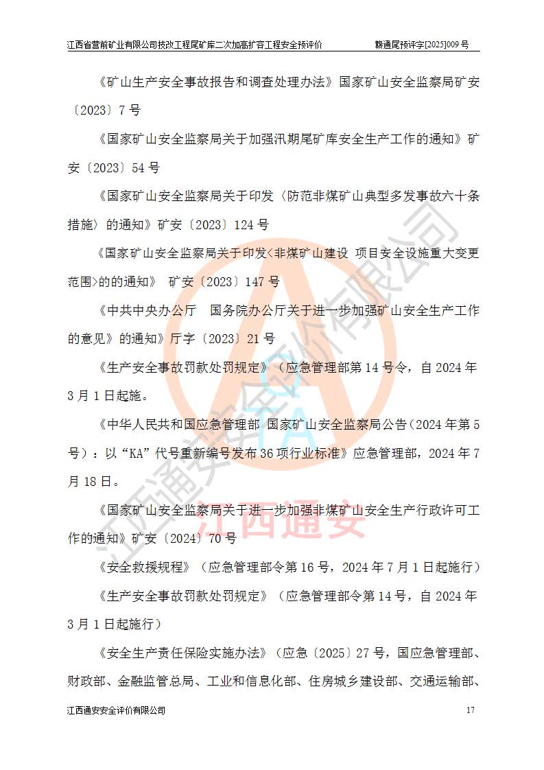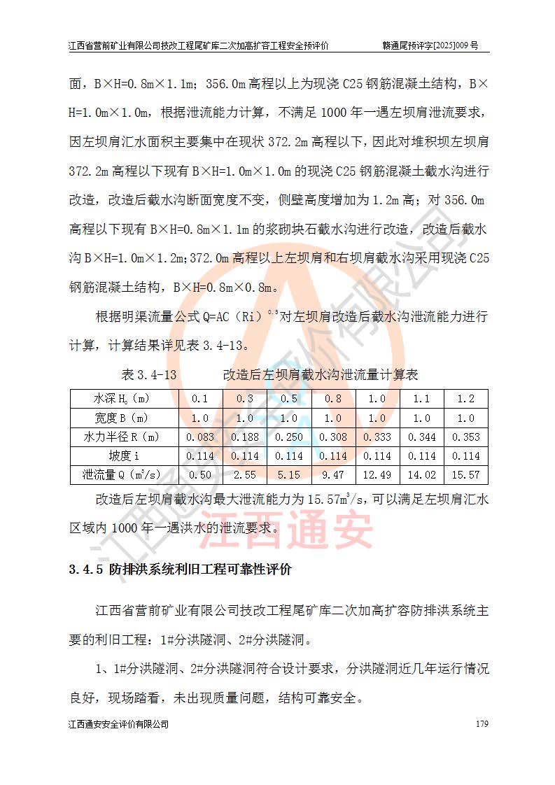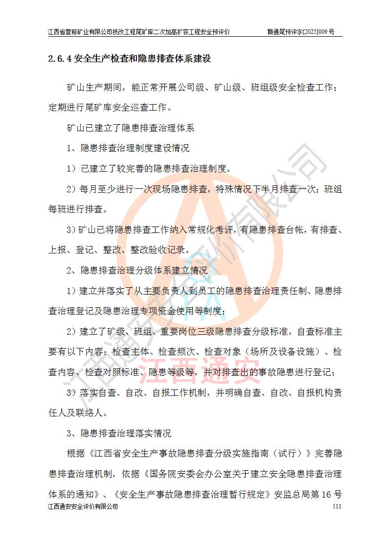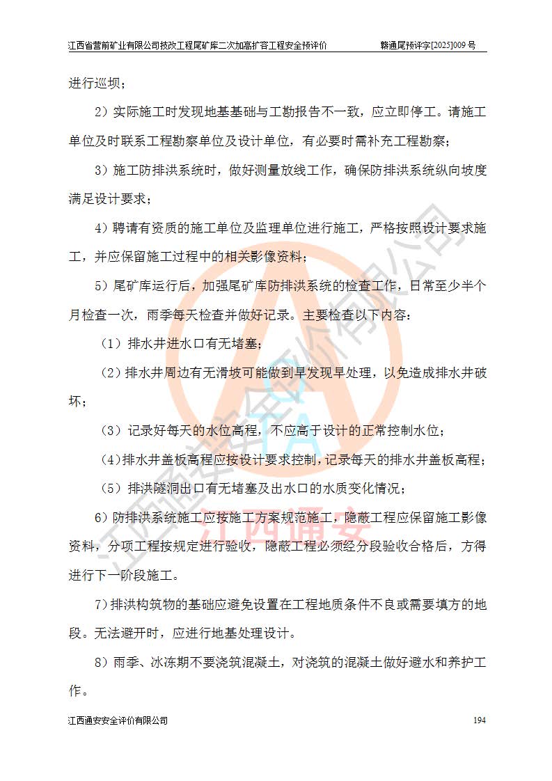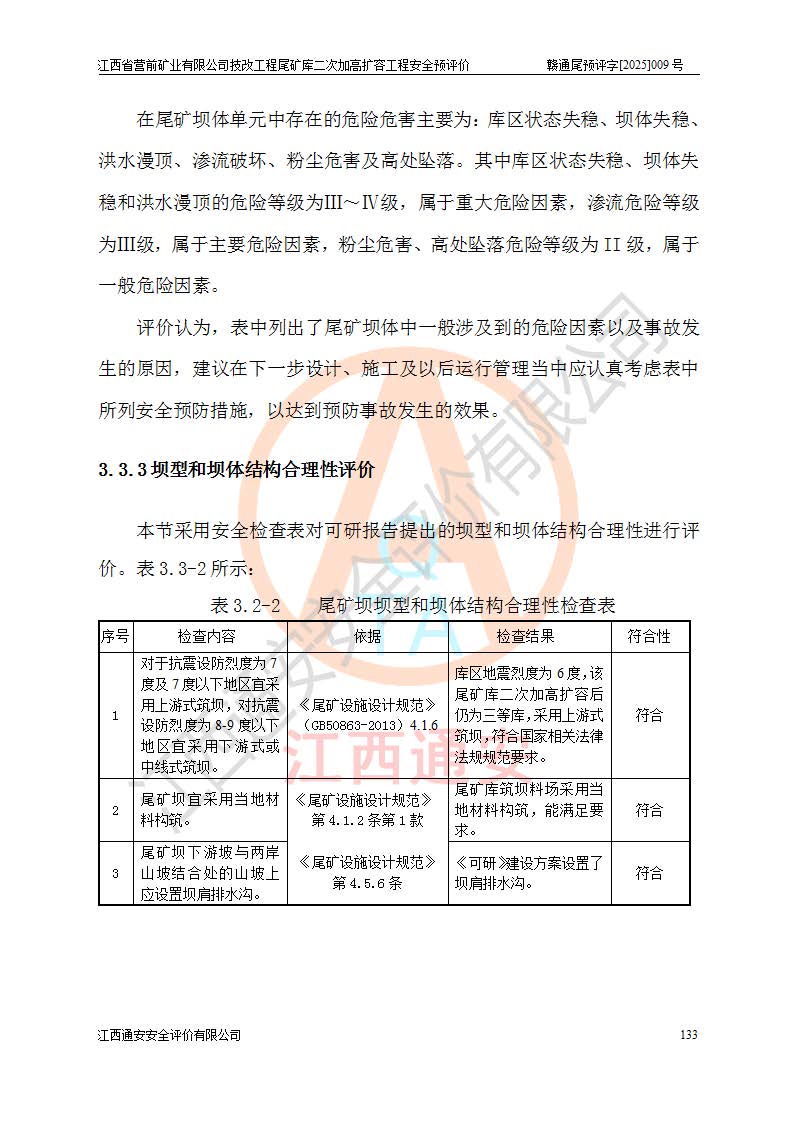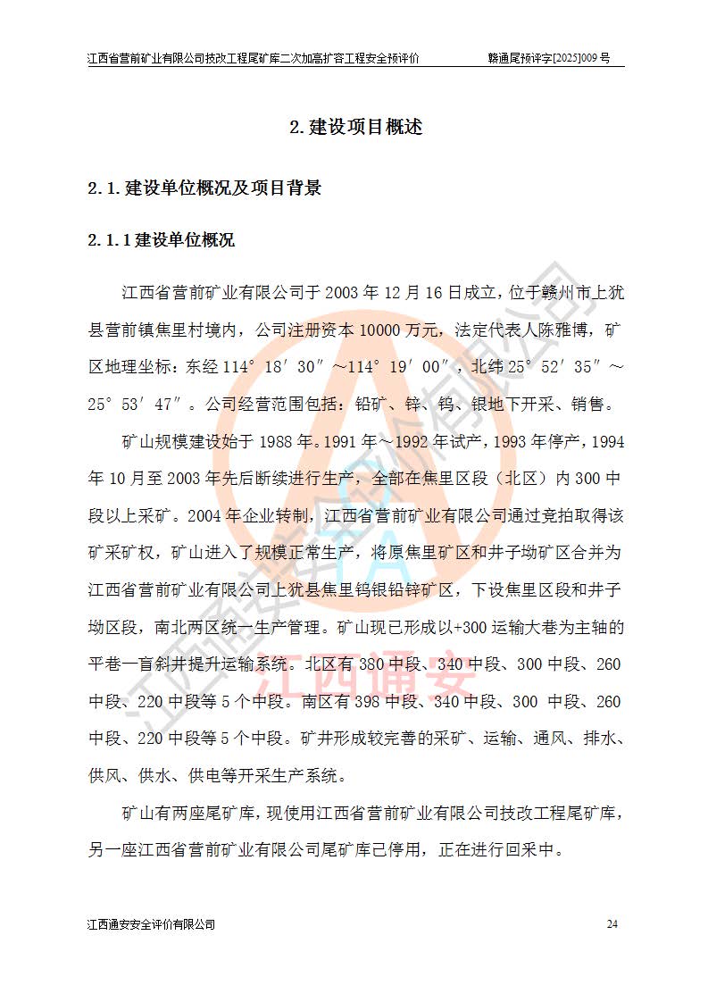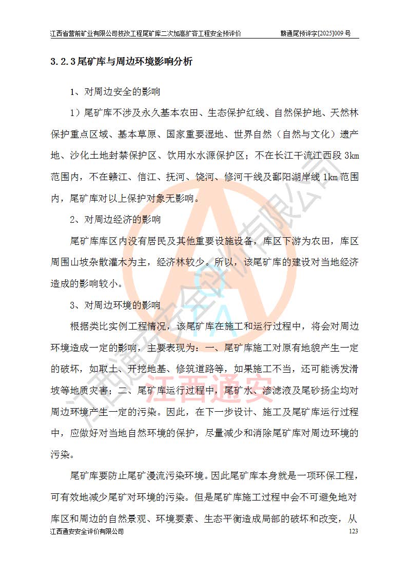 江西省營前礦業(yè)有限公司于2003年12月16日成立,位于贛州市上猶縣營前鎮(zhèn)焦里村境內(nèi),公司注冊資本10000萬元,法定**人陳雅博,礦區(qū)地理坐標(biāo):東經(jīng)114°18′30″~114°19′00″,北緯25°52′35″~25°53′47″。公司經(jīng)營范圍包括:鉛礦、鋅、鎢、銀地下開采、銷售。 江西省營前礦業(yè)有限公司技改工程尾礦庫位于焦里鎢銀鉛鋅礦區(qū),處于上猶縣水巖鄉(xiāng)井子村坑尾自然村境內(nèi),為山谷型尾礦庫。 江西省營前礦業(yè)有限公司技改工程尾礦庫于2013年由福建省冶金工業(yè)設(shè)計(jì)院設(shè)計(jì),2014年8月開始施工建設(shè),2015年4月竣工開始試運(yùn)行,2015年11月完成竣工驗(yàn)收,2016年1月首次取得安全生產(chǎn)許可證,2019年1月完成延期換證,2020年8月委托金建工程設(shè)計(jì)有限公司進(jìn)行尾礦庫加高擴(kuò)容工作,2020年10月21日取得了江西省應(yīng)急管理廳下發(fā)的《關(guān)于江西省營前礦業(yè)有限公司技改工程尾礦庫加高擴(kuò)容工程安全設(shè)施設(shè)計(jì)的審查意見》(贛應(yīng)急非煤項(xiàng)目設(shè)審〔2020〕46號),之后委托駐馬店市黃淮建設(shè)工程有限公司負(fù)責(zé)施工,云南潤滇工程技術(shù)有限公司負(fù)責(zé)監(jiān)理,2021年12月完成加高擴(kuò)容竣工驗(yàn)收工作,經(jīng)過延期,現(xiàn)尾礦庫安全生產(chǎn)許可證編號(贛)FM安許證字[2016]M1692號,**期為2025年01月18日至2028年01月17日。 江西省營前礦業(yè)有限公司技改工程尾礦庫為山谷型尾礦庫,初期壩為透水堆石壩,壩頂高程為330.0m,初期壩高25.0m,后期采用上游式尾礦堆積壩,加高擴(kuò)容后*終壩頂高程為380.0m,堆積壩高50.0m,總壩高為75.0m,總庫容為為503.14×104m3,尾礦庫為三等庫。尾礦庫初期壩以上總匯水面積3.53km2,防洪標(biāo)準(zhǔn)取500年一遇。 目前尾礦庫由初期壩、堆積壩、庫內(nèi)排洪系統(tǒng)(雙格排水斜槽+連接井+排水涵洞+排洪隧洞+排水陡槽+消力池)、1#攔洪壩、1#分洪隧洞、2#攔洪壩、2#分洪隧洞和安全監(jiān)測設(shè)施組成。根據(jù)建設(shè)單位提供的尾礦庫平面布置圖,截至2024年12月,現(xiàn)狀尾礦庫堆積壩頂高程為372.2m,現(xiàn)狀總壩高67.2m,灘頂高程為369.8m,現(xiàn)狀全庫容387.51×104m3,現(xiàn)狀尾礦庫為三等庫,原加高擴(kuò)容設(shè)計(jì)*終堆積壩頂高程為380.0m,現(xiàn)剩余庫容115.63×104m3,剩余**庫容約92.5×104m3,剩余服務(wù)年限約4.5年;礦山現(xiàn)有儲(chǔ)量較大,剩余庫容及服務(wù)年限不滿足礦山后期生產(chǎn)需要。 技改工程尾礦庫尾礦壩下游1**范圍無居民,不存在工礦企業(yè)等建構(gòu)筑物,不屬于“頭頂庫”;尾礦庫不壓礦;距贛江直線距離60**;不涉及保護(hù)區(qū)及生態(tài)紅線;尾礦庫所在溝谷較長,谷底平均縱坡9%,上游周邊山體地形有利于尾礦庫二次加高擴(kuò)容工程的實(shí)施,因此為了增加尾礦庫庫容,延長服務(wù)年限,充分利用尾礦庫所在溝谷地形,江西省營前礦業(yè)有限公司對技改尾礦庫進(jìn)行二次加高擴(kuò)容。 2024年12月,江西省營前礦業(yè)有限公司委托地礦贛西地質(zhì)工程勘察院編制了《江西省營前礦業(yè)有限公司技改工程尾礦庫二次擴(kuò)容工程(水文)地質(zhì)勘察報(bào)告》,2025年4月,江西省營前礦業(yè)有限公司委托金建工程設(shè)計(jì)有限公司編制了《江西省營前礦業(yè)有限公司技改工程尾礦庫二次加高擴(kuò)容工程可行性研究報(bào)告》。 按照非煤礦山建設(shè)項(xiàng)目安全設(shè)施“三同時(shí)”的規(guī)定要求,技改工程尾礦庫為二次加高擴(kuò)容工程,**進(jìn)行安全預(yù)評價(jià);江西省營前礦業(yè)有限公司委托我公司承擔(dān)技改工程尾礦庫二次加高擴(kuò)容工程建設(shè)項(xiàng)目的安全預(yù)評價(jià)工作。 |