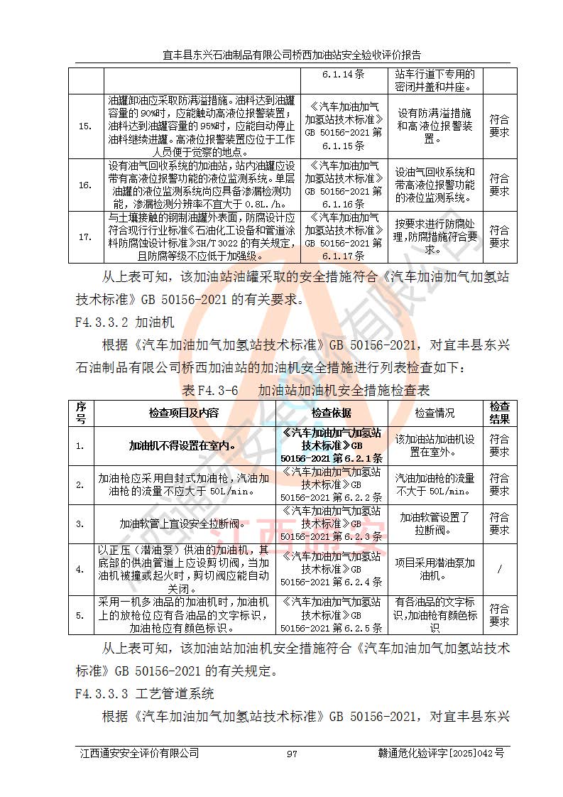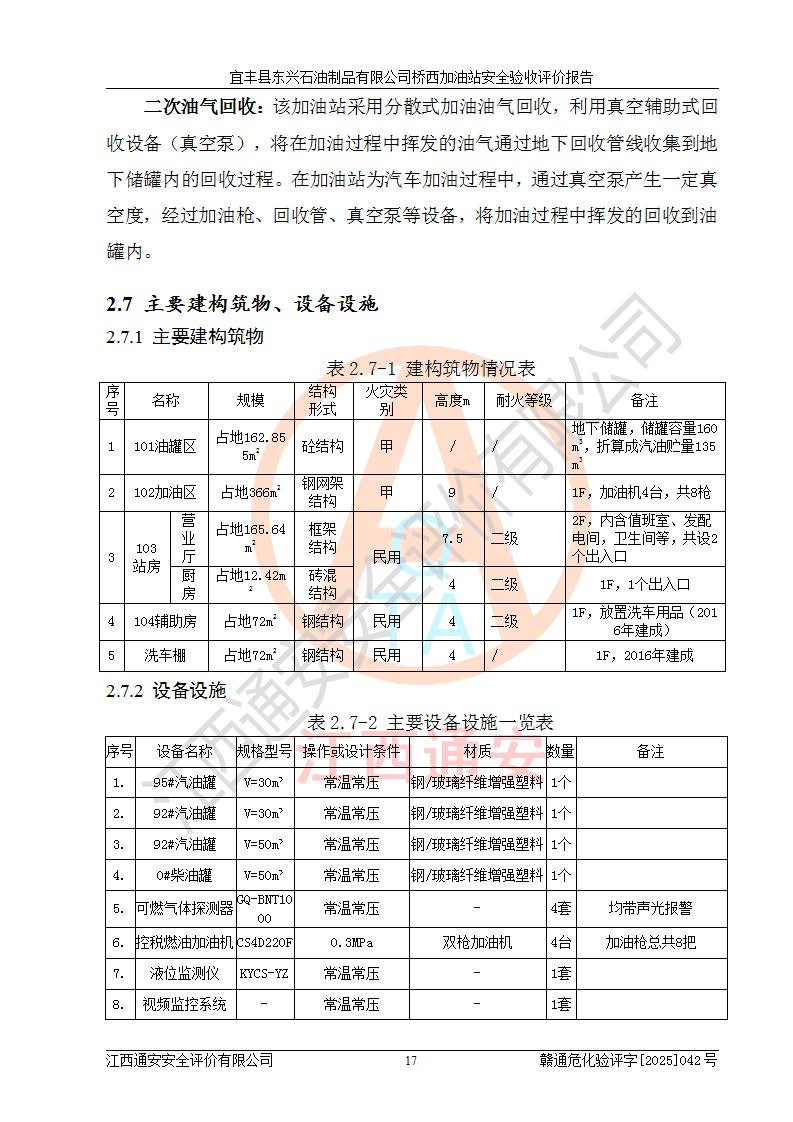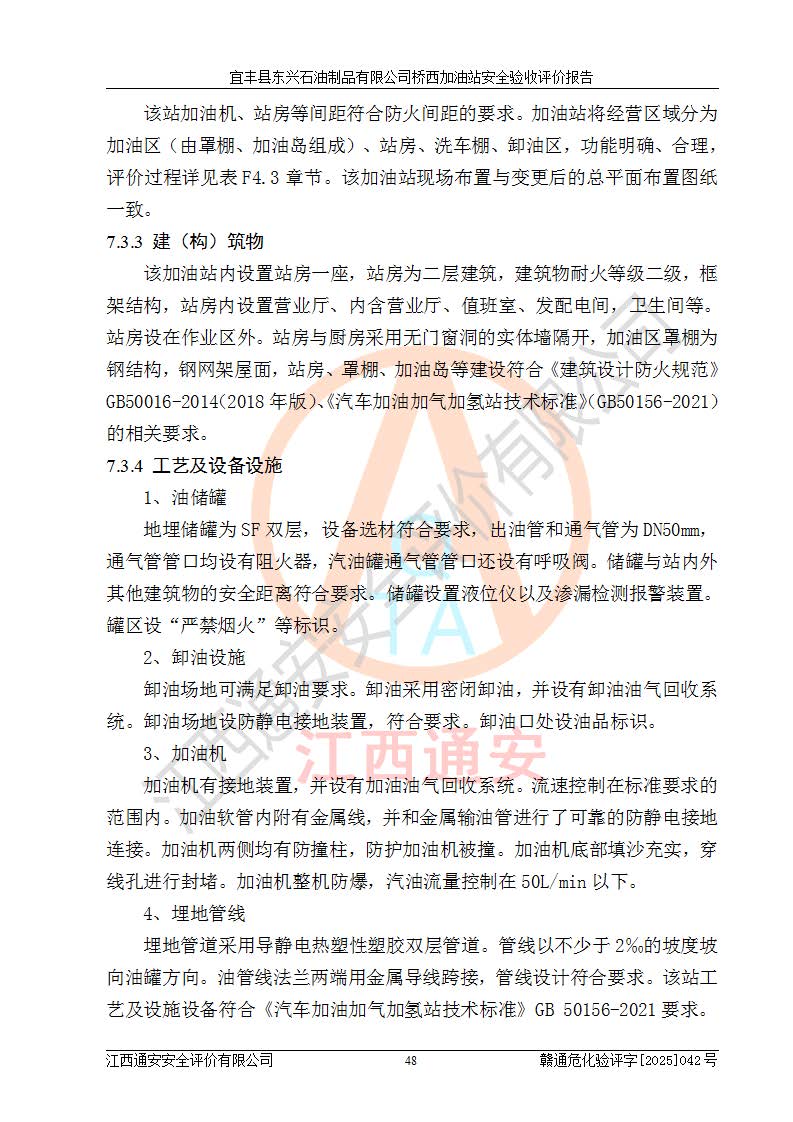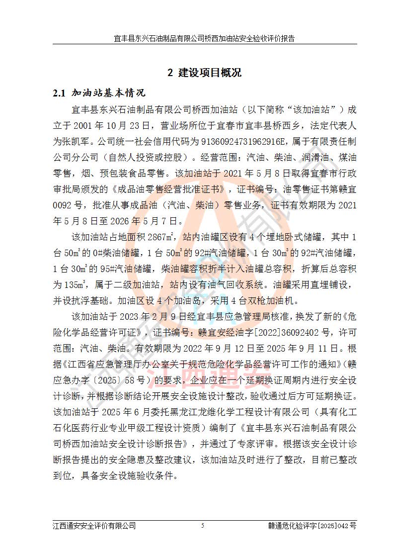 項(xiàng)目簡(jiǎn)介 | 宜豐縣東興石油制品有限公司橋西加油站(以下簡(jiǎn)稱“該加油站”)成立于2001年10月23日,營(yíng)業(yè)場(chǎng)所位于宜春市宜豐縣橋西鄉(xiāng),法定**人為張凱軍。該加油站統(tǒng)一社會(huì)信用代碼為91360924731962916E,屬于有限責(zé)任制公司分公司(自然人投資或控股)。經(jīng)營(yíng)范圍:汽油、柴油、潤(rùn)滑油、煤油零售,煙、預(yù)包裝食品零售。 該加油站油罐區(qū)設(shè)有4個(gè)埋地臥式儲(chǔ)罐,其中1臺(tái)50m3的0#柴油儲(chǔ)罐,1臺(tái)50m3的92#汽油儲(chǔ)罐,1臺(tái)30m3的92#汽油儲(chǔ)罐,1臺(tái)30m3的95#汽油儲(chǔ)罐,柴油罐容積折半計(jì)入油罐總?cè)莘e,折算后總?cè)莘e為135m3,屬于二級(jí)加油站,站內(nèi)設(shè)有油氣回收系統(tǒng)。油罐采用直埋鋪設(shè),并設(shè)抗浮基礎(chǔ)。加油區(qū)設(shè)4個(gè)加油島,采用4臺(tái)雙槍加油機(jī)。該加油站于2023年2月9日經(jīng)宜豐縣應(yīng)急管理局核準(zhǔn),換發(fā)了新的《危險(xiǎn)化學(xué)品經(jīng)營(yíng)許可證》,證書(shū)編號(hào):贛宜安經(jīng)油字[2022]36092402號(hào),許可范圍:汽油、柴油。**期限為2022年9月12日至2025年9月11日。 根據(jù)《危險(xiǎn)化學(xué)品安全管理?xiàng)l例》(經(jīng)***令第344號(hào)發(fā)布,***令第591號(hào)、***令第645號(hào)修改),《危險(xiǎn)化學(xué)品經(jīng)營(yíng)許可證管理辦法》(2012年7月17日**安全生產(chǎn)監(jiān)督管理總局令第55號(hào)公布,自2012年9月1日起施行;根據(jù)2015年5月27日**安全生產(chǎn)監(jiān)督管理總局令第79號(hào)修正)等法律法規(guī)及文件要求,該加油站的危險(xiǎn)化學(xué)品經(jīng)營(yíng)許可證三年**期即將到期,需要重新進(jìn)行安全現(xiàn)狀評(píng)價(jià)。由于該加油站2013年建成投運(yùn),安全設(shè)施“三同時(shí)”資料不全,根據(jù)《江西省應(yīng)急管理廳辦公室關(guān)于規(guī)范危險(xiǎn)化學(xué)品經(jīng)營(yíng)許可工作的通知》(贛應(yīng)急辦字〔2025〕58號(hào))等要求,危險(xiǎn)化學(xué)品經(jīng)營(yíng)企業(yè)應(yīng)在一個(gè)延期換證周期內(nèi)進(jìn)行安全設(shè)計(jì)診斷,并根據(jù)診斷結(jié)論開(kāi)展安全設(shè)施設(shè)計(jì)整改,驗(yàn)收通過(guò)后方可延期換證。該加油站于2025年6月委托黑龍江龍維化學(xué)工程設(shè)計(jì)有限公司(具有化工石化醫(yī)藥行業(yè)專業(yè)**工程設(shè)計(jì)資質(zhì))編制了《宜豐縣東興石油制品有限公司橋西加油站安全設(shè)計(jì)診斷報(bào)告》,并通過(guò)了專家評(píng)審。根據(jù)該安全設(shè)計(jì)診斷報(bào)告提出的安全隱患及整改建議,該加油站及時(shí)進(jìn)行了整改,目前已整改到位,具備安全設(shè)施驗(yàn)收條件。