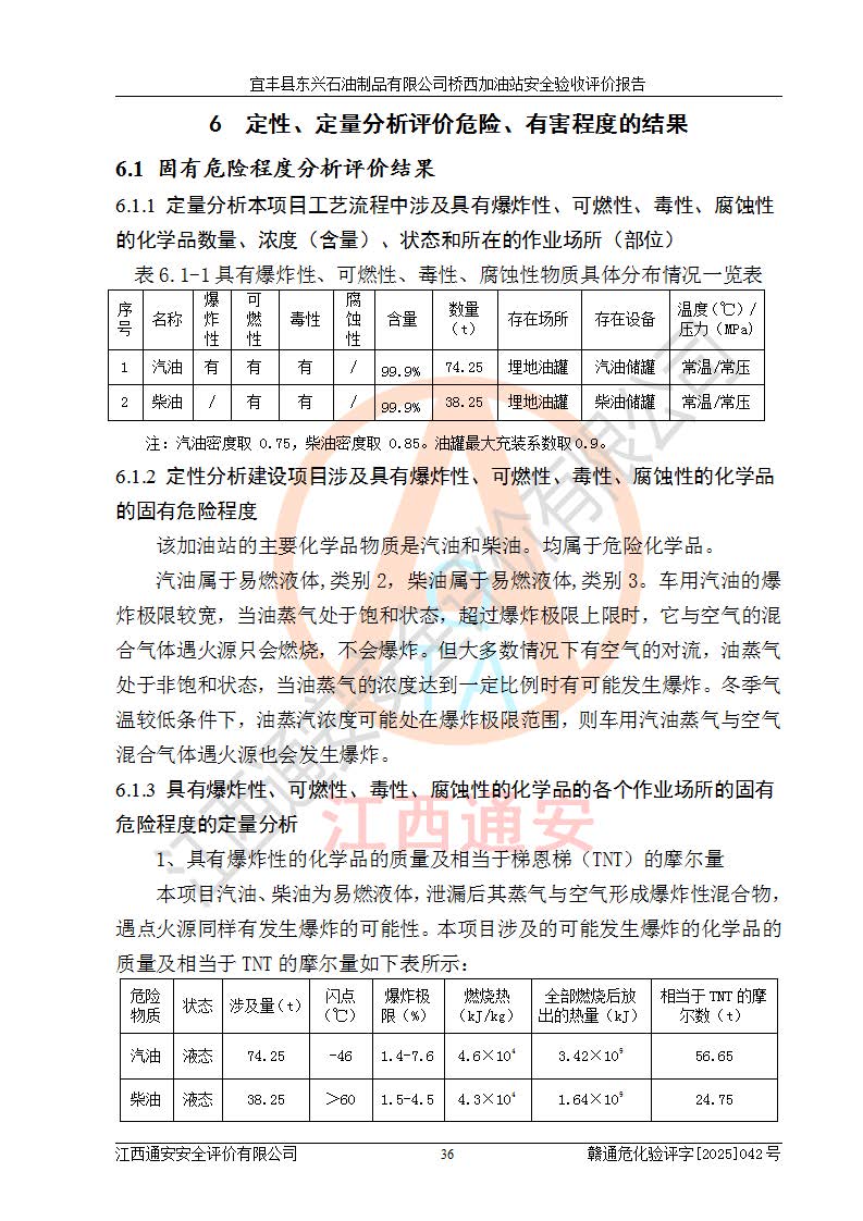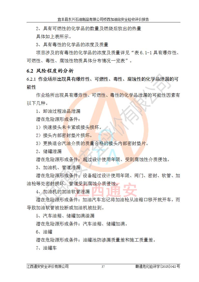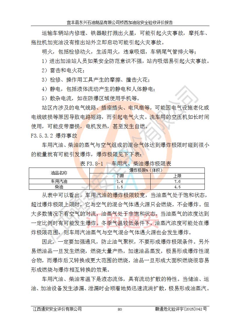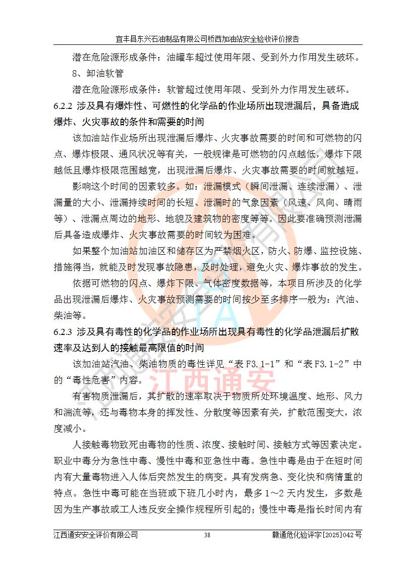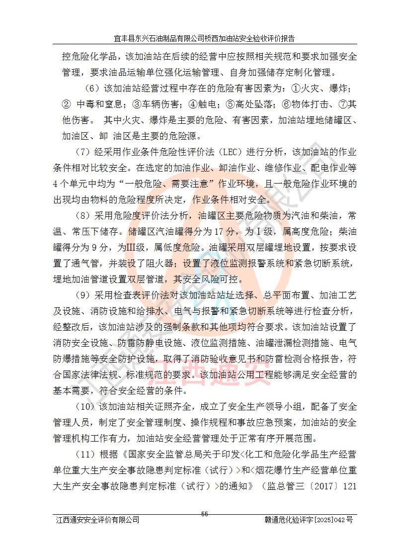 其它 | 一、安全狀況綜合評(píng)述 宜豐縣東興石油制品有限公司橋西加油站位于宜春市宜豐縣橋西鄉(xiāng),從事成品油(汽油、柴油)零售業(yè)務(wù),屬二級(jí)加油站。 通過(guò)對(duì)該加油站建設(shè)項(xiàng)目安全驗(yàn)收評(píng)價(jià),得出以下評(píng)價(jià)結(jié)論: 化學(xué)品、設(shè)備及工藝辨識(shí)結(jié)果 經(jīng)辨識(shí),該加油站經(jīng)營(yíng)、儲(chǔ)存危險(xiǎn)化學(xué)品為汽油和柴油,其中汽油屬于重點(diǎn)監(jiān)管危險(xiǎn)化學(xué)品、特別管控危險(xiǎn)化學(xué)品;該加油站不涉及劇毒化學(xué)品、高毒物品、易制毒化學(xué)品、監(jiān)控化學(xué)品、易制爆化學(xué)品。經(jīng)營(yíng)、儲(chǔ)存過(guò)程中采用的設(shè)備及工藝不屬于淘汰落后設(shè)備及工藝、不涉及危險(xiǎn)化工工藝,生產(chǎn)和儲(chǔ)存單元均不構(gòu)成危險(xiǎn)化學(xué)品重大危險(xiǎn)源。 建設(shè)項(xiàng)目所在地的安全條件和周邊的安全間距 該站東南側(cè)臨354國(guó)道,北側(cè)、西側(cè)、東側(cè)為居民建筑,加油站為二級(jí)加油站,設(shè)有油氣回收系統(tǒng),站外50米范圍內(nèi)無(wú)重要公共建筑物、明火設(shè)備和甲、乙類生產(chǎn)及儲(chǔ)存設(shè)施,站區(qū)內(nèi)加油設(shè)施與周邊建構(gòu)筑物之間的距離能夠滿足《汽車加油加氣加氫站技術(shù)標(biāo)準(zhǔn)》GB50156-2021 和《建筑設(shè)計(jì)防火規(guī)范》GB50016-2014(2018 年版)以及相關(guān)**規(guī)范要求。本報(bào)告認(rèn)為該加油站建設(shè)項(xiàng)目周邊對(duì)加油站的影響以及建設(shè)項(xiàng)目所在地的自然條件對(duì)建設(shè)項(xiàng)目投入使用后的影響均較小,該加油站具備標(biāo)準(zhǔn)規(guī)范所要求的安全條件。 該項(xiàng)目安全設(shè)計(jì)診斷報(bào)告的采納情況 該加油站安全設(shè)計(jì)診斷報(bào)告核查的問(wèn)題(共15項(xiàng))及整改建議均已采納,經(jīng)評(píng)價(jià)組現(xiàn)場(chǎng)復(fù)核,均已整改完成。 該項(xiàng)目調(diào)試中表現(xiàn)出的技術(shù)、工藝和裝置、設(shè)備(設(shè)施)的安全、 可靠性和安全水平。 該加油站整改過(guò)程工作進(jìn)展順利,處于正常狀態(tài)。經(jīng)查閱資料和分析評(píng)價(jià),認(rèn)為本項(xiàng)目技術(shù)、工藝和裝置、設(shè)備(設(shè)施)的安全、可靠性和安全水平符合**相應(yīng)安全標(biāo)準(zhǔn)的要求。 該加油站儲(chǔ)存經(jīng)營(yíng)的汽油屬于重點(diǎn)監(jiān)管的危險(xiǎn)化學(xué)品和特別管控危險(xiǎn)化學(xué)品,該加油站在后續(xù)的經(jīng)營(yíng)中應(yīng)按照相關(guān)規(guī)范和要求加強(qiáng)安全管理,要求油品運(yùn)輸單位強(qiáng)化運(yùn)輸管理、自身加強(qiáng)儲(chǔ)存定制化管理。 該加油站經(jīng)營(yíng)過(guò)程中存在的危險(xiǎn)有害因素為:①火災(zāi)、爆炸;② 中毒和窒息;③**傷害;④觸電;⑤高處墜落;⑥物體打擊、⑦其他傷害。 其中火災(zāi)、爆炸是主要的危險(xiǎn)、有害因素,加油站埋地儲(chǔ)罐區(qū)、加油區(qū)、卸 油區(qū)是主要的危險(xiǎn)源。 (7)經(jīng)采用作業(yè)條件危險(xiǎn)性評(píng)價(jià)法(LEC)進(jìn)行分析,該加油站的作業(yè)條件相對(duì)比較安全。在選定的加油作業(yè)、卸油作業(yè)、維修作業(yè)、配電作業(yè)等4個(gè)單元中均為“一般危險(xiǎn)、需要注意”作業(yè)環(huán)境,且一般危險(xiǎn)作業(yè)環(huán)境的出現(xiàn)均由物料的危險(xiǎn)程度所決定,作業(yè)條件相對(duì)安全。 (8)采用危險(xiǎn)度評(píng)價(jià)法分析,油罐區(qū)主要危險(xiǎn)物質(zhì)為汽油和柴油,常溫、常壓下儲(chǔ)存。儲(chǔ)罐區(qū)汽油罐為Ⅰ級(jí),屬**危險(xiǎn);柴油罐得分為為Ⅲ級(jí),屬低度危險(xiǎn)。油罐采用雙層罐埋地設(shè)置,按要求設(shè)置了通氣管,并裝設(shè)了阻火器;設(shè)置了液位監(jiān)測(cè)報(bào)警系統(tǒng)和緊急切斷系統(tǒng),埋地加油管道設(shè)置雙層管道,其安全風(fēng)險(xiǎn)可控。 (9)采用檢查表評(píng)價(jià)法對(duì)該加油站站址選擇、總平面布置、加油工藝及設(shè)施、消防設(shè)施和給排水、電氣與報(bào)警和緊急切斷系統(tǒng)等進(jìn)行檢查分析,經(jīng)整改后,該加油站涉及的強(qiáng)制條款和其他項(xiàng)均符合要求。該加油站設(shè)置了消防安全設(shè)施、防雷防靜電設(shè)施、液位監(jiān)測(cè)措施、油罐泄漏檢測(cè)措施、電氣防爆措施等安全防護(hù)設(shè)施,取得了消防驗(yàn)收意見(jiàn)書(shū)和防雷檢測(cè)合格報(bào)告,符合**法律法規(guī)、標(biāo)準(zhǔn)規(guī)范的要求。該加油站公用工程能夠滿足安全經(jīng)營(yíng)的基本需要,符合安全經(jīng)營(yíng)的條件。 (10)該加油站相關(guān)證照齊全,成立了安全生產(chǎn)**小組,配備了安全管理人員,制定了安全管理制度、操作規(guī)程和事故應(yīng)急預(yù)案,加油站的安全管理機(jī)構(gòu)工作有力,加油站安全經(jīng)營(yíng)管理處于正常有序開(kāi)展范圍。 (11)對(duì)宜豐縣東興石油制品有限公司橋西加油站存在重大生產(chǎn)安全事故隱患進(jìn)行判定,檢查結(jié)果為該加油站不存在重大生產(chǎn)安全事故隱患。 總體評(píng)價(jià)結(jié)論:宜豐縣東