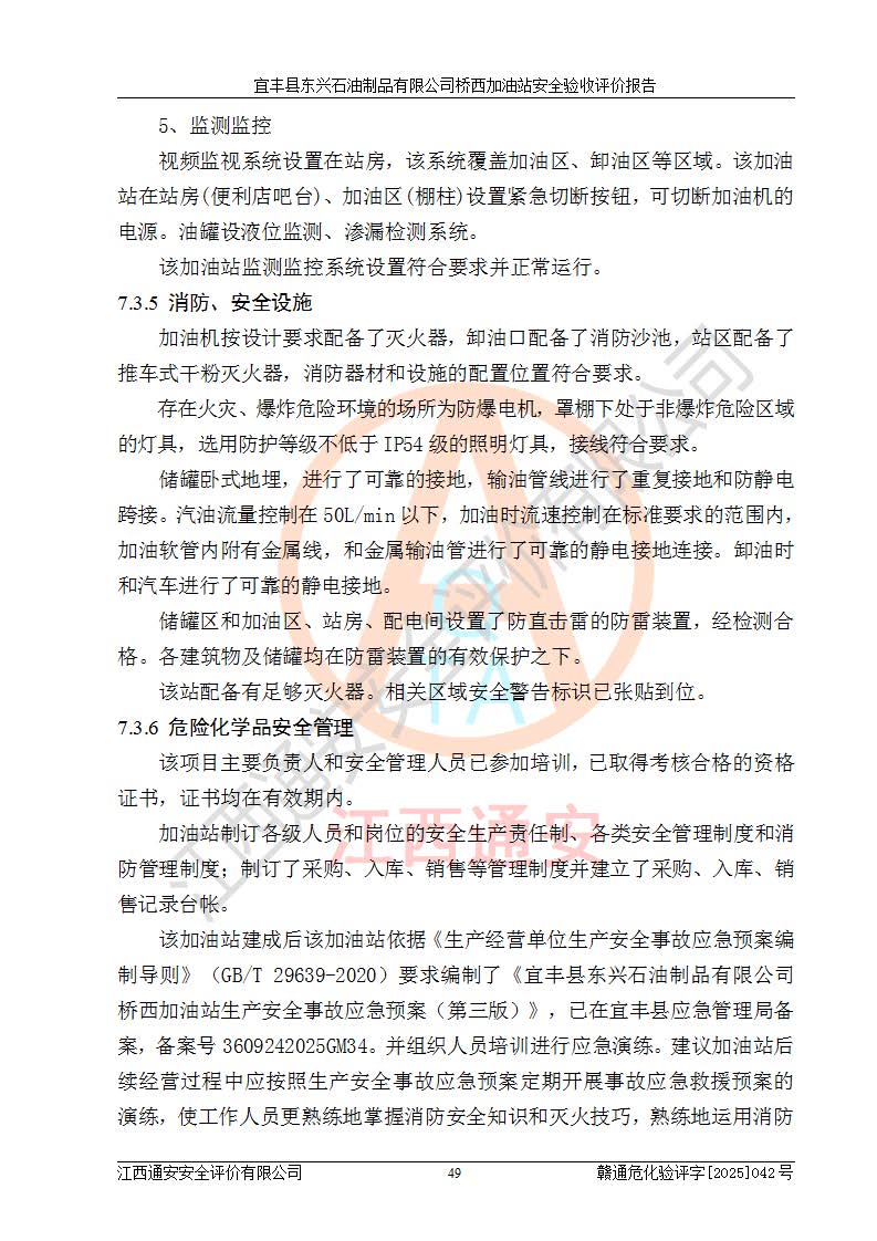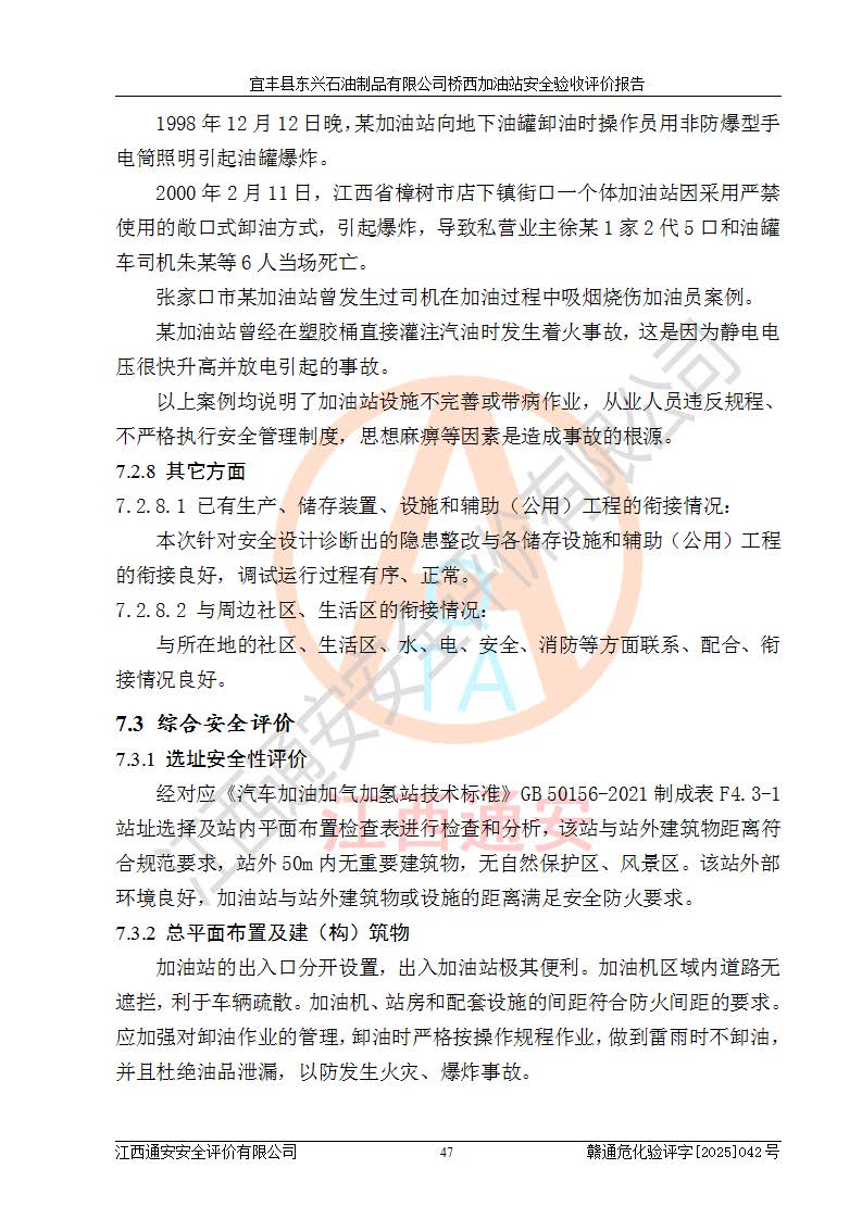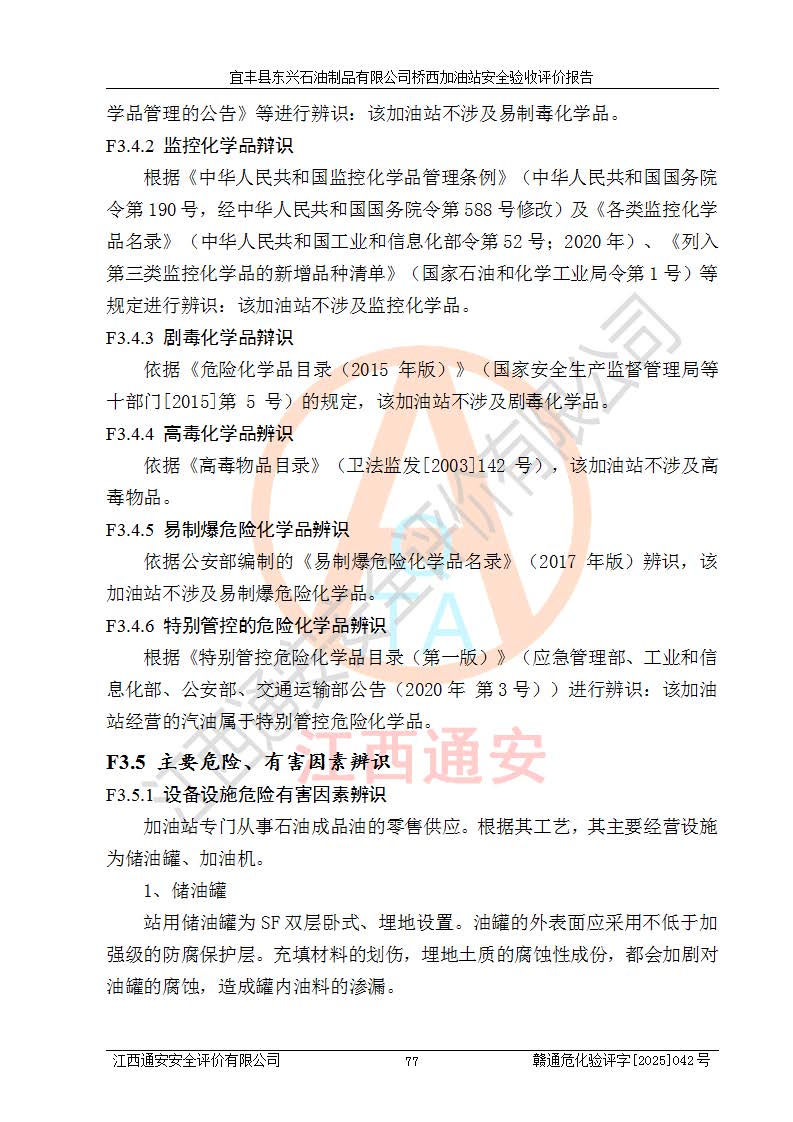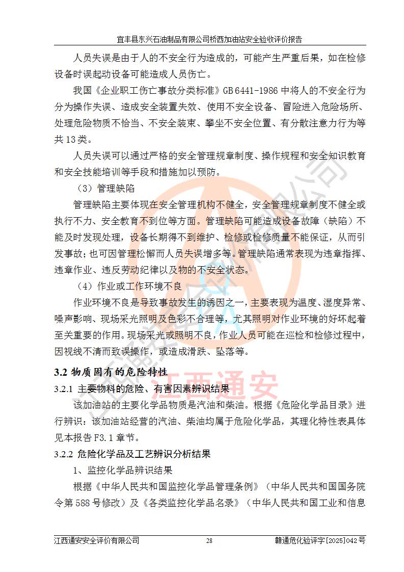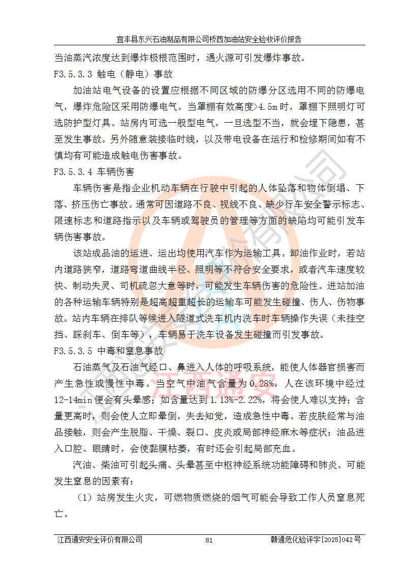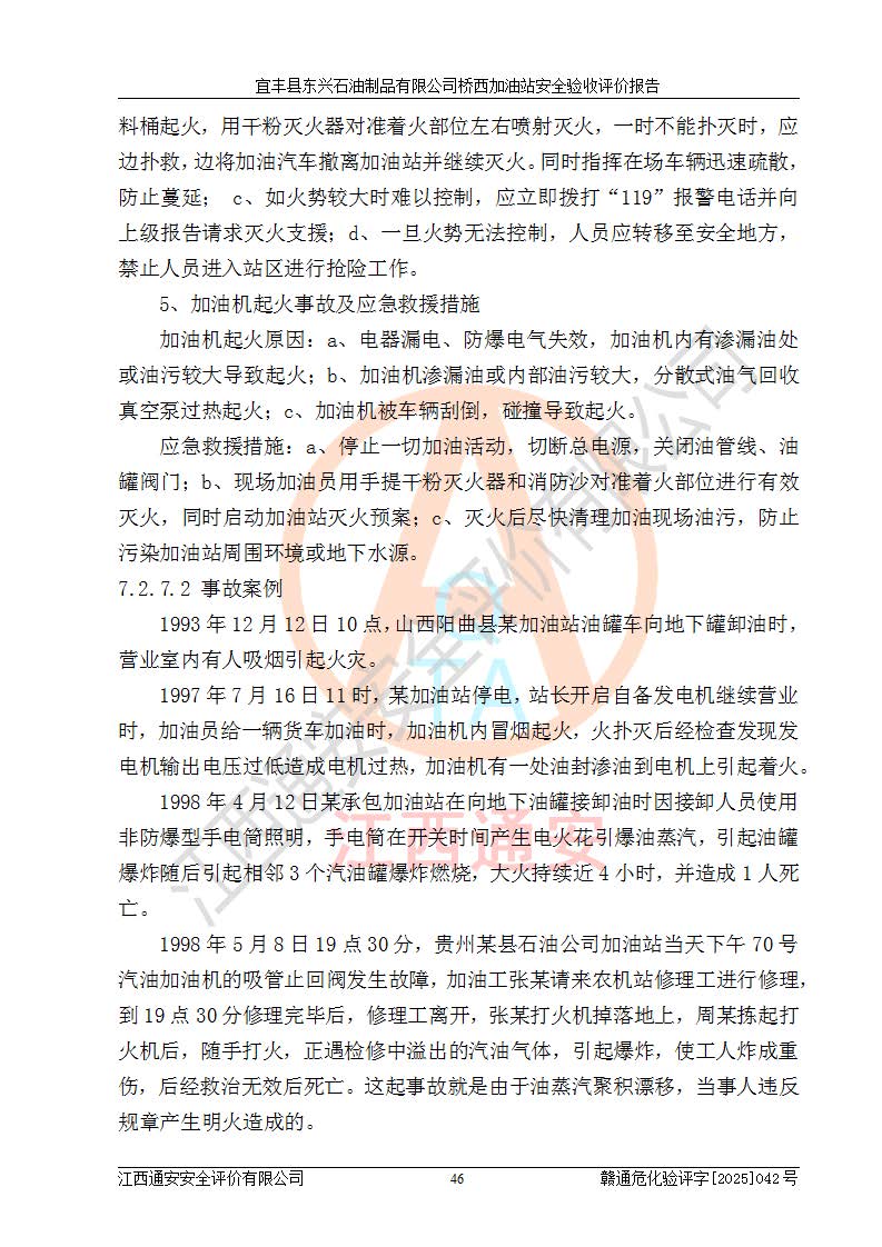 其它 | 一、安全狀況綜合評(píng)述 宜豐縣東興石油制品有限公司橋西加油站位于宜春市宜豐縣橋西鄉(xiāng),從事成品油(汽油、柴油)零售業(yè)務(wù),屬二級(jí)加油站。 通過(guò)對(duì)該加油站建設(shè)項(xiàng)目安全驗(yàn)收評(píng)價(jià),得出以下評(píng)價(jià)結(jié)論: 化學(xué)品、設(shè)備及工藝辨識(shí)結(jié)果 經(jīng)辨識(shí),該加油站經(jīng)營(yíng)、儲(chǔ)存危險(xiǎn)化學(xué)品為汽油和柴油,其中汽油屬于重點(diǎn)監(jiān)管危險(xiǎn)化學(xué)品、特別管控危險(xiǎn)化學(xué)品;該加油站不涉及劇毒化學(xué)品、高毒物品、易制毒化學(xué)品、監(jiān)控化學(xué)品、易制爆化學(xué)品。經(jīng)營(yíng)、儲(chǔ)存過(guò)程中采用的設(shè)備及工藝不屬于淘汰落后設(shè)備及工藝、不涉及危險(xiǎn)化工工藝,生產(chǎn)和儲(chǔ)存單元均不構(gòu)成危險(xiǎn)化學(xué)品重大危險(xiǎn)源。 建設(shè)項(xiàng)目所在地的安全條件和周邊的安全間距 該站東南側(cè)臨354國(guó)道,北側(cè)、西側(cè)、東側(cè)為居民建筑,加油站為二級(jí)加油站,設(shè)有油氣回收系統(tǒng),站外50米范圍內(nèi)無(wú)重要公共建筑物、明火設(shè)備和甲、乙類生產(chǎn)及儲(chǔ)存設(shè)施,站區(qū)內(nèi)加油設(shè)施與周邊建構(gòu)筑物之間的距離能夠滿足《汽車加油加氣加氫站技術(shù)標(biāo)準(zhǔn)》GB50156-2021 和《建筑設(shè)計(jì)防火規(guī)范》GB50016-2014(2018 年版)以及相關(guān)**規(guī)范要求。本報(bào)告認(rèn)為該加油站建設(shè)項(xiàng)目周邊對(duì)加油站的影響以及建設(shè)項(xiàng)目所在地的自然條件對(duì)建設(shè)項(xiàng)目投入使用后的影響均較小,該加油站具備標(biāo)準(zhǔn)規(guī)范所要求的安全條件。 該項(xiàng)目安全設(shè)計(jì)診斷報(bào)告的采納情況 該加油站安全設(shè)計(jì)診斷報(bào)告核查的問(wèn)題(共15項(xiàng))及整改建議均已采納,經(jīng)評(píng)價(jià)組現(xiàn)場(chǎng)復(fù)核,均已整改完成。 該項(xiàng)目調(diào)試中表現(xiàn)出的技術(shù)、工藝和裝置、設(shè)備(設(shè)施)的安全、 可靠性和安全水平。 該加油站整改過(guò)程工作進(jìn)展順利,處于正常狀態(tài)。經(jīng)查閱資料和分析評(píng)價(jià),認(rèn)為本項(xiàng)目技術(shù)、工藝和裝置、設(shè)備(設(shè)施)的安全、可靠性和安全水平符合**相應(yīng)安全標(biāo)準(zhǔn)的要求。 該加油站儲(chǔ)存經(jīng)營(yíng)的汽油屬于重點(diǎn)監(jiān)管的危險(xiǎn)化學(xué)品和特別管控危險(xiǎn)化學(xué)品,該加油站在后續(xù)的經(jīng)營(yíng)中應(yīng)按照相關(guān)規(guī)范和要求加強(qiáng)安全管理,要求油品運(yùn)輸單位強(qiáng)化運(yùn)輸管理、自身加強(qiáng)儲(chǔ)存定制化管理。 該加油站經(jīng)營(yíng)過(guò)程中存在的危險(xiǎn)有害因素為:①火災(zāi)、爆炸;② 中毒和窒息;③**傷害;④觸電;⑤高處墜落;⑥物體打擊、⑦其他傷害。 其中火災(zāi)、爆炸是主要的危險(xiǎn)、有害因素,加油站埋地儲(chǔ)罐區(qū)、加油區(qū)、卸 油區(qū)是主要的危險(xiǎn)源。 (7)經(jīng)采用作業(yè)條件危險(xiǎn)性評(píng)價(jià)法(LEC)進(jìn)行分析,該加油站的作業(yè)條件相對(duì)比較安全。在選定的加油作業(yè)、卸油作業(yè)、維修作業(yè)、配電作業(yè)等4個(gè)單元中均為“一般危險(xiǎn)、需要注意”作業(yè)環(huán)境,且一般危險(xiǎn)作業(yè)環(huán)境的出現(xiàn)均由物料的危險(xiǎn)程度所決定,作業(yè)條件相對(duì)安全。 (8)采用危險(xiǎn)度評(píng)價(jià)法分析,油罐區(qū)主要危險(xiǎn)物質(zhì)為汽油和柴油,常溫、常壓下儲(chǔ)存。儲(chǔ)罐區(qū)汽油罐為Ⅰ級(jí),屬**危險(xiǎn);柴油罐得分為為Ⅲ級(jí),屬低度危險(xiǎn)。油罐采用雙層罐埋地設(shè)置,按要求設(shè)置了通氣管,并裝設(shè)了阻火器;設(shè)置了液位監(jiān)測(cè)報(bào)警系統(tǒng)和緊急切斷系統(tǒng),埋地加油管道設(shè)置雙層管道,其安全風(fēng)險(xiǎn)可控。 (9)采用檢查表評(píng)價(jià)法對(duì)該加油站站址選擇、總平面布置、加油工藝及設(shè)施、消防設(shè)施和給排水、電氣與報(bào)警和緊急切斷系統(tǒng)等進(jìn)行檢查分析,經(jīng)整改后,該加油站涉及的強(qiáng)制條款和其他項(xiàng)均符合要求。該加油站設(shè)置了消防安全設(shè)施、防雷防靜電設(shè)施、液位監(jiān)測(cè)措施、油罐泄漏檢測(cè)措施、電氣防爆措施等安全防護(hù)設(shè)施,取得了消防驗(yàn)收意見(jiàn)書(shū)和防雷檢測(cè)合格報(bào)告,符合**法律法規(guī)、標(biāo)準(zhǔn)規(guī)范的要求。該加油站公用工程能夠滿足安全經(jīng)營(yíng)的基本需要,符合安全經(jīng)營(yíng)的條件。 (10)該加油站相關(guān)證照齊全,成立了安全生產(chǎn)**小組,配備了安全管理人員,制定了安全管理制度、操作規(guī)程和事故應(yīng)急預(yù)案,加油站的安全管理機(jī)構(gòu)工作有力,加油站安全經(jīng)營(yíng)管理處于正常有序開(kāi)展范圍。 (11)對(duì)宜豐縣東興石油制品有限公司橋西加油站存在重大生產(chǎn)安全事故隱患進(jìn)行判定,檢查結(jié)果為該加油站不存在重大生產(chǎn)安全事故隱患。 總體評(píng)價(jià)結(jié)論:宜豐縣東