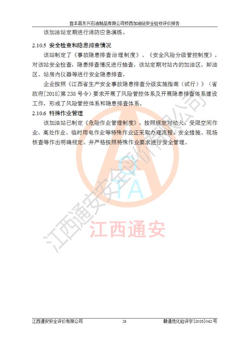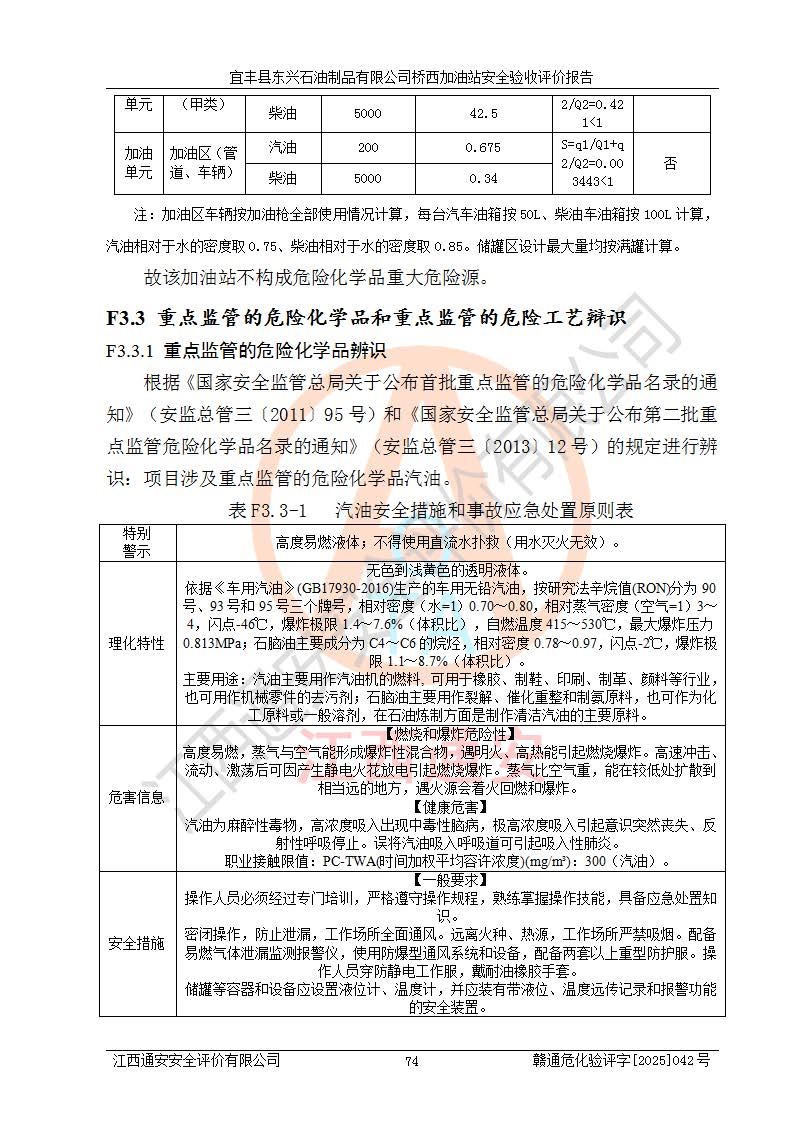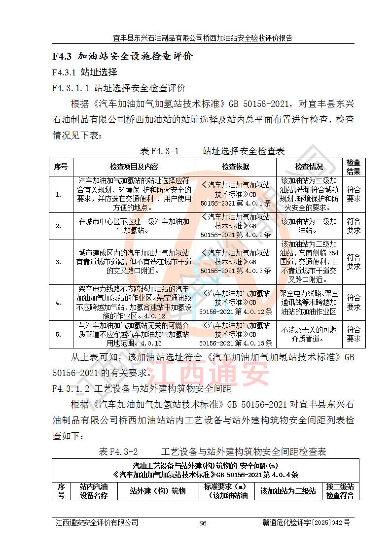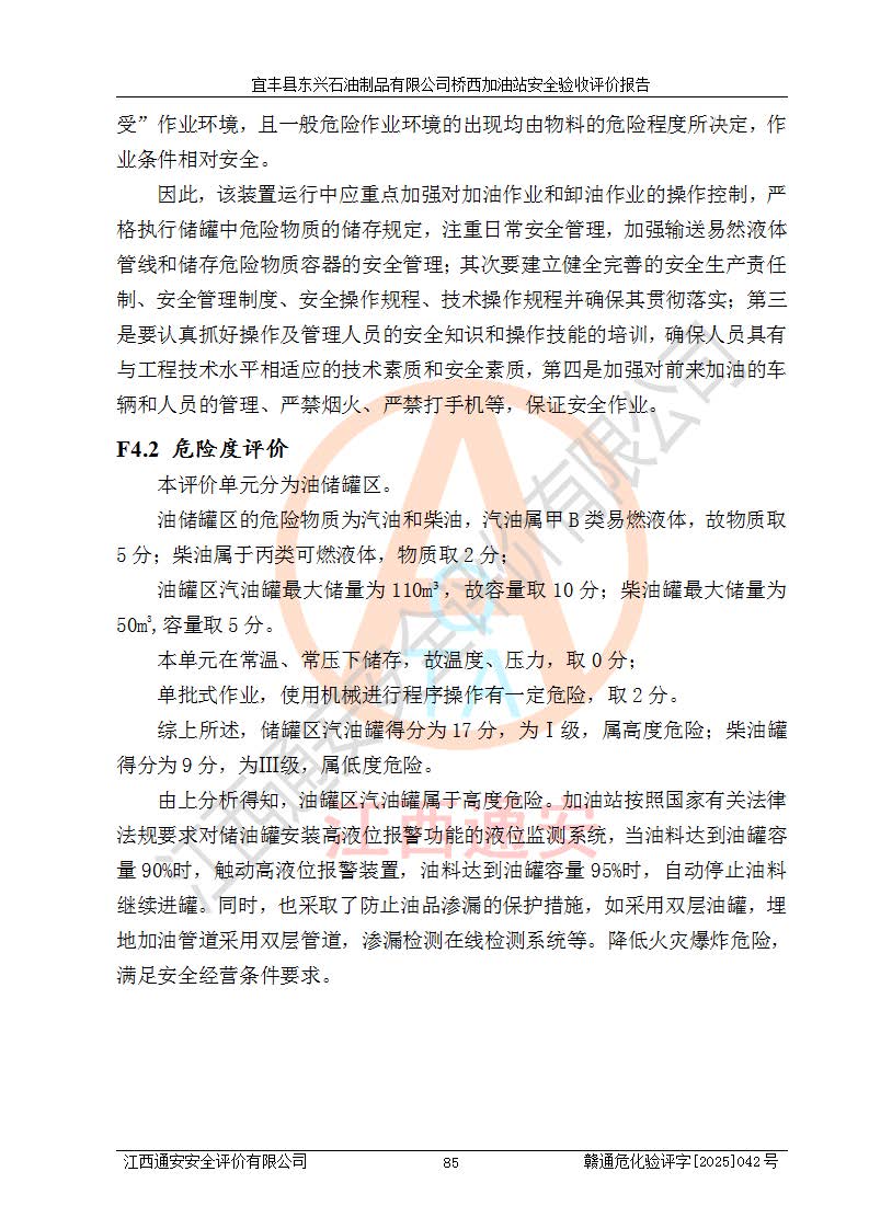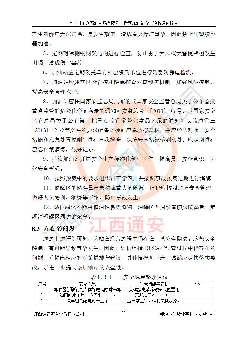 其它 | 一、安全狀況綜合評(píng)述 宜豐縣東興石油制品有限公司橋西加油站位于宜春市宜豐縣橋西鄉(xiāng),從事成品油(汽油、柴油)零售業(yè)務(wù),屬二級(jí)加油站。 通過(guò)對(duì)該加油站建設(shè)項(xiàng)目安全驗(yàn)收評(píng)價(jià),得出以下評(píng)價(jià)結(jié)論: 化學(xué)品、設(shè)備及工藝辨識(shí)結(jié)果 經(jīng)辨識(shí),該加油站經(jīng)營(yíng)、儲(chǔ)存危險(xiǎn)化學(xué)品為汽油和柴油,其中汽油屬于重點(diǎn)監(jiān)管危險(xiǎn)化學(xué)品、特別管控危險(xiǎn)化學(xué)品;該加油站不涉及劇毒化學(xué)品、高毒物品、易制毒化學(xué)品、監(jiān)控化學(xué)品、易制爆化學(xué)品。經(jīng)營(yíng)、儲(chǔ)存過(guò)程中采用的設(shè)備及工藝不屬于淘汰落后設(shè)備及工藝、不涉及危險(xiǎn)化工工藝,生產(chǎn)和儲(chǔ)存單元均不構(gòu)成危險(xiǎn)化學(xué)品重大危險(xiǎn)源。 建設(shè)項(xiàng)目所在地的安全條件和周邊的安全間距 該站東南側(cè)臨354國(guó)道,北側(cè)、西側(cè)、東側(cè)為居民建筑,加油站為二級(jí)加油站,設(shè)有油氣回收系統(tǒng),站外50米范圍內(nèi)無(wú)重要公共建筑物、明火設(shè)備和甲、乙類生產(chǎn)及儲(chǔ)存設(shè)施,站區(qū)內(nèi)加油設(shè)施與周邊建構(gòu)筑物之間的距離能夠滿足《汽車加油加氣加氫站技術(shù)標(biāo)準(zhǔn)》GB50156-2021 和《建筑設(shè)計(jì)防火規(guī)范》GB50016-2014(2018 年版)以及相關(guān)**規(guī)范要求。本報(bào)告認(rèn)為該加油站建設(shè)項(xiàng)目周邊對(duì)加油站的影響以及建設(shè)項(xiàng)目所在地的自然條件對(duì)建設(shè)項(xiàng)目投入使用后的影響均較小,該加油站具備標(biāo)準(zhǔn)規(guī)范所要求的安全條件。 該項(xiàng)目安全設(shè)計(jì)診斷報(bào)告的采納情況 該加油站安全設(shè)計(jì)診斷報(bào)告核查的問(wèn)題(共15項(xiàng))及整改建議均已采納,經(jīng)評(píng)價(jià)組現(xiàn)場(chǎng)復(fù)核,均已整改完成。 該項(xiàng)目調(diào)試中表現(xiàn)出的技術(shù)、工藝和裝置、設(shè)備(設(shè)施)的安全、 可靠性和安全水平。 該加油站整改過(guò)程工作進(jìn)展順利,處于正常狀態(tài)。經(jīng)查閱資料和分析評(píng)價(jià),認(rèn)為本項(xiàng)目技術(shù)、工藝和裝置、設(shè)備(設(shè)施)的安全、可靠性和安全水平符合**相應(yīng)安全標(biāo)準(zhǔn)的要求。 該加油站儲(chǔ)存經(jīng)營(yíng)的汽油屬于重點(diǎn)監(jiān)管的危險(xiǎn)化學(xué)品和特別管控危險(xiǎn)化學(xué)品,該加油站在后續(xù)的經(jīng)營(yíng)中應(yīng)按照相關(guān)規(guī)范和要求加強(qiáng)安全管理,要求油品運(yùn)輸單位強(qiáng)化運(yùn)輸管理、自身加強(qiáng)儲(chǔ)存定制化管理。 該加油站經(jīng)營(yíng)過(guò)程中存在的危險(xiǎn)有害因素為:①火災(zāi)、爆炸;② 中毒和窒息;③**傷害;④觸電;⑤高處墜落;⑥物體打擊、⑦其他傷害。 其中火災(zāi)、爆炸是主要的危險(xiǎn)、有害因素,加油站埋地儲(chǔ)罐區(qū)、加油區(qū)、卸 油區(qū)是主要的危險(xiǎn)源。 (7)經(jīng)采用作業(yè)條件危險(xiǎn)性評(píng)價(jià)法(LEC)進(jìn)行分析,該加油站的作業(yè)條件相對(duì)比較安全。在選定的加油作業(yè)、卸油作業(yè)、維修作業(yè)、配電作業(yè)等4個(gè)單元中均為“一般危險(xiǎn)、需要注意”作業(yè)環(huán)境,且一般危險(xiǎn)作業(yè)環(huán)境的出現(xiàn)均由物料的危險(xiǎn)程度所決定,作業(yè)條件相對(duì)安全。 (8)采用危險(xiǎn)度評(píng)價(jià)法分析,油罐區(qū)主要危險(xiǎn)物質(zhì)為汽油和柴油,常溫、常壓下儲(chǔ)存。儲(chǔ)罐區(qū)汽油罐為Ⅰ級(jí),屬**危險(xiǎn);柴油罐得分為為Ⅲ級(jí),屬低度危險(xiǎn)。油罐采用雙層罐埋地設(shè)置,按要求設(shè)置了通氣管,并裝設(shè)了阻火器;設(shè)置了液位監(jiān)測(cè)報(bào)警系統(tǒng)和緊急切斷系統(tǒng),埋地加油管道設(shè)置雙層管道,其安全風(fēng)險(xiǎn)可控。 (9)采用檢查表評(píng)價(jià)法對(duì)該加油站站址選擇、總平面布置、加油工藝及設(shè)施、消防設(shè)施和給排水、電氣與報(bào)警和緊急切斷系統(tǒng)等進(jìn)行檢查分析,經(jīng)整改后,該加油站涉及的強(qiáng)制條款和其他項(xiàng)均符合要求。該加油站設(shè)置了消防安全設(shè)施、防雷防靜電設(shè)施、液位監(jiān)測(cè)措施、油罐泄漏檢測(cè)措施、電氣防爆措施等安全防護(hù)設(shè)施,取得了消防驗(yàn)收意見(jiàn)書(shū)和防雷檢測(cè)合格報(bào)告,符合**法律法規(guī)、標(biāo)準(zhǔn)規(guī)范的要求。該加油站公用工程能夠滿足安全經(jīng)營(yíng)的基本需要,符合安全經(jīng)營(yíng)的條件。 (10)該加油站相關(guān)證照齊全,成立了安全生產(chǎn)**小組,配備了安全管理人員,制定了安全管理制度、操作規(guī)程和事故應(yīng)急預(yù)案,加油站的安全管理機(jī)構(gòu)工作有力,加油站安全經(jīng)營(yíng)管理處于正常有序開(kāi)展范圍。 (11)對(duì)宜豐縣東興石油制品有限公司橋西加油站存在重大生產(chǎn)安全事故隱患進(jìn)行判定,檢查結(jié)果為該加油站不存在重大生產(chǎn)安全事故隱患。 總體評(píng)價(jià)結(jié)論:宜豐縣東