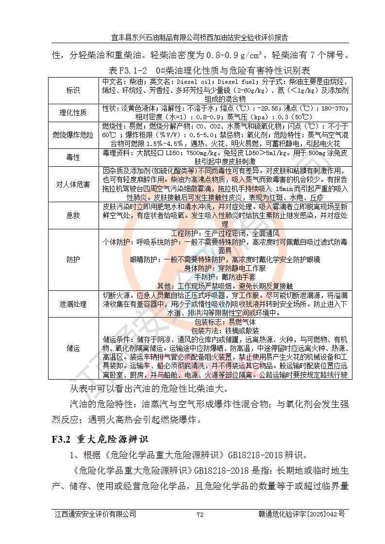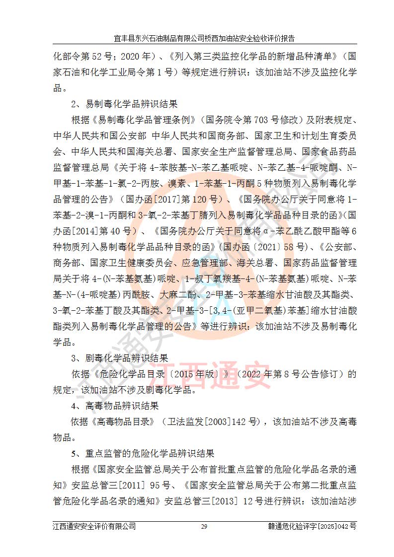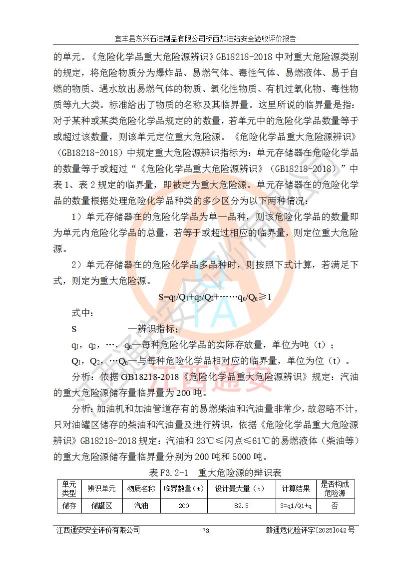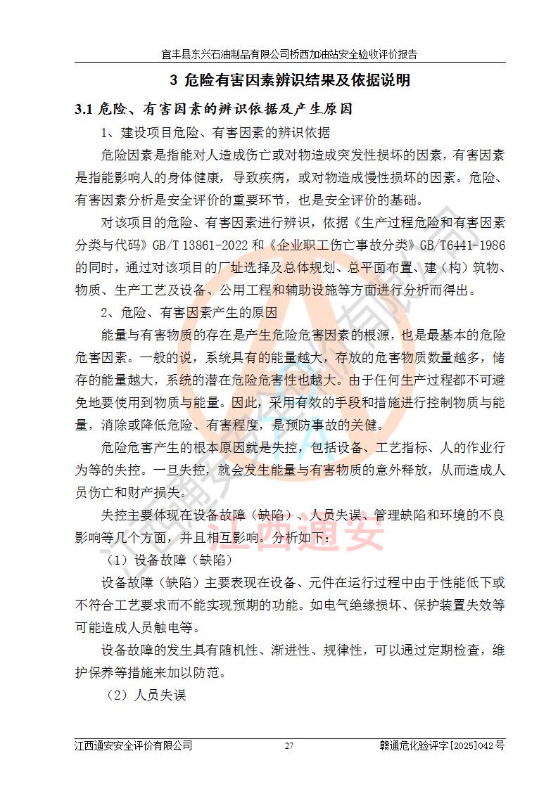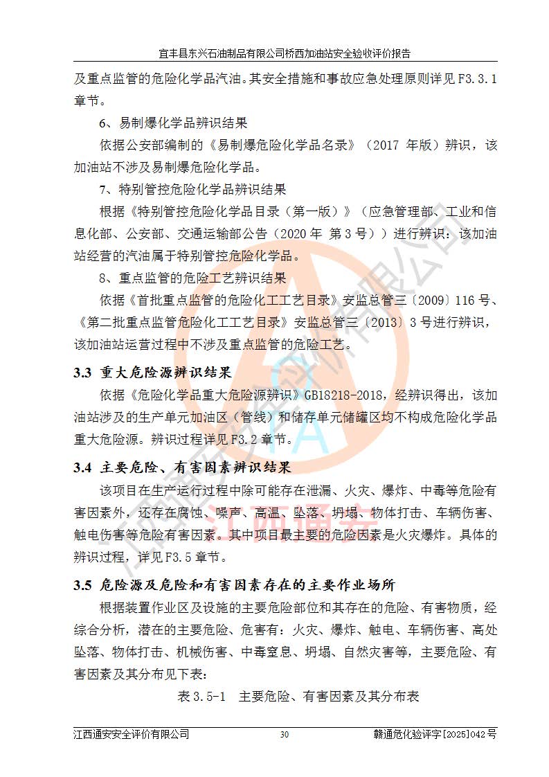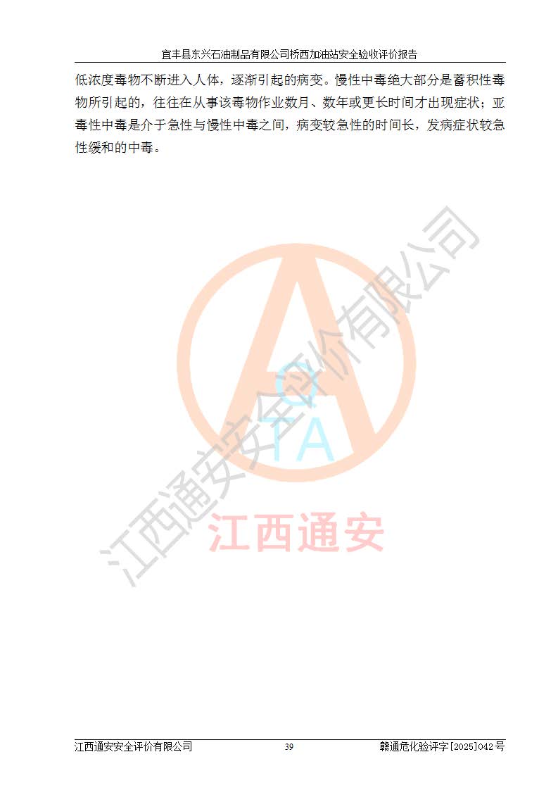 其它 | 一、安全狀況綜合評(píng)述 宜豐縣東興石油制品有限公司橋西加油站位于宜春市宜豐縣橋西鄉(xiāng),從事成品油(汽油、柴油)零售業(yè)務(wù),屬二級(jí)加油站。 通過(guò)對(duì)該加油站建設(shè)項(xiàng)目安全驗(yàn)收評(píng)價(jià),得出以下評(píng)價(jià)結(jié)論: 化學(xué)品、設(shè)備及工藝辨識(shí)結(jié)果 經(jīng)辨識(shí),該加油站經(jīng)營(yíng)、儲(chǔ)存危險(xiǎn)化學(xué)品為汽油和柴油,其中汽油屬于重點(diǎn)監(jiān)管危險(xiǎn)化學(xué)品、特別管控危險(xiǎn)化學(xué)品;該加油站不涉及劇毒化學(xué)品、高毒物品、易制毒化學(xué)品、監(jiān)控化學(xué)品、易制爆化學(xué)品。經(jīng)營(yíng)、儲(chǔ)存過(guò)程中采用的設(shè)備及工藝不屬于淘汰落后設(shè)備及工藝、不涉及危險(xiǎn)化工工藝,生產(chǎn)和儲(chǔ)存單元均不構(gòu)成危險(xiǎn)化學(xué)品重大危險(xiǎn)源。 建設(shè)項(xiàng)目所在地的安全條件和周邊的安全間距 該站東南側(cè)臨354國(guó)道,北側(cè)、西側(cè)、東側(cè)為居民建筑,加油站為二級(jí)加油站,設(shè)有油氣回收系統(tǒng),站外50米范圍內(nèi)無(wú)重要公共建筑物、明火設(shè)備和甲、乙類生產(chǎn)及儲(chǔ)存設(shè)施,站區(qū)內(nèi)加油設(shè)施與周邊建構(gòu)筑物之間的距離能夠滿足《汽車加油加氣加氫站技術(shù)標(biāo)準(zhǔn)》GB50156-2021 和《建筑設(shè)計(jì)防火規(guī)范》GB50016-2014(2018 年版)以及相關(guān)**規(guī)范要求。本報(bào)告認(rèn)為該加油站建設(shè)項(xiàng)目周邊對(duì)加油站的影響以及建設(shè)項(xiàng)目所在地的自然條件對(duì)建設(shè)項(xiàng)目投入使用后的影響均較小,該加油站具備標(biāo)準(zhǔn)規(guī)范所要求的安全條件。 該項(xiàng)目安全設(shè)計(jì)診斷報(bào)告的采納情況 該加油站安全設(shè)計(jì)診斷報(bào)告核查的問(wèn)題(共15項(xiàng))及整改建議均已采納,經(jīng)評(píng)價(jià)組現(xiàn)場(chǎng)復(fù)核,均已整改完成。 該項(xiàng)目調(diào)試中表現(xiàn)出的技術(shù)、工藝和裝置、設(shè)備(設(shè)施)的安全、 可靠性和安全水平。 該加油站整改過(guò)程工作進(jìn)展順利,處于正常狀態(tài)。經(jīng)查閱資料和分析評(píng)價(jià),認(rèn)為本項(xiàng)目技術(shù)、工藝和裝置、設(shè)備(設(shè)施)的安全、可靠性和安全水平符合**相應(yīng)安全標(biāo)準(zhǔn)的要求。 該加油站儲(chǔ)存經(jīng)營(yíng)的汽油屬于重點(diǎn)監(jiān)管的危險(xiǎn)化學(xué)品和特別管控危險(xiǎn)化學(xué)品,該加油站在后續(xù)的經(jīng)營(yíng)中應(yīng)按照相關(guān)規(guī)范和要求加強(qiáng)安全管理,要求油品運(yùn)輸單位強(qiáng)化運(yùn)輸管理、自身加強(qiáng)儲(chǔ)存定制化管理。 該加油站經(jīng)營(yíng)過(guò)程中存在的危險(xiǎn)有害因素為:①火災(zāi)、爆炸;② 中毒和窒息;③**傷害;④觸電;⑤高處墜落;⑥物體打擊、⑦其他傷害。 其中火災(zāi)、爆炸是主要的危險(xiǎn)、有害因素,加油站埋地儲(chǔ)罐區(qū)、加油區(qū)、卸 油區(qū)是主要的危險(xiǎn)源。 (7)經(jīng)采用作業(yè)條件危險(xiǎn)性評(píng)價(jià)法(LEC)進(jìn)行分析,該加油站的作業(yè)條件相對(duì)比較安全。在選定的加油作業(yè)、卸油作業(yè)、維修作業(yè)、配電作業(yè)等4個(gè)單元中均為“一般危險(xiǎn)、需要注意”作業(yè)環(huán)境,且一般危險(xiǎn)作業(yè)環(huán)境的出現(xiàn)均由物料的危險(xiǎn)程度所決定,作業(yè)條件相對(duì)安全。 (8)采用危險(xiǎn)度評(píng)價(jià)法分析,油罐區(qū)主要危險(xiǎn)物質(zhì)為汽油和柴油,常溫、常壓下儲(chǔ)存。儲(chǔ)罐區(qū)汽油罐為Ⅰ級(jí),屬**危險(xiǎn);柴油罐得分為為Ⅲ級(jí),屬低度危險(xiǎn)。油罐采用雙層罐埋地設(shè)置,按要求設(shè)置了通氣管,并裝設(shè)了阻火器;設(shè)置了液位監(jiān)測(cè)報(bào)警系統(tǒng)和緊急切斷系統(tǒng),埋地加油管道設(shè)置雙層管道,其安全風(fēng)險(xiǎn)可控。 (9)采用檢查表評(píng)價(jià)法對(duì)該加油站站址選擇、總平面布置、加油工藝及設(shè)施、消防設(shè)施和給排水、電氣與報(bào)警和緊急切斷系統(tǒng)等進(jìn)行檢查分析,經(jīng)整改后,該加油站涉及的強(qiáng)制條款和其他項(xiàng)均符合要求。該加油站設(shè)置了消防安全設(shè)施、防雷防靜電設(shè)施、液位監(jiān)測(cè)措施、油罐泄漏檢測(cè)措施、電氣防爆措施等安全防護(hù)設(shè)施,取得了消防驗(yàn)收意見(jiàn)書(shū)和防雷檢測(cè)合格報(bào)告,符合**法律法規(guī)、標(biāo)準(zhǔn)規(guī)范的要求。該加油站公用工程能夠滿足安全經(jīng)營(yíng)的基本需要,符合安全經(jīng)營(yíng)的條件。 (10)該加油站相關(guān)證照齊全,成立了安全生產(chǎn)**小組,配備了安全管理人員,制定了安全管理制度、操作規(guī)程和事故應(yīng)急預(yù)案,加油站的安全管理機(jī)構(gòu)工作有力,加油站安全經(jīng)營(yíng)管理處于正常有序開(kāi)展范圍。 (11)對(duì)宜豐縣東興石油制品有限公司橋西加油站存在重大生產(chǎn)安全事故隱患進(jìn)行判定,檢查結(jié)果為該加油站不存在重大生產(chǎn)安全事故隱患。 總體評(píng)價(jià)結(jié)論:宜豐縣東