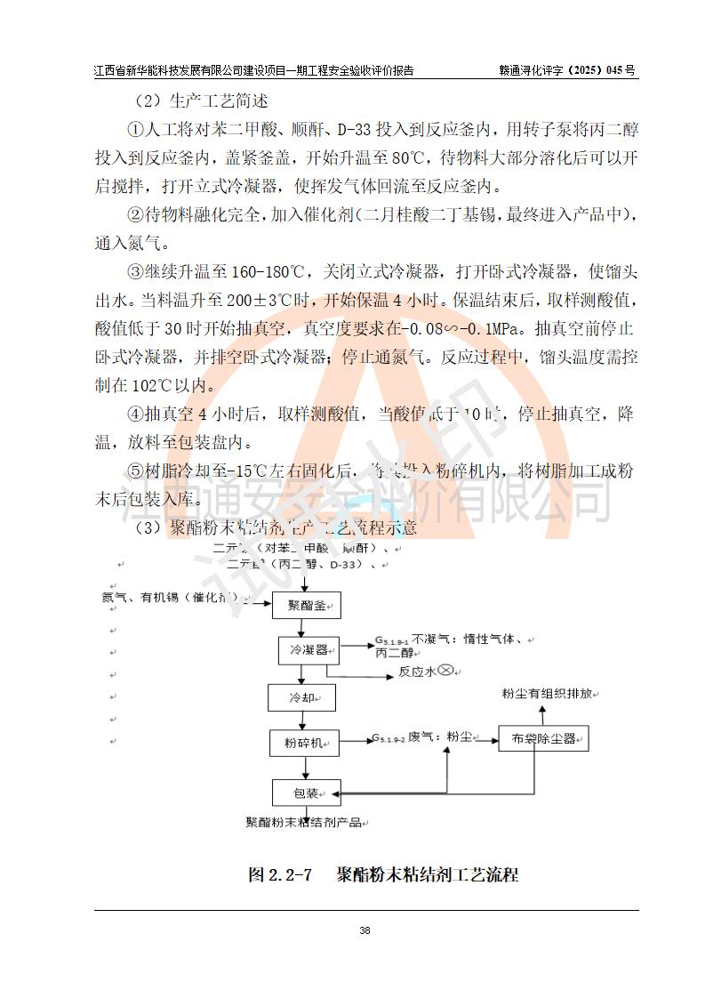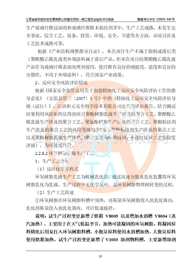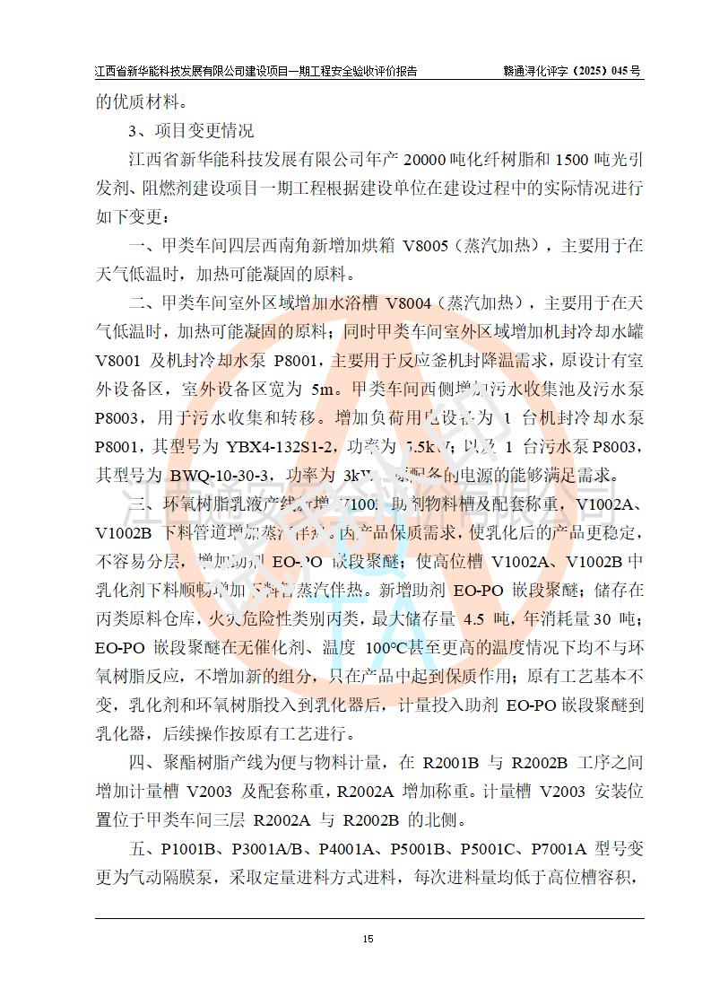 項(xiàng)目簡介 | 項(xiàng)目名稱:年產(chǎn)20000噸化纖樹脂和1500噸光引發(fā)劑、阻燃劑建設(shè)項(xiàng)目一期工程(年產(chǎn)16000化纖樹脂項(xiàng)目) 年產(chǎn)16000噸化纖樹脂項(xiàng)目,包括:年產(chǎn)3000噸環(huán)氧樹脂乳液、年產(chǎn)3000噸聚酯樹脂乳液、年產(chǎn)3000噸聚醋酸乙烯乳液、年產(chǎn)1000噸聚氨酯樹脂溶液、年產(chǎn)1000噸改性環(huán)氧樹脂溶液、年產(chǎn)5000噸聚酯粉末粘結(jié)劑(一期為液體),而年產(chǎn)20000噸化纖樹脂和1500噸光引發(fā)劑、阻燃劑建設(shè)項(xiàng)目中年產(chǎn)2000噸環(huán)氧樹脂和年產(chǎn)1500噸光引發(fā)劑、阻燃劑生產(chǎn)裝置以及年產(chǎn)2000噸聚氨酯樹脂溶液兩條生產(chǎn)線中的一條生產(chǎn)線(年產(chǎn)1000噸聚氨酯樹脂溶液)、年產(chǎn)2000噸改性環(huán)氧樹脂溶液兩條生產(chǎn)線中的一條生產(chǎn)線(年產(chǎn)1000噸改性環(huán)氧樹脂溶液)生產(chǎn)裝置因市場等原因目前沒有建設(shè) 建設(shè)單位:江西省新華能科技發(fā)展有限公司 建設(shè)地點(diǎn):江西彭澤工業(yè)園區(qū)磯山化工園 項(xiàng)目性質(zhì):新建 總投資:4000萬元 占地面積:21.9畝 設(shè)計(jì)單位:揚(yáng)州惠通科技股份有限公司[化工石化醫(yī)藥行業(yè)(化工工程)專業(yè)**] 房屋建設(shè)施工單位:江西裕正禾建設(shè)有限公司 房屋建設(shè)監(jiān)理單位:河南海納建設(shè)管理有限公司(工程監(jiān)理綜合資質(zhì)) 設(shè)備安裝單位:江蘇漢皇安裝集團(tuán)有限公司(資質(zhì)等級(jí):石油化工工程施工總承包貳級(jí)) 設(shè)備安裝監(jiān)理單位:同致誠工程咨詢有限公司(工程監(jiān)理綜合資質(zhì)) 儀電安裝單位、調(diào)試單位:上海南服控制工程有限公司 | |||||