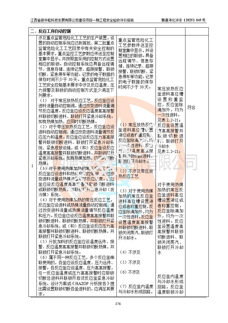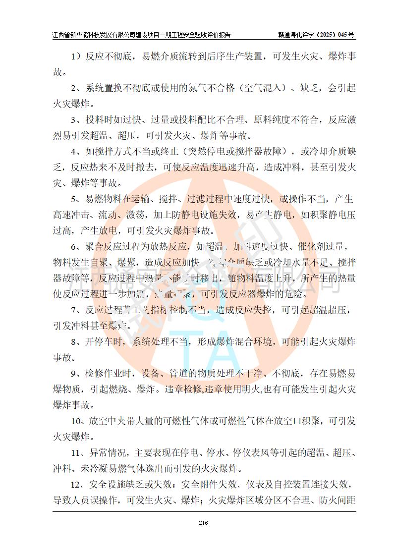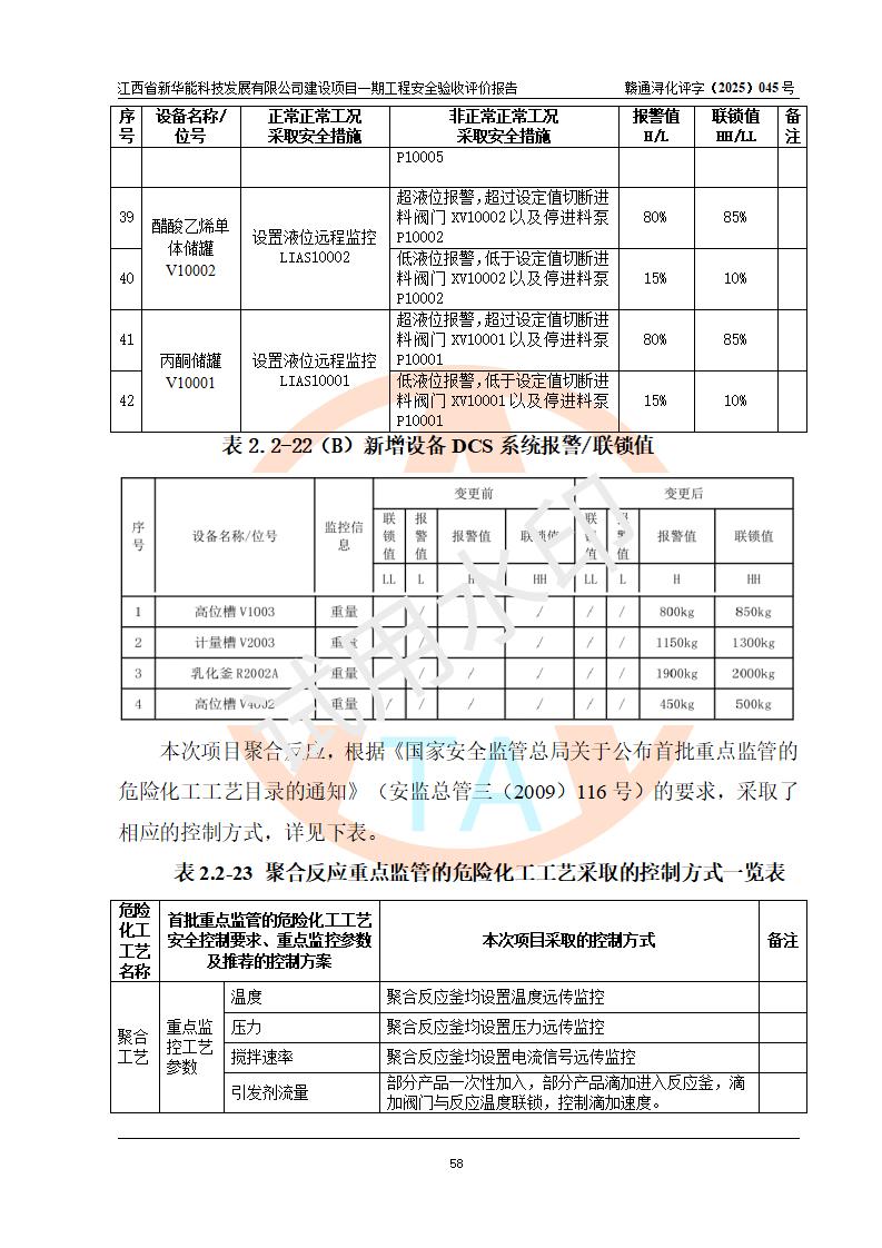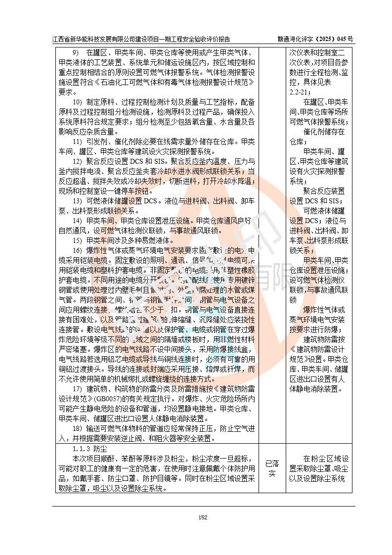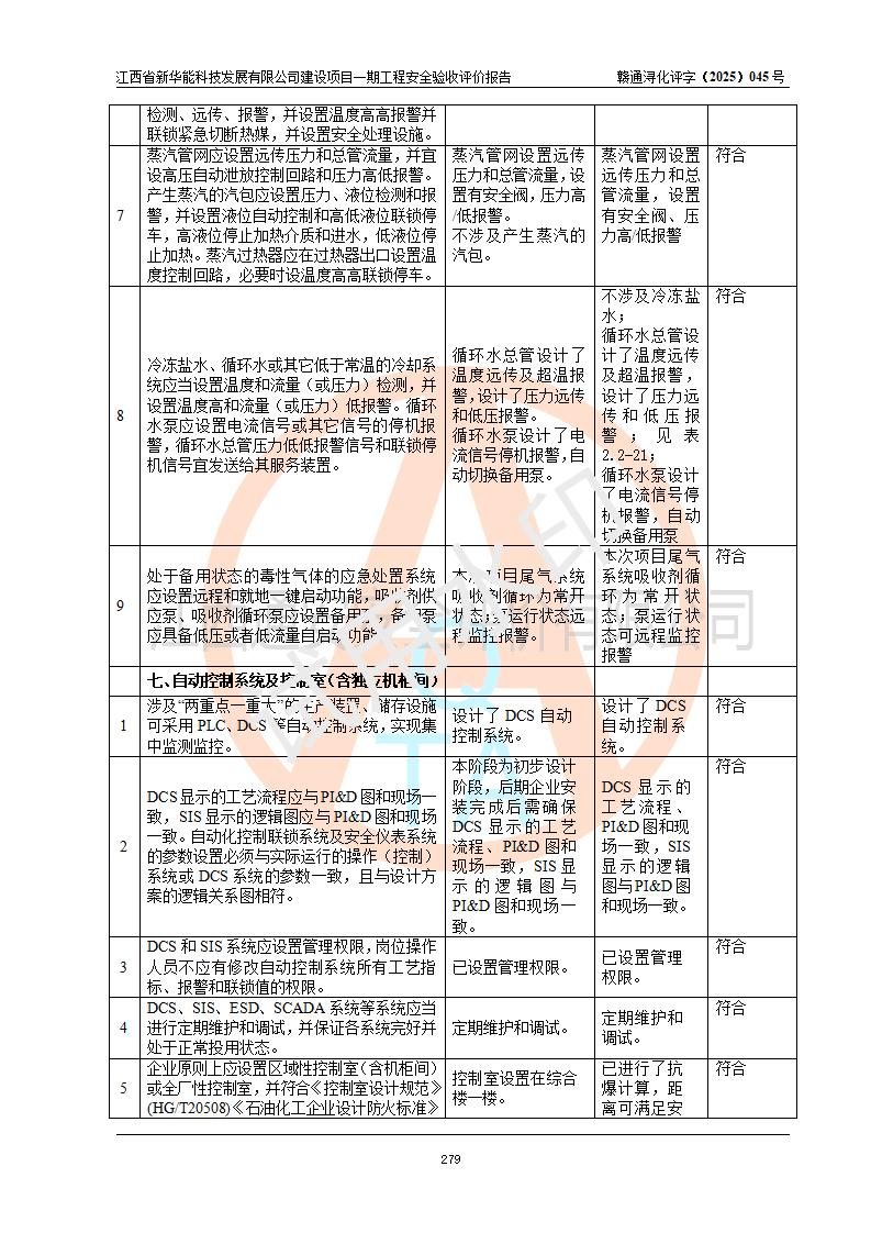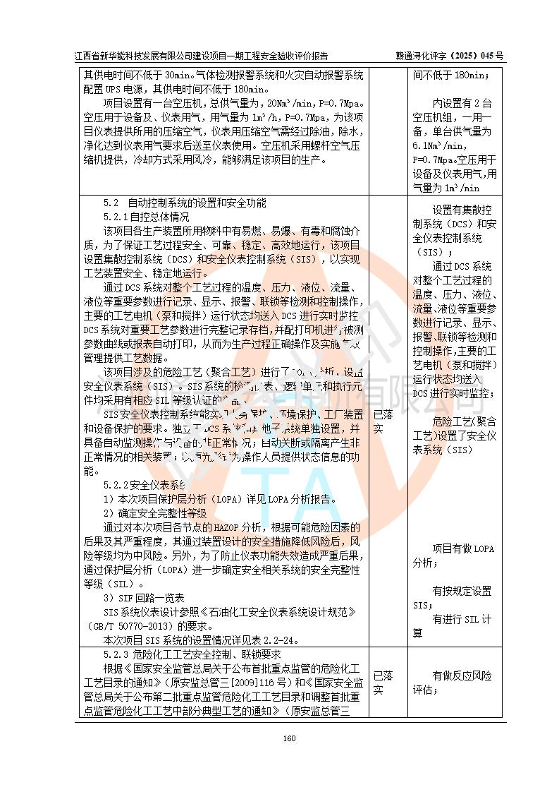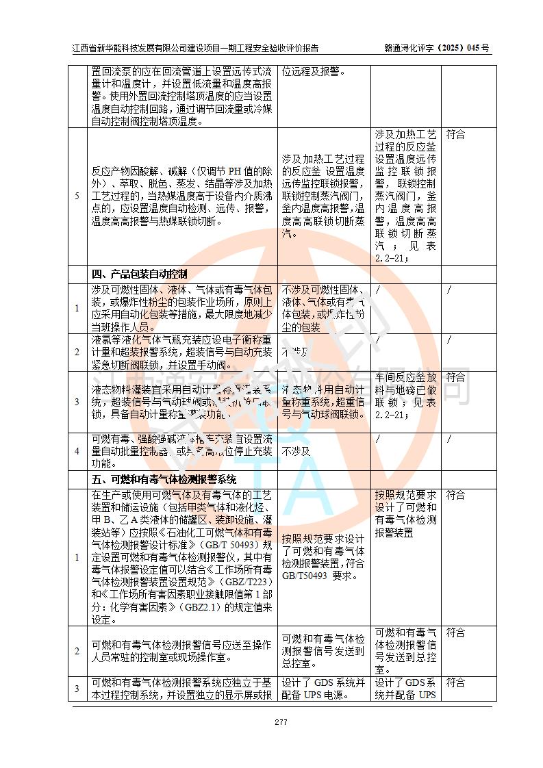 評(píng)價(jià)結(jié)論 | 經(jīng)評(píng)價(jià)組評(píng)價(jià),江西省新華能科技發(fā)展有限公司年產(chǎn)20000噸化纖樹脂和1500噸光引發(fā)劑、阻燃劑建設(shè)項(xiàng)目一期工程(年產(chǎn)16000化纖樹脂項(xiàng)目)總體布局、現(xiàn)場設(shè)備布置情況與設(shè)計(jì)圖紙一致,本次項(xiàng)目涉及重點(diǎn)監(jiān)管的危險(xiǎn)化學(xué)品、危險(xiǎn)工藝,按設(shè)計(jì)要求,設(shè)置有DCS系統(tǒng)、SIS系統(tǒng)、GDS系統(tǒng),符合《江西省應(yīng)急管理廳關(guān)于印發(fā)(試行)的通知 》、關(guān)于印發(fā)《九江市化工企業(yè)自動(dòng)化提升實(shí)施方案》的安全要求,符合《危險(xiǎn)化學(xué)品生產(chǎn)建設(shè)項(xiàng)目安全風(fēng)險(xiǎn)防控指南(試行)》規(guī)定竣工驗(yàn)收的安全條件;企業(yè)主要負(fù)責(zé)人、安全管理部門負(fù)責(zé)人均為化學(xué)、化工相關(guān)專業(yè),且有3年以上化工行業(yè)從業(yè)經(jīng)歷,企業(yè)主要負(fù)責(zé)人及安全管理人員已取得危險(xiǎn)化學(xué)品企業(yè)主要負(fù)責(zé)人及安全管理人員考核合格證。項(xiàng)目選擇的工藝過程及設(shè)備設(shè)施的安全可靠性能 達(dá)到**法規(guī)、標(biāo)準(zhǔn)規(guī)定要求。 項(xiàng)目運(yùn)行后存在的主要危險(xiǎn)、有害因素有:火災(zāi)、其他爆炸、容器爆炸、中毒與窒息等;存在的主要有害因素有高溫、化學(xué)物質(zhì)危害等;針對(duì)存在的危險(xiǎn)、有害因素,企業(yè)采取了**的安全技術(shù)措施及安全管理措施,符合**有關(guān)法規(guī)、標(biāo)準(zhǔn)、規(guī)范要求;項(xiàng)目風(fēng)險(xiǎn)可控,其安全生產(chǎn)條件和安全管理 方面具備竣工安全驗(yàn)收的條件。 | |||||