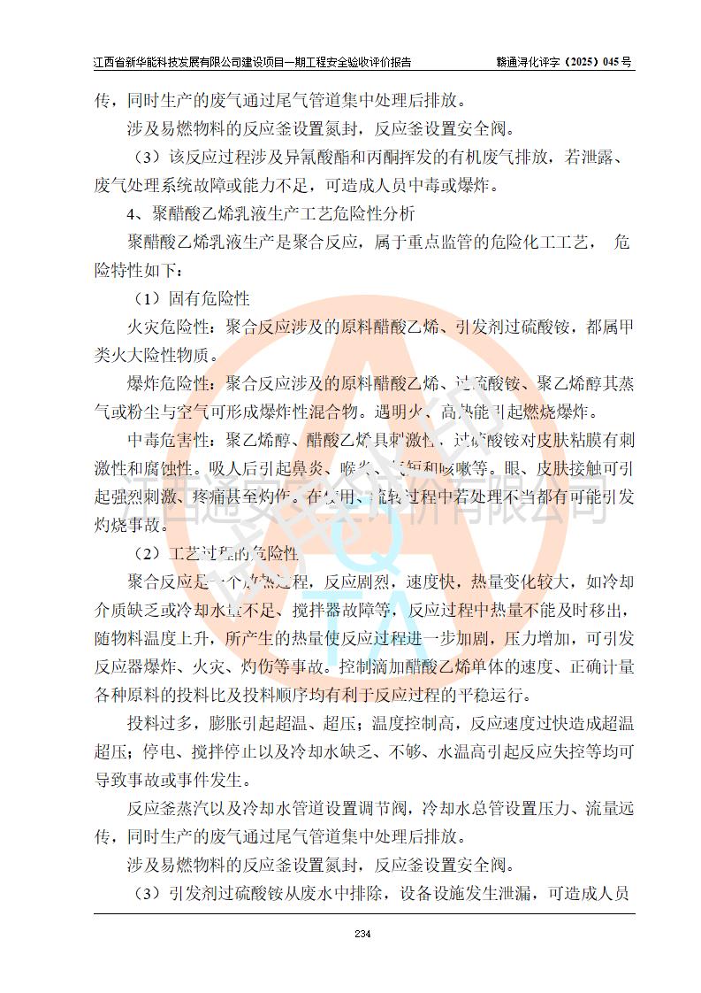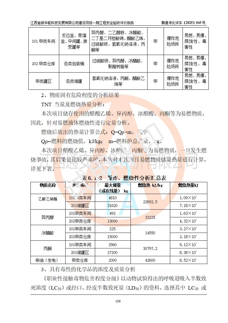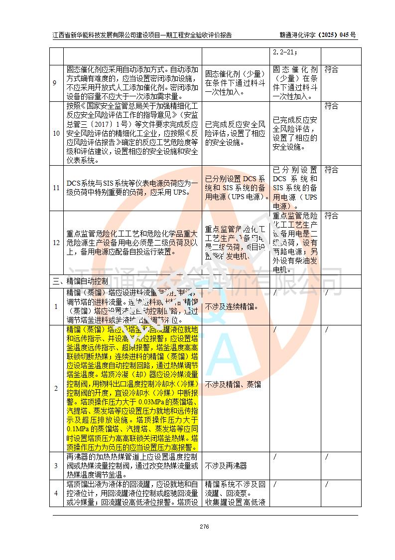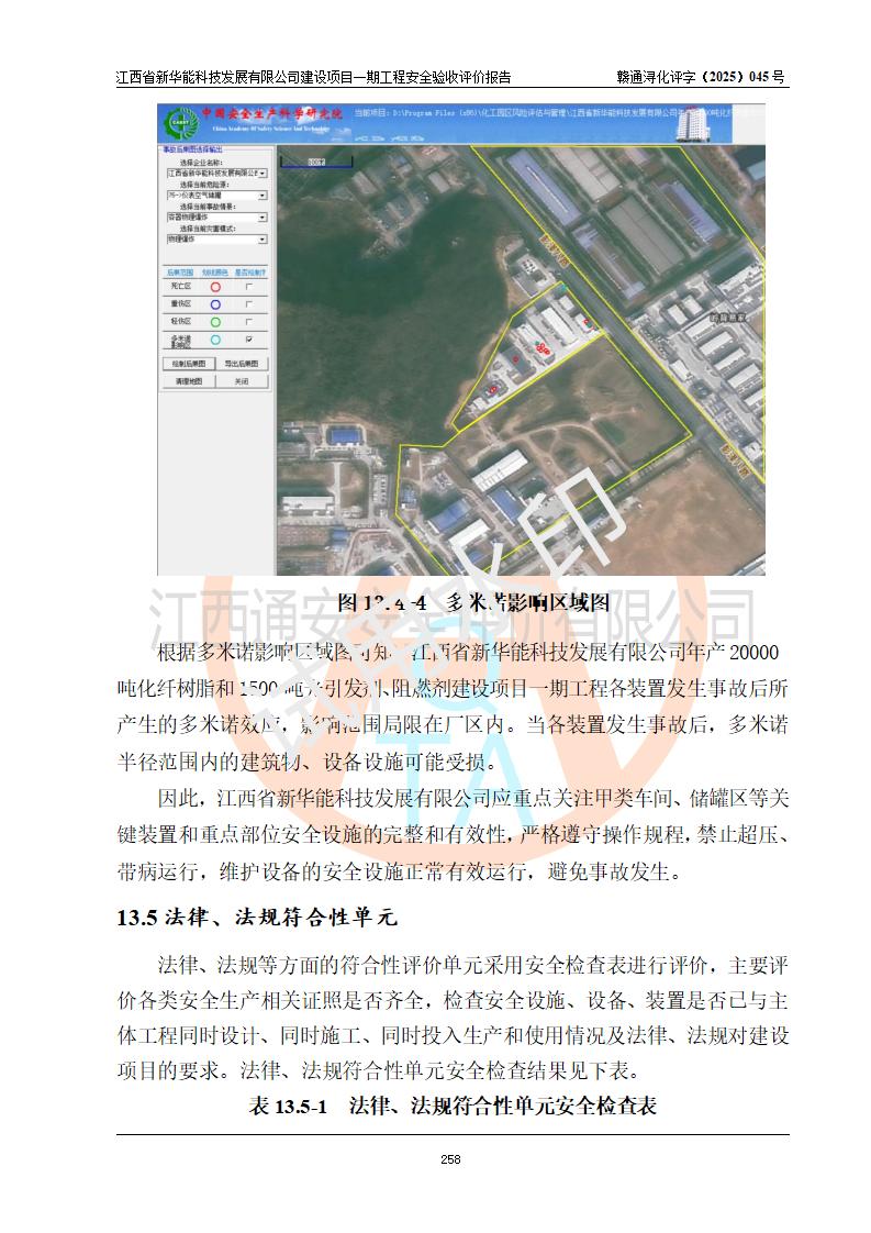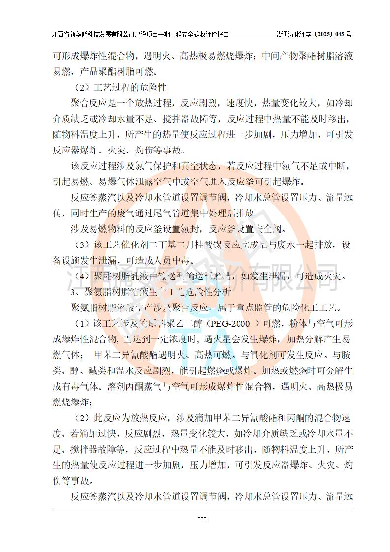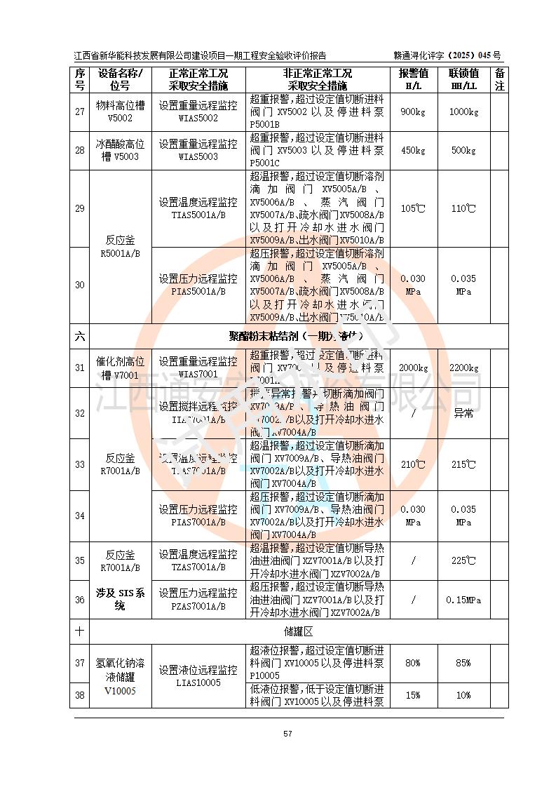 評(píng)價(jià)結(jié)論 | 經(jīng)評(píng)價(jià)組評(píng)價(jià),江西省新華能科技發(fā)展有限公司年產(chǎn)20000噸化纖樹脂和1500噸光引發(fā)劑、阻燃劑建設(shè)項(xiàng)目一期工程(年產(chǎn)16000化纖樹脂項(xiàng)目)總體布局、現(xiàn)場設(shè)備布置情況與設(shè)計(jì)圖紙一致,本次項(xiàng)目涉及重點(diǎn)監(jiān)管的危險(xiǎn)化學(xué)品、危險(xiǎn)工藝,按設(shè)計(jì)要求,設(shè)置有DCS系統(tǒng)、SIS系統(tǒng)、GDS系統(tǒng),符合《江西省應(yīng)急管理廳關(guān)于印發(fā)(試行)的通知 》、關(guān)于印發(fā)《九江市化工企業(yè)自動(dòng)化提升實(shí)施方案》的安全要求,符合《危險(xiǎn)化學(xué)品生產(chǎn)建設(shè)項(xiàng)目安全風(fēng)險(xiǎn)防控指南(試行)》規(guī)定竣工驗(yàn)收的安全條件;企業(yè)主要負(fù)責(zé)人、安全管理部門負(fù)責(zé)人均為化學(xué)、化工相關(guān)專業(yè),且有3年以上化工行業(yè)從業(yè)經(jīng)歷,企業(yè)主要負(fù)責(zé)人及安全管理人員已取得危險(xiǎn)化學(xué)品企業(yè)主要負(fù)責(zé)人及安全管理人員考核合格證。項(xiàng)目選擇的工藝過程及設(shè)備設(shè)施的安全可靠性能 達(dá)到**法規(guī)、標(biāo)準(zhǔn)規(guī)定要求。 項(xiàng)目運(yùn)行后存在的主要危險(xiǎn)、有害因素有:火災(zāi)、其他爆炸、容器爆炸、中毒與窒息等;存在的主要有害因素有高溫、化學(xué)物質(zhì)危害等;針對(duì)存在的危險(xiǎn)、有害因素,企業(yè)采取了**的安全技術(shù)措施及安全管理措施,符合**有關(guān)法規(guī)、標(biāo)準(zhǔn)、規(guī)范要求;項(xiàng)目風(fēng)險(xiǎn)可控,其安全生產(chǎn)條件和安全管理 方面具備竣工安全驗(yàn)收的條件。 | |||||
