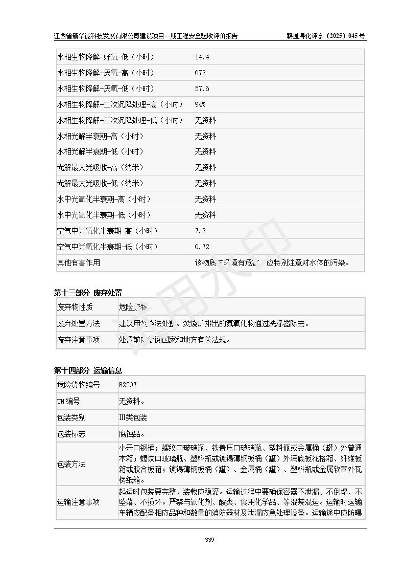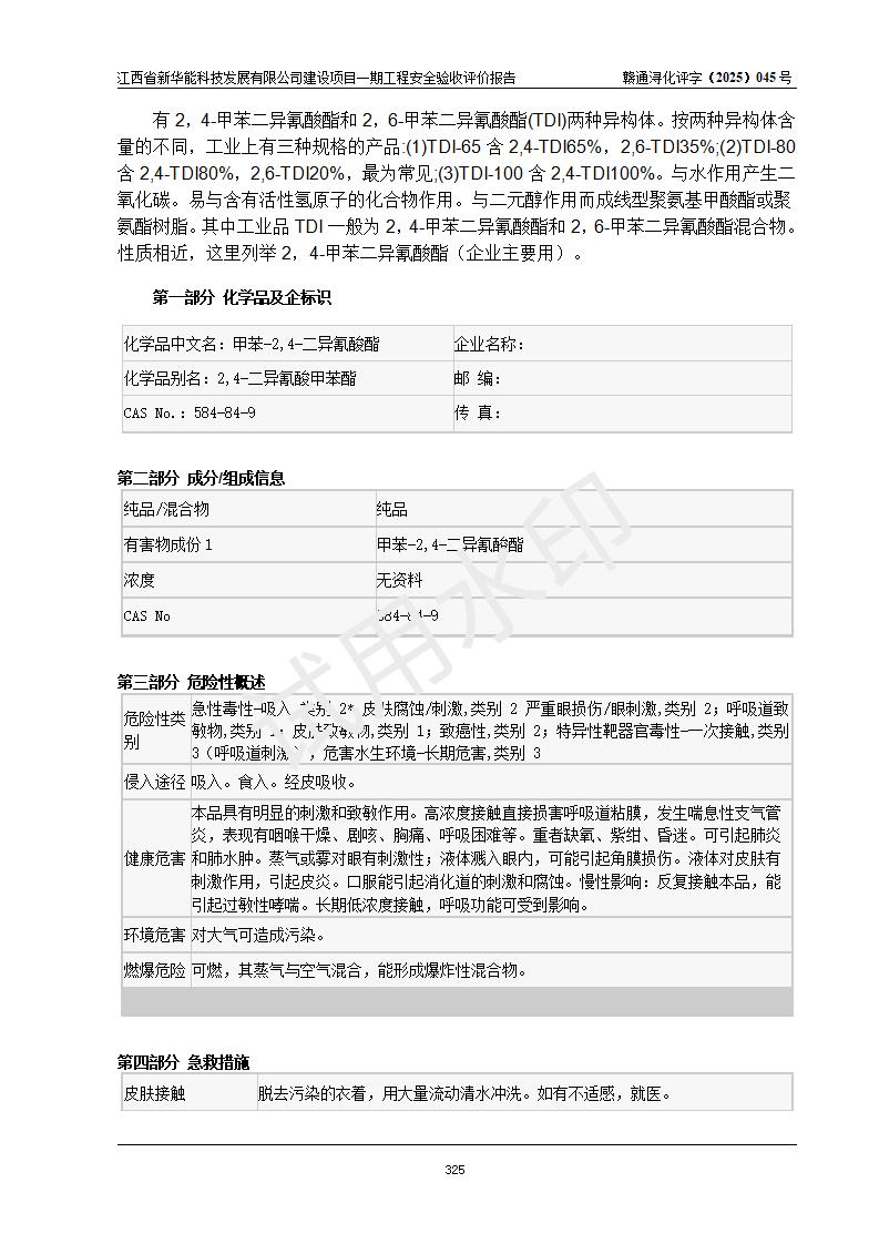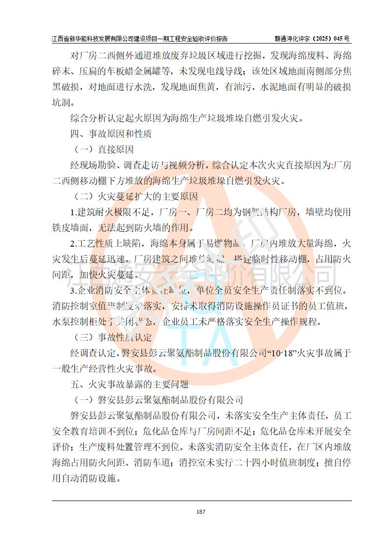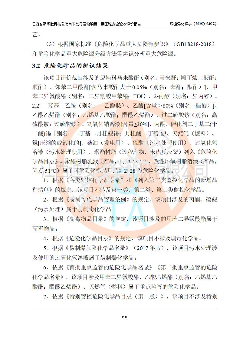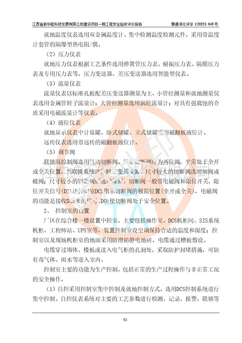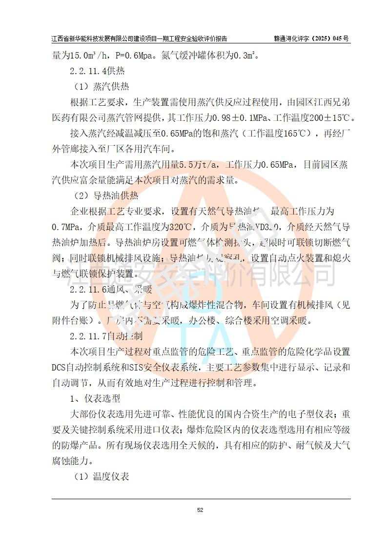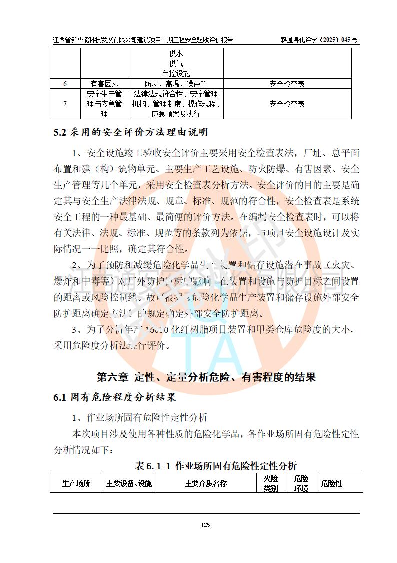 評(píng)價(jià)結(jié)論 | 經(jīng)評(píng)價(jià)組評(píng)價(jià),江西省新華能科技發(fā)展有限公司年產(chǎn)20000噸化纖樹脂和1500噸光引發(fā)劑、阻燃劑建設(shè)項(xiàng)目一期工程(年產(chǎn)16000化纖樹脂項(xiàng)目)總體布局、現(xiàn)場設(shè)備布置情況與設(shè)計(jì)圖紙一致,本次項(xiàng)目涉及重點(diǎn)監(jiān)管的危險(xiǎn)化學(xué)品、危險(xiǎn)工藝,按設(shè)計(jì)要求,設(shè)置有DCS系統(tǒng)、SIS系統(tǒng)、GDS系統(tǒng),符合《江西省應(yīng)急管理廳關(guān)于印發(fā)(試行)的通知 》、關(guān)于印發(fā)《九江市化工企業(yè)自動(dòng)化提升實(shí)施方案》的安全要求,符合《危險(xiǎn)化學(xué)品生產(chǎn)建設(shè)項(xiàng)目安全風(fēng)險(xiǎn)防控指南(試行)》規(guī)定竣工驗(yàn)收的安全條件;企業(yè)主要負(fù)責(zé)人、安全管理部門負(fù)責(zé)人均為化學(xué)、化工相關(guān)專業(yè),且有3年以上化工行業(yè)從業(yè)經(jīng)歷,企業(yè)主要負(fù)責(zé)人及安全管理人員已取得危險(xiǎn)化學(xué)品企業(yè)主要負(fù)責(zé)人及安全管理人員考核合格證。項(xiàng)目選擇的工藝過程及設(shè)備設(shè)施的安全可靠性能 達(dá)到**法規(guī)、標(biāo)準(zhǔn)規(guī)定要求。 項(xiàng)目運(yùn)行后存在的主要危險(xiǎn)、有害因素有:火災(zāi)、其他爆炸、容器爆炸、中毒與窒息等;存在的主要有害因素有高溫、化學(xué)物質(zhì)危害等;針對(duì)存在的危險(xiǎn)、有害因素,企業(yè)采取了**的安全技術(shù)措施及安全管理措施,符合**有關(guān)法規(guī)、標(biāo)準(zhǔn)、規(guī)范要求;項(xiàng)目風(fēng)險(xiǎn)可控,其安全生產(chǎn)條件和安全管理 方面具備竣工安全驗(yàn)收的條件。 | |||||