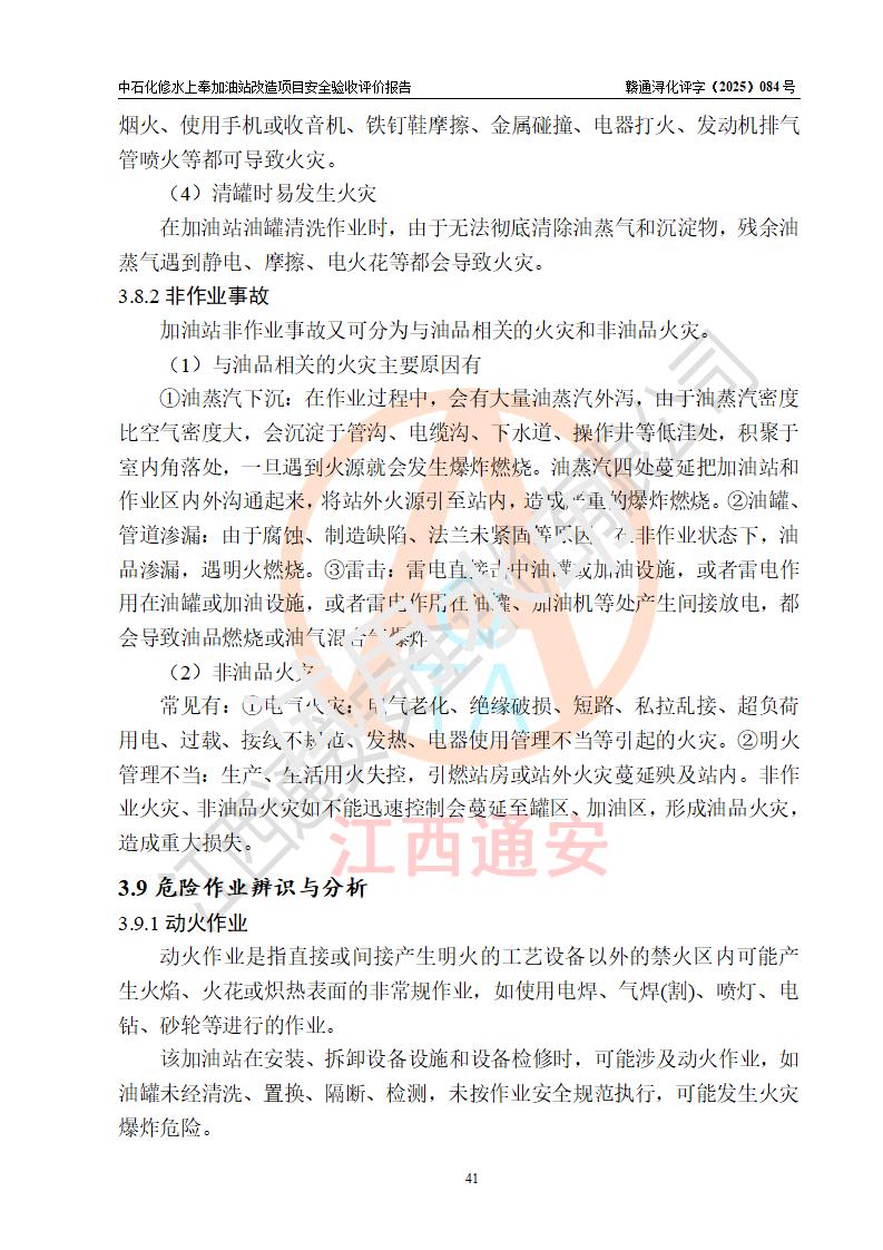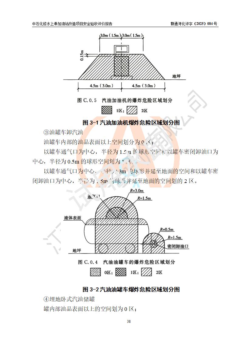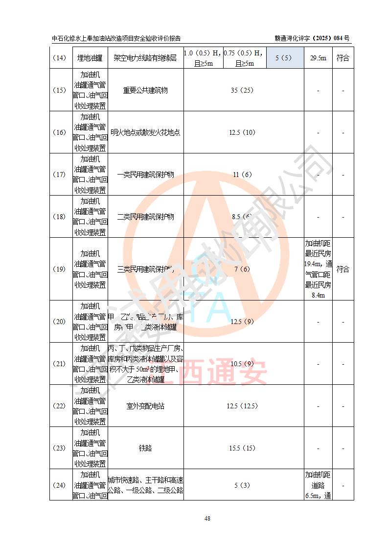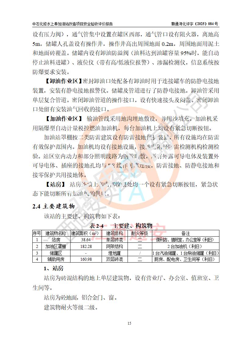 項目簡介 | 中國石化銷售股份有限公司江西九江修水石油分公司上奉加油站(以下簡稱“中石化修水上奉加油站”)是一家專門從事成品油零售經(jīng)營的有限公司分公司(外商投資企業(yè)分公司),經(jīng)營場所位于修水縣上奉鎮(zhèn)觀前村。現(xiàn)有從業(yè)人員3名,其中安全管理人員1人,加油站負(fù)責(zé)人陳小勇。 該站由九江市行政審批局換發(fā)《危險化學(xué)品經(jīng)營許可證》(編號:贛九行審經(jīng)(甲)字[2022]000144),**期限2022年08月26日至2025年08月25日(加油站現(xiàn)已停業(yè));于2023年05月10日取得九江市商務(wù)局頒發(fā)的《成品油零售經(jīng)營批準(zhǔn)證書》(油零售證書第潯0407號)**期至2028年05月09日。 中石化修水上奉加油站占地面積約920m2,站內(nèi)設(shè)置有1臺雙槍和1臺單槍程控燃油加油機及配套的工藝管線,設(shè)有SF雙層儲罐2臺,其中30m3的0#柴油儲罐1臺、30m3的92#汽油儲罐1臺,油品儲罐總?cè)莘e為60m3(折算成汽油為45m3),按現(xiàn)行《汽車加油加氣加氫站技術(shù)標(biāo)準(zhǔn)》對加油站的等級劃分原則,屬三級加油站。 因原有汽油罐距離站外北側(cè)二層民房(三類保護物)安全間距不滿足規(guī)范要求,故將原有罐區(qū)進(jìn)行拆除后原址重建(向南側(cè)移平移2.5米左右),以**與站外二層民房(三類保護物)的安全間距。 改造內(nèi)容為:1、拆除原有油罐區(qū)及配套管線,罐區(qū)拆除后南移重建非承重罐區(qū),利舊2臺30m3SF雙層罐(1柴1汽),并將柴油罐設(shè)置在靠近站外民房側(cè);2、自吸泵、液位儀、量油器、阻火器、機械呼吸閥檢測合格后均利舊,新建非成品操作井;3、新建配套土建設(shè)施、工藝及電氣線路、消防設(shè)施等;4、罐區(qū)開挖需對站房和圍墻進(jìn)行支護。 | |||