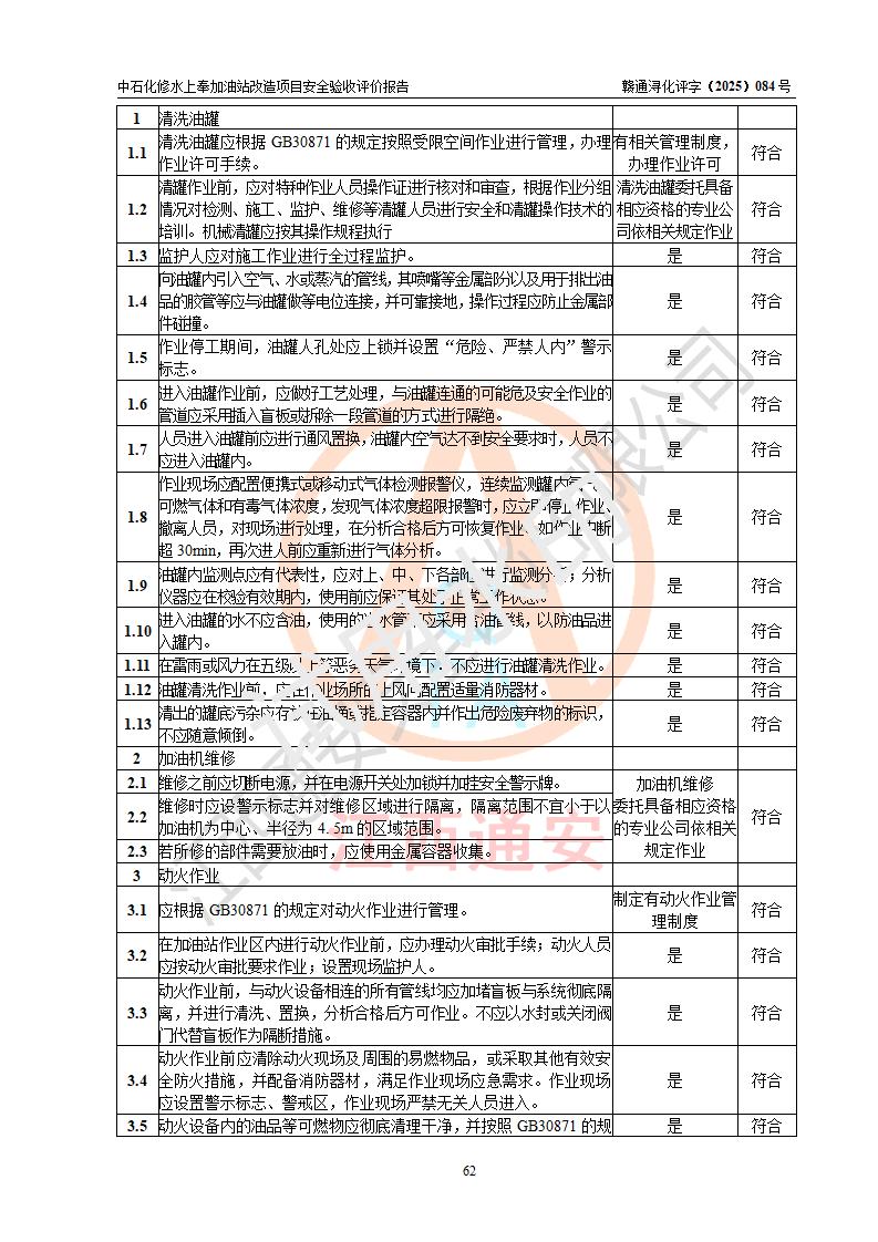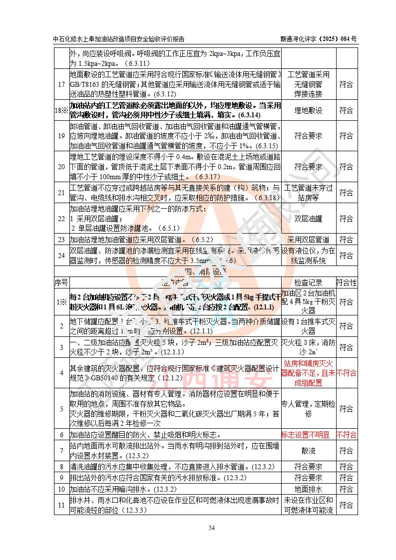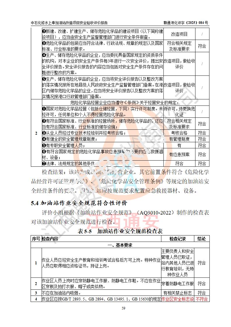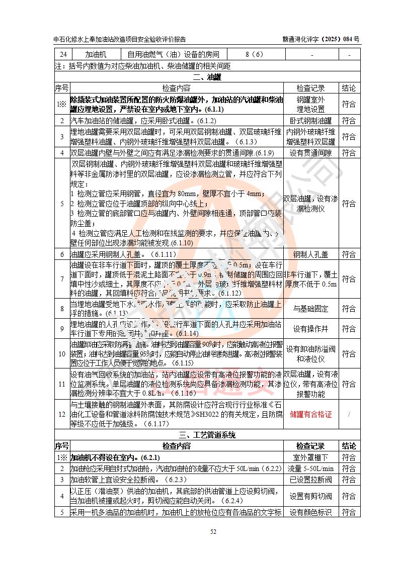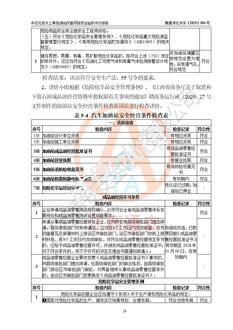評價結(jié)論 | 中國石化銷售股份有限公司江西九江修水石油分公司上奉加油站改造項目涉及的安全條件、安全生產(chǎn)條件、安全生產(chǎn)管理符合《危險化學(xué)品經(jīng)營許可證管理辦法》、《汽車加油加氣加氫站技術(shù)標(biāo)準(zhǔn)》等**有關(guān)法規(guī)、標(biāo)準(zhǔn)、規(guī)范要求,能滿足成品油零售經(jīng)營單位的安全條件,具備項目竣工驗收的條件。 | |||