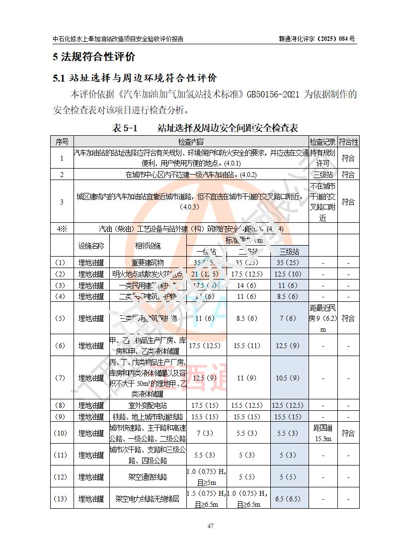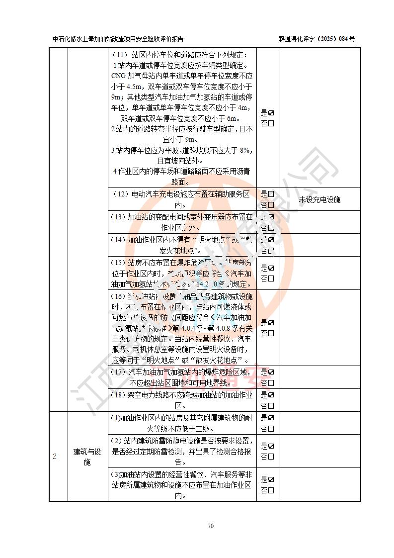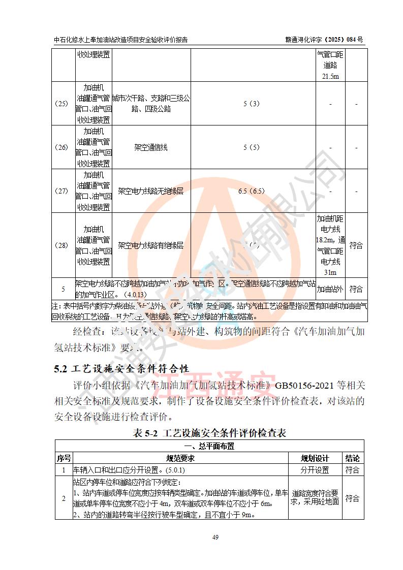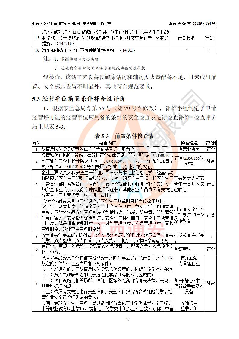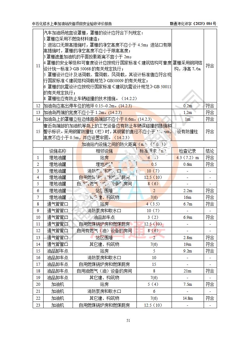 評價結(jié)論 | 中國石化銷售股份有限公司江西九江修水石油分公司上奉加油站改造項目涉及的安全條件、安全生產(chǎn)條件、安全生產(chǎn)管理符合《危險化學(xué)品經(jīng)營許可證管理辦法》、《汽車加油加氣加氫站技術(shù)標(biāo)準(zhǔn)》等**有關(guān)法規(guī)、標(biāo)準(zhǔn)、規(guī)范要求,能滿足成品油零售經(jīng)營單位的安全條件,具備項目竣工驗收的條件。 | |||