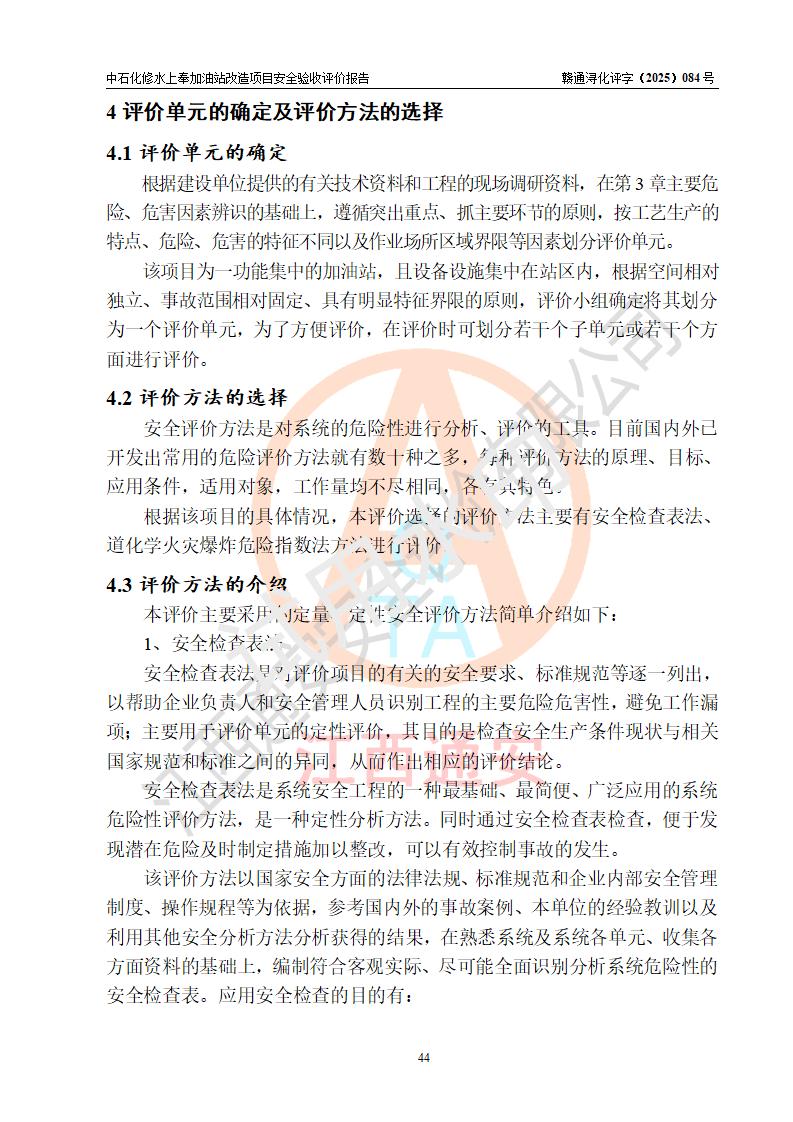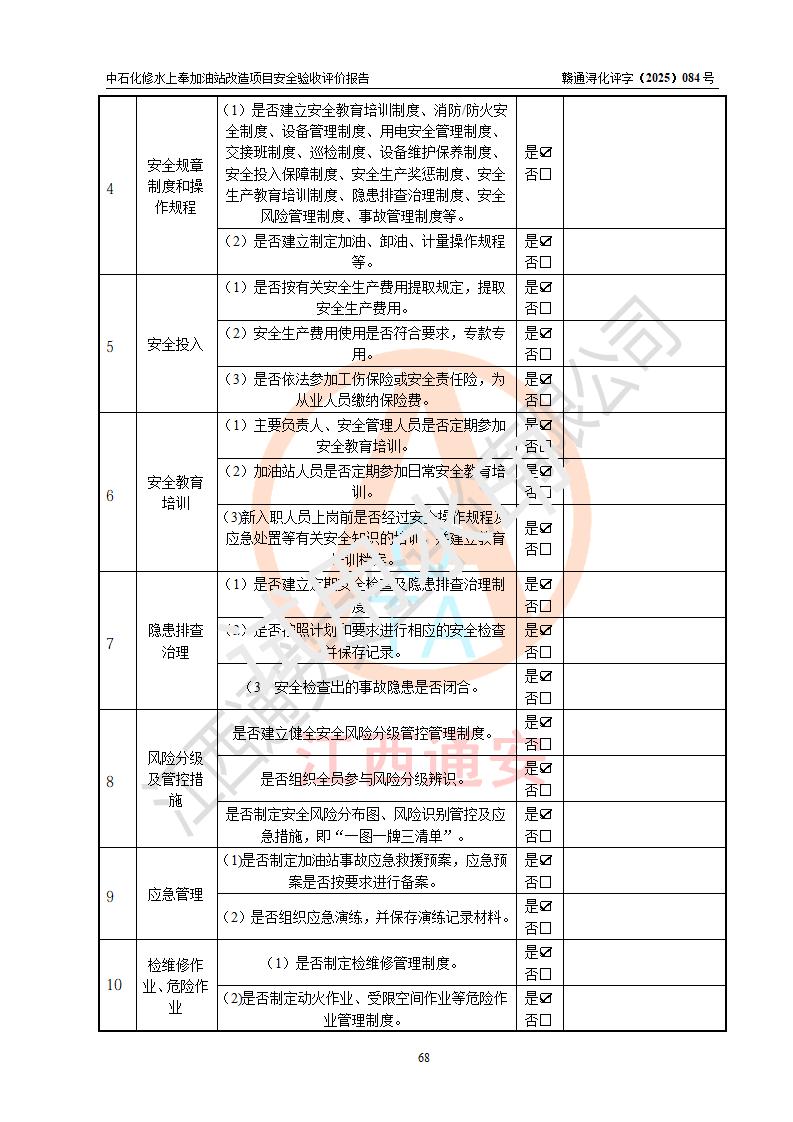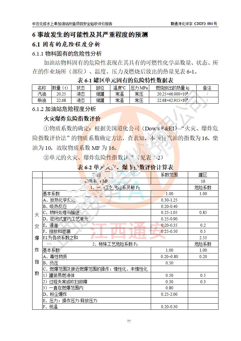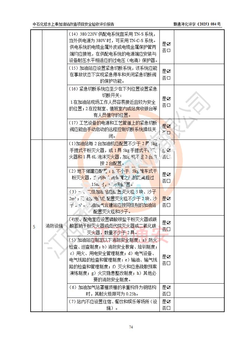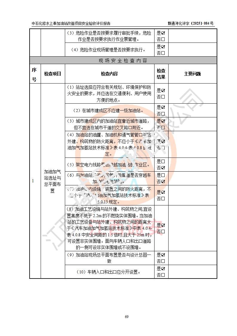 評價結(jié)論 | 中國石化銷售股份有限公司江西九江修水石油分公司上奉加油站改造項目涉及的安全條件、安全生產(chǎn)條件、安全生產(chǎn)管理符合《危險化學(xué)品經(jīng)營許可證管理辦法》、《汽車加油加氣加氫站技術(shù)標(biāo)準(zhǔn)》等**有關(guān)法規(guī)、標(biāo)準(zhǔn)、規(guī)范要求,能滿足成品油零售經(jīng)營單位的安全條件,具備項目竣工驗收的條件。 | |||