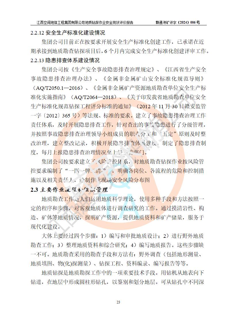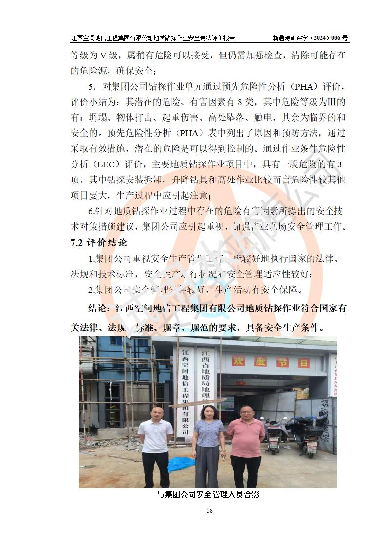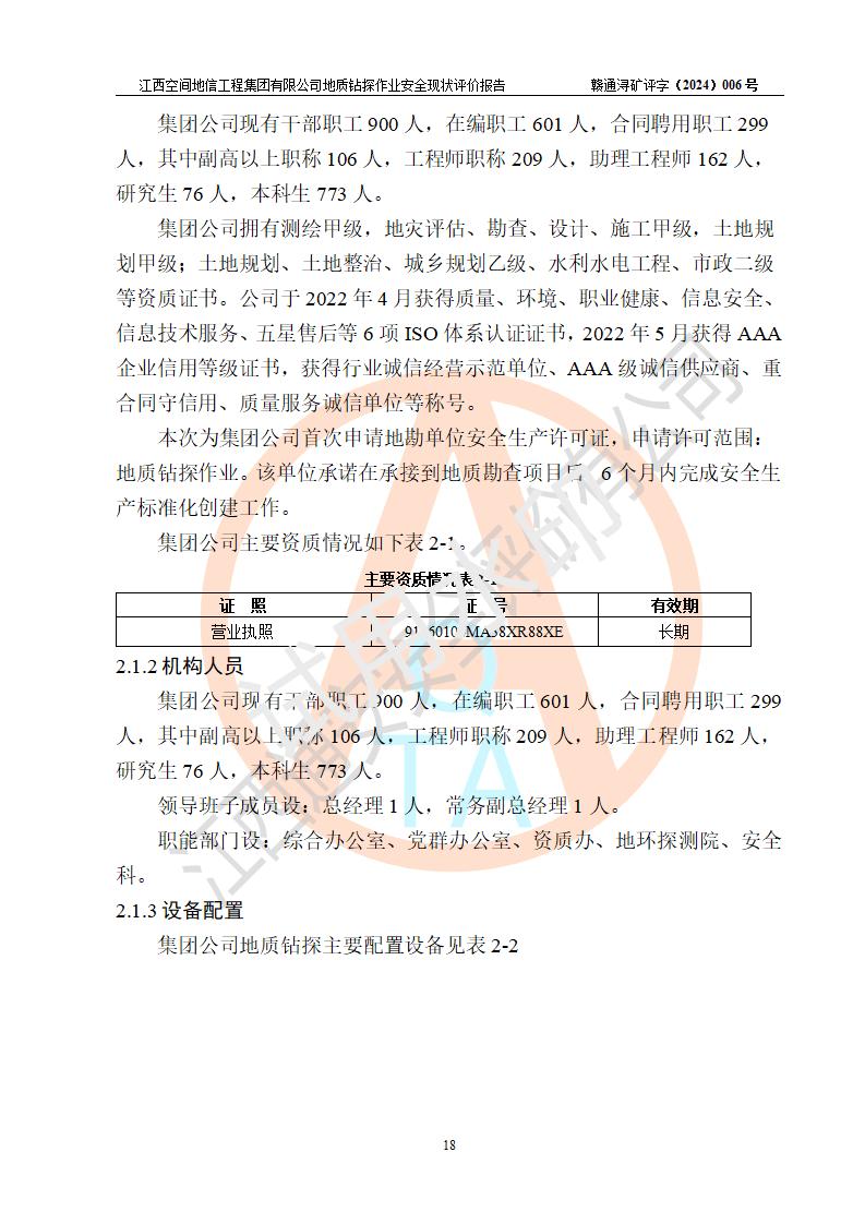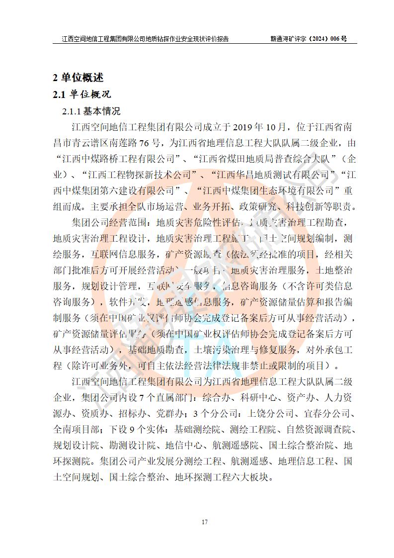 江西空間地信工程集團(tuán)有限公司成立于2019年10月,位于江西省南昌市青云譜區(qū)南蓮路76號(hào),為江西省地理信息工程大隊(duì)隊(duì)屬二級(jí)企業(yè),由“江西中煤路橋工程有限公司”、“江西省煤田地質(zhì)局普查綜合大隊(duì)”(企業(yè))、“江西工程物探新技術(shù)公司”、“江西華昌地質(zhì)測試有限公司”“江西中煤集團(tuán)第六建設(shè)有限公司”、“江西中煤集團(tuán)生態(tài)環(huán)境有限公司”重組而成。主要承擔(dān)全隊(duì)市場運(yùn)營、業(yè)務(wù)開拓、政策研究、科技創(chuàng)新等職責(zé)。 集團(tuán)公司經(jīng)營范圍:地質(zhì)災(zāi)害危險(xiǎn)性評(píng)估,地質(zhì)災(zāi)害治理工程勘查,地質(zhì)災(zāi)害治理工程設(shè)計(jì),地質(zhì)災(zāi)害治理工程施工,國土空間規(guī)劃編制,測繪服務(wù),互聯(lián)網(wǎng)信息服務(wù),礦產(chǎn)資源勘查(依法須經(jīng)批準(zhǔn)的項(xiàng)目,經(jīng)相關(guān)部門批準(zhǔn)后方可開展經(jīng)營活動(dòng))一般項(xiàng)目:地質(zhì)災(zāi)害治理服務(wù),土地整治服務(wù),規(guī)劃設(shè)計(jì)管理,互聯(lián)網(wǎng)安全服務(wù),信息咨詢服務(wù)(不含許可類信息咨詢服務(wù)),軟件開發(fā),地理遙感信息服務(wù),礦產(chǎn)資源儲(chǔ)量估算和報(bào)告編制服務(wù)(須在中國礦業(yè)權(quán)評(píng)估師**完成登記備案后方可從事經(jīng)營活動(dòng)),礦產(chǎn)資源儲(chǔ)量評(píng)估服務(wù)(須在中國礦業(yè)權(quán)評(píng)估師**完成登記備案后方可從事經(jīng)營活動(dòng)),基礎(chǔ)地質(zhì)勘查,土壤污染治理與修復(fù)服務(wù),對(duì)外承包工程(除許可業(yè)務(wù)外,可自主依法經(jīng)營法律法規(guī)非禁止或限制的項(xiàng)目)。 江西空間地信工程集團(tuán)有限公司為江西省地理信息工程大隊(duì)隊(duì)屬二級(jí)企業(yè),集團(tuán)公司內(nèi)設(shè)7個(gè)直屬部門:綜合辦、科研中心、資產(chǎn)辦、人力資源辦、資質(zhì)辦、招標(biāo)辦、黨群辦;3個(gè)分公司:上饒分公司、宜春分公司、全南項(xiàng)目部;下設(shè)9個(gè)實(shí)體:基礎(chǔ)測繪院、測繪工程院、自然資源調(diào)查院、規(guī)劃設(shè)計(jì)院、勘測設(shè)計(jì)院、地信中心、航測遙感院、國土綜合整治院、地環(huán)探測院。集團(tuán)公司產(chǎn)業(yè)發(fā)展分測繪工程、航測遙感、地理信息工程、國土空間規(guī)劃、國土綜合整治、地環(huán)探測工程六大板塊。 集團(tuán)公司現(xiàn)有干部職工900人,在編職工601人,合同聘用職工299人,其中副高以上職稱106人,工程師職稱209人,助理工程師162人,研究生76人,本科生773人。 集團(tuán)公司擁有測繪**,地災(zāi)評(píng)估、勘查、設(shè)計(jì)、施工**,土地規(guī)劃**;土地規(guī)劃、土地整治、城鄉(xiāng)規(guī)劃乙級(jí)、水利水電工程、市政二級(jí)等資質(zhì)證書。公司于2022年4月獲得質(zhì)量、環(huán)境、職業(yè)健康、信息安全、信息技術(shù)服務(wù)、五星售后等6項(xiàng)ISO體系認(rèn)證證書,2022年5月獲得AAA企業(yè)信用等級(jí)證書,獲得行業(yè)誠信經(jīng)營示范單位、AAA級(jí)誠信供應(yīng)商、重合同守信用、質(zhì)量服務(wù)誠信單位等稱號(hào)。 集團(tuán)公司為地勘單位安全生產(chǎn)許可證新設(shè)許可,申請(qǐng)?jiān)S可范圍:地質(zhì)鉆探作業(yè)。按照《安全生產(chǎn)法》、《礦山安全法》和《江西省非煤礦礦山企業(yè)安全生產(chǎn)許可證實(shí)施辦法》等有關(guān)規(guī)定,該單位在申請(qǐng)安全生產(chǎn)許可證前應(yīng)進(jìn)行安全現(xiàn)狀評(píng)價(jià)。 |