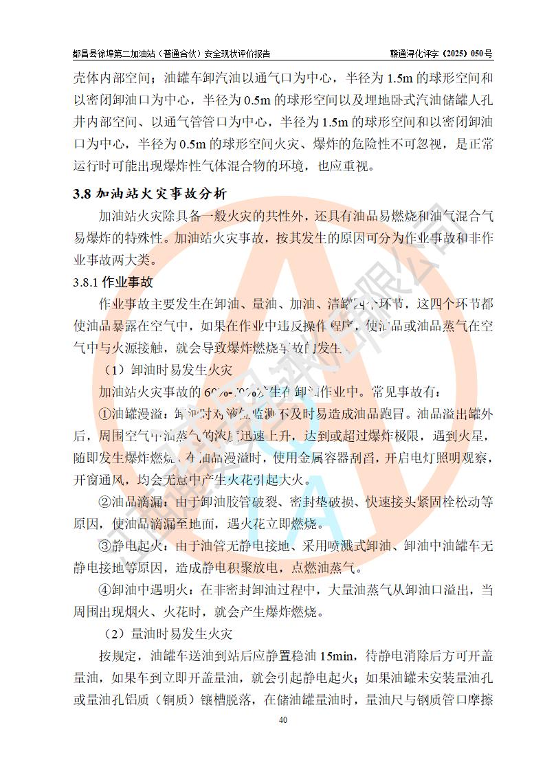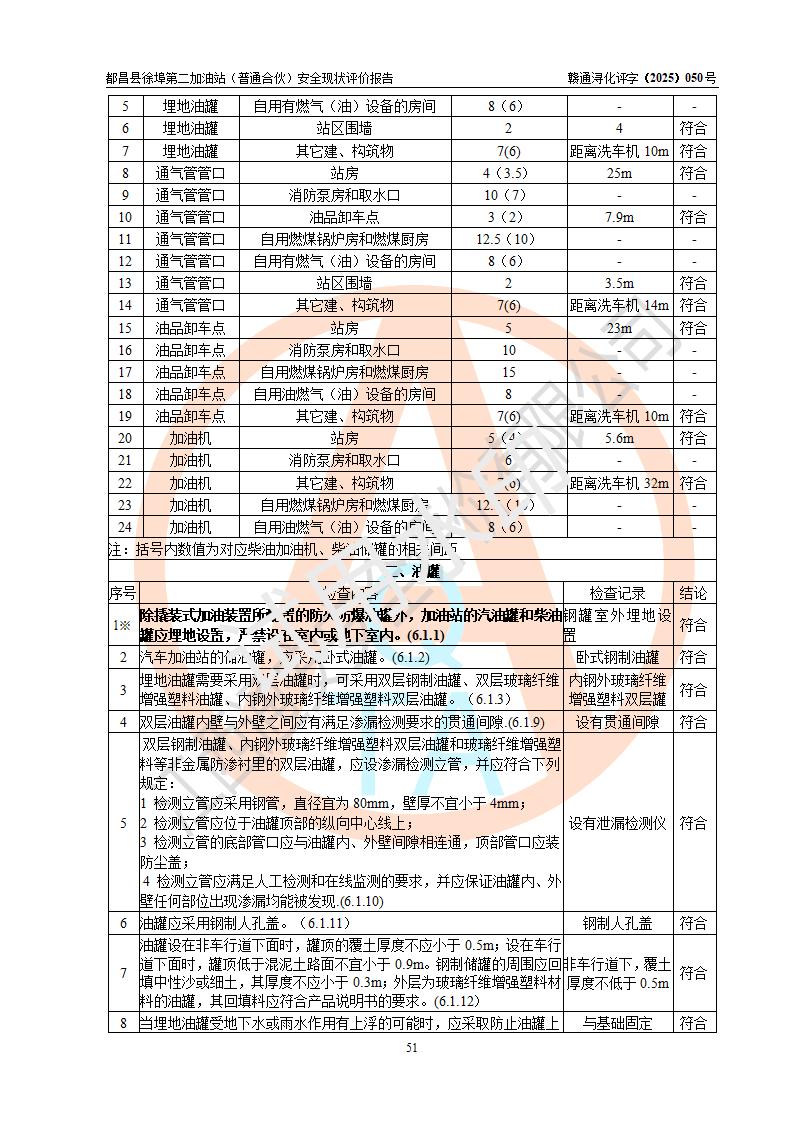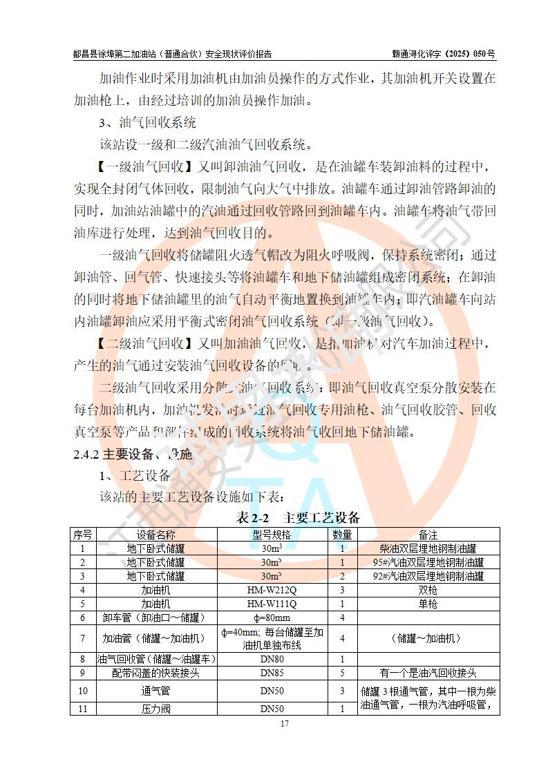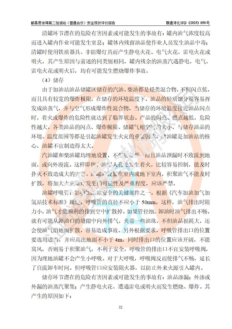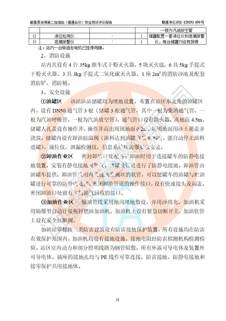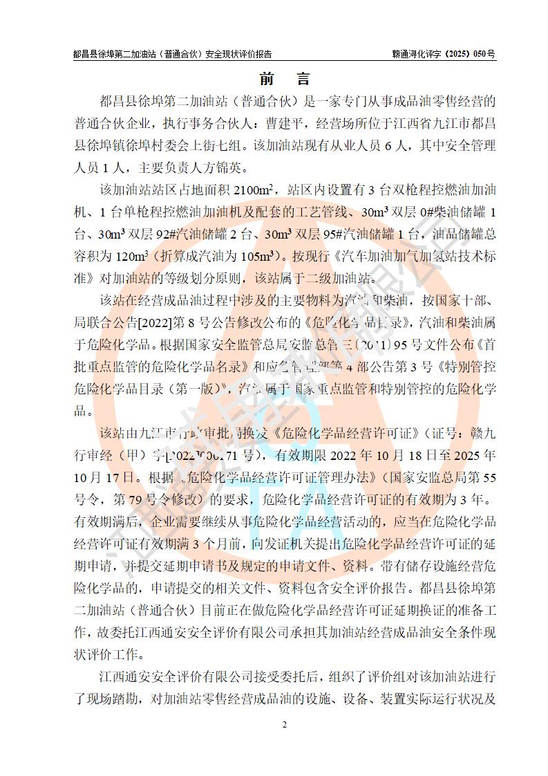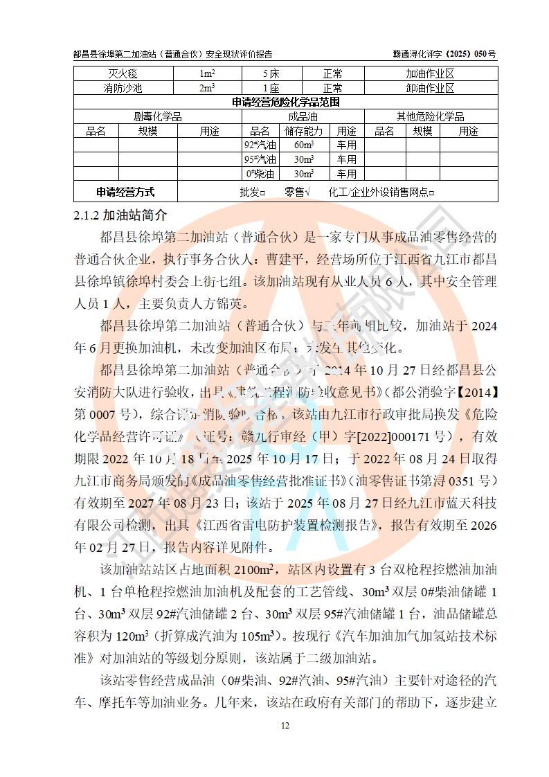 都昌縣徐埠第二加油站(普通合伙)是一家專門從事成品油零售經(jīng)營(yíng)的普通合伙企業(yè),執(zhí)行事務(wù)合伙人:曹建平,經(jīng)營(yíng)場(chǎng)所位于江西省九江市都昌縣徐埠鎮(zhèn)徐埠村委會(huì)上街七組。該加油站現(xiàn)有從業(yè)人員6人,其中安全管理人員1人,主要負(fù)責(zé)人方錦英。 該加油站站區(qū)占地面積2100m2,站區(qū)內(nèi)設(shè)置有3臺(tái)雙槍程控燃油加油機(jī)、1臺(tái)單槍程控燃油加油機(jī)及配套的工藝管線、30m3雙層0#柴油儲(chǔ)罐1臺(tái)、30m3雙層92#汽油儲(chǔ)罐2臺(tái)、30m3雙層95#汽油儲(chǔ)罐1臺(tái),油品儲(chǔ)罐總?cè)莘e為120m3(折算成汽油為105m3)。按現(xiàn)行《汽車加油加氣加氫站技術(shù)標(biāo)準(zhǔn)》對(duì)加油站的等級(jí)劃分原則,該站屬于二級(jí)加油站。 該站由九江市行政審批局換發(fā)《危險(xiǎn)化學(xué)品經(jīng)營(yíng)許可證》(證號(hào):贛九行審經(jīng)(甲)字[2022]000171號(hào)),**期限2022年10月18日至2025年10月17日。 |