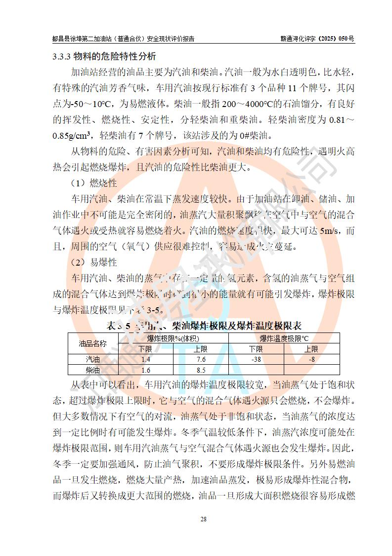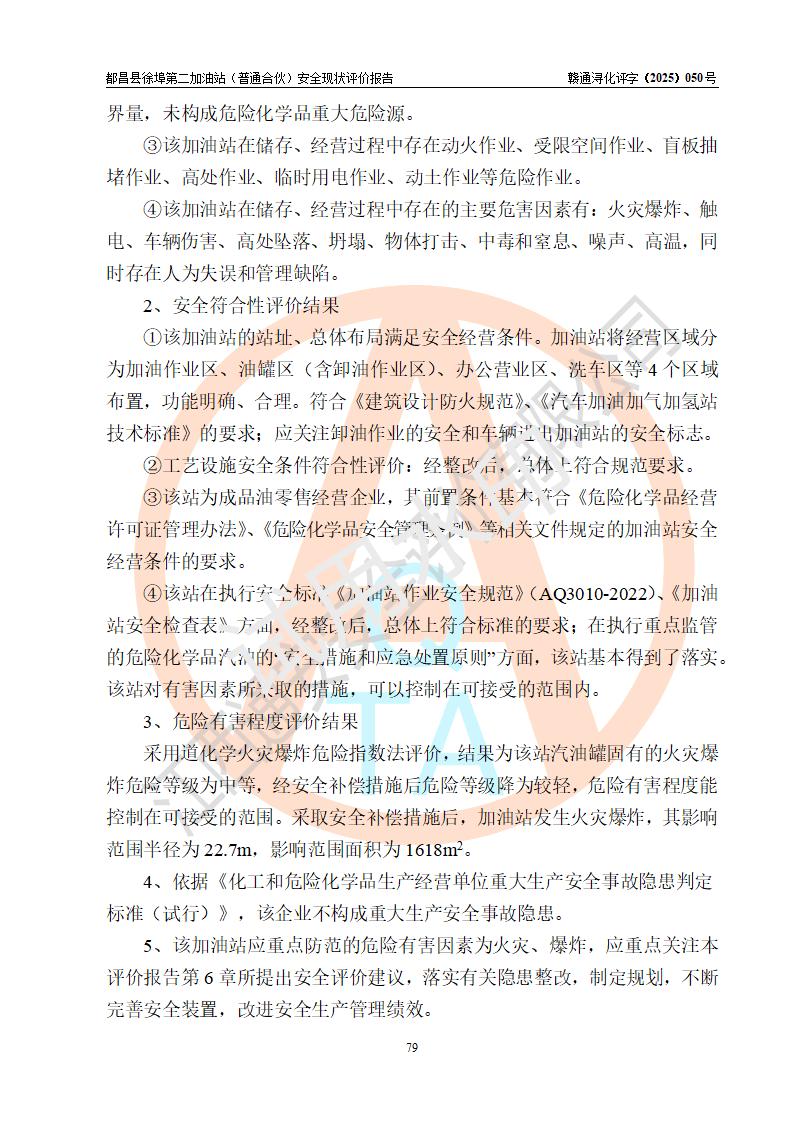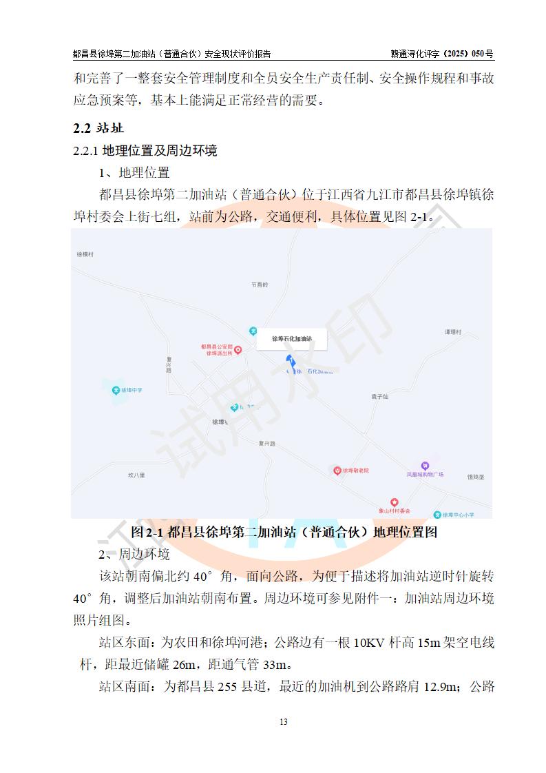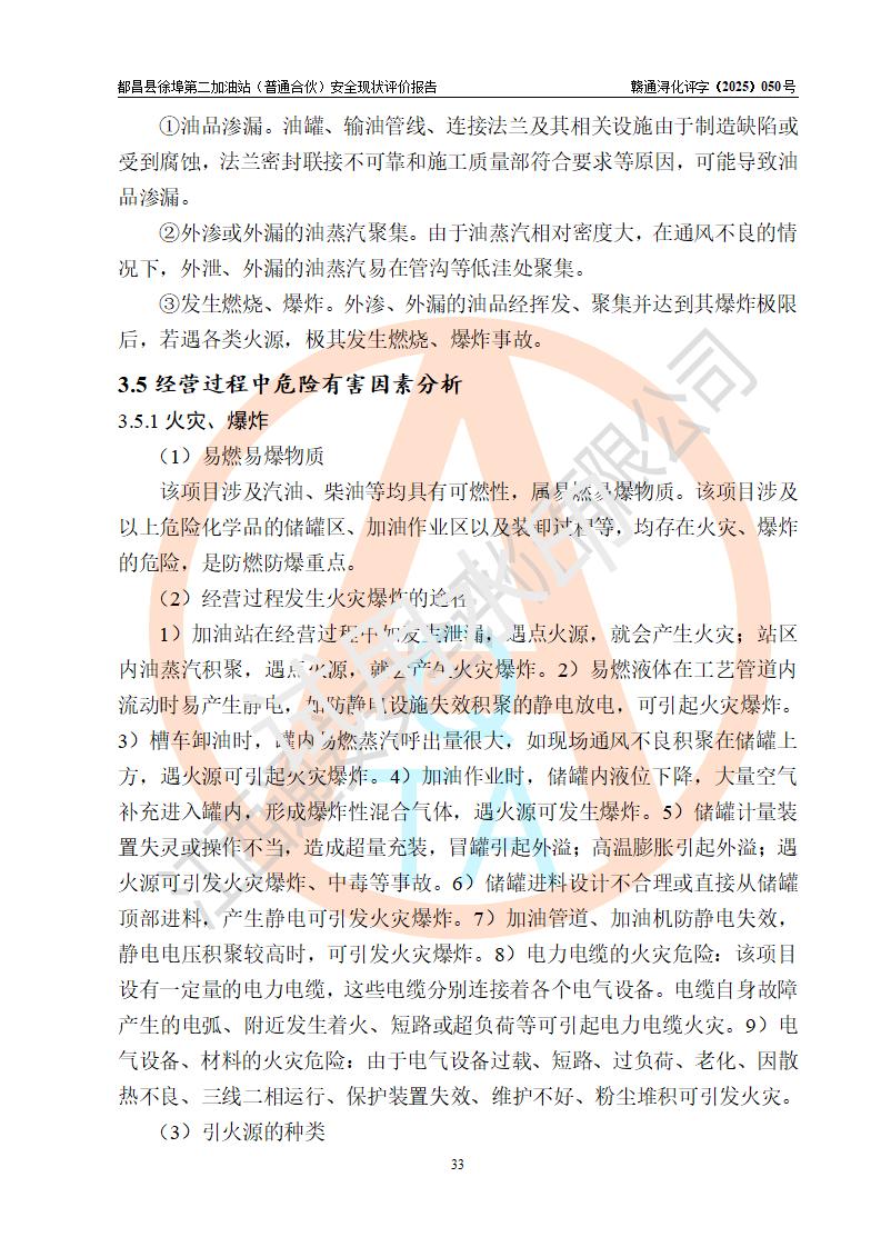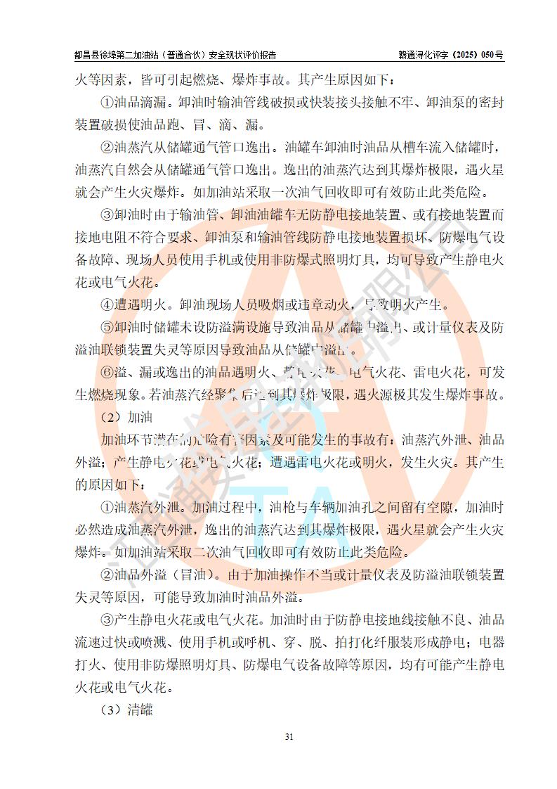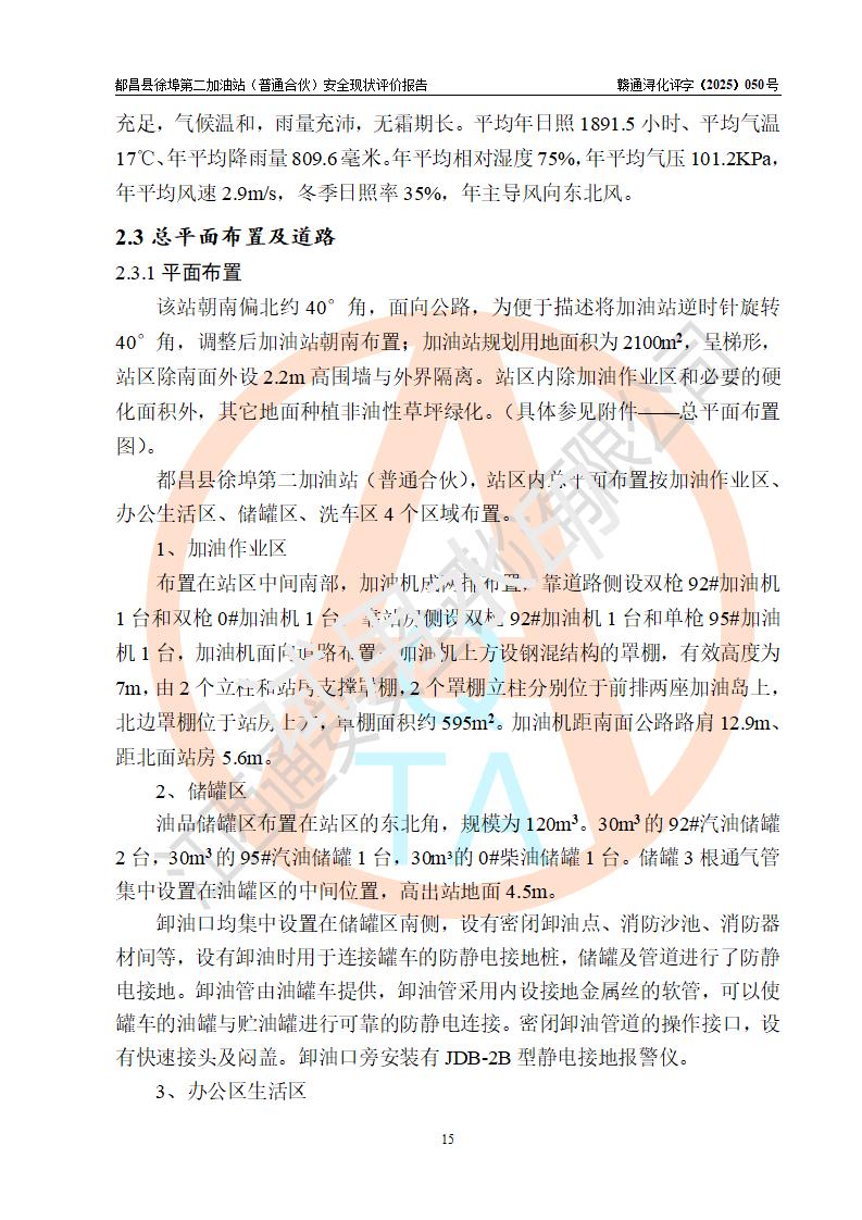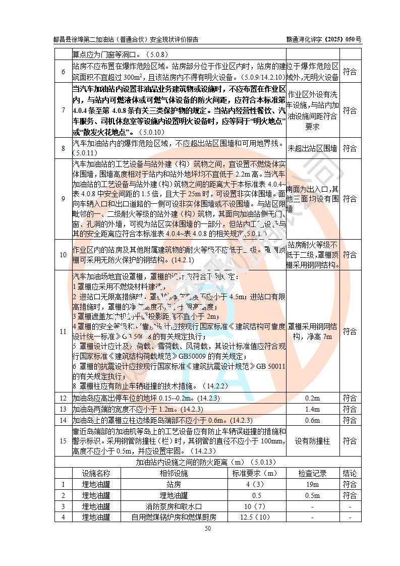 都昌縣徐埠第二加油站(普通合伙)是一家專門從事成品油零售經(jīng)營(yíng)的普通合伙企業(yè),執(zhí)行事務(wù)合伙人:曹建平,經(jīng)營(yíng)場(chǎng)所位于江西省九江市都昌縣徐埠鎮(zhèn)徐埠村委會(huì)上街七組。該加油站現(xiàn)有從業(yè)人員6人,其中安全管理人員1人,主要負(fù)責(zé)人方錦英。 該加油站站區(qū)占地面積2100m2,站區(qū)內(nèi)設(shè)置有3臺(tái)雙槍程控燃油加油機(jī)、1臺(tái)單槍程控燃油加油機(jī)及配套的工藝管線、30m3雙層0#柴油儲(chǔ)罐1臺(tái)、30m3雙層92#汽油儲(chǔ)罐2臺(tái)、30m3雙層95#汽油儲(chǔ)罐1臺(tái),油品儲(chǔ)罐總?cè)莘e為120m3(折算成汽油為105m3)。按現(xiàn)行《汽車加油加氣加氫站技術(shù)標(biāo)準(zhǔn)》對(duì)加油站的等級(jí)劃分原則,該站屬于二級(jí)加油站。 該站由九江市行政審批局換發(fā)《危險(xiǎn)化學(xué)品經(jīng)營(yíng)許可證》(證號(hào):贛九行審經(jīng)(甲)字[2022]000171號(hào)),**期限2022年10月18日至2025年10月17日。 |