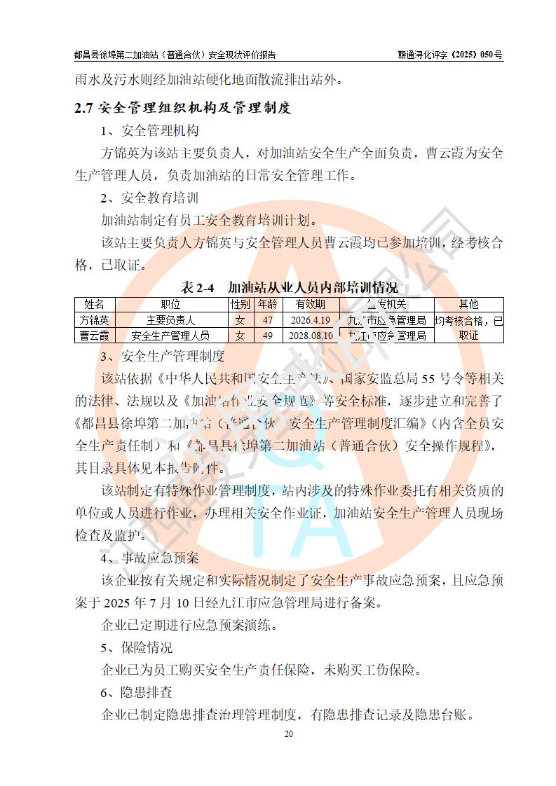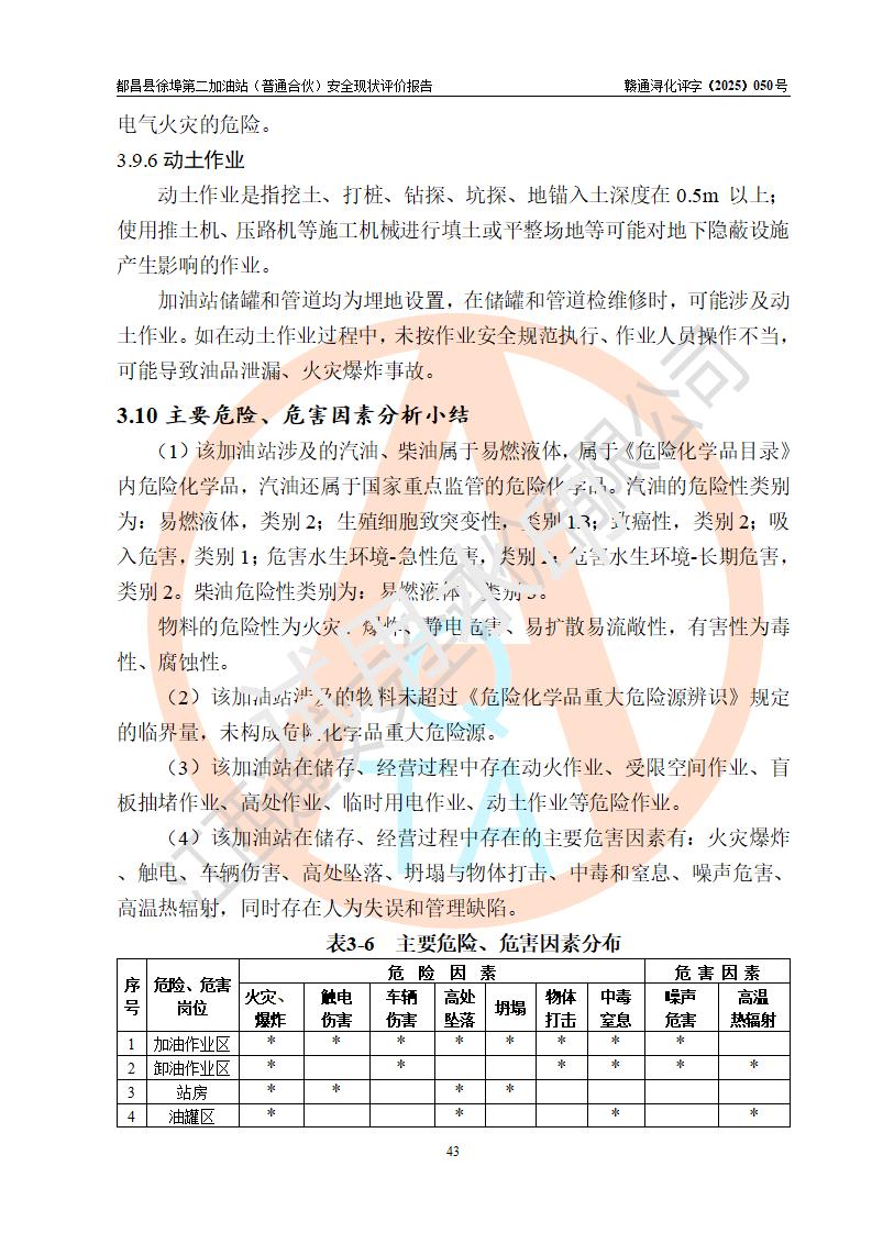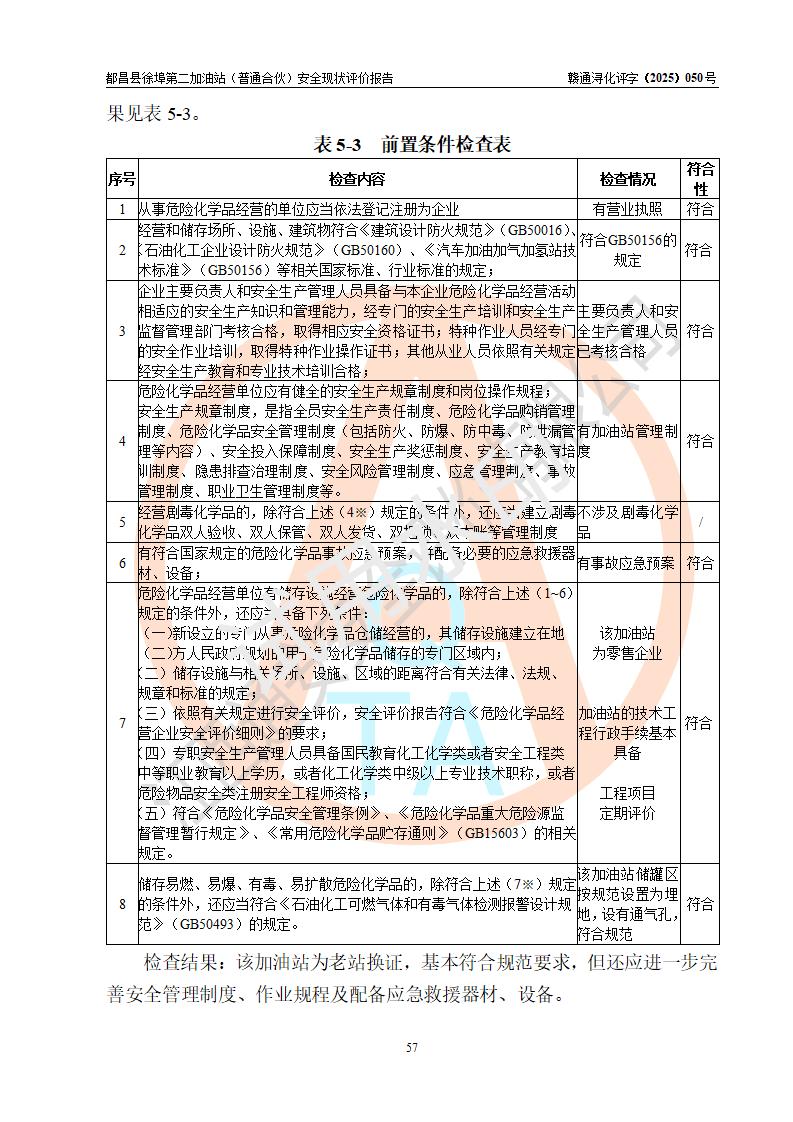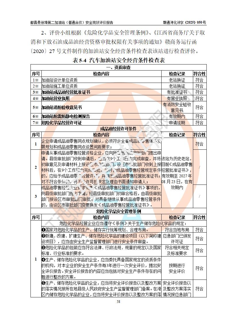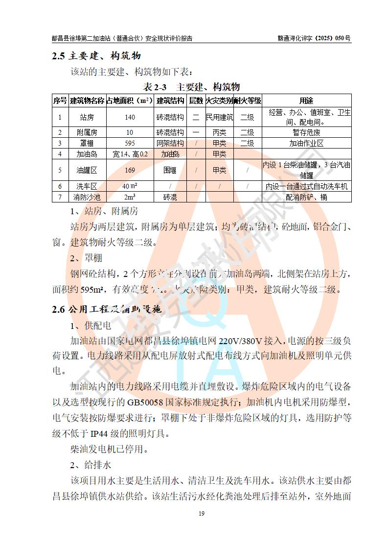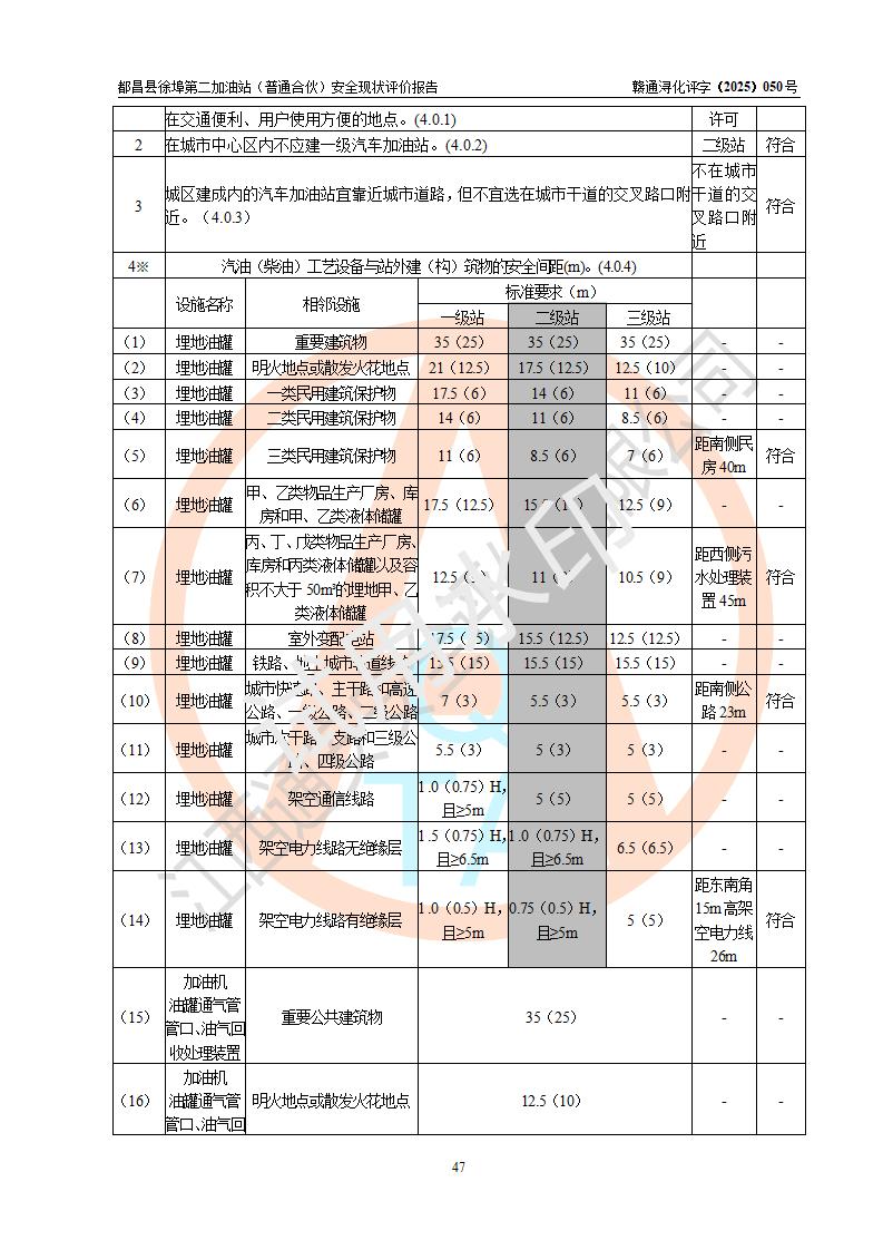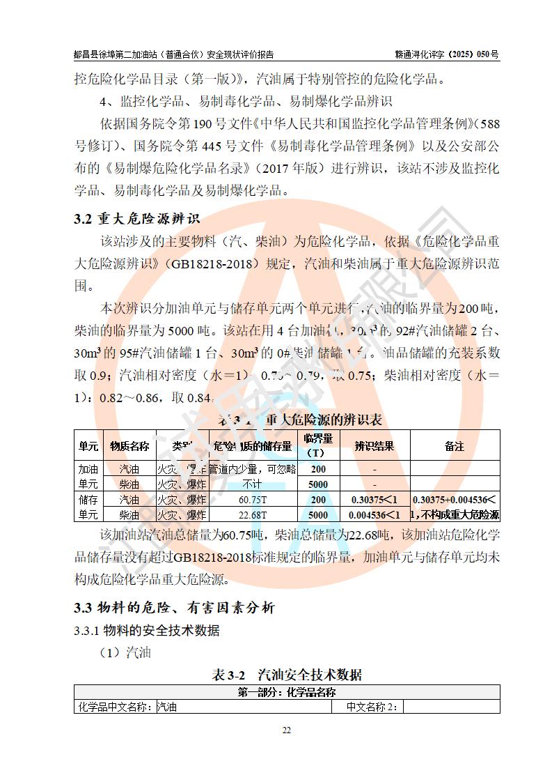 都昌縣徐埠第二加油站(普通合伙)是一家專門從事成品油零售經(jīng)營(yíng)的普通合伙企業(yè),執(zhí)行事務(wù)合伙人:曹建平,經(jīng)營(yíng)場(chǎng)所位于江西省九江市都昌縣徐埠鎮(zhèn)徐埠村委會(huì)上街七組。該加油站現(xiàn)有從業(yè)人員6人,其中安全管理人員1人,主要負(fù)責(zé)人方錦英。 該加油站站區(qū)占地面積2100m2,站區(qū)內(nèi)設(shè)置有3臺(tái)雙槍程控燃油加油機(jī)、1臺(tái)單槍程控燃油加油機(jī)及配套的工藝管線、30m3雙層0#柴油儲(chǔ)罐1臺(tái)、30m3雙層92#汽油儲(chǔ)罐2臺(tái)、30m3雙層95#汽油儲(chǔ)罐1臺(tái),油品儲(chǔ)罐總?cè)莘e為120m3(折算成汽油為105m3)。按現(xiàn)行《汽車加油加氣加氫站技術(shù)標(biāo)準(zhǔn)》對(duì)加油站的等級(jí)劃分原則,該站屬于二級(jí)加油站。 該站由九江市行政審批局換發(fā)《危險(xiǎn)化學(xué)品經(jīng)營(yíng)許可證》(證號(hào):贛九行審經(jīng)(甲)字[2022]000171號(hào)),**期限2022年10月18日至2025年10月17日。 |
