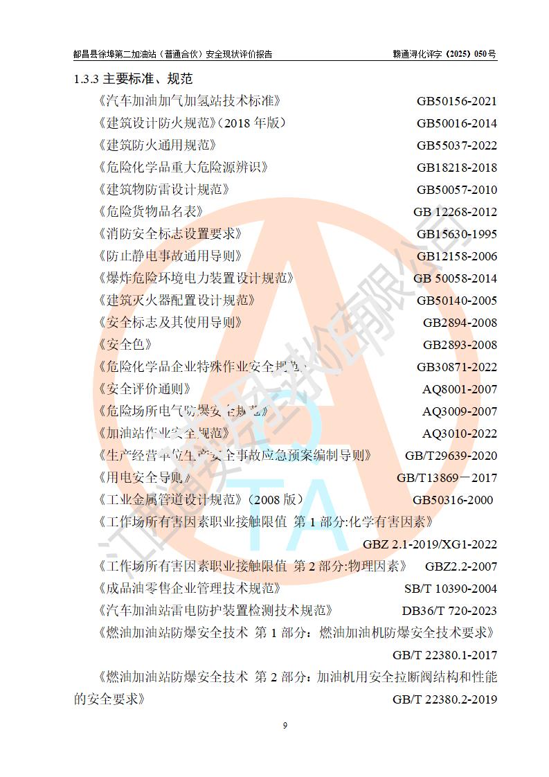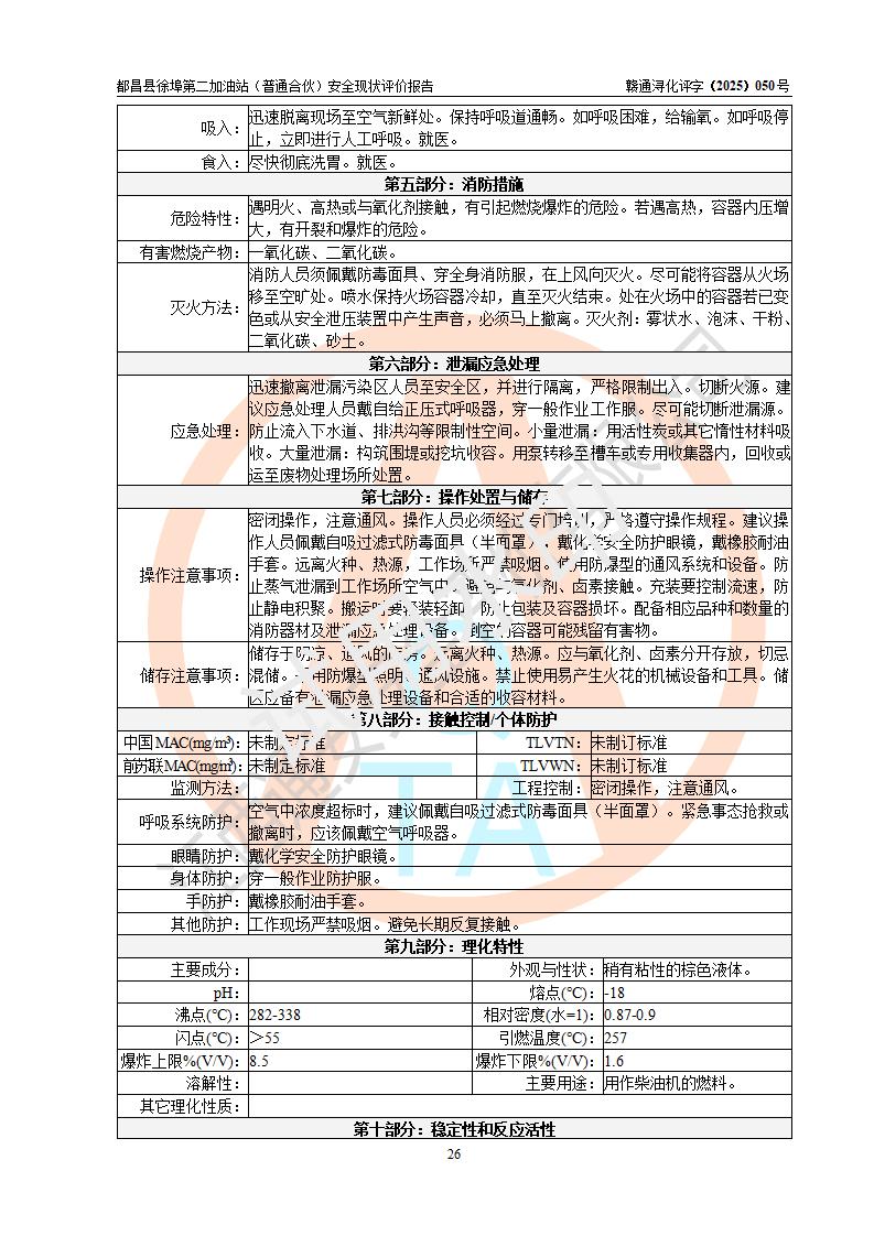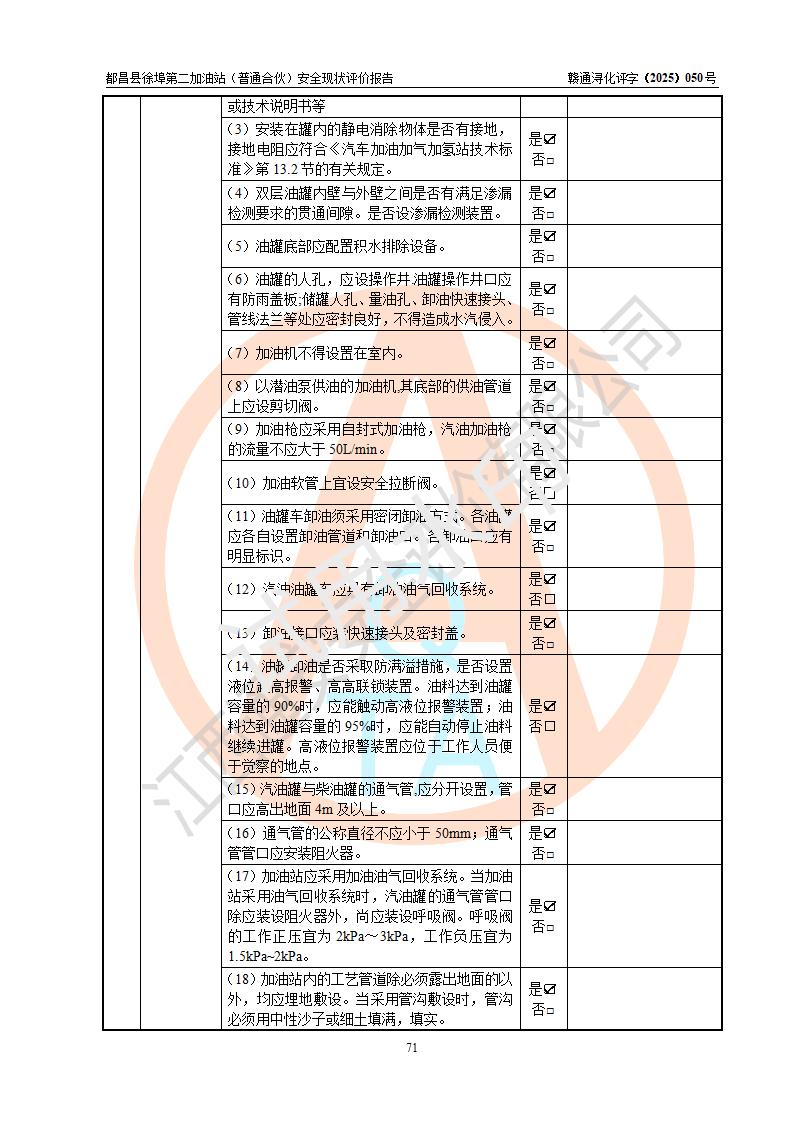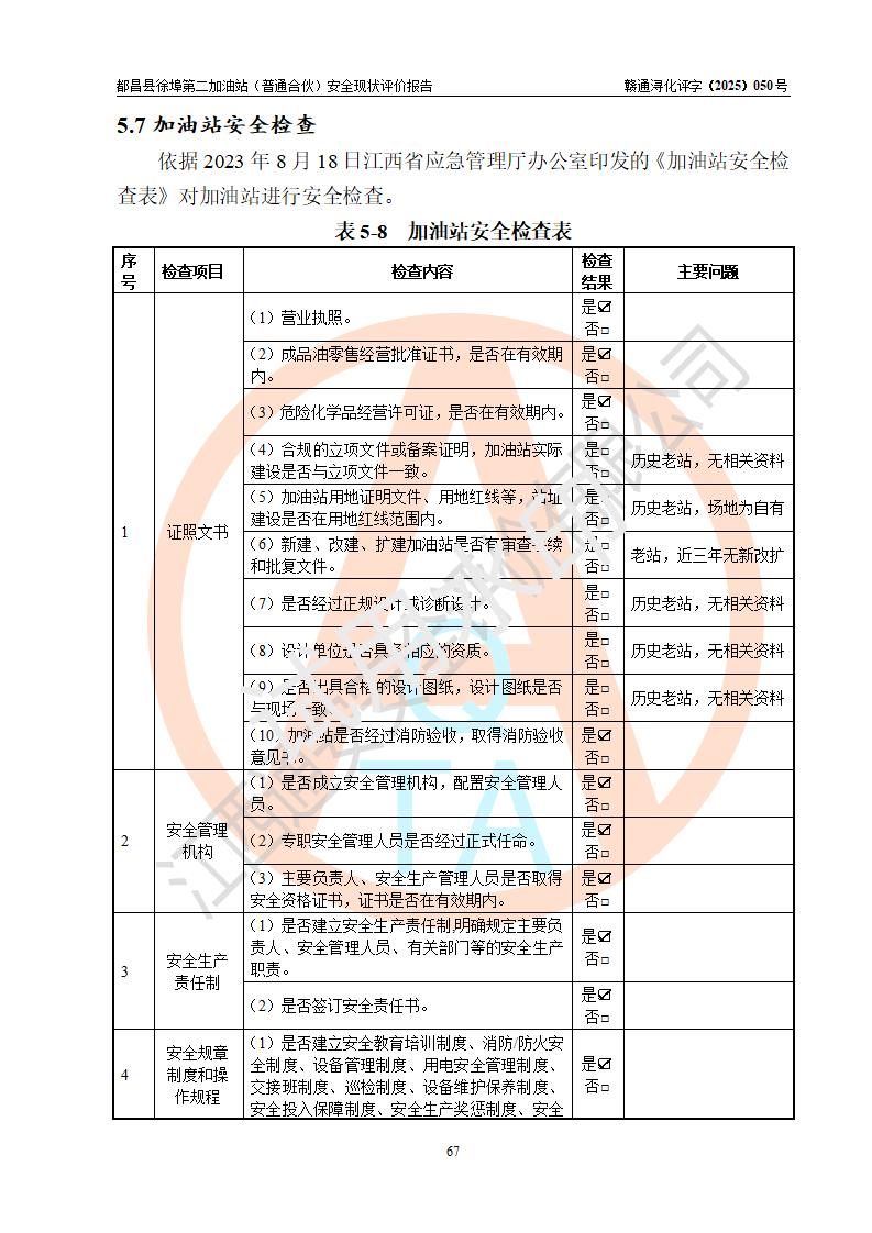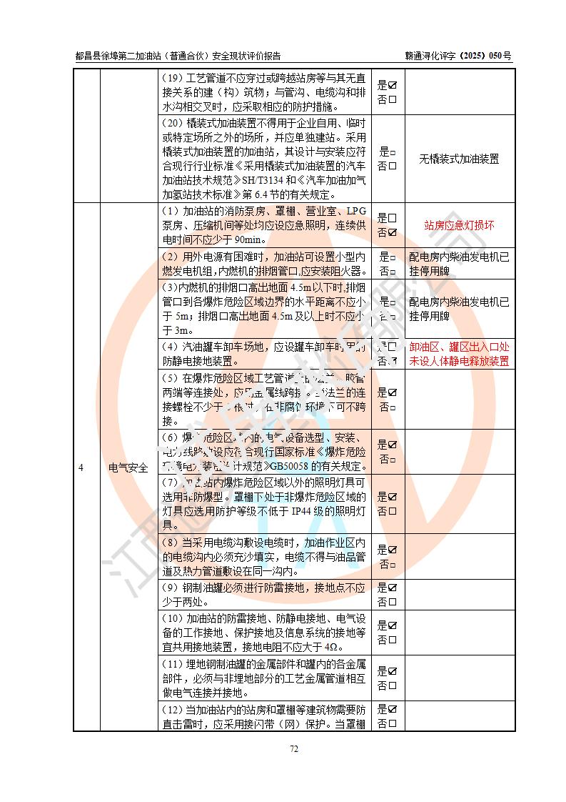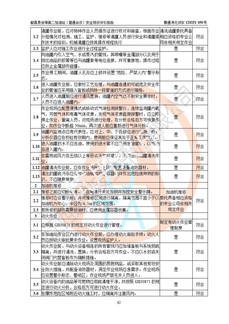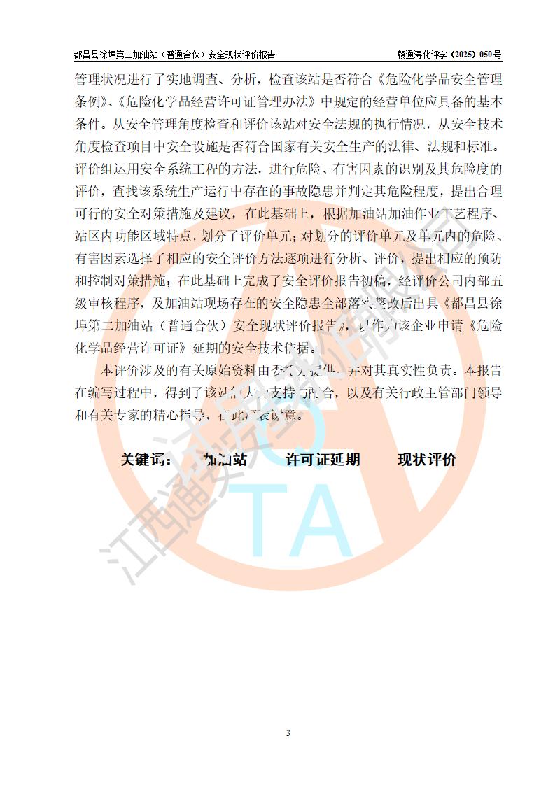 都昌縣徐埠第二加油站(普通合伙)是一家專門從事成品油零售經(jīng)營(yíng)的普通合伙企業(yè),執(zhí)行事務(wù)合伙人:曹建平,經(jīng)營(yíng)場(chǎng)所位于江西省九江市都昌縣徐埠鎮(zhèn)徐埠村委會(huì)上街七組。該加油站現(xiàn)有從業(yè)人員6人,其中安全管理人員1人,主要負(fù)責(zé)人方錦英。 該加油站站區(qū)占地面積2100m2,站區(qū)內(nèi)設(shè)置有3臺(tái)雙槍程控燃油加油機(jī)、1臺(tái)單槍程控燃油加油機(jī)及配套的工藝管線、30m3雙層0#柴油儲(chǔ)罐1臺(tái)、30m3雙層92#汽油儲(chǔ)罐2臺(tái)、30m3雙層95#汽油儲(chǔ)罐1臺(tái),油品儲(chǔ)罐總?cè)莘e為120m3(折算成汽油為105m3)。按現(xiàn)行《汽車加油加氣加氫站技術(shù)標(biāo)準(zhǔn)》對(duì)加油站的等級(jí)劃分原則,該站屬于二級(jí)加油站。 該站由九江市行政審批局換發(fā)《危險(xiǎn)化學(xué)品經(jīng)營(yíng)許可證》(證號(hào):贛九行審經(jīng)(甲)字[2022]000171號(hào)),**期限2022年10月18日至2025年10月17日。 |