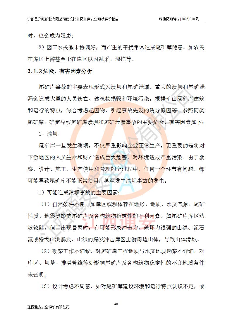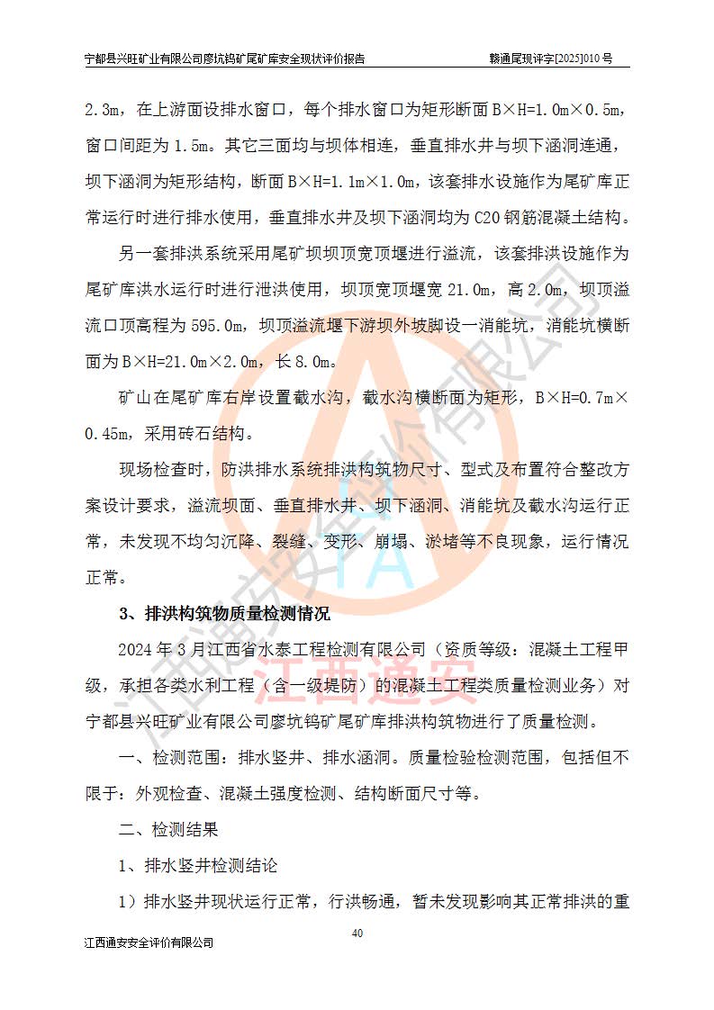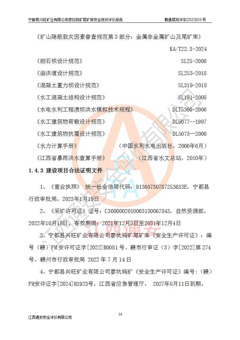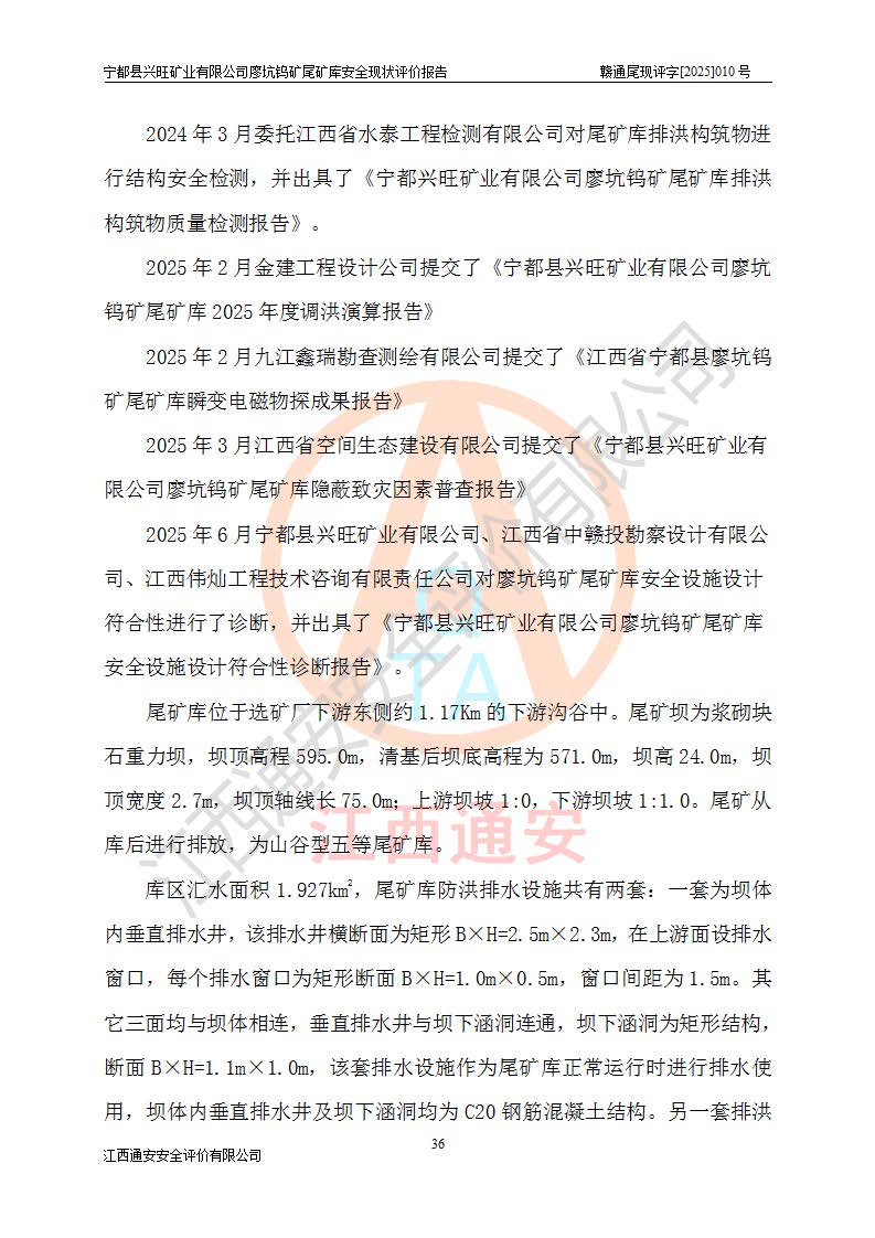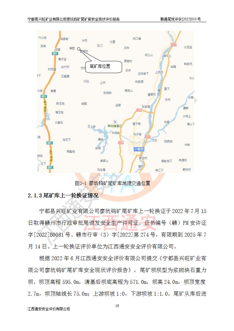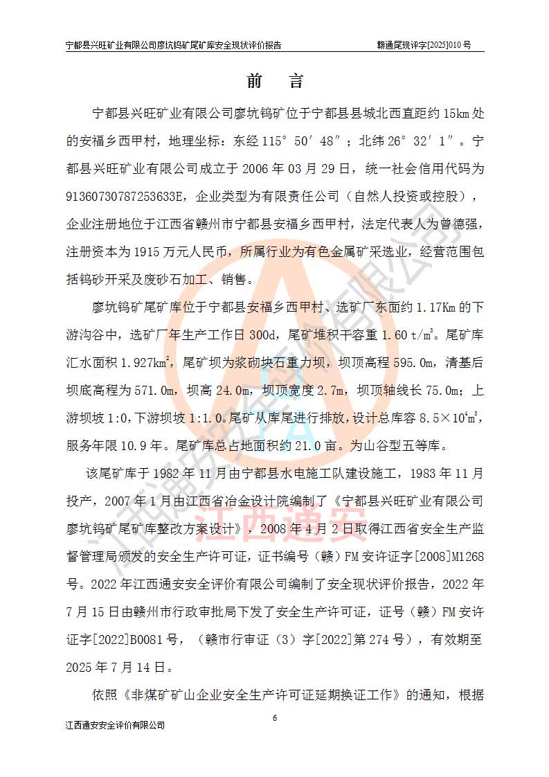 寧都縣興旺礦業(yè)有限公司廖坑鎢礦位于寧都縣縣城北西直距約15km處的安福鄉(xiāng)西甲村,地理坐標(biāo):東經(jīng)115°50′48″;北緯26°32′1″。寧都縣興旺礦業(yè)有限公司成立于2006年03月29日,統(tǒng)一社會(huì)信用代碼為91360730787253633E,企業(yè)類型為有限責(zé)任公司(自然人投資或控股),企業(yè)注冊(cè)地位于江西省贛州市寧都縣安福鄉(xiāng)西甲村,法定**人為曾德強(qiáng),注冊(cè)資本為1915萬元人民幣,所屬行業(yè)為有色金屬礦采選業(yè),經(jīng)營范圍包括鎢砂開采及廢砂石加工、銷售。 廖坑鎢礦尾礦庫位于寧都縣安福鄉(xiāng)西甲村、選礦廠東面約1.17Km的下游溝谷中,選礦廠年生產(chǎn)工作日300d,尾礦堆積干容重1.60 t/m3。尾礦庫匯水面積1.927km2,尾礦壩為漿砌塊石重力壩,壩頂高程595.0m,清基后壩底高程為571.0m,壩高24.0m,壩頂寬度2.7m,壩頂軸線長75.0m;上游壩坡1:0,下游壩坡1:1.0。尾礦從庫尾進(jìn)行排放,設(shè)計(jì)總庫容8.5×104m3,服務(wù)年限10.9年。尾礦庫總占地面積約21.0畝。為山谷型五等庫。 該尾礦庫于1982年11月由寧都縣水電施工隊(duì)建設(shè)施工,1983年11月投產(chǎn),2007年1月由江西省冶金設(shè)計(jì)院編制了《寧都縣興旺礦業(yè)有限公司廖坑鎢礦尾礦庫整改方案設(shè)計(jì)》,2008年4月2日取得江西省安全生產(chǎn)監(jiān)督管理局頒發(fā)的安全生產(chǎn)許可證,證書編號(hào)(贛)FM安許證字[2008]M1268號(hào)。2022年江西通安安全評(píng)價(jià)有限公司編制了安全現(xiàn)狀評(píng)價(jià)報(bào)告,2022年7月15日由贛州市行政審批局下發(fā)了安全生產(chǎn)許可證,證號(hào)(贛)FM安許證字[2022]B0081號(hào),(贛市行審證(3)字[2022]第274號(hào)),**期至2025年7月14日。 依照《非煤礦礦山企業(yè)安全生產(chǎn)許可證延期換證工作》的通知,根據(jù)***《安全生產(chǎn)許可證條例》、《江西省安全生產(chǎn)條例》、《非煤礦山安全生產(chǎn)許可證實(shí)施辦法》、《江西省非煤礦礦山企業(yè)安全生產(chǎn)許可證辦法》規(guī)定及非煤礦山安全評(píng)價(jià)導(dǎo)則的要求,受寧都縣興旺礦業(yè)有限公司的委托,我公司承擔(dān)廖坑鎢礦尾礦庫延期換證的安全現(xiàn)狀評(píng)價(jià)工作。 |