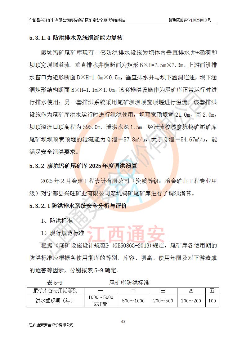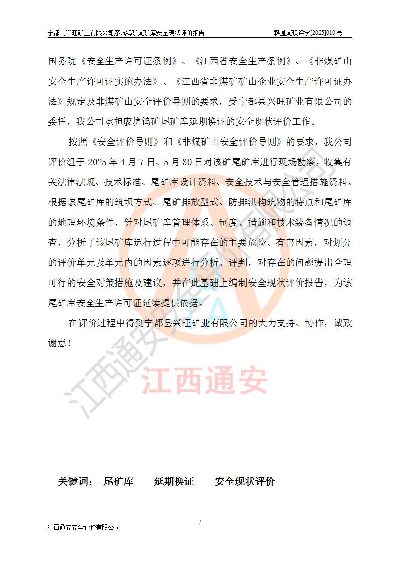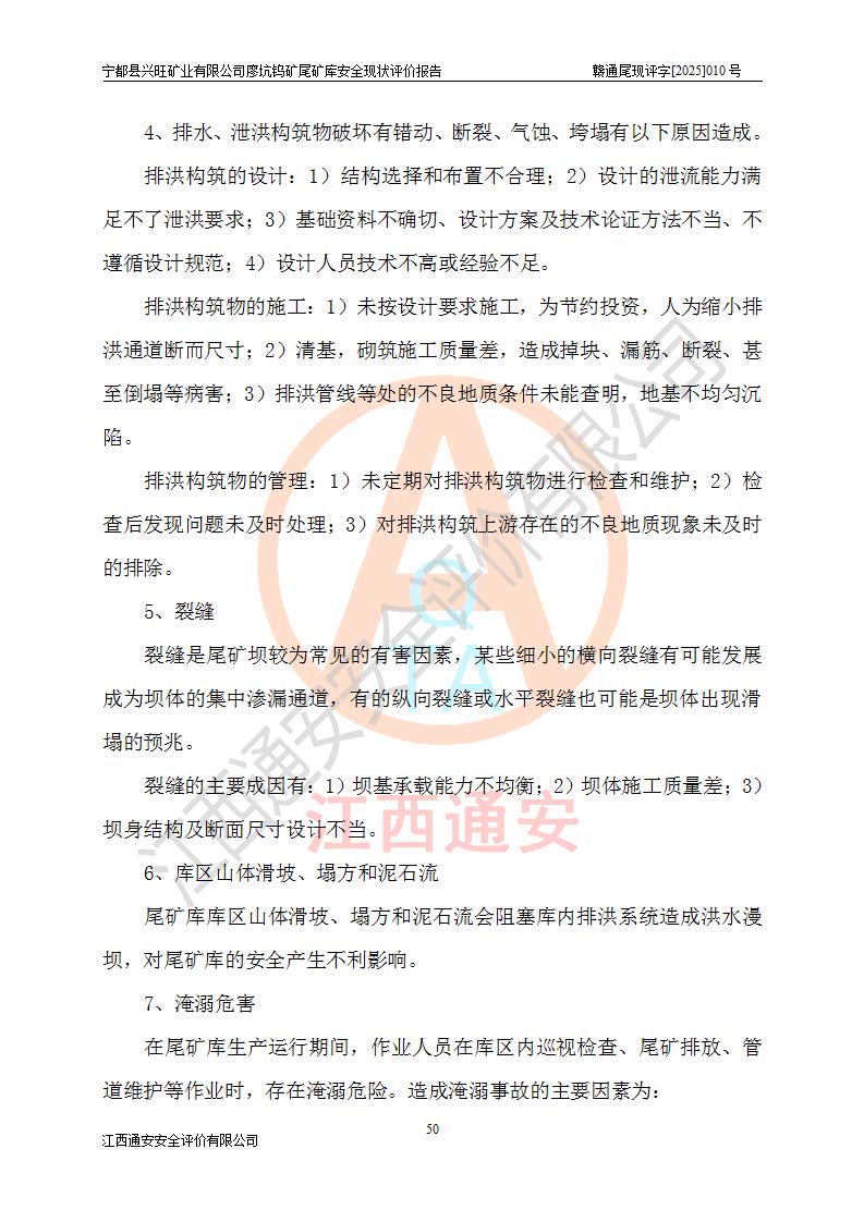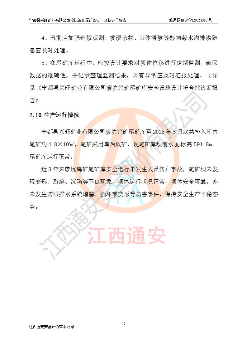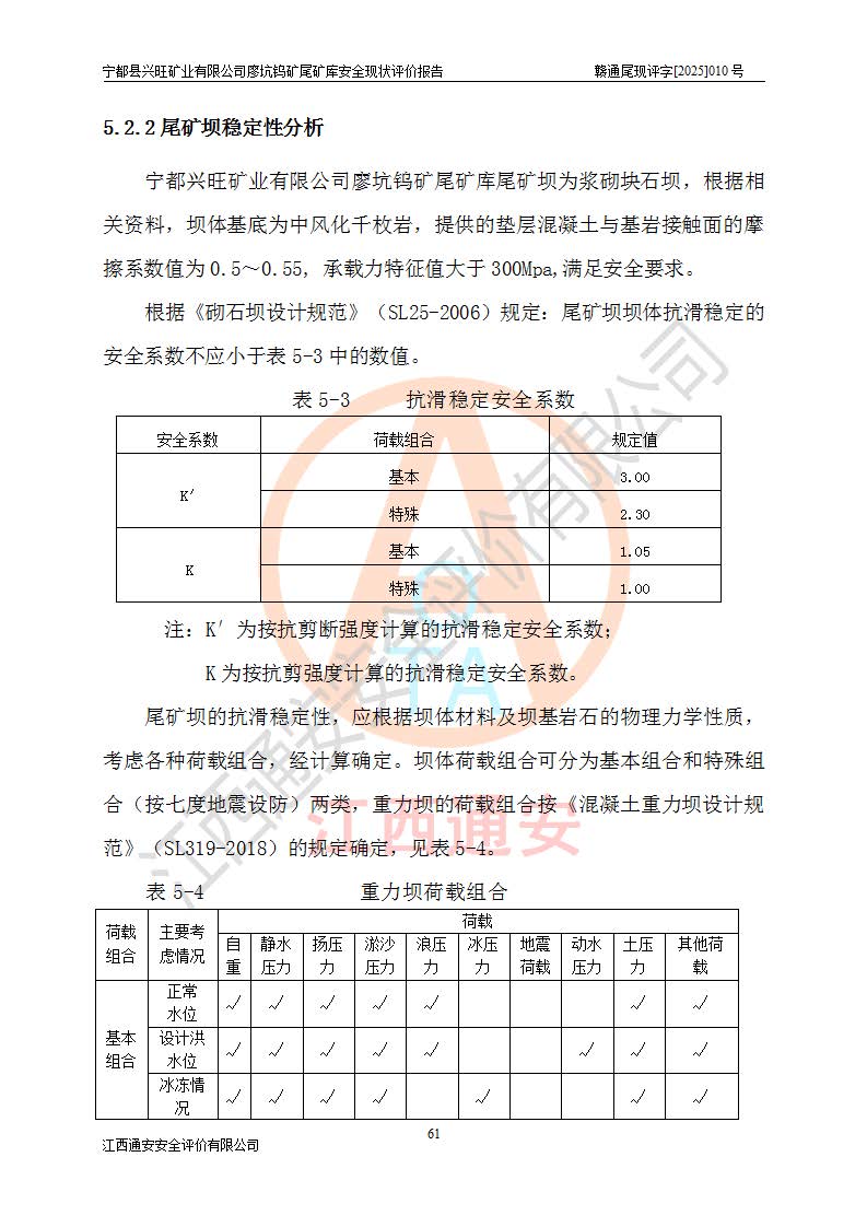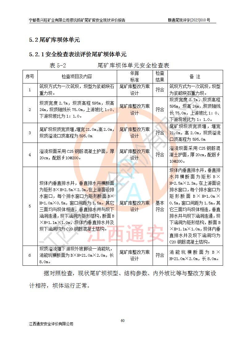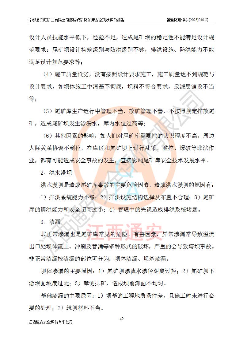 寧都縣興旺礦業(yè)有限公司廖坑鎢礦位于寧都縣縣城北西直距約15km處的安福鄉(xiāng)西甲村,地理坐標(biāo):東經(jīng)115°50′48″;北緯26°32′1″。寧都縣興旺礦業(yè)有限公司成立于2006年03月29日,統(tǒng)一社會(huì)信用代碼為91360730787253633E,企業(yè)類型為有限責(zé)任公司(自然人投資或控股),企業(yè)注冊(cè)地位于江西省贛州市寧都縣安福鄉(xiāng)西甲村,法定**人為曾德強(qiáng),注冊(cè)資本為1915萬元人民幣,所屬行業(yè)為有色金屬礦采選業(yè),經(jīng)營范圍包括鎢砂開采及廢砂石加工、銷售。 廖坑鎢礦尾礦庫位于寧都縣安福鄉(xiāng)西甲村、選礦廠東面約1.17Km的下游溝谷中,選礦廠年生產(chǎn)工作日300d,尾礦堆積干容重1.60 t/m3。尾礦庫匯水面積1.927km2,尾礦壩為漿砌塊石重力壩,壩頂高程595.0m,清基后壩底高程為571.0m,壩高24.0m,壩頂寬度2.7m,壩頂軸線長75.0m;上游壩坡1:0,下游壩坡1:1.0。尾礦從庫尾進(jìn)行排放,設(shè)計(jì)總庫容8.5×104m3,服務(wù)年限10.9年。尾礦庫總占地面積約21.0畝。為山谷型五等庫。 該尾礦庫于1982年11月由寧都縣水電施工隊(duì)建設(shè)施工,1983年11月投產(chǎn),2007年1月由江西省冶金設(shè)計(jì)院編制了《寧都縣興旺礦業(yè)有限公司廖坑鎢礦尾礦庫整改方案設(shè)計(jì)》,2008年4月2日取得江西省安全生產(chǎn)監(jiān)督管理局頒發(fā)的安全生產(chǎn)許可證,證書編號(hào)(贛)FM安許證字[2008]M1268號(hào)。2022年江西通安安全評(píng)價(jià)有限公司編制了安全現(xiàn)狀評(píng)價(jià)報(bào)告,2022年7月15日由贛州市行政審批局下發(fā)了安全生產(chǎn)許可證,證號(hào)(贛)FM安許證字[2022]B0081號(hào),(贛市行審證(3)字[2022]第274號(hào)),**期至2025年7月14日。 依照《非煤礦礦山企業(yè)安全生產(chǎn)許可證延期換證工作》的通知,根據(jù)***《安全生產(chǎn)許可證條例》、《江西省安全生產(chǎn)條例》、《非煤礦山安全生產(chǎn)許可證實(shí)施辦法》、《江西省非煤礦礦山企業(yè)安全生產(chǎn)許可證辦法》規(guī)定及非煤礦山安全評(píng)價(jià)導(dǎo)則的要求,受寧都縣興旺礦業(yè)有限公司的委托,我公司承擔(dān)廖坑鎢礦尾礦庫延期換證的安全現(xiàn)狀評(píng)價(jià)工作。 |