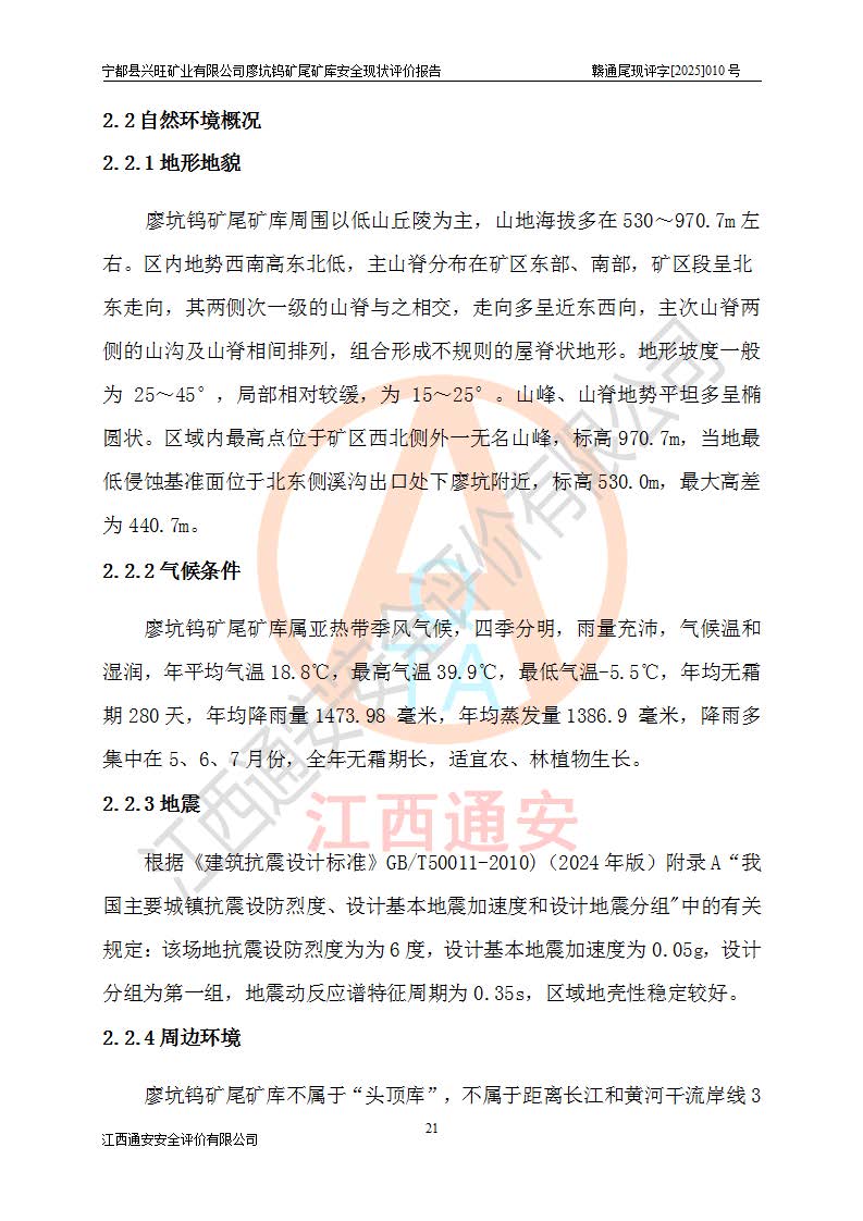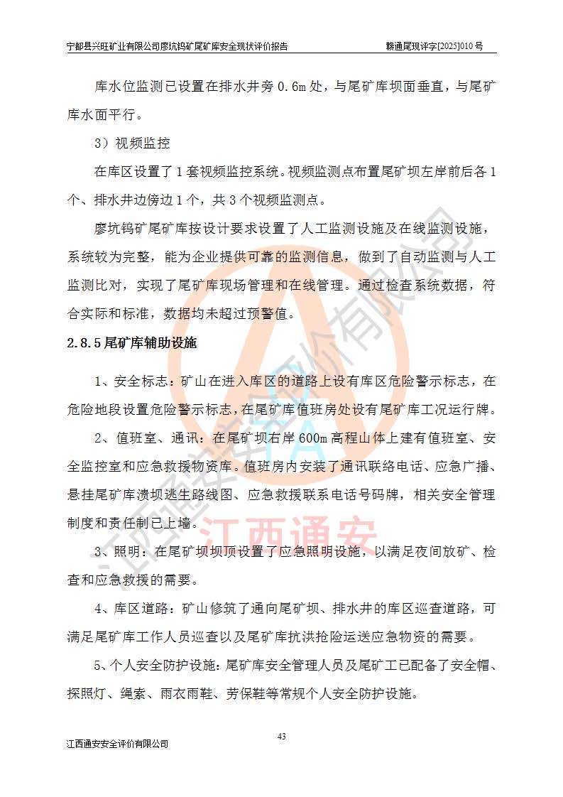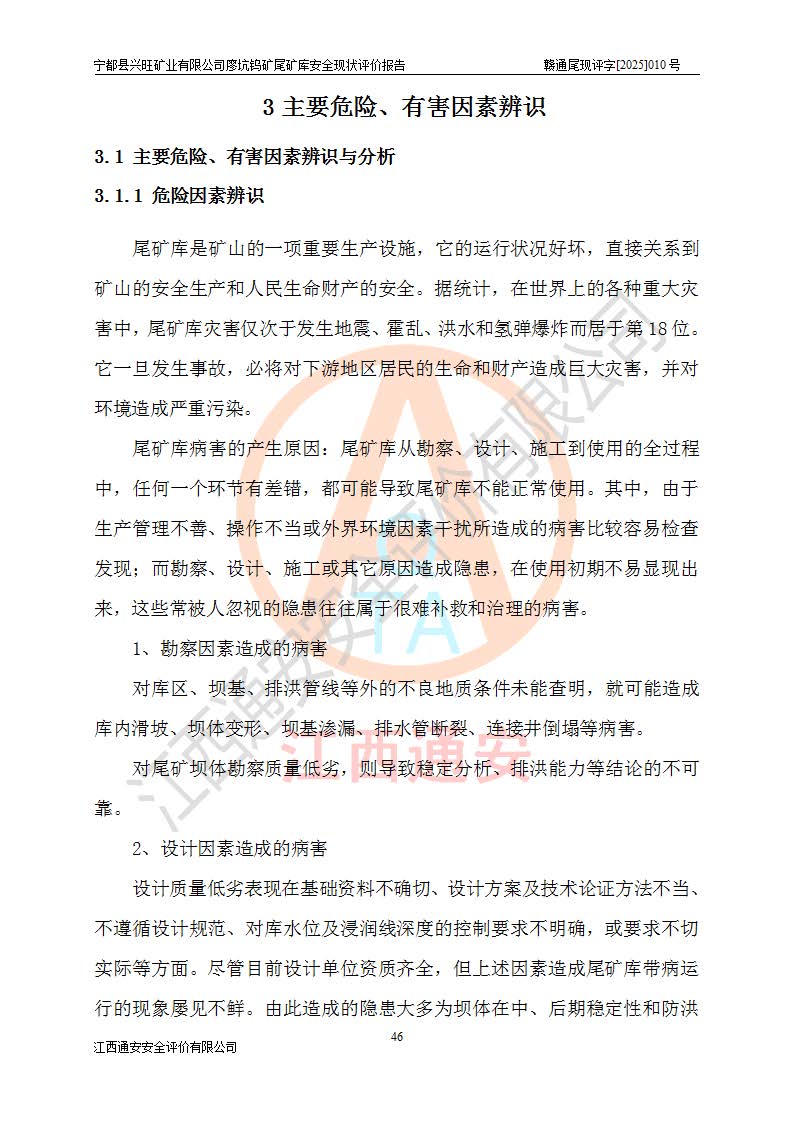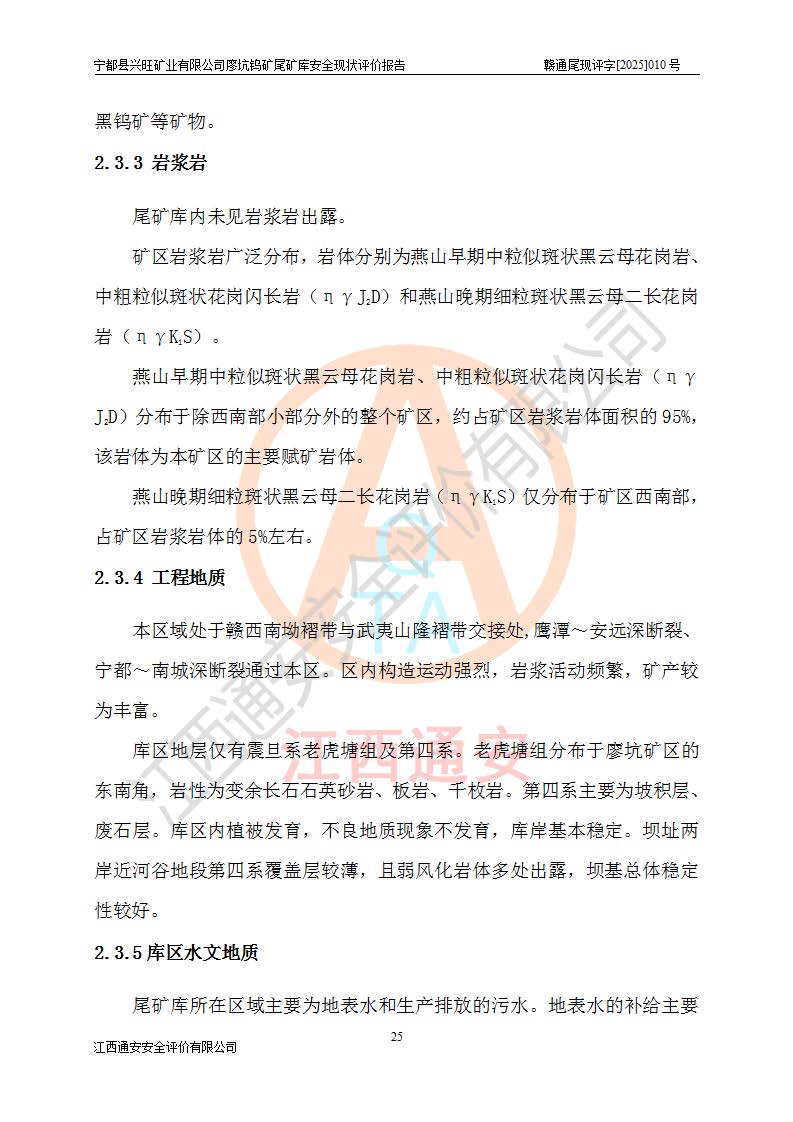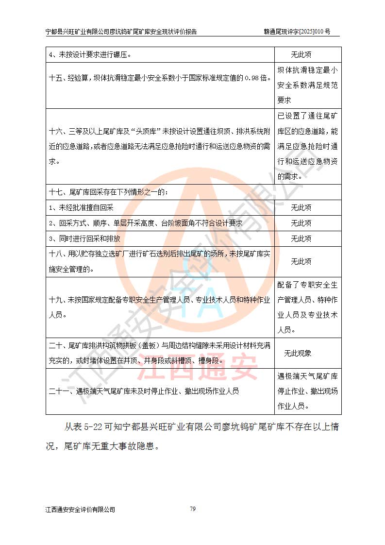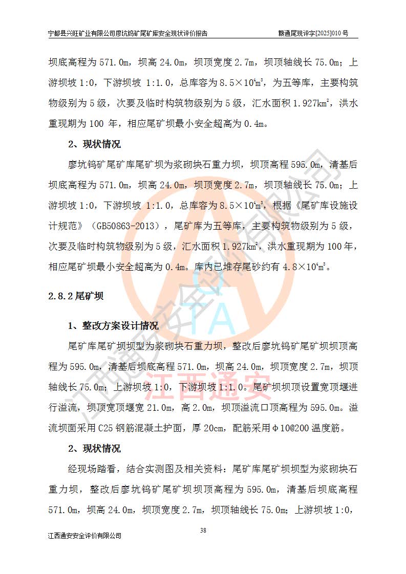 寧都縣興旺礦業(yè)有限公司廖坑鎢礦位于寧都縣縣城北西直距約15km處的安福鄉(xiāng)西甲村,地理坐標(biāo):東經(jīng)115°50′48″;北緯26°32′1″。寧都縣興旺礦業(yè)有限公司成立于2006年03月29日,統(tǒng)一社會(huì)信用代碼為91360730787253633E,企業(yè)類型為有限責(zé)任公司(自然人投資或控股),企業(yè)注冊(cè)地位于江西省贛州市寧都縣安福鄉(xiāng)西甲村,法定**人為曾德強(qiáng),注冊(cè)資本為1915萬元人民幣,所屬行業(yè)為有色金屬礦采選業(yè),經(jīng)營范圍包括鎢砂開采及廢砂石加工、銷售。 廖坑鎢礦尾礦庫位于寧都縣安福鄉(xiāng)西甲村、選礦廠東面約1.17Km的下游溝谷中,選礦廠年生產(chǎn)工作日300d,尾礦堆積干容重1.60 t/m3。尾礦庫匯水面積1.927km2,尾礦壩為漿砌塊石重力壩,壩頂高程595.0m,清基后壩底高程為571.0m,壩高24.0m,壩頂寬度2.7m,壩頂軸線長75.0m;上游壩坡1:0,下游壩坡1:1.0。尾礦從庫尾進(jìn)行排放,設(shè)計(jì)總庫容8.5×104m3,服務(wù)年限10.9年。尾礦庫總占地面積約21.0畝。為山谷型五等庫。 該尾礦庫于1982年11月由寧都縣水電施工隊(duì)建設(shè)施工,1983年11月投產(chǎn),2007年1月由江西省冶金設(shè)計(jì)院編制了《寧都縣興旺礦業(yè)有限公司廖坑鎢礦尾礦庫整改方案設(shè)計(jì)》,2008年4月2日取得江西省安全生產(chǎn)監(jiān)督管理局頒發(fā)的安全生產(chǎn)許可證,證書編號(hào)(贛)FM安許證字[2008]M1268號(hào)。2022年江西通安安全評(píng)價(jià)有限公司編制了安全現(xiàn)狀評(píng)價(jià)報(bào)告,2022年7月15日由贛州市行政審批局下發(fā)了安全生產(chǎn)許可證,證號(hào)(贛)FM安許證字[2022]B0081號(hào),(贛市行審證(3)字[2022]第274號(hào)),**期至2025年7月14日。 依照《非煤礦礦山企業(yè)安全生產(chǎn)許可證延期換證工作》的通知,根據(jù)***《安全生產(chǎn)許可證條例》、《江西省安全生產(chǎn)條例》、《非煤礦山安全生產(chǎn)許可證實(shí)施辦法》、《江西省非煤礦礦山企業(yè)安全生產(chǎn)許可證辦法》規(guī)定及非煤礦山安全評(píng)價(jià)導(dǎo)則的要求,受寧都縣興旺礦業(yè)有限公司的委托,我公司承擔(dān)廖坑鎢礦尾礦庫延期換證的安全現(xiàn)狀評(píng)價(jià)工作。 |