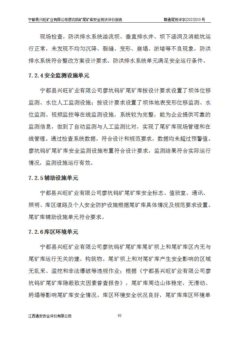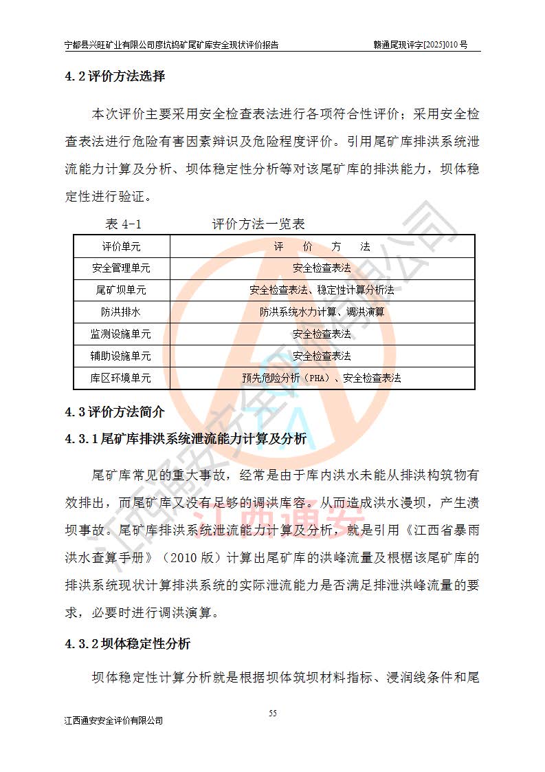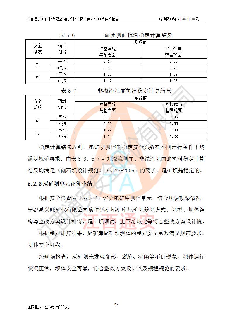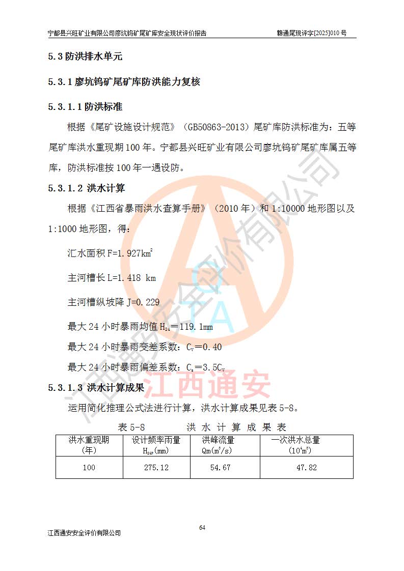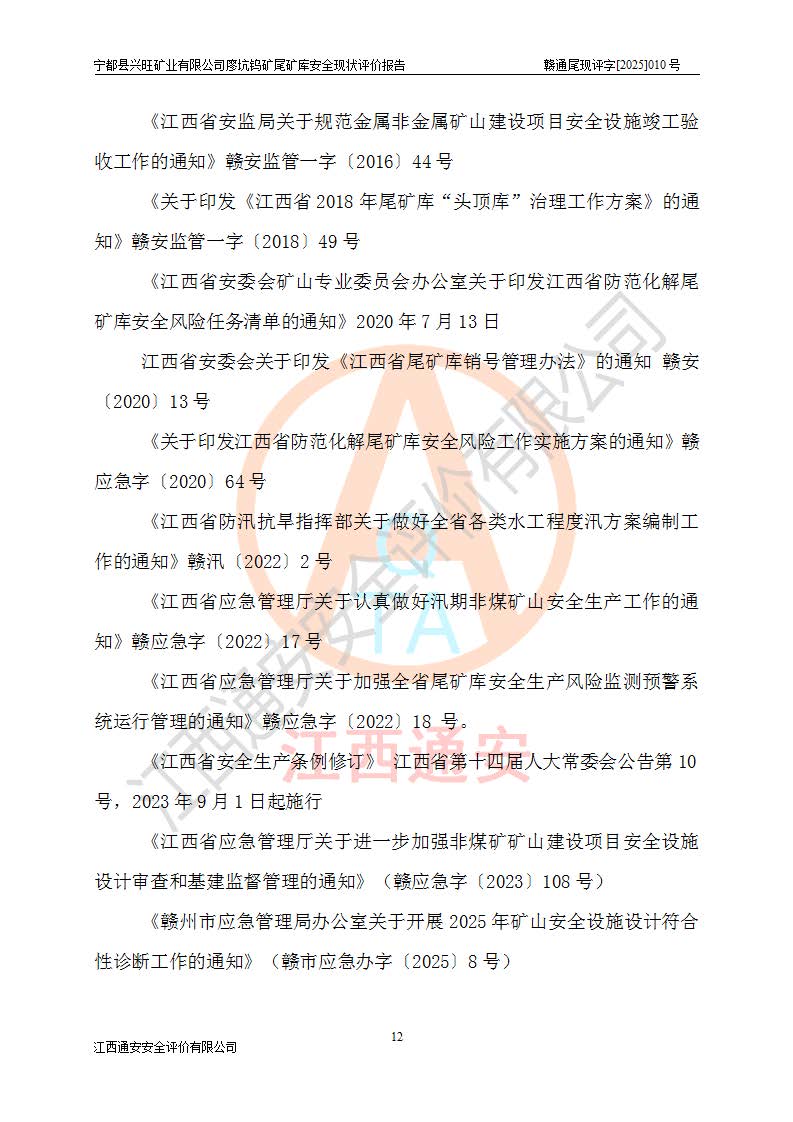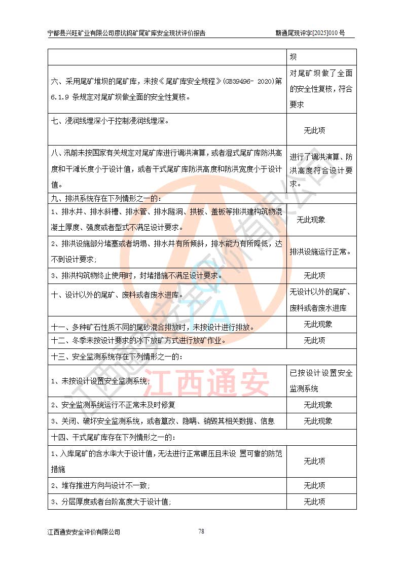 寧都縣興旺礦業(yè)有限公司廖坑鎢礦位于寧都縣縣城北西直距約15km處的安福鄉(xiāng)西甲村,地理坐標(biāo):東經(jīng)115°50′48″;北緯26°32′1″。寧都縣興旺礦業(yè)有限公司成立于2006年03月29日,統(tǒng)一社會(huì)信用代碼為91360730787253633E,企業(yè)類型為有限責(zé)任公司(自然人投資或控股),企業(yè)注冊(cè)地位于江西省贛州市寧都縣安福鄉(xiāng)西甲村,法定**人為曾德強(qiáng),注冊(cè)資本為1915萬元人民幣,所屬行業(yè)為有色金屬礦采選業(yè),經(jīng)營范圍包括鎢砂開采及廢砂石加工、銷售。 廖坑鎢礦尾礦庫位于寧都縣安福鄉(xiāng)西甲村、選礦廠東面約1.17Km的下游溝谷中,選礦廠年生產(chǎn)工作日300d,尾礦堆積干容重1.60 t/m3。尾礦庫匯水面積1.927km2,尾礦壩為漿砌塊石重力壩,壩頂高程595.0m,清基后壩底高程為571.0m,壩高24.0m,壩頂寬度2.7m,壩頂軸線長75.0m;上游壩坡1:0,下游壩坡1:1.0。尾礦從庫尾進(jìn)行排放,設(shè)計(jì)總庫容8.5×104m3,服務(wù)年限10.9年。尾礦庫總占地面積約21.0畝。為山谷型五等庫。 該尾礦庫于1982年11月由寧都縣水電施工隊(duì)建設(shè)施工,1983年11月投產(chǎn),2007年1月由江西省冶金設(shè)計(jì)院編制了《寧都縣興旺礦業(yè)有限公司廖坑鎢礦尾礦庫整改方案設(shè)計(jì)》,2008年4月2日取得江西省安全生產(chǎn)監(jiān)督管理局頒發(fā)的安全生產(chǎn)許可證,證書編號(hào)(贛)FM安許證字[2008]M1268號(hào)。2022年江西通安安全評(píng)價(jià)有限公司編制了安全現(xiàn)狀評(píng)價(jià)報(bào)告,2022年7月15日由贛州市行政審批局下發(fā)了安全生產(chǎn)許可證,證號(hào)(贛)FM安許證字[2022]B0081號(hào),(贛市行審證(3)字[2022]第274號(hào)),**期至2025年7月14日。 依照《非煤礦礦山企業(yè)安全生產(chǎn)許可證延期換證工作》的通知,根據(jù)***《安全生產(chǎn)許可證條例》、《江西省安全生產(chǎn)條例》、《非煤礦山安全生產(chǎn)許可證實(shí)施辦法》、《江西省非煤礦礦山企業(yè)安全生產(chǎn)許可證辦法》規(guī)定及非煤礦山安全評(píng)價(jià)導(dǎo)則的要求,受寧都縣興旺礦業(yè)有限公司的委托,我公司承擔(dān)廖坑鎢礦尾礦庫延期換證的安全現(xiàn)狀評(píng)價(jià)工作。 |