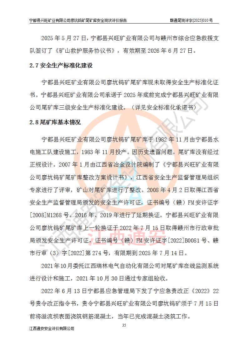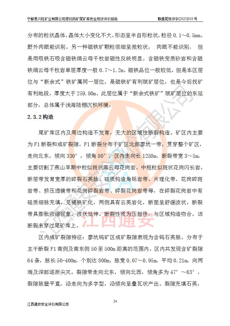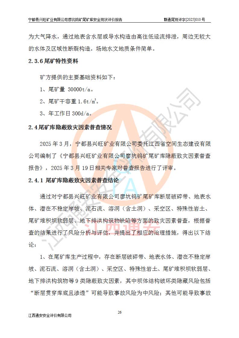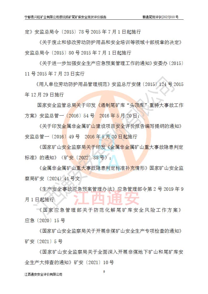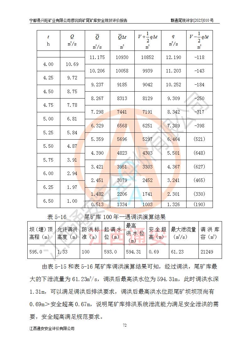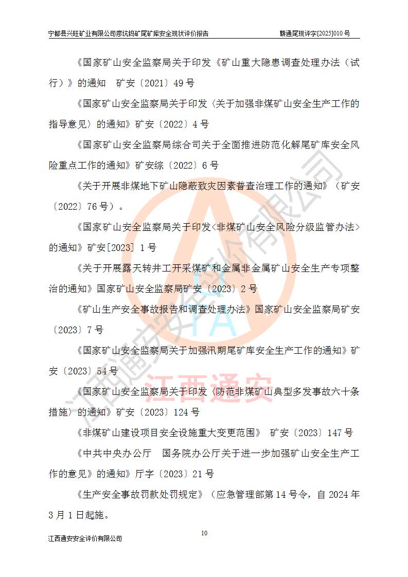 寧都縣興旺礦業(yè)有限公司廖坑鎢礦位于寧都縣縣城北西直距約15km處的安福鄉(xiāng)西甲村,地理坐標(biāo):東經(jīng)115°50′48″;北緯26°32′1″。寧都縣興旺礦業(yè)有限公司成立于2006年03月29日,統(tǒng)一社會(huì)信用代碼為91360730787253633E,企業(yè)類型為有限責(zé)任公司(自然人投資或控股),企業(yè)注冊(cè)地位于江西省贛州市寧都縣安福鄉(xiāng)西甲村,法定**人為曾德強(qiáng),注冊(cè)資本為1915萬元人民幣,所屬行業(yè)為有色金屬礦采選業(yè),經(jīng)營范圍包括鎢砂開采及廢砂石加工、銷售。 廖坑鎢礦尾礦庫位于寧都縣安福鄉(xiāng)西甲村、選礦廠東面約1.17Km的下游溝谷中,選礦廠年生產(chǎn)工作日300d,尾礦堆積干容重1.60 t/m3。尾礦庫匯水面積1.927km2,尾礦壩為漿砌塊石重力壩,壩頂高程595.0m,清基后壩底高程為571.0m,壩高24.0m,壩頂寬度2.7m,壩頂軸線長75.0m;上游壩坡1:0,下游壩坡1:1.0。尾礦從庫尾進(jìn)行排放,設(shè)計(jì)總庫容8.5×104m3,服務(wù)年限10.9年。尾礦庫總占地面積約21.0畝。為山谷型五等庫。 該尾礦庫于1982年11月由寧都縣水電施工隊(duì)建設(shè)施工,1983年11月投產(chǎn),2007年1月由江西省冶金設(shè)計(jì)院編制了《寧都縣興旺礦業(yè)有限公司廖坑鎢礦尾礦庫整改方案設(shè)計(jì)》,2008年4月2日取得江西省安全生產(chǎn)監(jiān)督管理局頒發(fā)的安全生產(chǎn)許可證,證書編號(hào)(贛)FM安許證字[2008]M1268號(hào)。2022年江西通安安全評(píng)價(jià)有限公司編制了安全現(xiàn)狀評(píng)價(jià)報(bào)告,2022年7月15日由贛州市行政審批局下發(fā)了安全生產(chǎn)許可證,證號(hào)(贛)FM安許證字[2022]B0081號(hào),(贛市行審證(3)字[2022]第274號(hào)),**期至2025年7月14日。 依照《非煤礦礦山企業(yè)安全生產(chǎn)許可證延期換證工作》的通知,根據(jù)***《安全生產(chǎn)許可證條例》、《江西省安全生產(chǎn)條例》、《非煤礦山安全生產(chǎn)許可證實(shí)施辦法》、《江西省非煤礦礦山企業(yè)安全生產(chǎn)許可證辦法》規(guī)定及非煤礦山安全評(píng)價(jià)導(dǎo)則的要求,受寧都縣興旺礦業(yè)有限公司的委托,我公司承擔(dān)廖坑鎢礦尾礦庫延期換證的安全現(xiàn)狀評(píng)價(jià)工作。 |