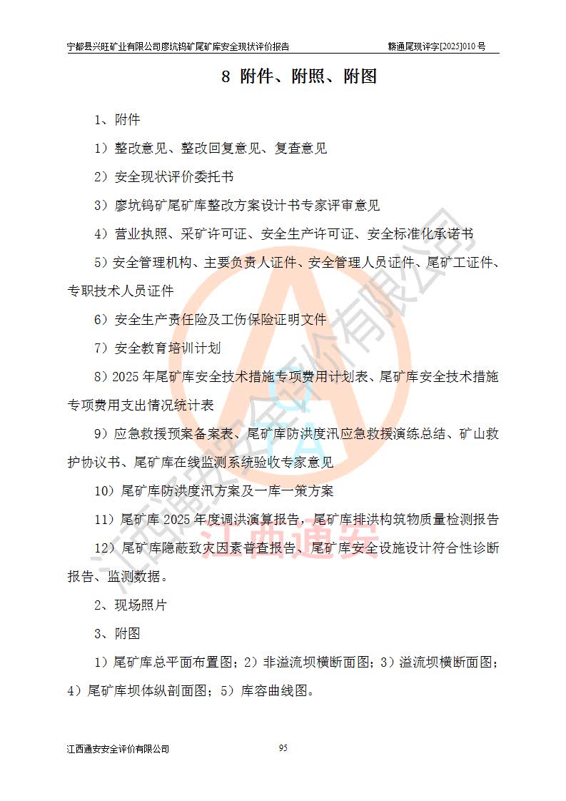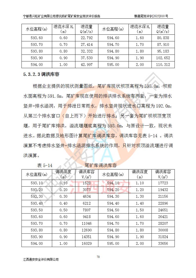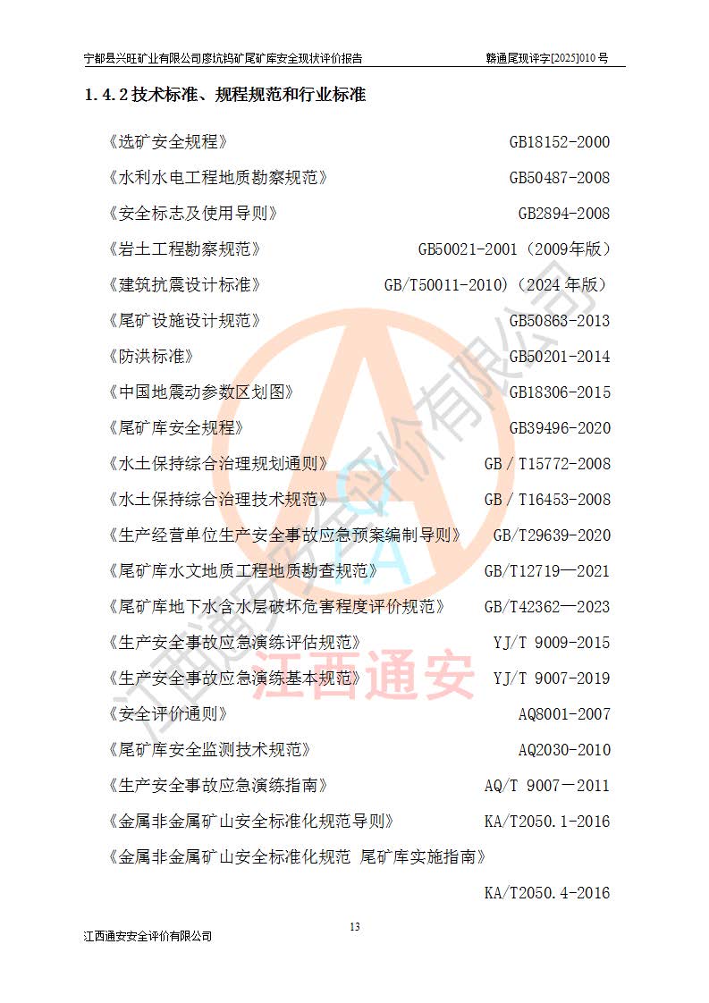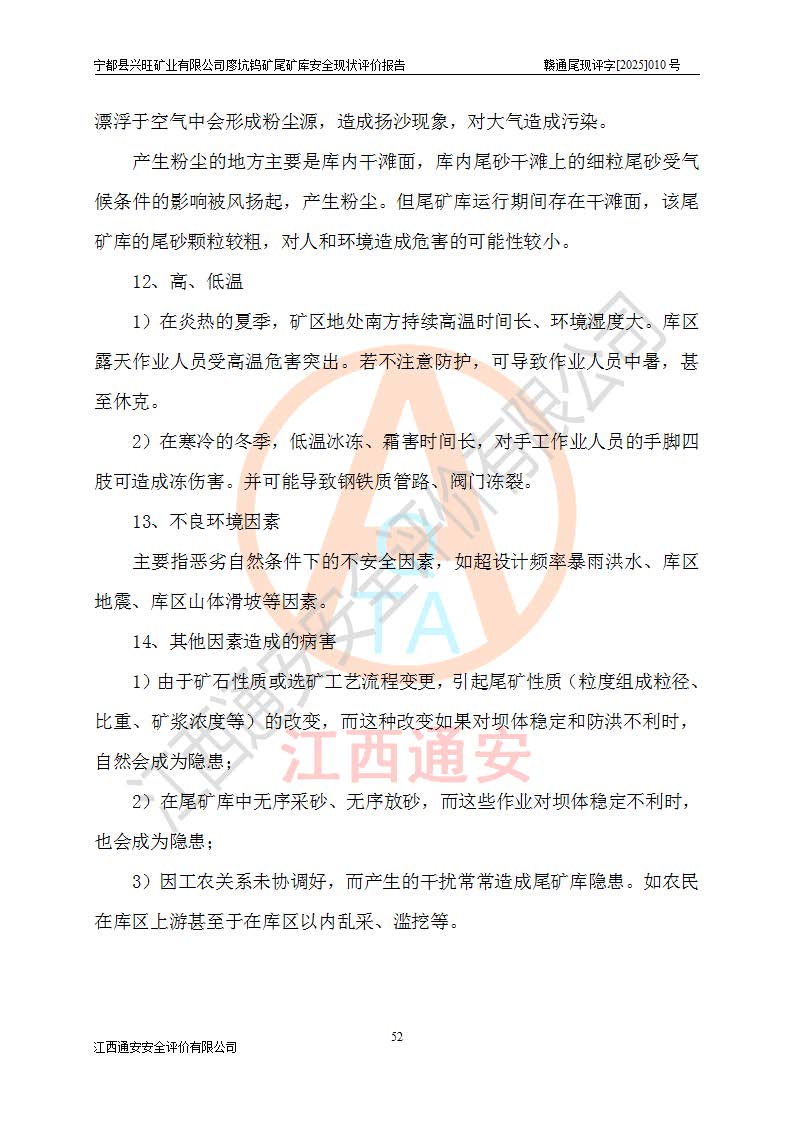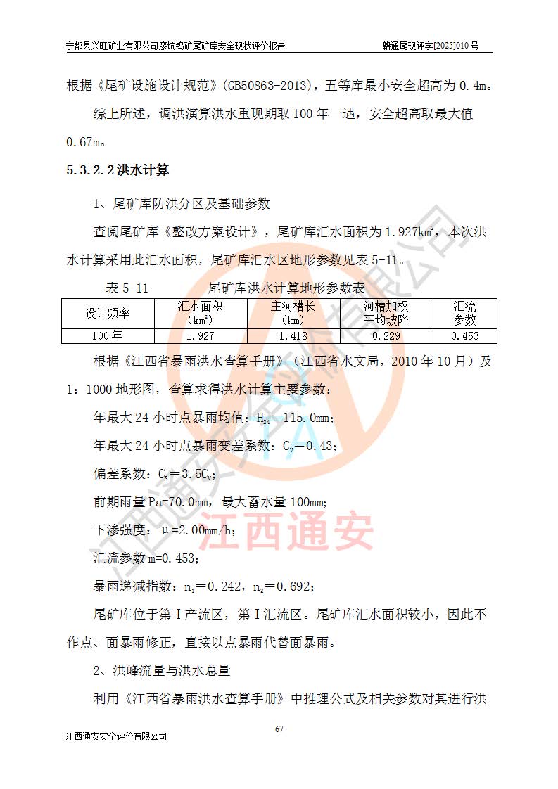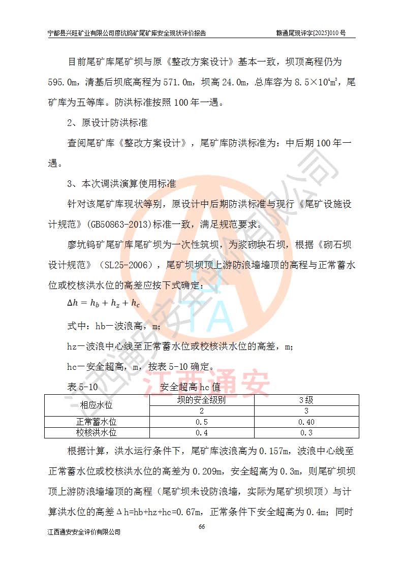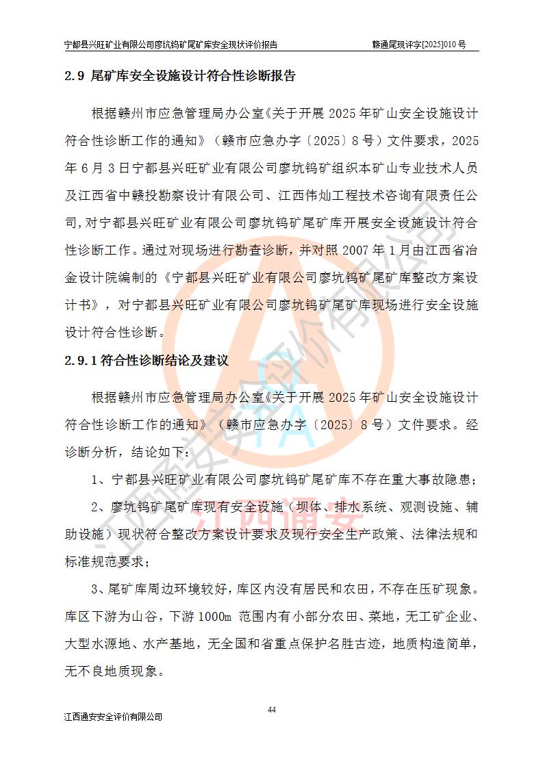 寧都縣興旺礦業(yè)有限公司廖坑鎢礦位于寧都縣縣城北西直距約15km處的安福鄉(xiāng)西甲村,地理坐標(biāo):東經(jīng)115°50′48″;北緯26°32′1″。寧都縣興旺礦業(yè)有限公司成立于2006年03月29日,統(tǒng)一社會(huì)信用代碼為91360730787253633E,企業(yè)類型為有限責(zé)任公司(自然人投資或控股),企業(yè)注冊(cè)地位于江西省贛州市寧都縣安福鄉(xiāng)西甲村,法定**人為曾德強(qiáng),注冊(cè)資本為1915萬元人民幣,所屬行業(yè)為有色金屬礦采選業(yè),經(jīng)營范圍包括鎢砂開采及廢砂石加工、銷售。 廖坑鎢礦尾礦庫位于寧都縣安福鄉(xiāng)西甲村、選礦廠東面約1.17Km的下游溝谷中,選礦廠年生產(chǎn)工作日300d,尾礦堆積干容重1.60 t/m3。尾礦庫匯水面積1.927km2,尾礦壩為漿砌塊石重力壩,壩頂高程595.0m,清基后壩底高程為571.0m,壩高24.0m,壩頂寬度2.7m,壩頂軸線長75.0m;上游壩坡1:0,下游壩坡1:1.0。尾礦從庫尾進(jìn)行排放,設(shè)計(jì)總庫容8.5×104m3,服務(wù)年限10.9年。尾礦庫總占地面積約21.0畝。為山谷型五等庫。 該尾礦庫于1982年11月由寧都縣水電施工隊(duì)建設(shè)施工,1983年11月投產(chǎn),2007年1月由江西省冶金設(shè)計(jì)院編制了《寧都縣興旺礦業(yè)有限公司廖坑鎢礦尾礦庫整改方案設(shè)計(jì)》,2008年4月2日取得江西省安全生產(chǎn)監(jiān)督管理局頒發(fā)的安全生產(chǎn)許可證,證書編號(hào)(贛)FM安許證字[2008]M1268號(hào)。2022年江西通安安全評(píng)價(jià)有限公司編制了安全現(xiàn)狀評(píng)價(jià)報(bào)告,2022年7月15日由贛州市行政審批局下發(fā)了安全生產(chǎn)許可證,證號(hào)(贛)FM安許證字[2022]B0081號(hào),(贛市行審證(3)字[2022]第274號(hào)),**期至2025年7月14日。 依照《非煤礦礦山企業(yè)安全生產(chǎn)許可證延期換證工作》的通知,根據(jù)***《安全生產(chǎn)許可證條例》、《江西省安全生產(chǎn)條例》、《非煤礦山安全生產(chǎn)許可證實(shí)施辦法》、《江西省非煤礦礦山企業(yè)安全生產(chǎn)許可證辦法》規(guī)定及非煤礦山安全評(píng)價(jià)導(dǎo)則的要求,受寧都縣興旺礦業(yè)有限公司的委托,我公司承擔(dān)廖坑鎢礦尾礦庫延期換證的安全現(xiàn)狀評(píng)價(jià)工作。 |