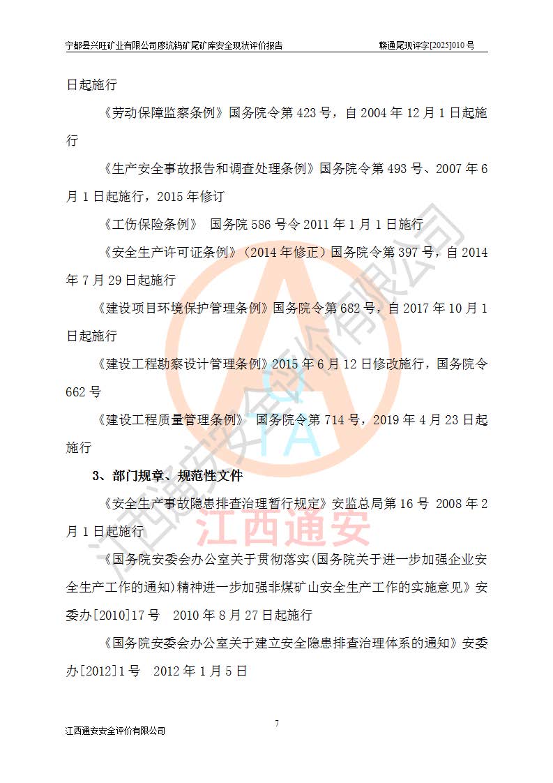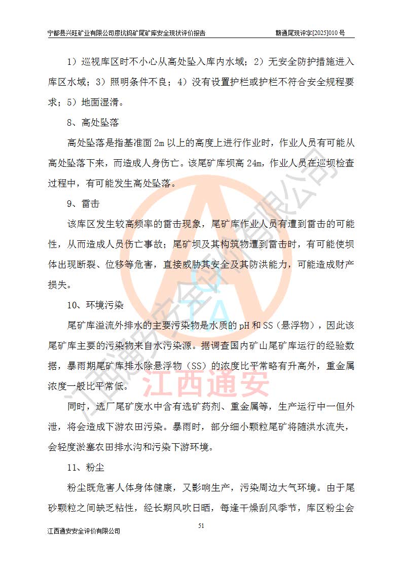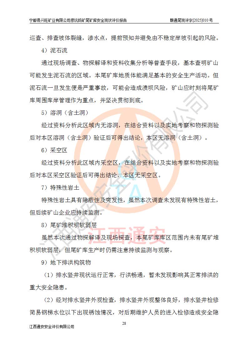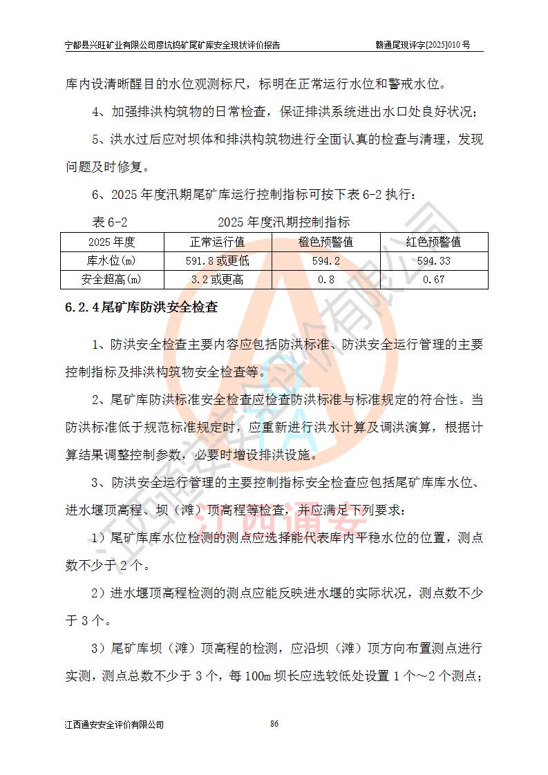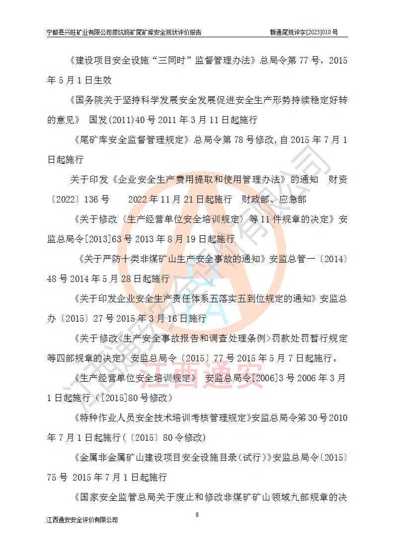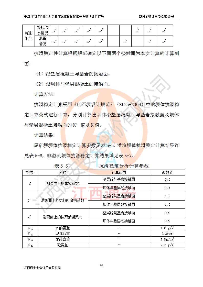 寧都縣興旺礦業(yè)有限公司廖坑鎢礦位于寧都縣縣城北西直距約15km處的安福鄉(xiāng)西甲村,地理坐標(biāo):東經(jīng)115°50′48″;北緯26°32′1″。寧都縣興旺礦業(yè)有限公司成立于2006年03月29日,統(tǒng)一社會(huì)信用代碼為91360730787253633E,企業(yè)類型為有限責(zé)任公司(自然人投資或控股),企業(yè)注冊(cè)地位于江西省贛州市寧都縣安福鄉(xiāng)西甲村,法定**人為曾德強(qiáng),注冊(cè)資本為1915萬元人民幣,所屬行業(yè)為有色金屬礦采選業(yè),經(jīng)營范圍包括鎢砂開采及廢砂石加工、銷售。 廖坑鎢礦尾礦庫位于寧都縣安福鄉(xiāng)西甲村、選礦廠東面約1.17Km的下游溝谷中,選礦廠年生產(chǎn)工作日300d,尾礦堆積干容重1.60 t/m3。尾礦庫匯水面積1.927km2,尾礦壩為漿砌塊石重力壩,壩頂高程595.0m,清基后壩底高程為571.0m,壩高24.0m,壩頂寬度2.7m,壩頂軸線長75.0m;上游壩坡1:0,下游壩坡1:1.0。尾礦從庫尾進(jìn)行排放,設(shè)計(jì)總庫容8.5×104m3,服務(wù)年限10.9年。尾礦庫總占地面積約21.0畝。為山谷型五等庫。 該尾礦庫于1982年11月由寧都縣水電施工隊(duì)建設(shè)施工,1983年11月投產(chǎn),2007年1月由江西省冶金設(shè)計(jì)院編制了《寧都縣興旺礦業(yè)有限公司廖坑鎢礦尾礦庫整改方案設(shè)計(jì)》,2008年4月2日取得江西省安全生產(chǎn)監(jiān)督管理局頒發(fā)的安全生產(chǎn)許可證,證書編號(hào)(贛)FM安許證字[2008]M1268號(hào)。2022年江西通安安全評(píng)價(jià)有限公司編制了安全現(xiàn)狀評(píng)價(jià)報(bào)告,2022年7月15日由贛州市行政審批局下發(fā)了安全生產(chǎn)許可證,證號(hào)(贛)FM安許證字[2022]B0081號(hào),(贛市行審證(3)字[2022]第274號(hào)),**期至2025年7月14日。 依照《非煤礦礦山企業(yè)安全生產(chǎn)許可證延期換證工作》的通知,根據(jù)***《安全生產(chǎn)許可證條例》、《江西省安全生產(chǎn)條例》、《非煤礦山安全生產(chǎn)許可證實(shí)施辦法》、《江西省非煤礦礦山企業(yè)安全生產(chǎn)許可證辦法》規(guī)定及非煤礦山安全評(píng)價(jià)導(dǎo)則的要求,受寧都縣興旺礦業(yè)有限公司的委托,我公司承擔(dān)廖坑鎢礦尾礦庫延期換證的安全現(xiàn)狀評(píng)價(jià)工作。 |
