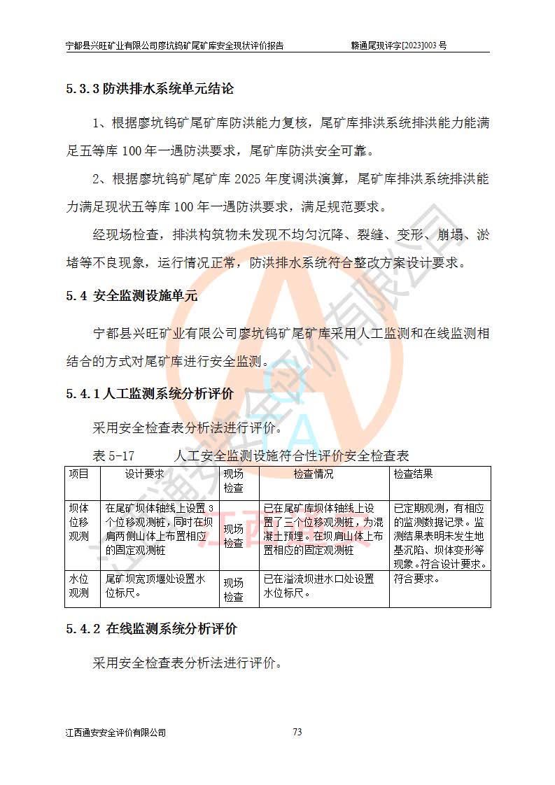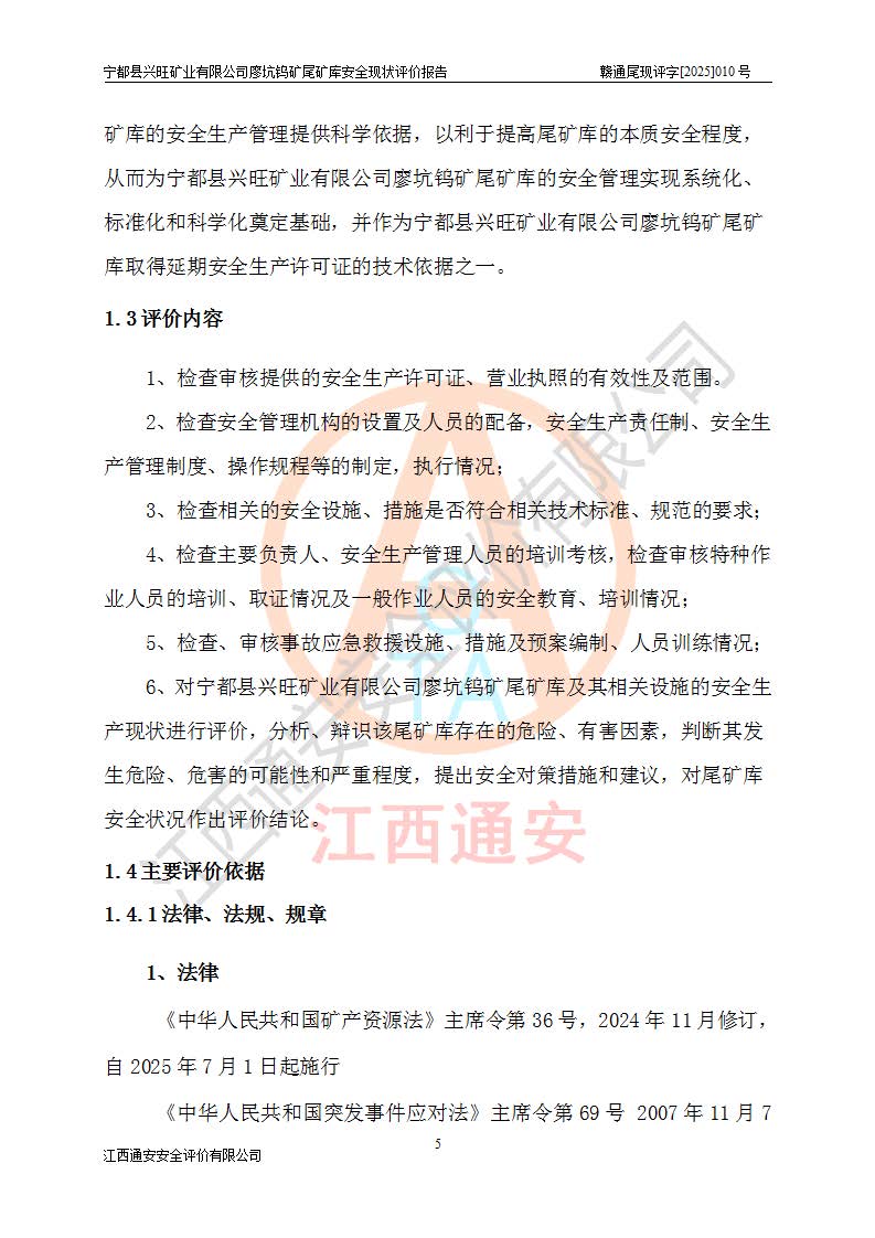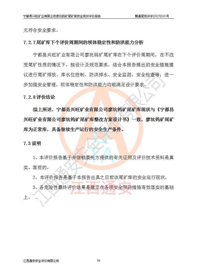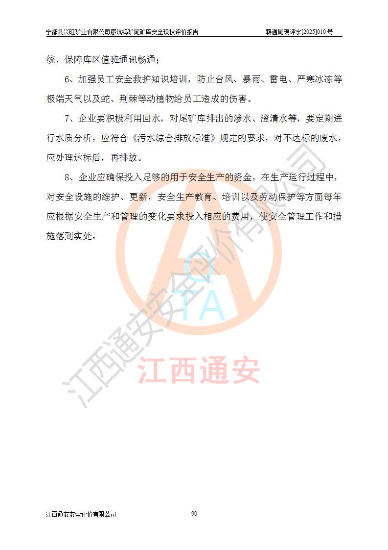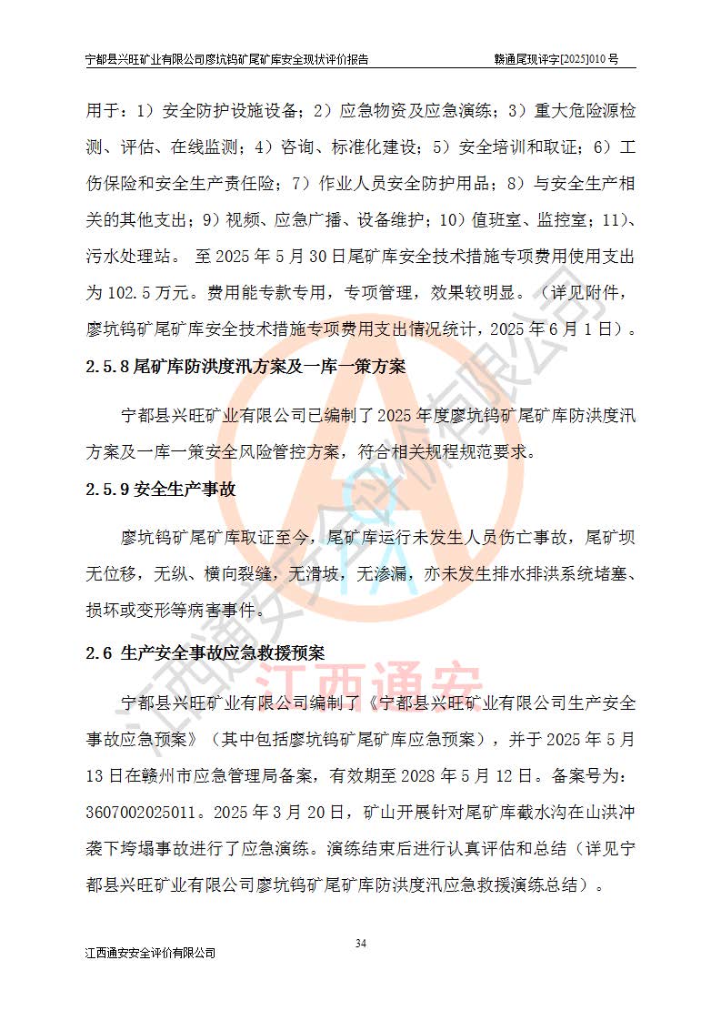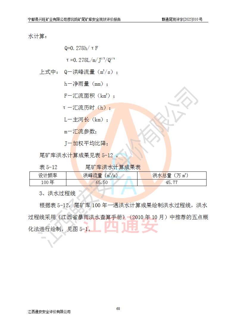 寧都縣興旺礦業(yè)有限公司廖坑鎢礦位于寧都縣縣城北西直距約15km處的安福鄉(xiāng)西甲村,地理坐標(biāo):東經(jīng)115°50′48″;北緯26°32′1″。寧都縣興旺礦業(yè)有限公司成立于2006年03月29日,統(tǒng)一社會(huì)信用代碼為91360730787253633E,企業(yè)類型為有限責(zé)任公司(自然人投資或控股),企業(yè)注冊(cè)地位于江西省贛州市寧都縣安福鄉(xiāng)西甲村,法定**人為曾德強(qiáng),注冊(cè)資本為1915萬元人民幣,所屬行業(yè)為有色金屬礦采選業(yè),經(jīng)營范圍包括鎢砂開采及廢砂石加工、銷售。 廖坑鎢礦尾礦庫位于寧都縣安福鄉(xiāng)西甲村、選礦廠東面約1.17Km的下游溝谷中,選礦廠年生產(chǎn)工作日300d,尾礦堆積干容重1.60 t/m3。尾礦庫匯水面積1.927km2,尾礦壩為漿砌塊石重力壩,壩頂高程595.0m,清基后壩底高程為571.0m,壩高24.0m,壩頂寬度2.7m,壩頂軸線長75.0m;上游壩坡1:0,下游壩坡1:1.0。尾礦從庫尾進(jìn)行排放,設(shè)計(jì)總庫容8.5×104m3,服務(wù)年限10.9年。尾礦庫總占地面積約21.0畝。為山谷型五等庫。 該尾礦庫于1982年11月由寧都縣水電施工隊(duì)建設(shè)施工,1983年11月投產(chǎn),2007年1月由江西省冶金設(shè)計(jì)院編制了《寧都縣興旺礦業(yè)有限公司廖坑鎢礦尾礦庫整改方案設(shè)計(jì)》,2008年4月2日取得江西省安全生產(chǎn)監(jiān)督管理局頒發(fā)的安全生產(chǎn)許可證,證書編號(hào)(贛)FM安許證字[2008]M1268號(hào)。2022年江西通安安全評(píng)價(jià)有限公司編制了安全現(xiàn)狀評(píng)價(jià)報(bào)告,2022年7月15日由贛州市行政審批局下發(fā)了安全生產(chǎn)許可證,證號(hào)(贛)FM安許證字[2022]B0081號(hào),(贛市行審證(3)字[2022]第274號(hào)),**期至2025年7月14日。 依照《非煤礦礦山企業(yè)安全生產(chǎn)許可證延期換證工作》的通知,根據(jù)***《安全生產(chǎn)許可證條例》、《江西省安全生產(chǎn)條例》、《非煤礦山安全生產(chǎn)許可證實(shí)施辦法》、《江西省非煤礦礦山企業(yè)安全生產(chǎn)許可證辦法》規(guī)定及非煤礦山安全評(píng)價(jià)導(dǎo)則的要求,受寧都縣興旺礦業(yè)有限公司的委托,我公司承擔(dān)廖坑鎢礦尾礦庫延期換證的安全現(xiàn)狀評(píng)價(jià)工作。 |