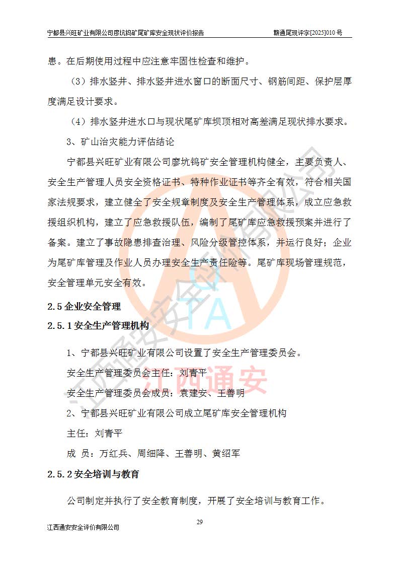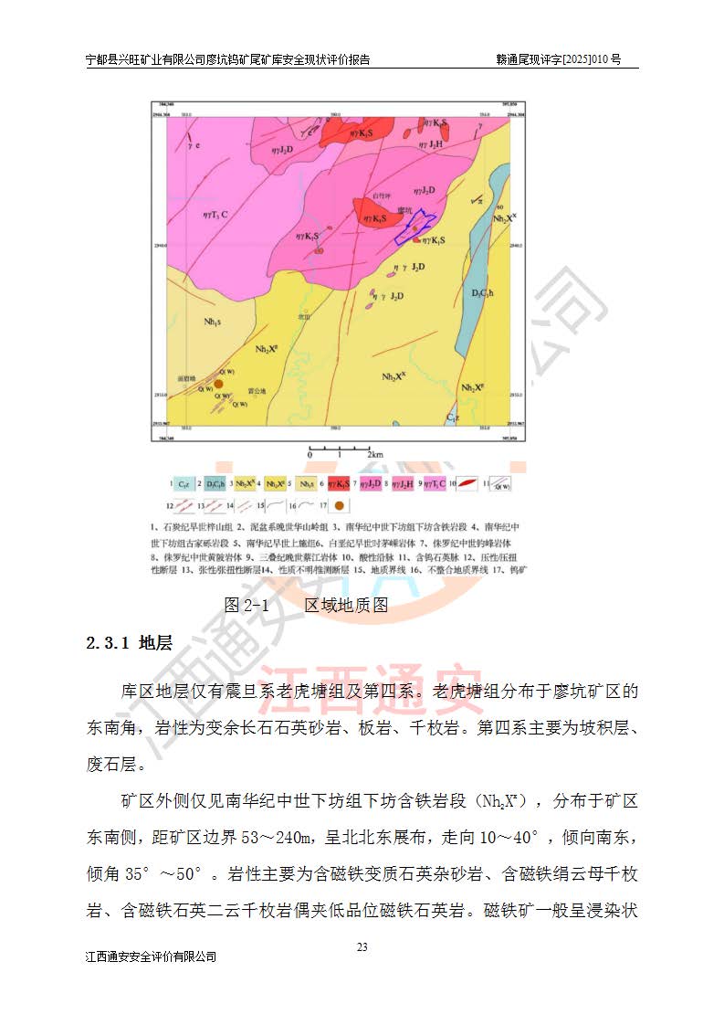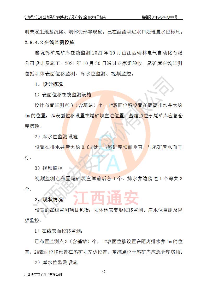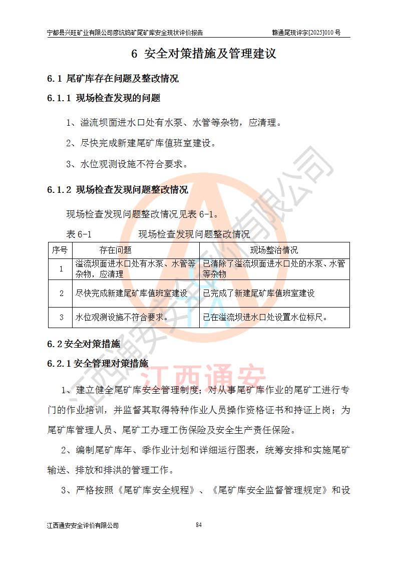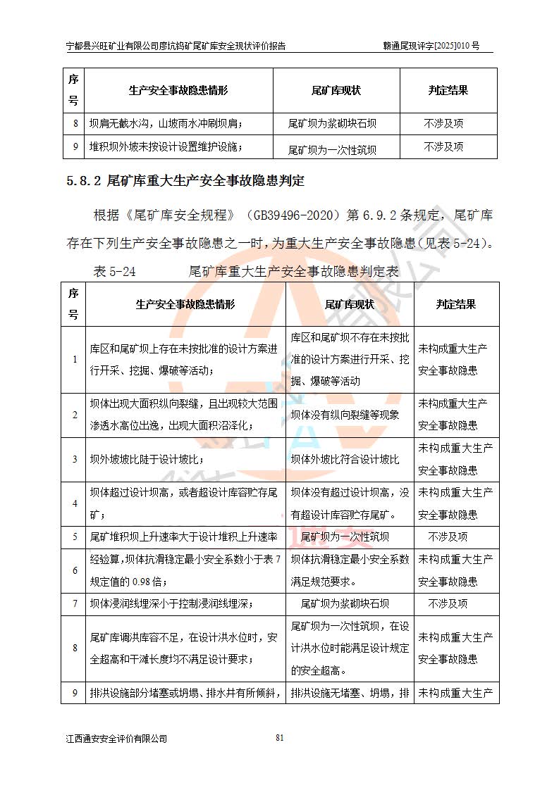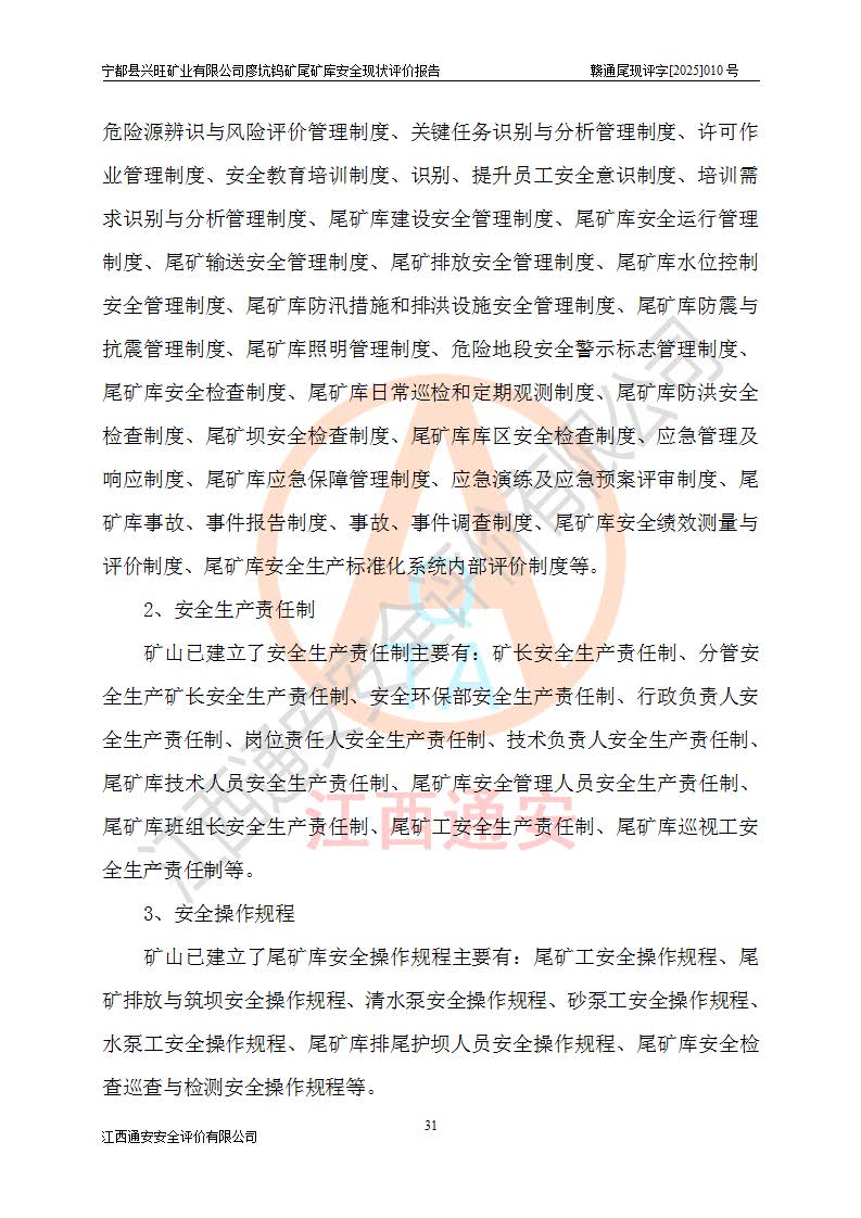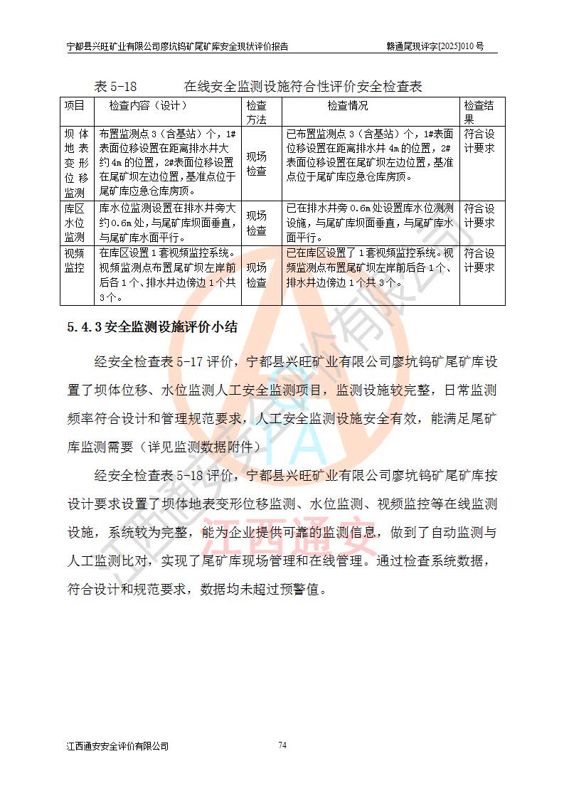 寧都縣興旺礦業(yè)有限公司廖坑鎢礦位于寧都縣縣城北西直距約15km處的安福鄉(xiāng)西甲村,地理坐標(biāo):東經(jīng)115°50′48″;北緯26°32′1″。寧都縣興旺礦業(yè)有限公司成立于2006年03月29日,統(tǒng)一社會(huì)信用代碼為91360730787253633E,企業(yè)類型為有限責(zé)任公司(自然人投資或控股),企業(yè)注冊(cè)地位于江西省贛州市寧都縣安福鄉(xiāng)西甲村,法定**人為曾德強(qiáng),注冊(cè)資本為1915萬元人民幣,所屬行業(yè)為有色金屬礦采選業(yè),經(jīng)營范圍包括鎢砂開采及廢砂石加工、銷售。 廖坑鎢礦尾礦庫位于寧都縣安福鄉(xiāng)西甲村、選礦廠東面約1.17Km的下游溝谷中,選礦廠年生產(chǎn)工作日300d,尾礦堆積干容重1.60 t/m3。尾礦庫匯水面積1.927km2,尾礦壩為漿砌塊石重力壩,壩頂高程595.0m,清基后壩底高程為571.0m,壩高24.0m,壩頂寬度2.7m,壩頂軸線長75.0m;上游壩坡1:0,下游壩坡1:1.0。尾礦從庫尾進(jìn)行排放,設(shè)計(jì)總庫容8.5×104m3,服務(wù)年限10.9年。尾礦庫總占地面積約21.0畝。為山谷型五等庫。 該尾礦庫于1982年11月由寧都縣水電施工隊(duì)建設(shè)施工,1983年11月投產(chǎn),2007年1月由江西省冶金設(shè)計(jì)院編制了《寧都縣興旺礦業(yè)有限公司廖坑鎢礦尾礦庫整改方案設(shè)計(jì)》,2008年4月2日取得江西省安全生產(chǎn)監(jiān)督管理局頒發(fā)的安全生產(chǎn)許可證,證書編號(hào)(贛)FM安許證字[2008]M1268號(hào)。2022年江西通安安全評(píng)價(jià)有限公司編制了安全現(xiàn)狀評(píng)價(jià)報(bào)告,2022年7月15日由贛州市行政審批局下發(fā)了安全生產(chǎn)許可證,證號(hào)(贛)FM安許證字[2022]B0081號(hào),(贛市行審證(3)字[2022]第274號(hào)),**期至2025年7月14日。 依照《非煤礦礦山企業(yè)安全生產(chǎn)許可證延期換證工作》的通知,根據(jù)***《安全生產(chǎn)許可證條例》、《江西省安全生產(chǎn)條例》、《非煤礦山安全生產(chǎn)許可證實(shí)施辦法》、《江西省非煤礦礦山企業(yè)安全生產(chǎn)許可證辦法》規(guī)定及非煤礦山安全評(píng)價(jià)導(dǎo)則的要求,受寧都縣興旺礦業(yè)有限公司的委托,我公司承擔(dān)廖坑鎢礦尾礦庫延期換證的安全現(xiàn)狀評(píng)價(jià)工作。 |