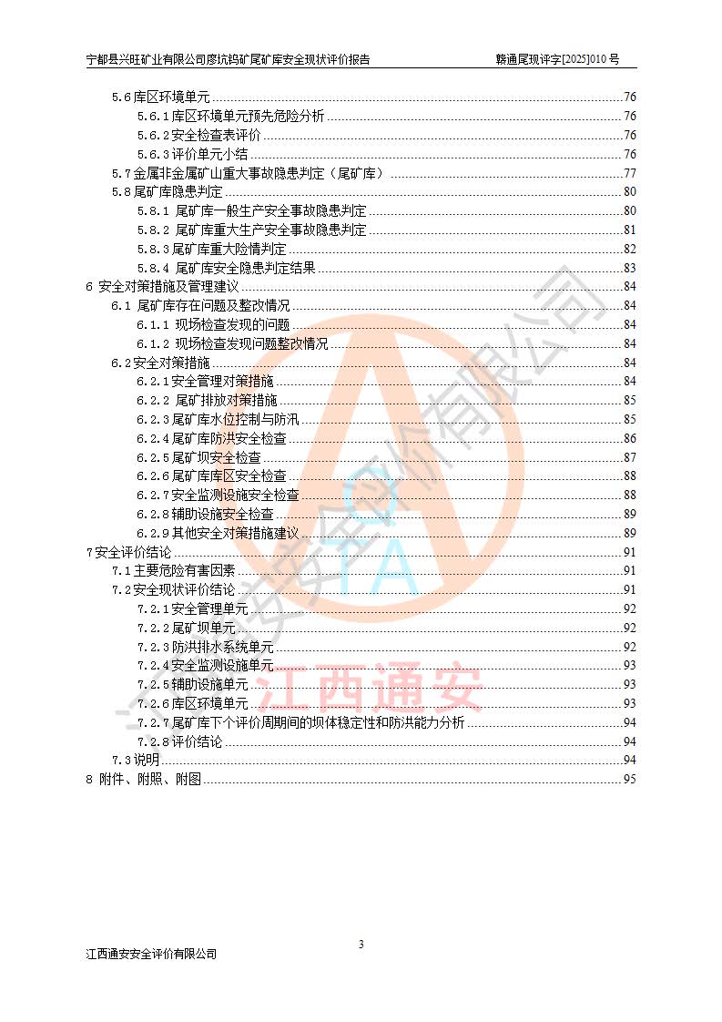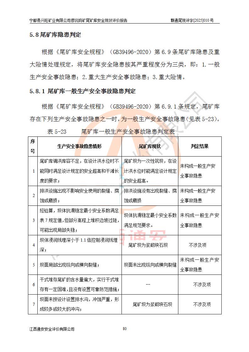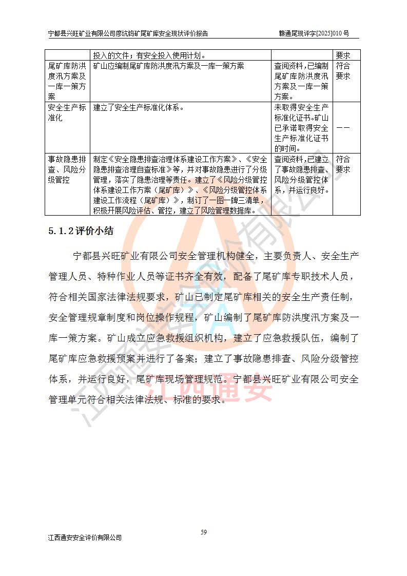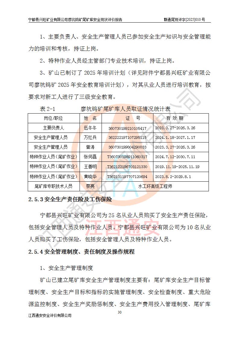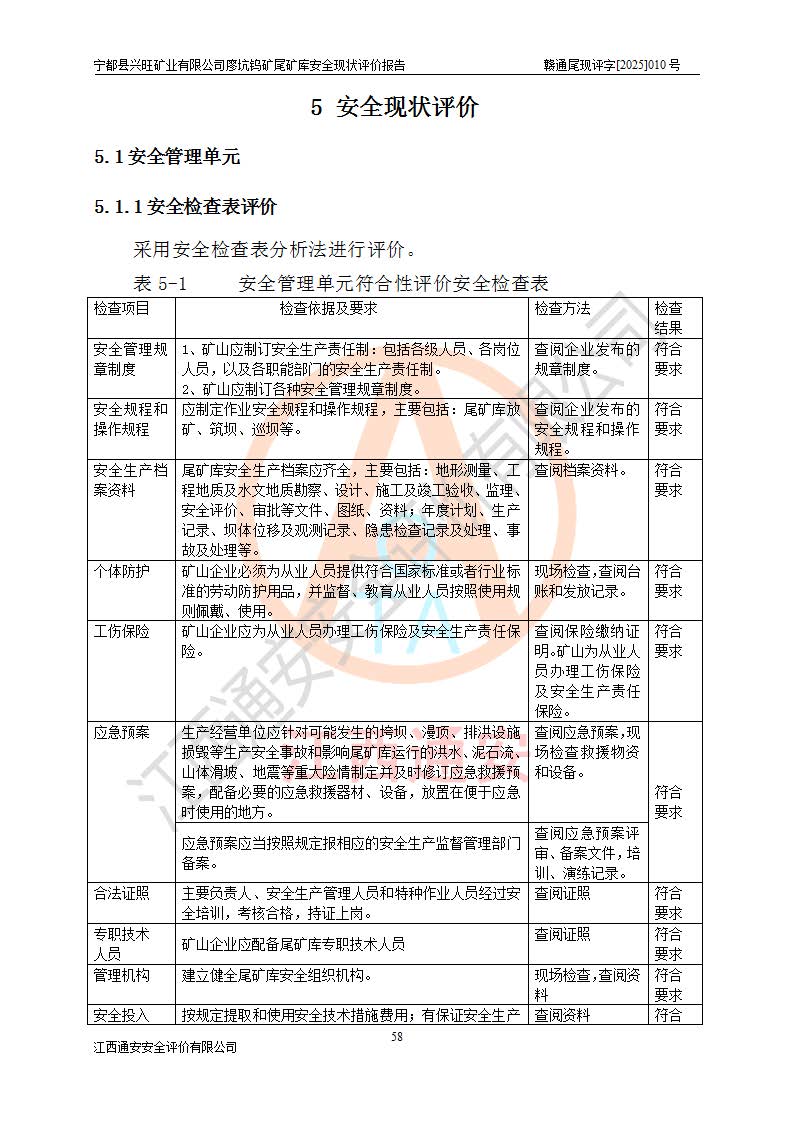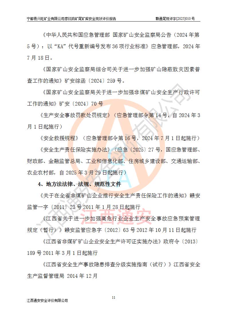 寧都縣興旺礦業(yè)有限公司廖坑鎢礦位于寧都縣縣城北西直距約15km處的安福鄉(xiāng)西甲村,地理坐標(biāo):東經(jīng)115°50′48″;北緯26°32′1″。寧都縣興旺礦業(yè)有限公司成立于2006年03月29日,統(tǒng)一社會(huì)信用代碼為91360730787253633E,企業(yè)類型為有限責(zé)任公司(自然人投資或控股),企業(yè)注冊(cè)地位于江西省贛州市寧都縣安福鄉(xiāng)西甲村,法定**人為曾德強(qiáng),注冊(cè)資本為1915萬元人民幣,所屬行業(yè)為有色金屬礦采選業(yè),經(jīng)營范圍包括鎢砂開采及廢砂石加工、銷售。 廖坑鎢礦尾礦庫位于寧都縣安福鄉(xiāng)西甲村、選礦廠東面約1.17Km的下游溝谷中,選礦廠年生產(chǎn)工作日300d,尾礦堆積干容重1.60 t/m3。尾礦庫匯水面積1.927km2,尾礦壩為漿砌塊石重力壩,壩頂高程595.0m,清基后壩底高程為571.0m,壩高24.0m,壩頂寬度2.7m,壩頂軸線長75.0m;上游壩坡1:0,下游壩坡1:1.0。尾礦從庫尾進(jìn)行排放,設(shè)計(jì)總庫容8.5×104m3,服務(wù)年限10.9年。尾礦庫總占地面積約21.0畝。為山谷型五等庫。 該尾礦庫于1982年11月由寧都縣水電施工隊(duì)建設(shè)施工,1983年11月投產(chǎn),2007年1月由江西省冶金設(shè)計(jì)院編制了《寧都縣興旺礦業(yè)有限公司廖坑鎢礦尾礦庫整改方案設(shè)計(jì)》,2008年4月2日取得江西省安全生產(chǎn)監(jiān)督管理局頒發(fā)的安全生產(chǎn)許可證,證書編號(hào)(贛)FM安許證字[2008]M1268號(hào)。2022年江西通安安全評(píng)價(jià)有限公司編制了安全現(xiàn)狀評(píng)價(jià)報(bào)告,2022年7月15日由贛州市行政審批局下發(fā)了安全生產(chǎn)許可證,證號(hào)(贛)FM安許證字[2022]B0081號(hào),(贛市行審證(3)字[2022]第274號(hào)),**期至2025年7月14日。 依照《非煤礦礦山企業(yè)安全生產(chǎn)許可證延期換證工作》的通知,根據(jù)***《安全生產(chǎn)許可證條例》、《江西省安全生產(chǎn)條例》、《非煤礦山安全生產(chǎn)許可證實(shí)施辦法》、《江西省非煤礦礦山企業(yè)安全生產(chǎn)許可證辦法》規(guī)定及非煤礦山安全評(píng)價(jià)導(dǎo)則的要求,受寧都縣興旺礦業(yè)有限公司的委托,我公司承擔(dān)廖坑鎢礦尾礦庫延期換證的安全現(xiàn)狀評(píng)價(jià)工作。 |