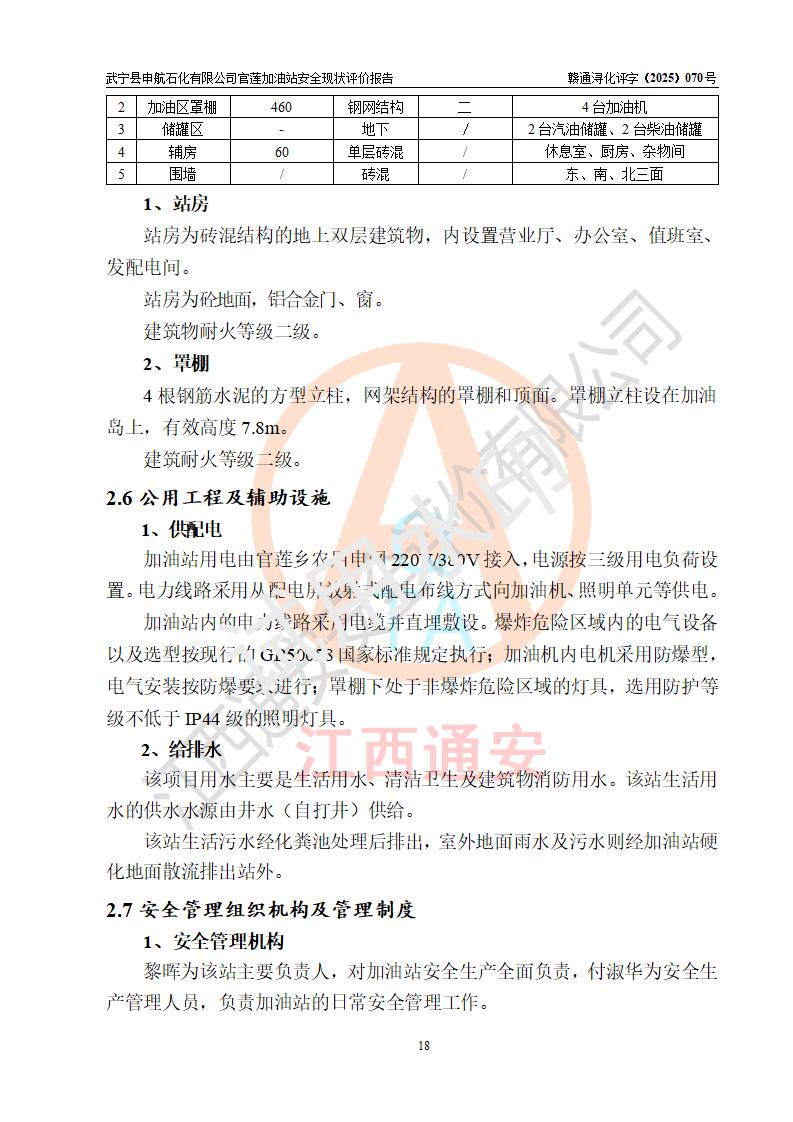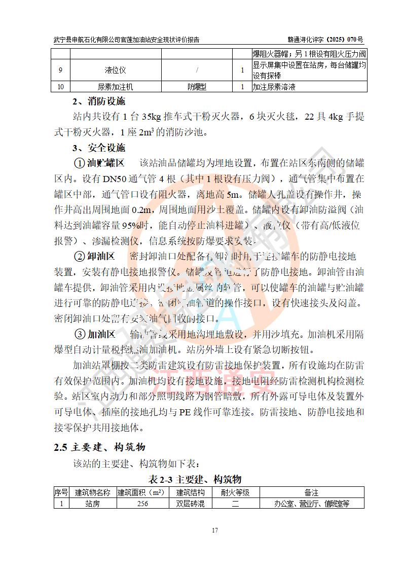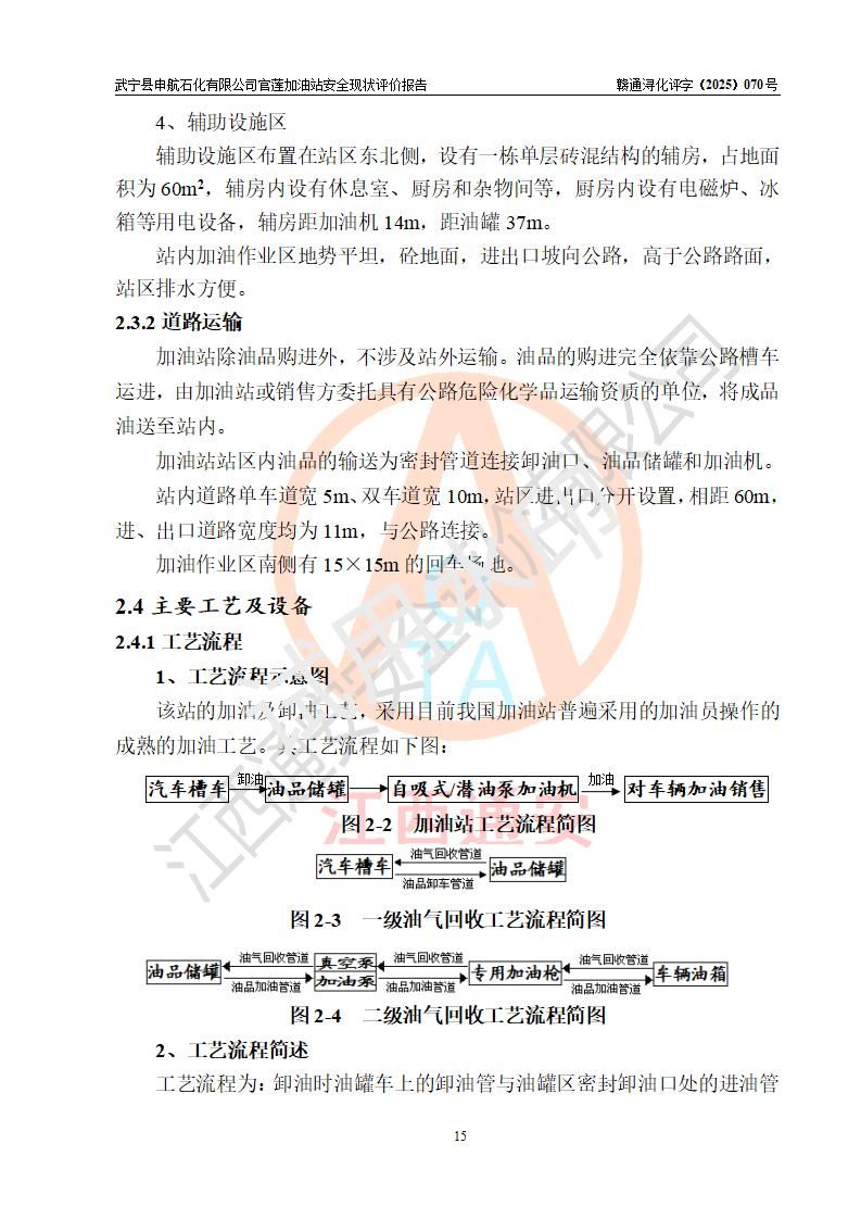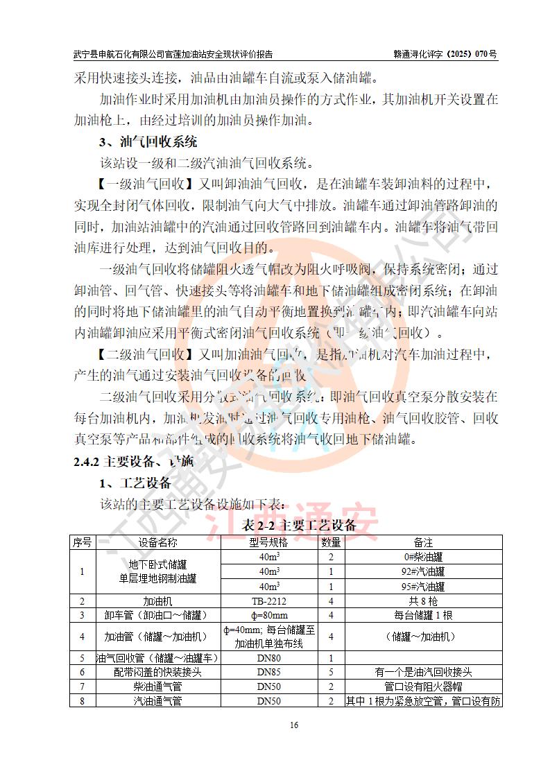 項(xiàng)目簡介 | 武寧縣申航石化有限公司官蓮加油站是一家專門從事成品油零售經(jīng)營的有限責(zé)任公司分公司,經(jīng)營場所位于江西省九江市武寧縣官蓮鄉(xiāng)集鎮(zhèn)?,F(xiàn)有從業(yè)人員9名,其中安全管理人員1人,加油站負(fù)責(zé)人黎暉。 該加油站占地面積約2280m2,站區(qū)內(nèi)設(shè)置有4臺(tái)雙槍程控燃油加油機(jī)及配套的工藝管線、設(shè)有單層儲(chǔ)罐4臺(tái)(設(shè)有防滲罐池),其中40m3的0#柴油儲(chǔ)罐2臺(tái)、40m3的92#汽油儲(chǔ)罐1臺(tái),40m3的95#汽油儲(chǔ)罐1臺(tái),油品儲(chǔ)罐總?cè)莘e為160m3(折算成汽油為120m3),按現(xiàn)行《汽車加油加氣加氫站技術(shù)標(biāo)準(zhǔn)》對(duì)加油站的等級(jí)劃分原則,屬二級(jí)加油站。 該站由九江市行政審批局換發(fā)《危險(xiǎn)化學(xué)品經(jīng)營許可證》(證號(hào):36040013202500003),**期限2022年12月19日至2025年12月18日。 | |||