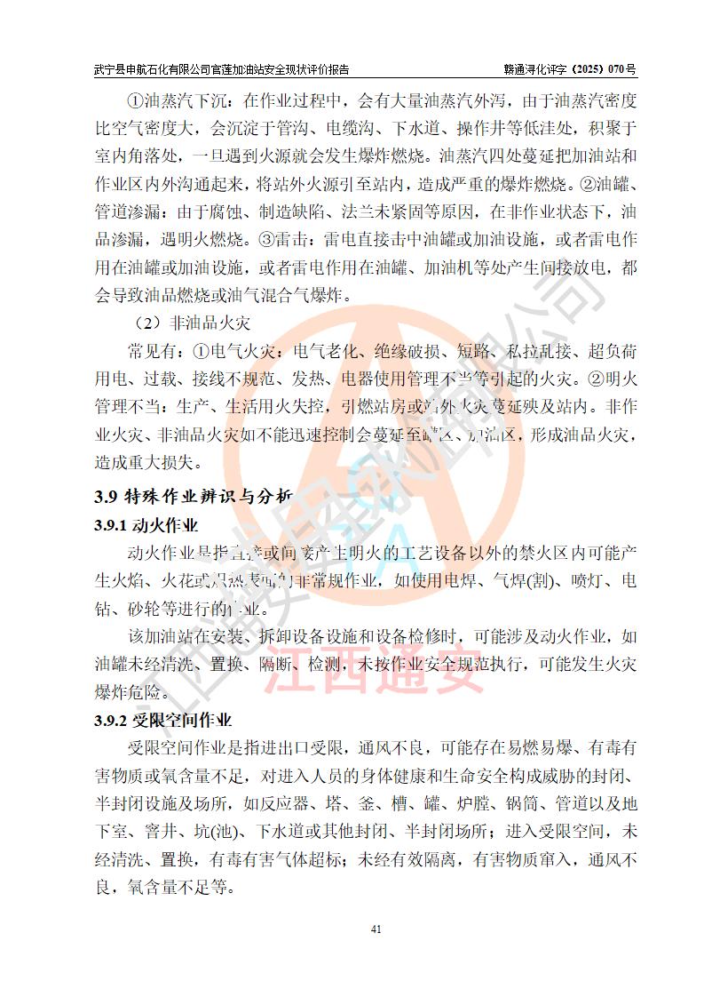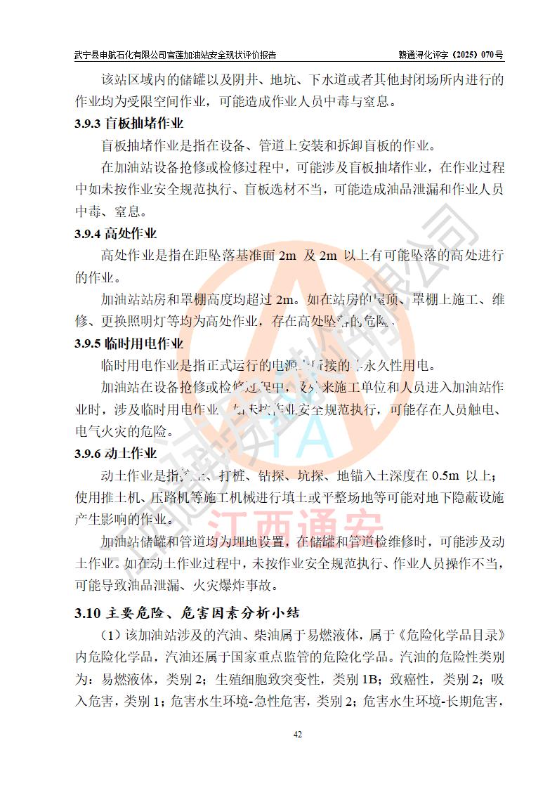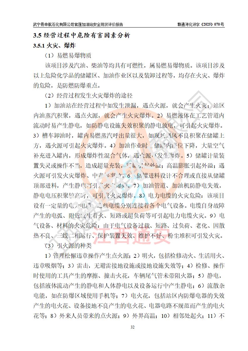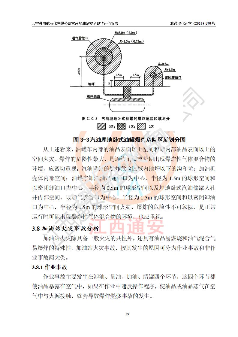 項(xiàng)目簡介 | 武寧縣申航石化有限公司官蓮加油站是一家專門從事成品油零售經(jīng)營的有限責(zé)任公司分公司,經(jīng)營場所位于江西省九江市武寧縣官蓮鄉(xiāng)集鎮(zhèn)?,F(xiàn)有從業(yè)人員9名,其中安全管理人員1人,加油站負(fù)責(zé)人黎暉。 該加油站占地面積約2280m2,站區(qū)內(nèi)設(shè)置有4臺(tái)雙槍程控燃油加油機(jī)及配套的工藝管線、設(shè)有單層儲(chǔ)罐4臺(tái)(設(shè)有防滲罐池),其中40m3的0#柴油儲(chǔ)罐2臺(tái)、40m3的92#汽油儲(chǔ)罐1臺(tái),40m3的95#汽油儲(chǔ)罐1臺(tái),油品儲(chǔ)罐總?cè)莘e為160m3(折算成汽油為120m3),按現(xiàn)行《汽車加油加氣加氫站技術(shù)標(biāo)準(zhǔn)》對(duì)加油站的等級(jí)劃分原則,屬二級(jí)加油站。 該站由九江市行政審批局換發(fā)《危險(xiǎn)化學(xué)品經(jīng)營許可證》(證號(hào):36040013202500003),**期限2022年12月19日至2025年12月18日。 | |||
