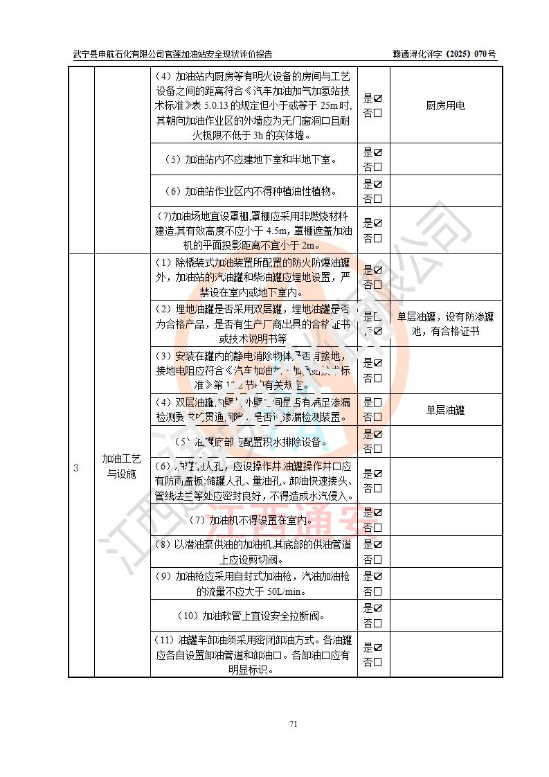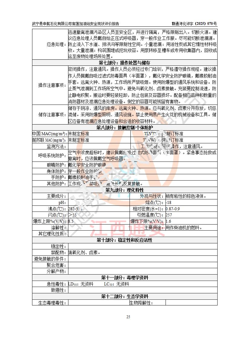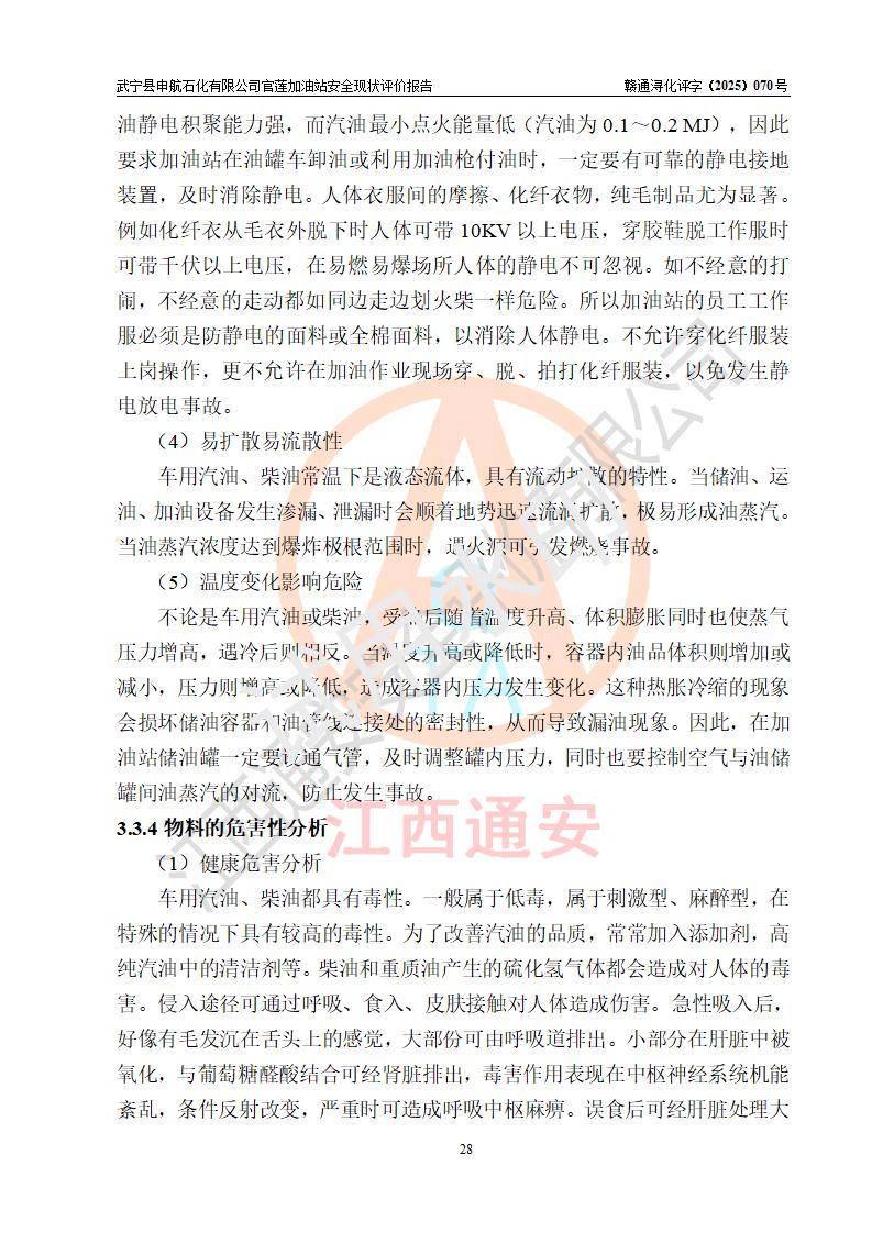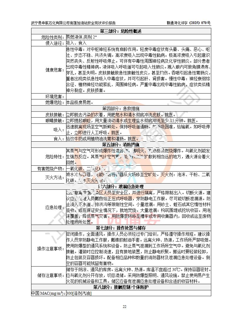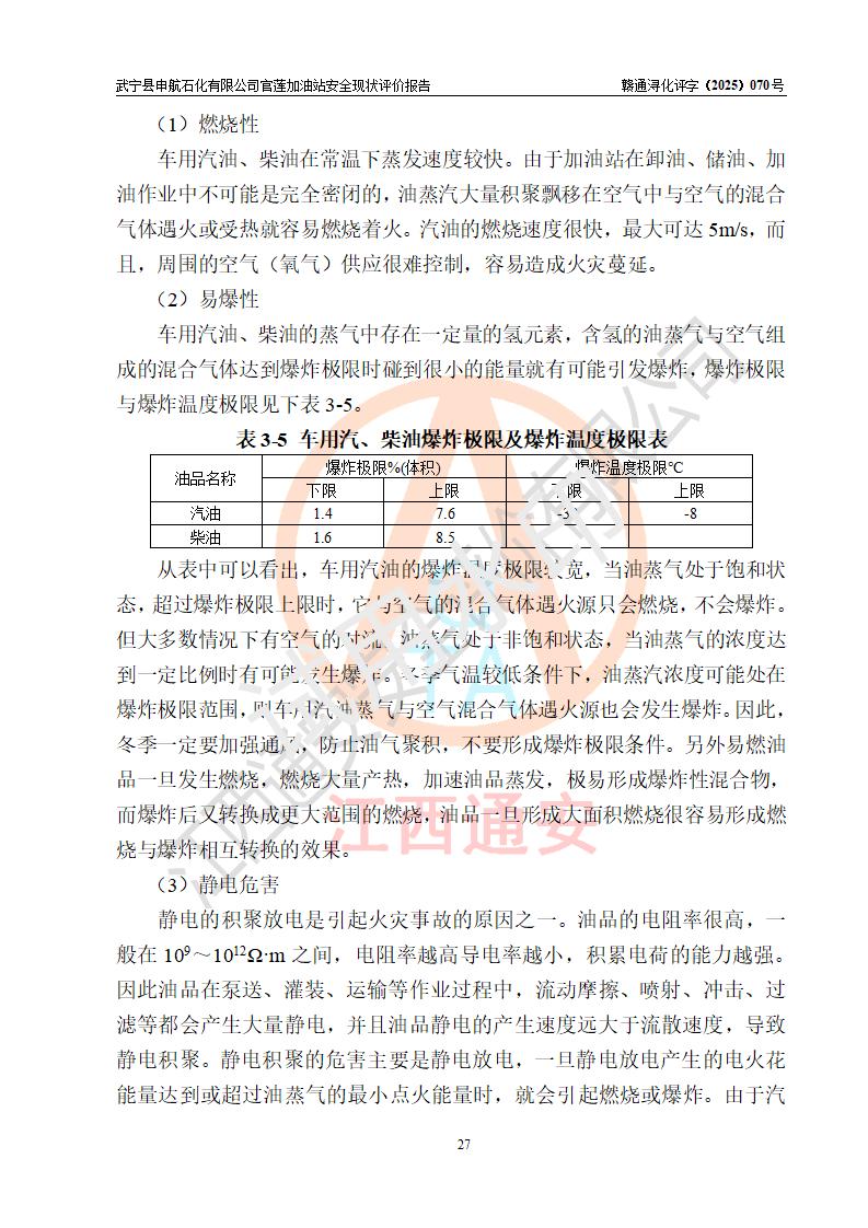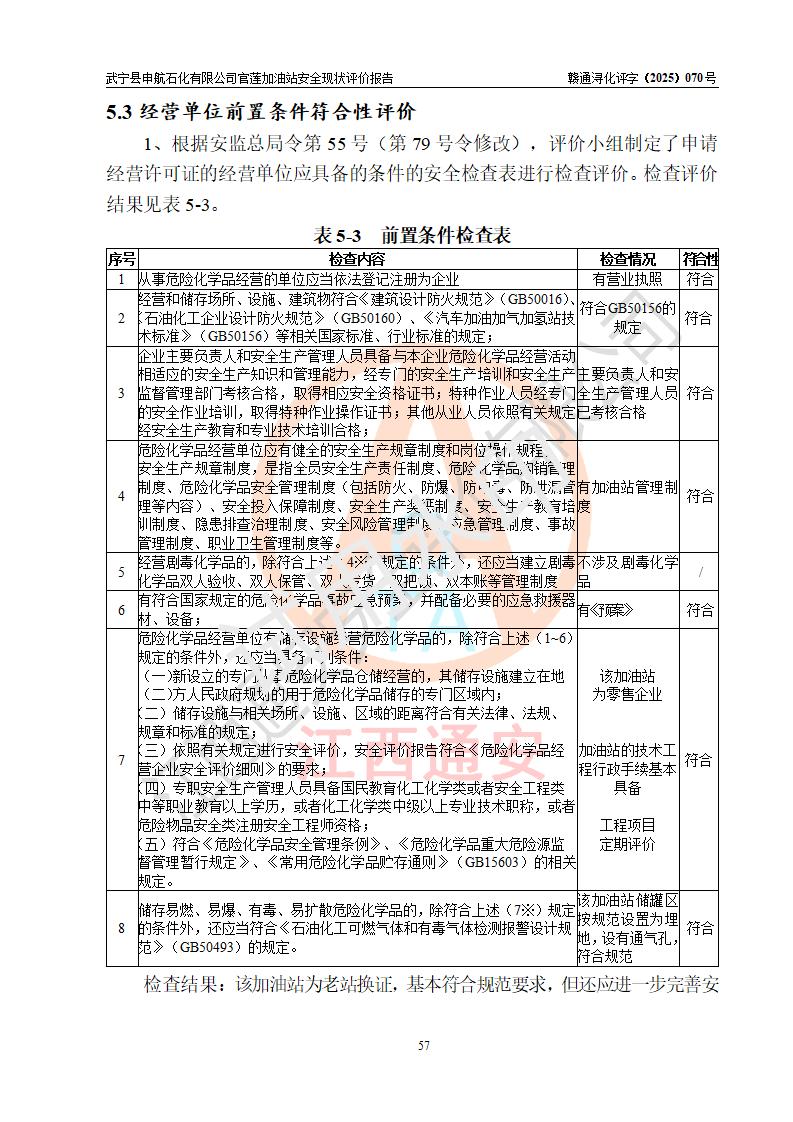 評(píng)價(jià)結(jié)論 | 武寧縣申航石化有限公司官蓮加油站涉及的安全條件、安全經(jīng)營條件、安全生產(chǎn)管理符合《危險(xiǎn)化學(xué)品經(jīng)營許可證管理辦法》、《汽車加油加氣加氫站技術(shù)標(biāo)準(zhǔn)》等**有關(guān)法規(guī)、標(biāo)準(zhǔn)、規(guī)范要求,能滿足危險(xiǎn)化學(xué)品經(jīng)營安全條件。 | |||
