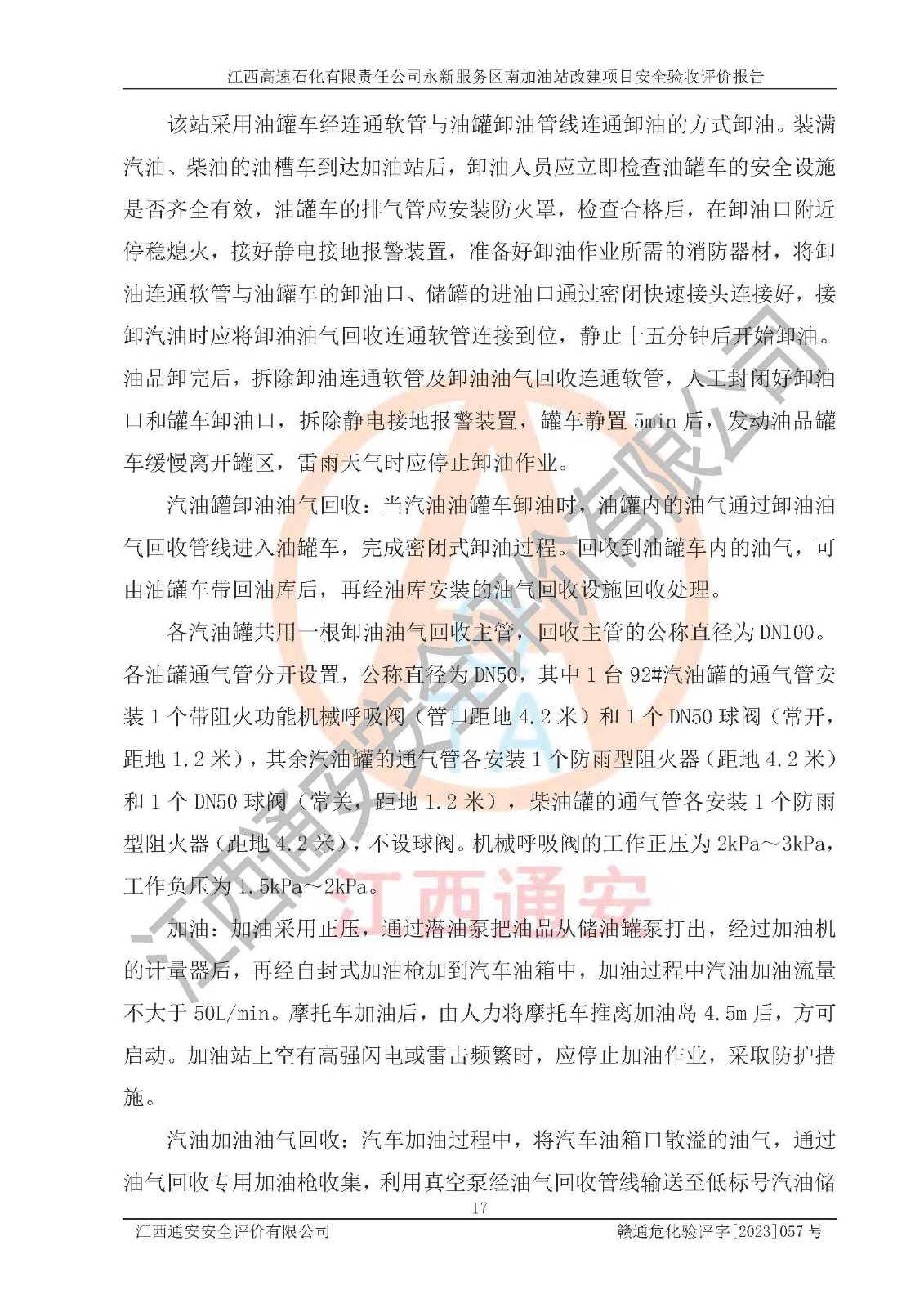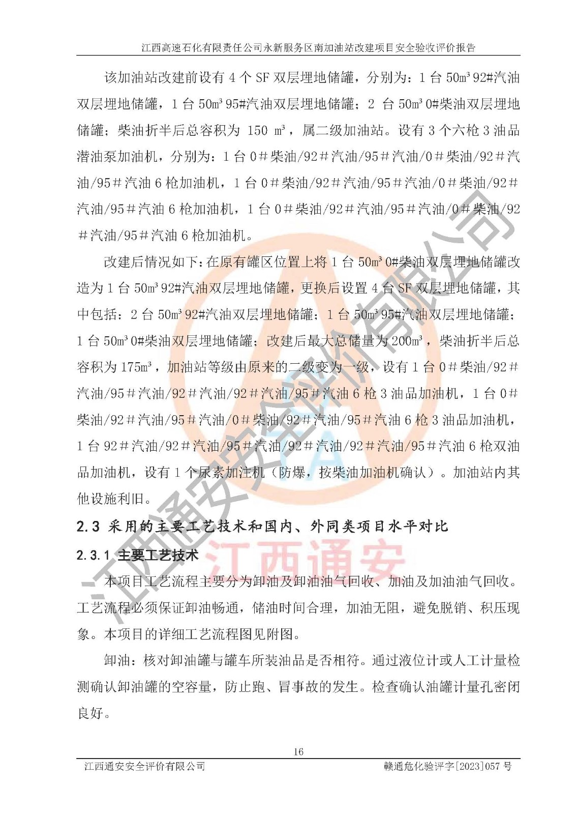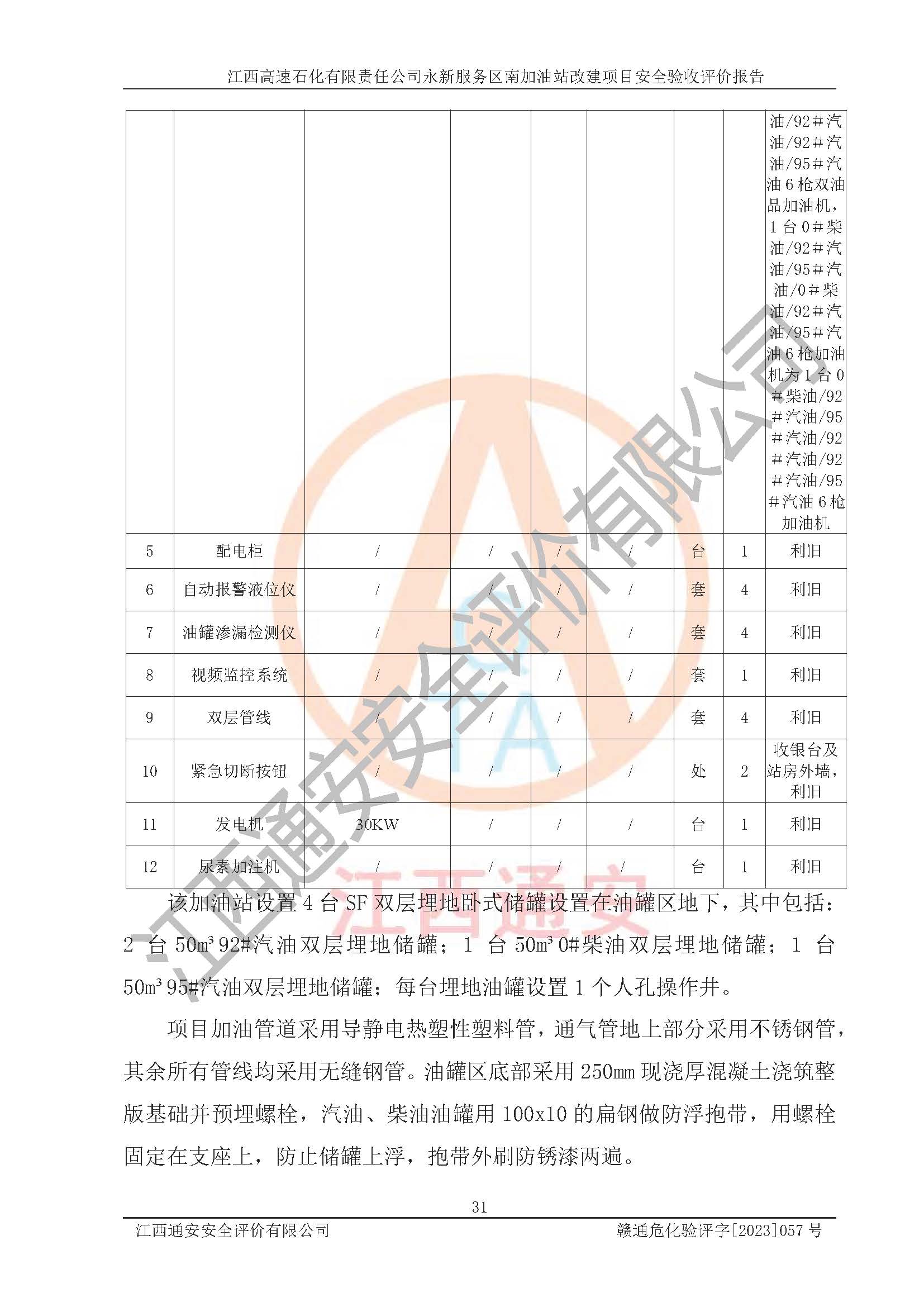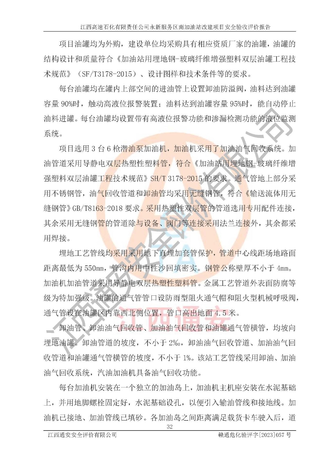 項(xiàng)目簡(jiǎn)介 | 江西高速石化有限責(zé)任公司永新服務(wù)區(qū)南加油站成立于2019年2月2日,類型:其他有限責(zé)任公司分公司;負(fù)責(zé)人:陳志斌;經(jīng)營(yíng)場(chǎng)所為江西省吉安市永新縣吉蓮高速永新服務(wù)區(qū)南。該公司營(yíng)業(yè)執(zhí)照經(jīng)營(yíng)范圍:石油、石油化工、化纖及其他化工產(chǎn)品的銷售;光伏、充電樁、日用百貨便利店經(jīng)營(yíng):汽車清洗服務(wù):廣告位出租:房屋租賃:食品、計(jì)生用品、零售卷煙、雪茄煙:委托代理收取水電費(fèi):銷售潤(rùn)滑油、燃油料。(依法須經(jīng)批準(zhǔn)的項(xiàng)目,經(jīng)相關(guān)部門(mén)批準(zhǔn)后方可開(kāi)展經(jīng)營(yíng)活動(dòng))。 該加油站于2023年12月4日經(jīng)吉安市商務(wù)局核準(zhǔn)變更換發(fā)成品油零售經(jīng)營(yíng)批準(zhǔn)證書(shū),證書(shū)編號(hào):油零售證書(shū)第吉0299號(hào)。**期由2023年12月4日至2028年12月3日。于2023年11月16日由吉安市應(yīng)急管理局變更發(fā)放危險(xiǎn)化學(xué)品經(jīng)營(yíng)許可證,證書(shū)編號(hào):贛吉?;?jīng)字【2022】360800000010。**期由2022年1月31日至2025年1月30日。 為提升優(yōu)化加油站的整體布局,更好滿足運(yùn)營(yíng)服務(wù)的需求,同時(shí)迎合吉蓮高速日益增長(zhǎng)的**,江西高速石化有限責(zé)任公司永新服務(wù)區(qū)南加油站決定在原址基礎(chǔ)上進(jìn)行改建,并于2023年3月17日獲得永新縣工業(yè)和信息化局蓋章的《江西省工業(yè)企業(yè)技術(shù)改造項(xiàng)目備案通知書(shū)》,同意該站在原址上改建。 江西高速石化有限責(zé)任公司永新服務(wù)區(qū)南加油站改建項(xiàng)目位于江西省吉安市永新縣吉蓮高速永新服務(wù)區(qū)南,加油站用地面積約2000m2。 該加油站改建前設(shè)有4個(gè)SF雙層埋地儲(chǔ)罐,分別為:1臺(tái)50m392#汽油雙層埋地儲(chǔ)罐,1臺(tái)50m395#汽油雙層埋地儲(chǔ)罐;2 臺(tái)50m30#柴油雙層埋地儲(chǔ)罐;柴油折半后總?cè)莘e為 150 m3,屬二級(jí)加油站。設(shè)有3個(gè)六槍3油品潛油泵加油機(jī),分別為:1臺(tái)0#柴油/92#汽油/95#汽油/0#柴油/92#汽油/95#汽油6槍加油機(jī),1臺(tái)0#柴油/92#汽油/95#汽油/0#柴油/92#汽油/95#汽油6槍加油機(jī),1臺(tái)0#柴油/92#汽油/95#汽油/0#柴油/92#汽油/95#汽油6槍加油機(jī)。 改建后情況如下:在原有罐區(qū)位置上將1臺(tái)50m30#柴油雙層埋地儲(chǔ)罐改造為1臺(tái)50m392#汽油雙層埋地儲(chǔ)罐,更換后設(shè)置4臺(tái)SF雙層埋地儲(chǔ)罐,其中包括:2臺(tái)50m392#汽油雙層埋地儲(chǔ)罐;1臺(tái)50m395#汽油雙層埋地儲(chǔ)罐;1臺(tái)50m30#柴油雙層埋地儲(chǔ)罐;改建后*大總儲(chǔ)量為200m3,柴油折半后總?cè)莘e為175m3,加油站等級(jí)由原來(lái)的二級(jí)變?yōu)?/span>一級(jí),設(shè)有1臺(tái)0#柴油/92#汽油/95#汽油/92#汽油/92#汽油/95#汽油6槍3油品加油機(jī),1臺(tái)0#柴油/92#汽油/95#汽油/0#柴油/92#汽油/95#汽油6槍3油品加油機(jī),1臺(tái)92#汽油/92#汽油/95#汽油/92#汽油/92#汽油/95#汽油6槍雙油品加油機(jī),設(shè)有1個(gè)尿素加注機(jī)(防爆,按柴油加油機(jī)確認(rèn)),加油站內(nèi)其他設(shè)施利舊。 江西高速石化有限責(zé)任公司永新服務(wù)區(qū)南加油站2022年12月委托江西省贛華安全生產(chǎn)科學(xué)技術(shù)咨詢服務(wù)中心編制《江西高速石化有限責(zé)任公司永新服務(wù)區(qū)南加油站改建項(xiàng)目安全預(yù)評(píng)價(jià)報(bào)告》,并于2023年4月12日取得《危險(xiǎn)化學(xué)品建設(shè)項(xiàng)目安全條件備案告知意見(jiàn)書(shū)》(吉市?;?xiàng)目安條審字[2023]2號(hào))。 江西高速石化有限責(zé)任公司永新服務(wù)區(qū)南加油站2023年4月委托哈爾濱天源石化工程設(shè)計(jì)有限責(zé)任公司編制《江西高速石化有限責(zé)任公司永新服務(wù)區(qū)南加油站改建項(xiàng)目安全設(shè)施設(shè)計(jì)》,并于2023年5月19日取得《危險(xiǎn)化學(xué)品建設(shè)項(xiàng)目安全設(shè)施設(shè)計(jì)審查意見(jiàn)書(shū)》(吉市危化項(xiàng)目安設(shè)審字〔2023〕10號(hào))。