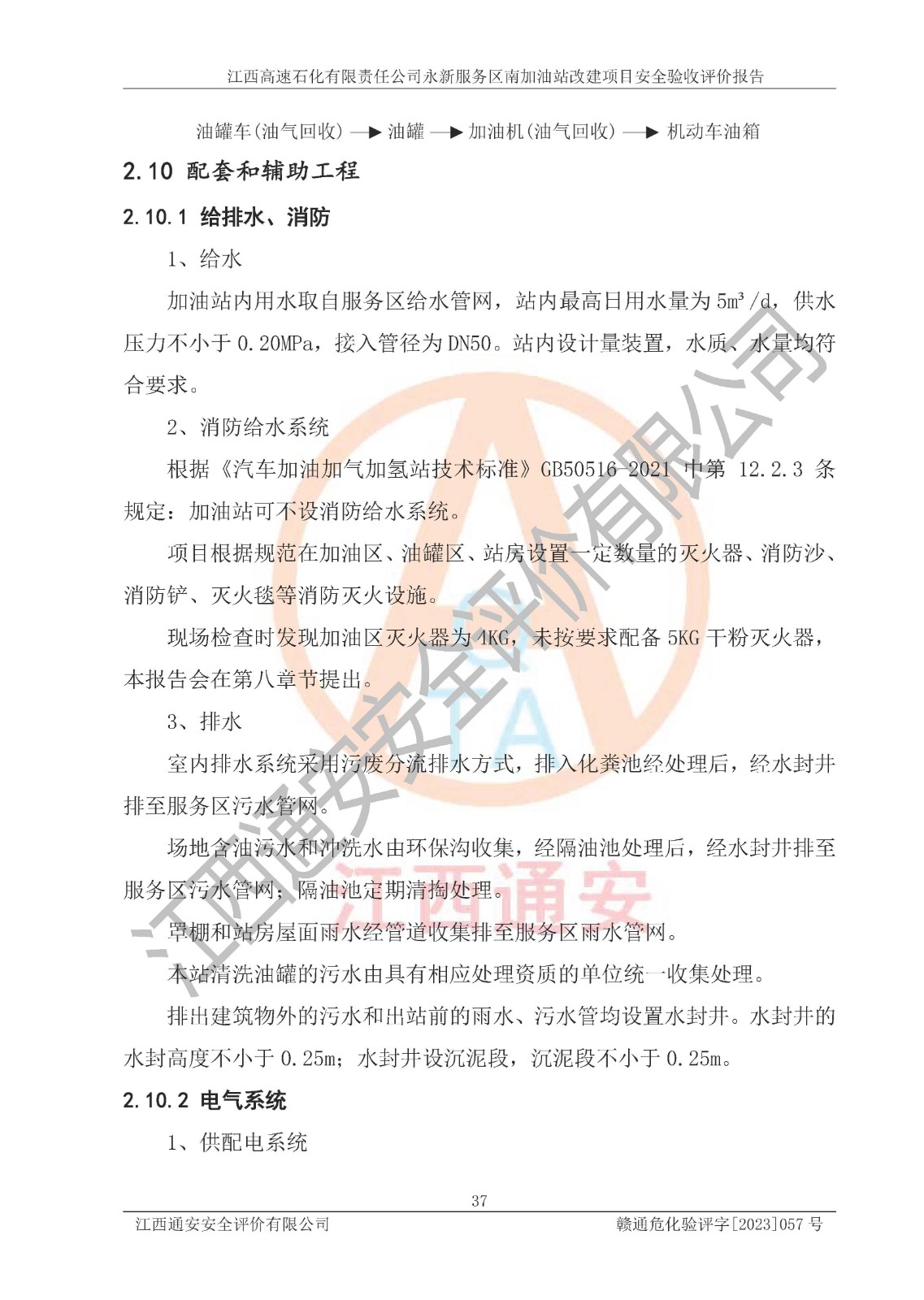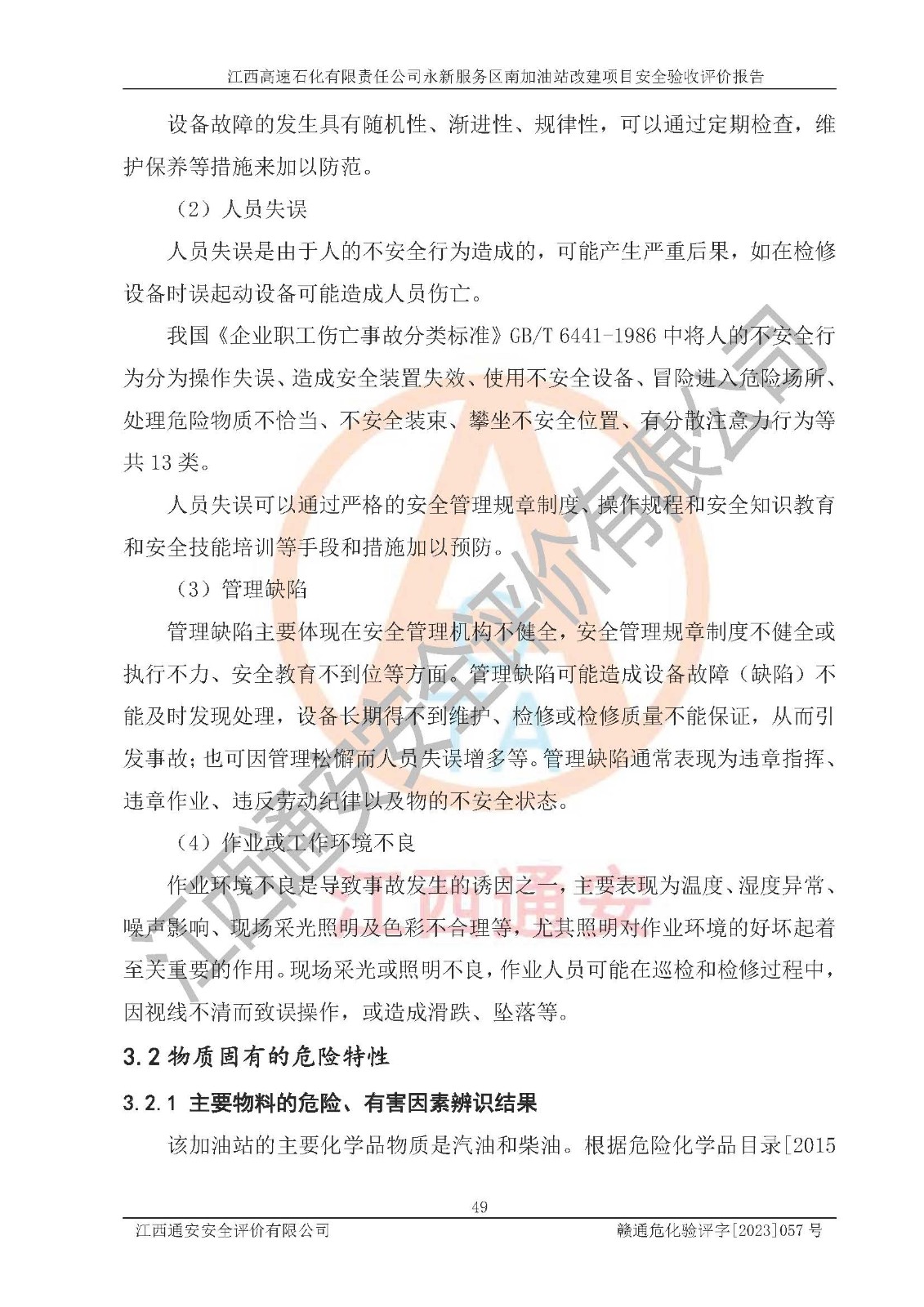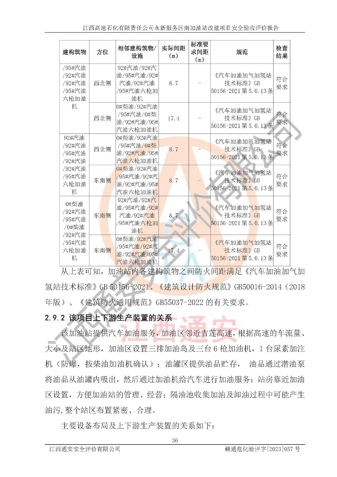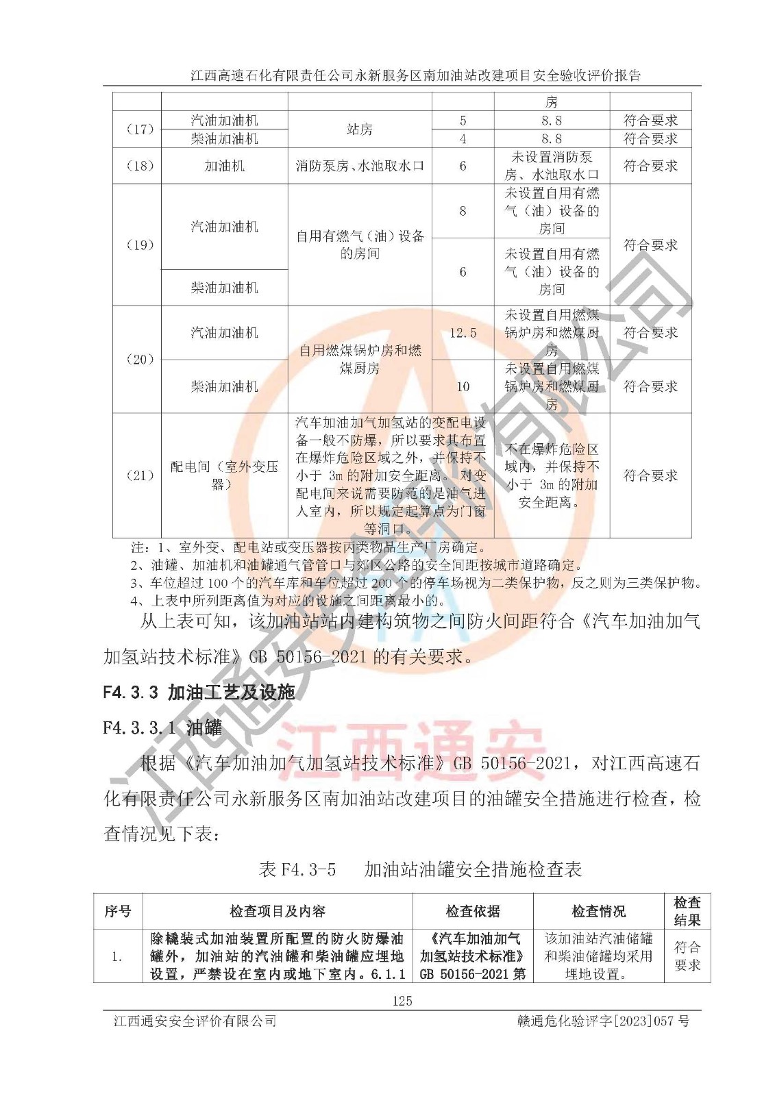 項(xiàng)目簡(jiǎn)介 | 江西高速石化有限責(zé)任公司永新服務(wù)區(qū)南加油站成立于2019年2月2日,類型:其他有限責(zé)任公司分公司;負(fù)責(zé)人:陳志斌;經(jīng)營(yíng)場(chǎng)所為江西省吉安市永新縣吉蓮高速永新服務(wù)區(qū)南。該公司營(yíng)業(yè)執(zhí)照經(jīng)營(yíng)范圍:石油、石油化工、化纖及其他化工產(chǎn)品的銷售;光伏、充電樁、日用百貨便利店經(jīng)營(yíng):汽車清洗服務(wù):廣告位出租:房屋租賃:食品、計(jì)生用品、零售卷煙、雪茄煙:委托代理收取水電費(fèi):銷售潤(rùn)滑油、燃油料。(依法須經(jīng)批準(zhǔn)的項(xiàng)目,經(jīng)相關(guān)部門(mén)批準(zhǔn)后方可開(kāi)展經(jīng)營(yíng)活動(dòng))。 該加油站于2023年12月4日經(jīng)吉安市商務(wù)局核準(zhǔn)變更換發(fā)成品油零售經(jīng)營(yíng)批準(zhǔn)證書(shū),證書(shū)編號(hào):油零售證書(shū)第吉0299號(hào)。**期由2023年12月4日至2028年12月3日。于2023年11月16日由吉安市應(yīng)急管理局變更發(fā)放危險(xiǎn)化學(xué)品經(jīng)營(yíng)許可證,證書(shū)編號(hào):贛吉?;?jīng)字【2022】360800000010。**期由2022年1月31日至2025年1月30日。 為提升優(yōu)化加油站的整體布局,更好滿足運(yùn)營(yíng)服務(wù)的需求,同時(shí)迎合吉蓮高速日益增長(zhǎng)的**,江西高速石化有限責(zé)任公司永新服務(wù)區(qū)南加油站決定在原址基礎(chǔ)上進(jìn)行改建,并于2023年3月17日獲得永新縣工業(yè)和信息化局蓋章的《江西省工業(yè)企業(yè)技術(shù)改造項(xiàng)目備案通知書(shū)》,同意該站在原址上改建。 江西高速石化有限責(zé)任公司永新服務(wù)區(qū)南加油站改建項(xiàng)目位于江西省吉安市永新縣吉蓮高速永新服務(wù)區(qū)南,加油站用地面積約2000m2。 該加油站改建前設(shè)有4個(gè)SF雙層埋地儲(chǔ)罐,分別為:1臺(tái)50m392#汽油雙層埋地儲(chǔ)罐,1臺(tái)50m395#汽油雙層埋地儲(chǔ)罐;2 臺(tái)50m30#柴油雙層埋地儲(chǔ)罐;柴油折半后總?cè)莘e為 150 m3,屬二級(jí)加油站。設(shè)有3個(gè)六槍3油品潛油泵加油機(jī),分別為:1臺(tái)0#柴油/92#汽油/95#汽油/0#柴油/92#汽油/95#汽油6槍加油機(jī),1臺(tái)0#柴油/92#汽油/95#汽油/0#柴油/92#汽油/95#汽油6槍加油機(jī),1臺(tái)0#柴油/92#汽油/95#汽油/0#柴油/92#汽油/95#汽油6槍加油機(jī)。 改建后情況如下:在原有罐區(qū)位置上將1臺(tái)50m30#柴油雙層埋地儲(chǔ)罐改造為1臺(tái)50m392#汽油雙層埋地儲(chǔ)罐,更換后設(shè)置4臺(tái)SF雙層埋地儲(chǔ)罐,其中包括:2臺(tái)50m392#汽油雙層埋地儲(chǔ)罐;1臺(tái)50m395#汽油雙層埋地儲(chǔ)罐;1臺(tái)50m30#柴油雙層埋地儲(chǔ)罐;改建后*大總儲(chǔ)量為200m3,柴油折半后總?cè)莘e為175m3,加油站等級(jí)由原來(lái)的二級(jí)變?yōu)?/span>一級(jí),設(shè)有1臺(tái)0#柴油/92#汽油/95#汽油/92#汽油/92#汽油/95#汽油6槍3油品加油機(jī),1臺(tái)0#柴油/92#汽油/95#汽油/0#柴油/92#汽油/95#汽油6槍3油品加油機(jī),1臺(tái)92#汽油/92#汽油/95#汽油/92#汽油/92#汽油/95#汽油6槍雙油品加油機(jī),設(shè)有1個(gè)尿素加注機(jī)(防爆,按柴油加油機(jī)確認(rèn)),加油站內(nèi)其他設(shè)施利舊。 江西高速石化有限責(zé)任公司永新服務(wù)區(qū)南加油站2022年12月委托江西省贛華安全生產(chǎn)科學(xué)技術(shù)咨詢服務(wù)中心編制《江西高速石化有限責(zé)任公司永新服務(wù)區(qū)南加油站改建項(xiàng)目安全預(yù)評(píng)價(jià)報(bào)告》,并于2023年4月12日取得《危險(xiǎn)化學(xué)品建設(shè)項(xiàng)目安全條件備案告知意見(jiàn)書(shū)》(吉市?;?xiàng)目安條審字[2023]2號(hào))。 江西高速石化有限責(zé)任公司永新服務(wù)區(qū)南加油站2023年4月委托哈爾濱天源石化工程設(shè)計(jì)有限責(zé)任公司編制《江西高速石化有限責(zé)任公司永新服務(wù)區(qū)南加油站改建項(xiàng)目安全設(shè)施設(shè)計(jì)》,并于2023年5月19日取得《危險(xiǎn)化學(xué)品建設(shè)項(xiàng)目安全設(shè)施設(shè)計(jì)審查意見(jiàn)書(shū)》(吉市危化項(xiàng)目安設(shè)審字〔2023〕10號(hào))。