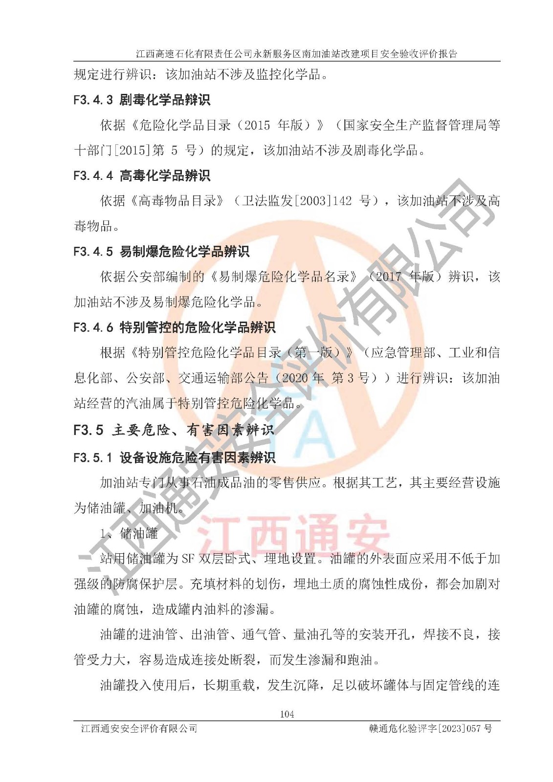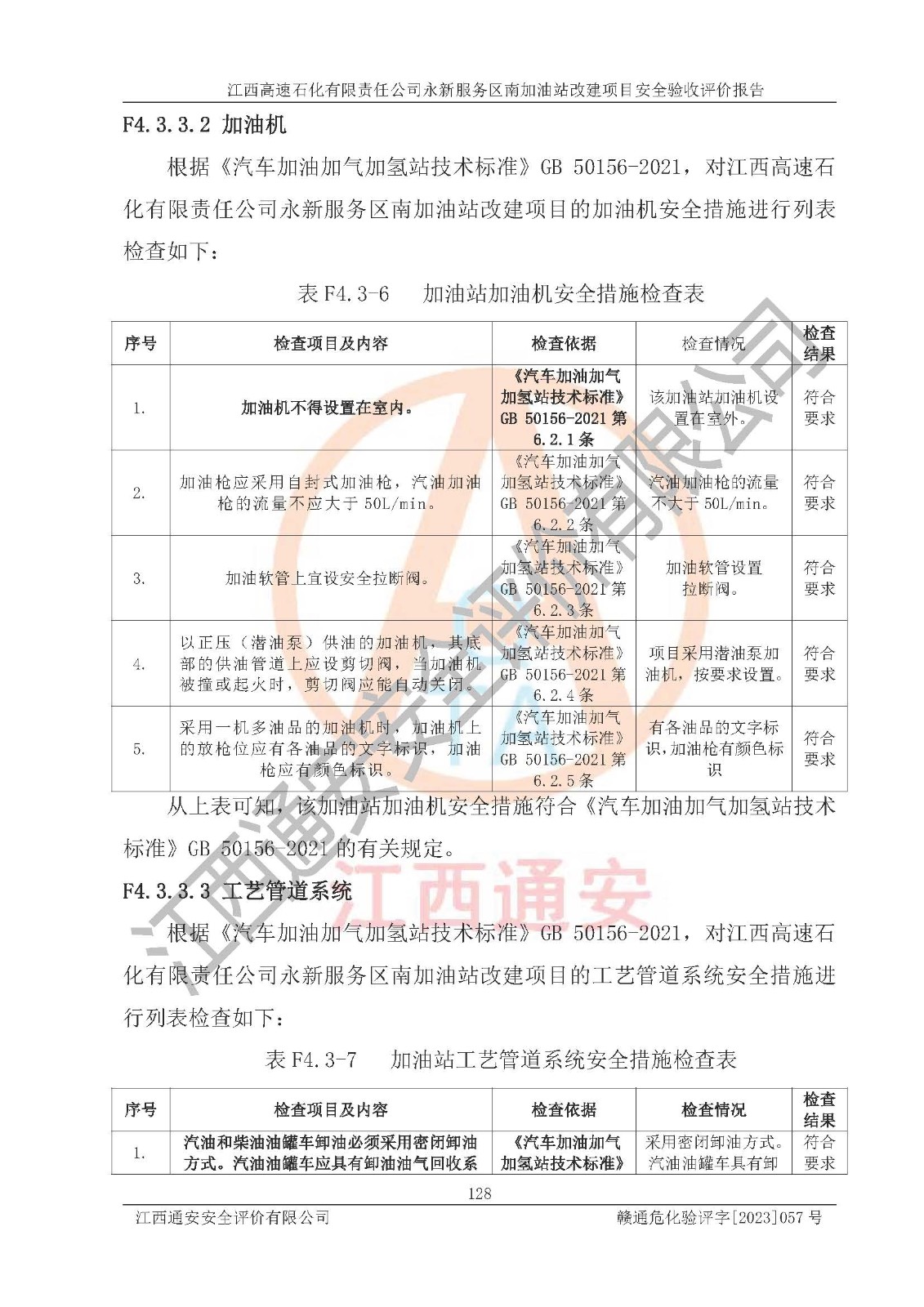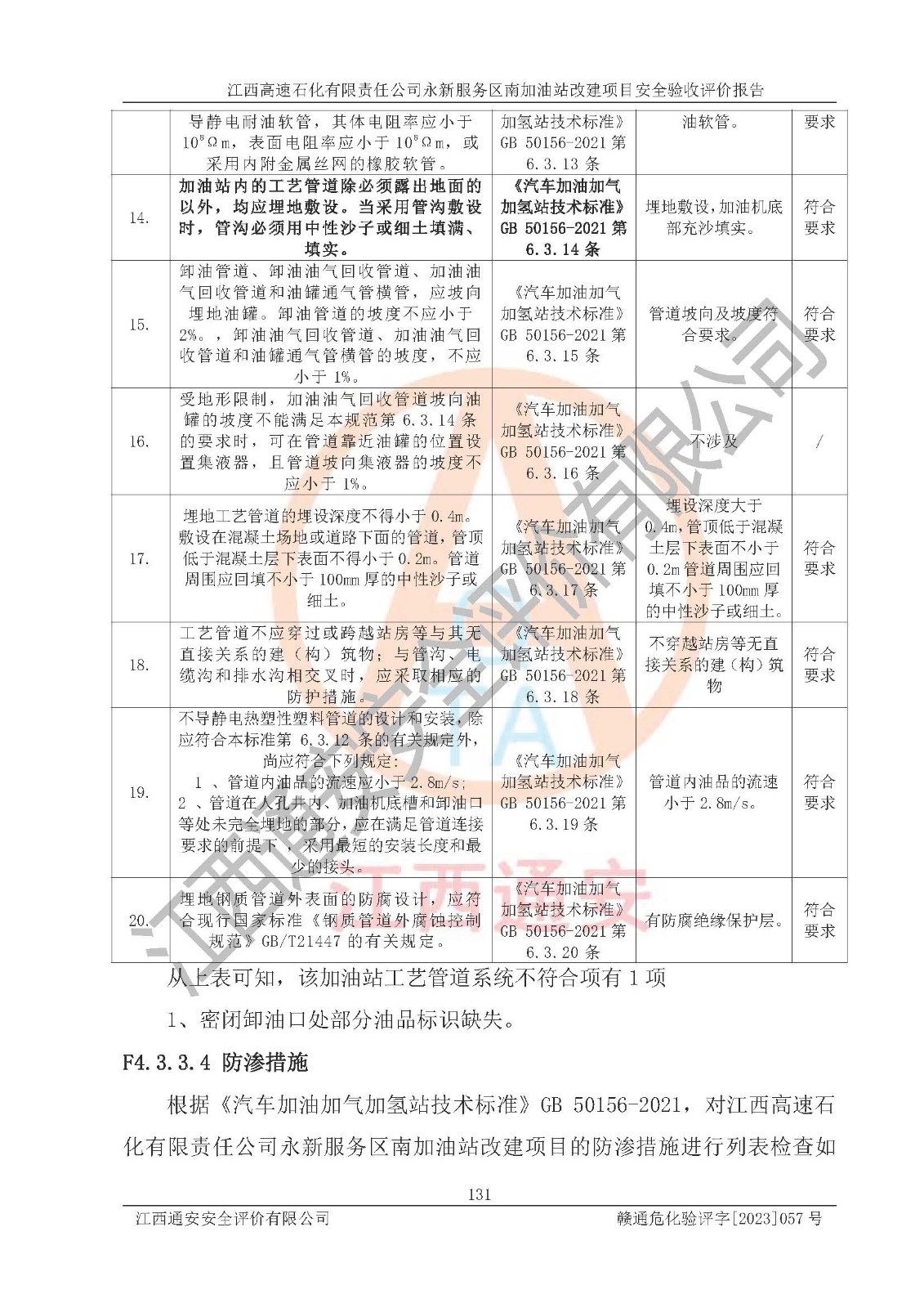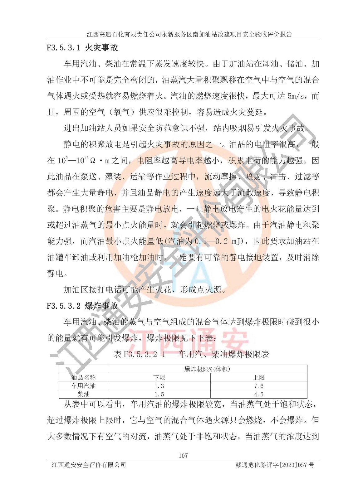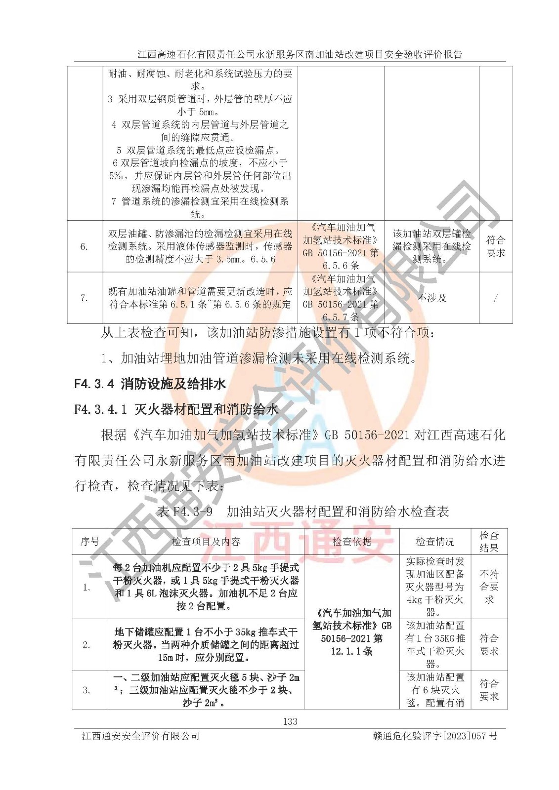 項(xiàng)目簡(jiǎn)介 | 江西高速石化有限責(zé)任公司永新服務(wù)區(qū)南加油站成立于2019年2月2日,類型:其他有限責(zé)任公司分公司;負(fù)責(zé)人:陳志斌;經(jīng)營(yíng)場(chǎng)所為江西省吉安市永新縣吉蓮高速永新服務(wù)區(qū)南。該公司營(yíng)業(yè)執(zhí)照經(jīng)營(yíng)范圍:石油、石油化工、化纖及其他化工產(chǎn)品的銷售;光伏、充電樁、日用百貨便利店經(jīng)營(yíng):汽車清洗服務(wù):廣告位出租:房屋租賃:食品、計(jì)生用品、零售卷煙、雪茄煙:委托代理收取水電費(fèi):銷售潤(rùn)滑油、燃油料。(依法須經(jīng)批準(zhǔn)的項(xiàng)目,經(jīng)相關(guān)部門(mén)批準(zhǔn)后方可開(kāi)展經(jīng)營(yíng)活動(dòng))。 該加油站于2023年12月4日經(jīng)吉安市商務(wù)局核準(zhǔn)變更換發(fā)成品油零售經(jīng)營(yíng)批準(zhǔn)證書(shū),證書(shū)編號(hào):油零售證書(shū)第吉0299號(hào)。**期由2023年12月4日至2028年12月3日。于2023年11月16日由吉安市應(yīng)急管理局變更發(fā)放危險(xiǎn)化學(xué)品經(jīng)營(yíng)許可證,證書(shū)編號(hào):贛吉?;?jīng)字【2022】360800000010。**期由2022年1月31日至2025年1月30日。 為提升優(yōu)化加油站的整體布局,更好滿足運(yùn)營(yíng)服務(wù)的需求,同時(shí)迎合吉蓮高速日益增長(zhǎng)的**,江西高速石化有限責(zé)任公司永新服務(wù)區(qū)南加油站決定在原址基礎(chǔ)上進(jìn)行改建,并于2023年3月17日獲得永新縣工業(yè)和信息化局蓋章的《江西省工業(yè)企業(yè)技術(shù)改造項(xiàng)目備案通知書(shū)》,同意該站在原址上改建。 江西高速石化有限責(zé)任公司永新服務(wù)區(qū)南加油站改建項(xiàng)目位于江西省吉安市永新縣吉蓮高速永新服務(wù)區(qū)南,加油站用地面積約2000m2。 該加油站改建前設(shè)有4個(gè)SF雙層埋地儲(chǔ)罐,分別為:1臺(tái)50m392#汽油雙層埋地儲(chǔ)罐,1臺(tái)50m395#汽油雙層埋地儲(chǔ)罐;2 臺(tái)50m30#柴油雙層埋地儲(chǔ)罐;柴油折半后總?cè)莘e為 150 m3,屬二級(jí)加油站。設(shè)有3個(gè)六槍3油品潛油泵加油機(jī),分別為:1臺(tái)0#柴油/92#汽油/95#汽油/0#柴油/92#汽油/95#汽油6槍加油機(jī),1臺(tái)0#柴油/92#汽油/95#汽油/0#柴油/92#汽油/95#汽油6槍加油機(jī),1臺(tái)0#柴油/92#汽油/95#汽油/0#柴油/92#汽油/95#汽油6槍加油機(jī)。 改建后情況如下:在原有罐區(qū)位置上將1臺(tái)50m30#柴油雙層埋地儲(chǔ)罐改造為1臺(tái)50m392#汽油雙層埋地儲(chǔ)罐,更換后設(shè)置4臺(tái)SF雙層埋地儲(chǔ)罐,其中包括:2臺(tái)50m392#汽油雙層埋地儲(chǔ)罐;1臺(tái)50m395#汽油雙層埋地儲(chǔ)罐;1臺(tái)50m30#柴油雙層埋地儲(chǔ)罐;改建后*大總儲(chǔ)量為200m3,柴油折半后總?cè)莘e為175m3,加油站等級(jí)由原來(lái)的二級(jí)變?yōu)?/span>一級(jí),設(shè)有1臺(tái)0#柴油/92#汽油/95#汽油/92#汽油/92#汽油/95#汽油6槍3油品加油機(jī),1臺(tái)0#柴油/92#汽油/95#汽油/0#柴油/92#汽油/95#汽油6槍3油品加油機(jī),1臺(tái)92#汽油/92#汽油/95#汽油/92#汽油/92#汽油/95#汽油6槍雙油品加油機(jī),設(shè)有1個(gè)尿素加注機(jī)(防爆,按柴油加油機(jī)確認(rèn)),加油站內(nèi)其他設(shè)施利舊。 江西高速石化有限責(zé)任公司永新服務(wù)區(qū)南加油站2022年12月委托江西省贛華安全生產(chǎn)科學(xué)技術(shù)咨詢服務(wù)中心編制《江西高速石化有限責(zé)任公司永新服務(wù)區(qū)南加油站改建項(xiàng)目安全預(yù)評(píng)價(jià)報(bào)告》,并于2023年4月12日取得《危險(xiǎn)化學(xué)品建設(shè)項(xiàng)目安全條件備案告知意見(jiàn)書(shū)》(吉市?;?xiàng)目安條審字[2023]2號(hào))。 江西高速石化有限責(zé)任公司永新服務(wù)區(qū)南加油站2023年4月委托哈爾濱天源石化工程設(shè)計(jì)有限責(zé)任公司編制《江西高速石化有限責(zé)任公司永新服務(wù)區(qū)南加油站改建項(xiàng)目安全設(shè)施設(shè)計(jì)》,并于2023年5月19日取得《危險(xiǎn)化學(xué)品建設(shè)項(xiàng)目安全設(shè)施設(shè)計(jì)審查意見(jiàn)書(shū)》(吉市危化項(xiàng)目安設(shè)審字〔2023〕10號(hào))。