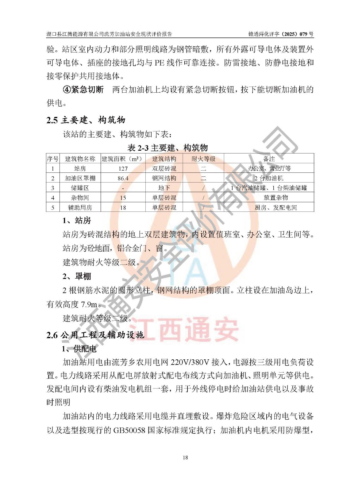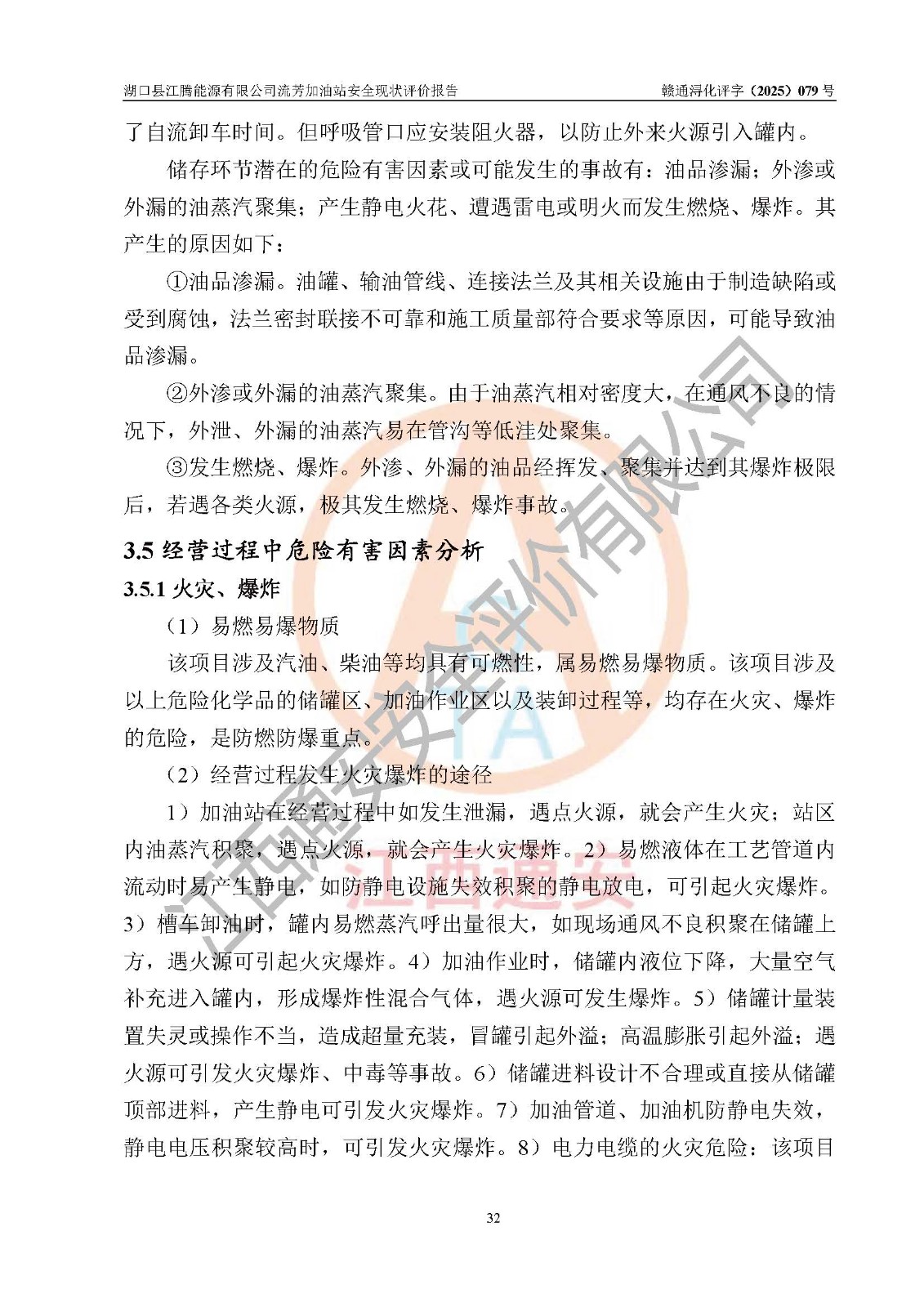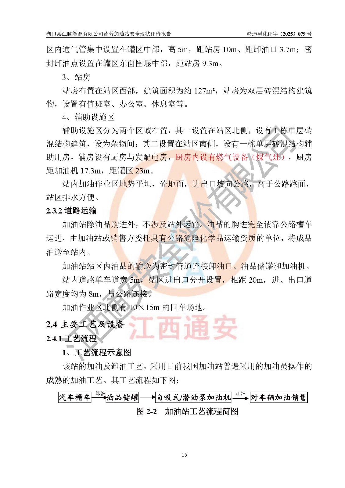 項(xiàng)目簡(jiǎn)介 | 湖口縣江騰能源有限公司流芳加油站是一家專(zhuān)門(mén)從事成品油零售經(jīng)營(yíng)的有限責(zé)任公司分公司(自然人投資或控股),經(jīng)營(yíng)場(chǎng)所位于江西省九江市湖口縣流芳鄉(xiāng)流芳村少家灣上嶺東北側(cè)。現(xiàn)有從業(yè)人員3名,其中安全管理人員1人,加油站負(fù)責(zé)人徐慶生。 該加油站占地面積約618.47m2,站區(qū)內(nèi)設(shè)置有1臺(tái)雙槍和1臺(tái)四槍程控燃油加油機(jī)及配套的工藝管線、設(shè)有SF雙層儲(chǔ)罐2臺(tái),其中30m3的0#柴油儲(chǔ)罐1臺(tái)、30m3的92#汽油儲(chǔ)罐1臺(tái),油品儲(chǔ)罐總?cè)莘e為60m3(折算成汽油為45m3),按現(xiàn)行《汽車(chē)加油加氣加氫站技術(shù)標(biāo)準(zhǔn)》對(duì)加油站的等級(jí)劃分原則,屬三級(jí)加油站。 該站由九江市行政審批局換發(fā)《危險(xiǎn)化學(xué)品經(jīng)營(yíng)許可證》(證號(hào):36040013202500148),**期限2022年12月24日至2025年12月23日。 | |||