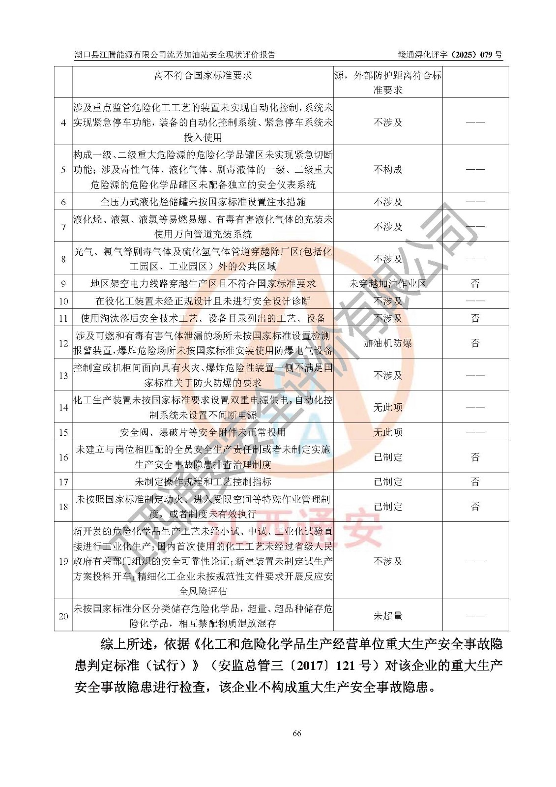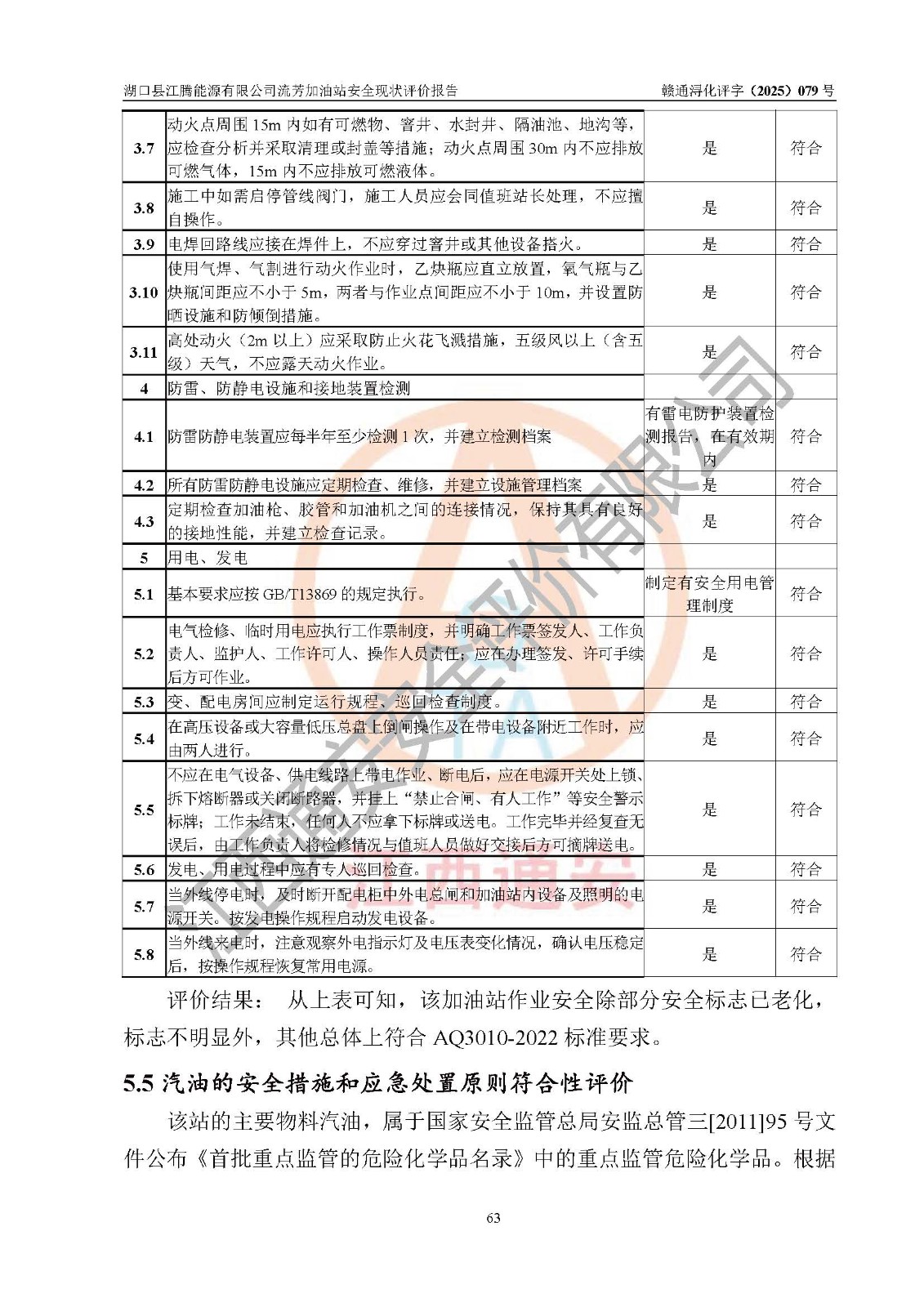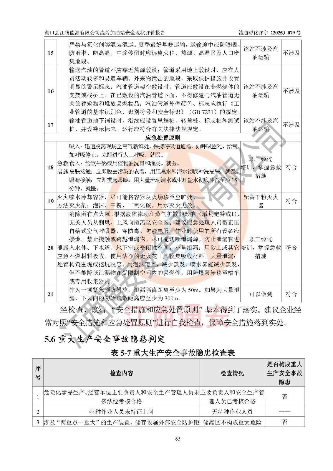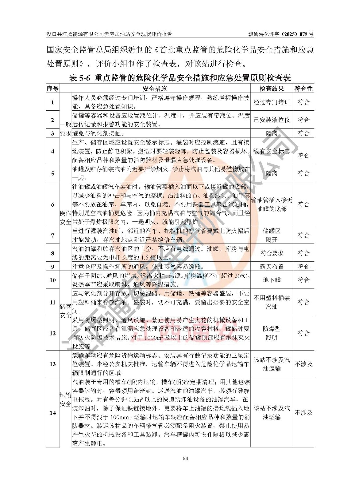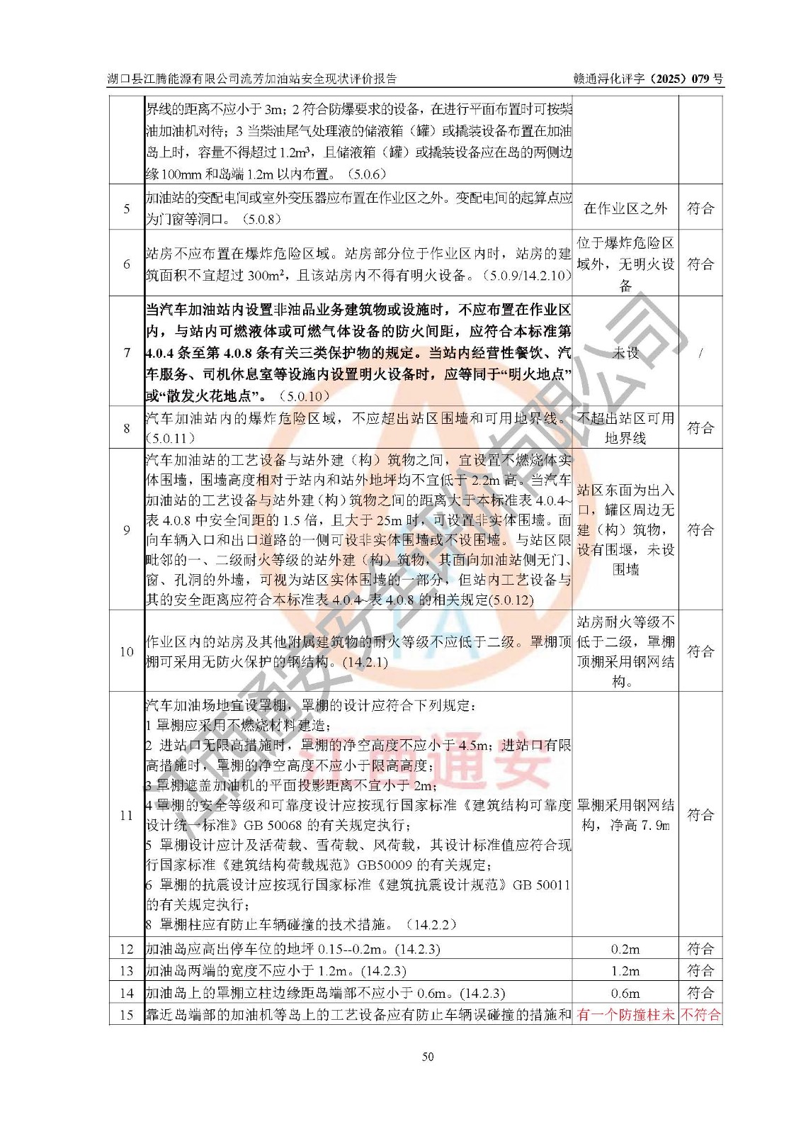 評(píng)價(jià)結(jié)論 | 湖口縣江騰能源有限公司流芳加油站涉及的安全條件、安全經(jīng)營(yíng)條件、安全生產(chǎn)管理符合《危險(xiǎn)化學(xué)品經(jīng)營(yíng)許可證管理辦法》、《汽車(chē)加油加氣加氫站技術(shù)標(biāo)準(zhǔn)》等**有關(guān)法規(guī)、標(biāo)準(zhǔn)、規(guī)范要求,能滿足危險(xiǎn)化學(xué)品經(jīng)營(yíng)安全條件。 | |||