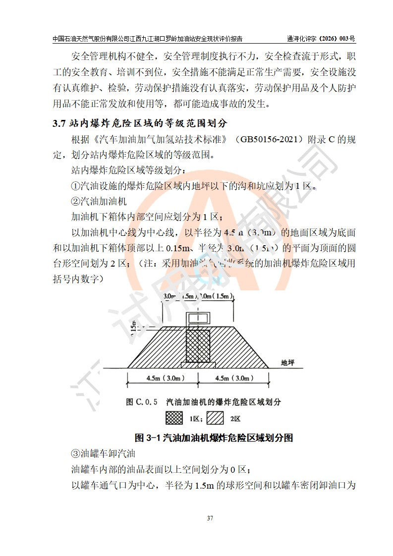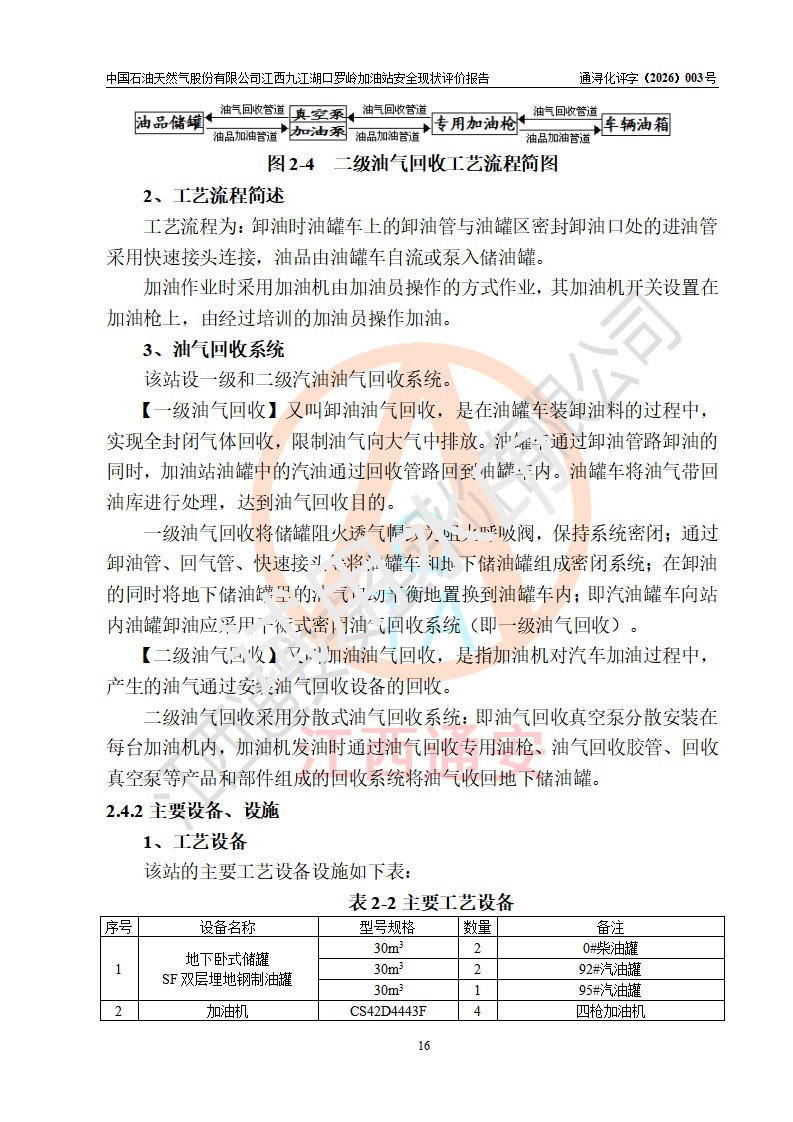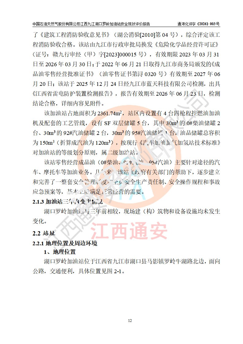項(xiàng)目簡(jiǎn)介 | 中國(guó)石油天然氣股份有限公司江西九江湖口羅嶺加油站是一家專門從事成品油零售經(jīng)營(yíng)的股份有限公司分公司(國(guó)有控股),經(jīng)營(yíng)場(chǎng)所位于江西省九江市湖口縣馬影鎮(zhèn)羅嶺牛湖路北邊。現(xiàn)有從業(yè)人員9名,其中安全管理人員1人,加油站負(fù)責(zé)人楊全榮。 該加油站占地面積為2361.74m2,站區(qū)內(nèi)設(shè)置有4臺(tái)四槍程控燃油加油機(jī)及配套的工藝管線,設(shè)有SF雙層儲(chǔ)罐5臺(tái),其中30m3的0#柴油儲(chǔ)罐2臺(tái)、30m3的92#汽油儲(chǔ)罐2臺(tái),30m3的95#汽油儲(chǔ)罐1臺(tái),油品儲(chǔ)罐總?cè)莘e為150m3(折算成汽油為120m3),按現(xiàn)行《汽車加油加氣加氫站技術(shù)標(biāo)準(zhǔn)》對(duì)加油站的等級(jí)劃分原則,屬二級(jí)加油站。 該站由九江市行政審批局換發(fā)《危險(xiǎn)化學(xué)品經(jīng)營(yíng)許可證》(證號(hào):贛九行審經(jīng)(甲)字[2023]000015號(hào)),**期限2023年03月31日至2026年03月30日。 | |||