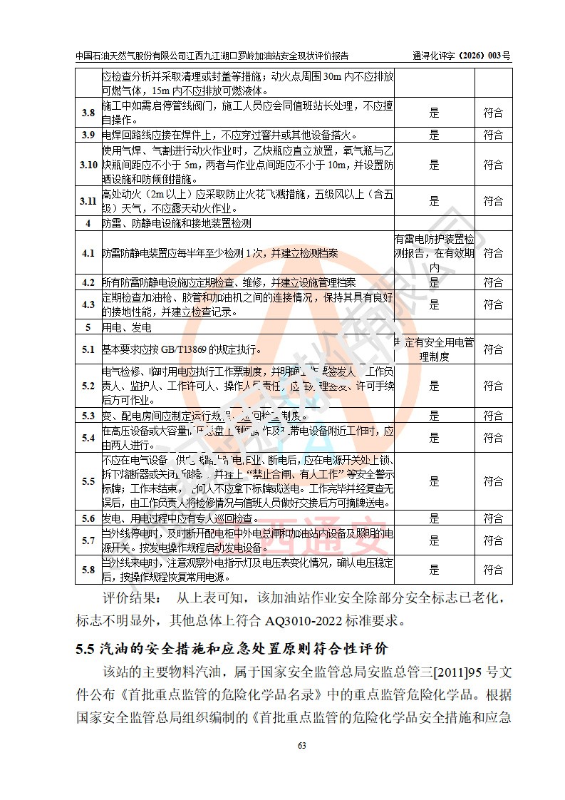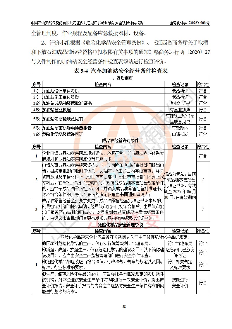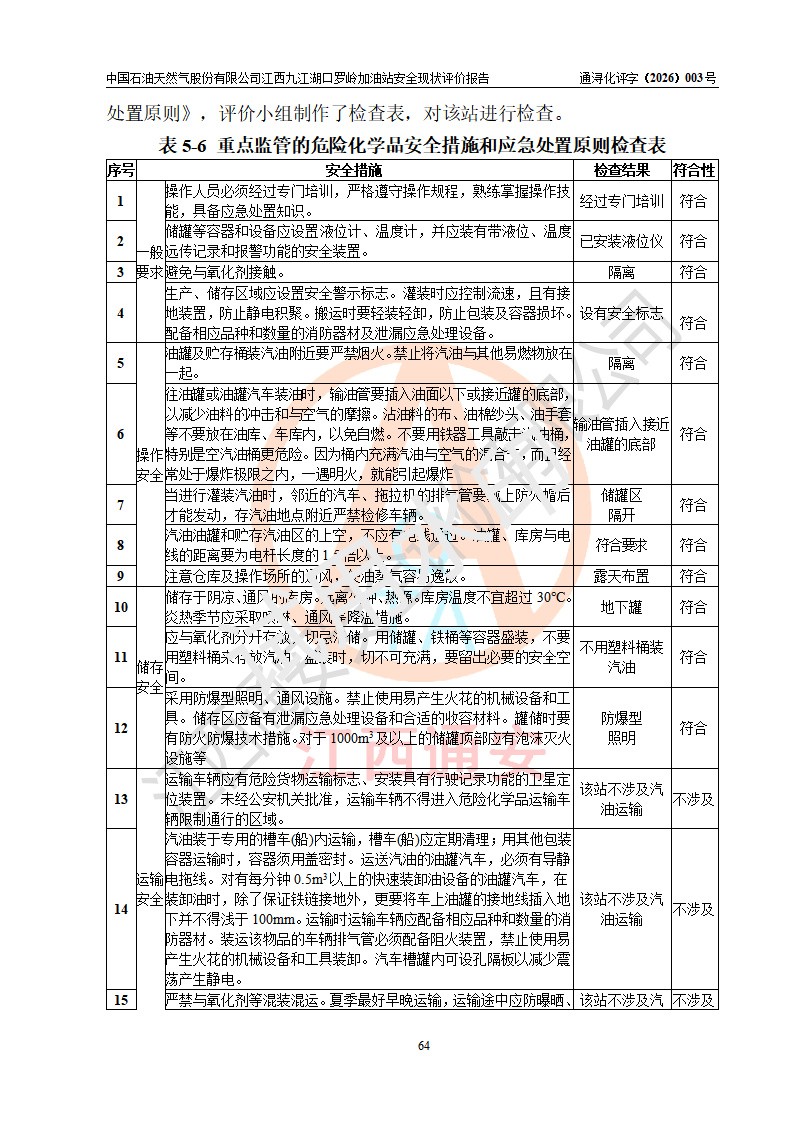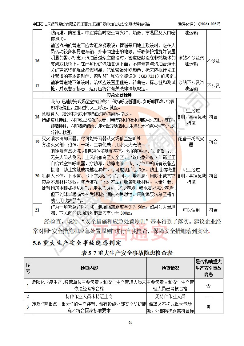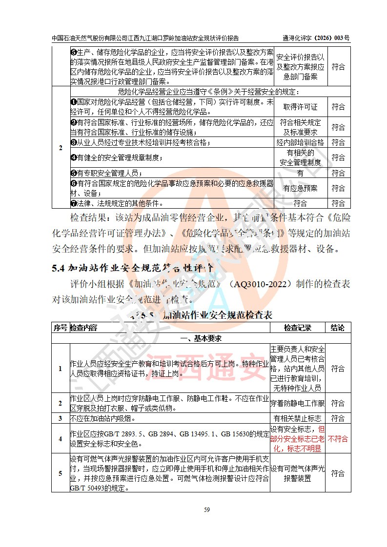 評(píng)價(jià)結(jié)論 | 中國(guó)石油天然氣股份有限公司江西九江湖口羅嶺加油站涉及的安全條件、安全經(jīng)營(yíng)條件、安全生產(chǎn)管理符合《危險(xiǎn)化學(xué)品經(jīng)營(yíng)許可證管理辦法》、《汽車加油加氣加氫站技術(shù)標(biāo)準(zhǔn)》等**有關(guān)法規(guī)、標(biāo)準(zhǔn)、規(guī)范要求,能滿足危險(xiǎn)化學(xué)品經(jīng)營(yíng)安全條件。 | |||