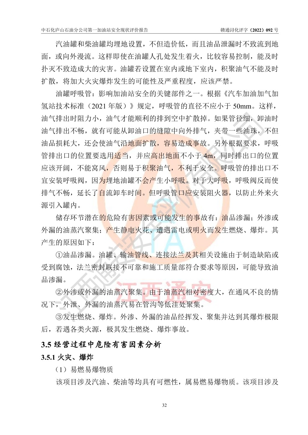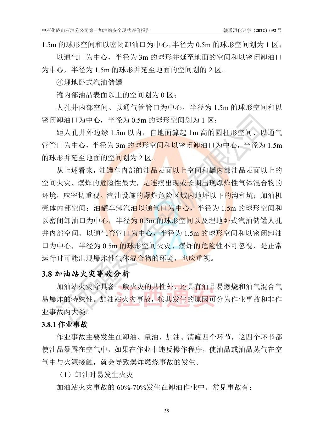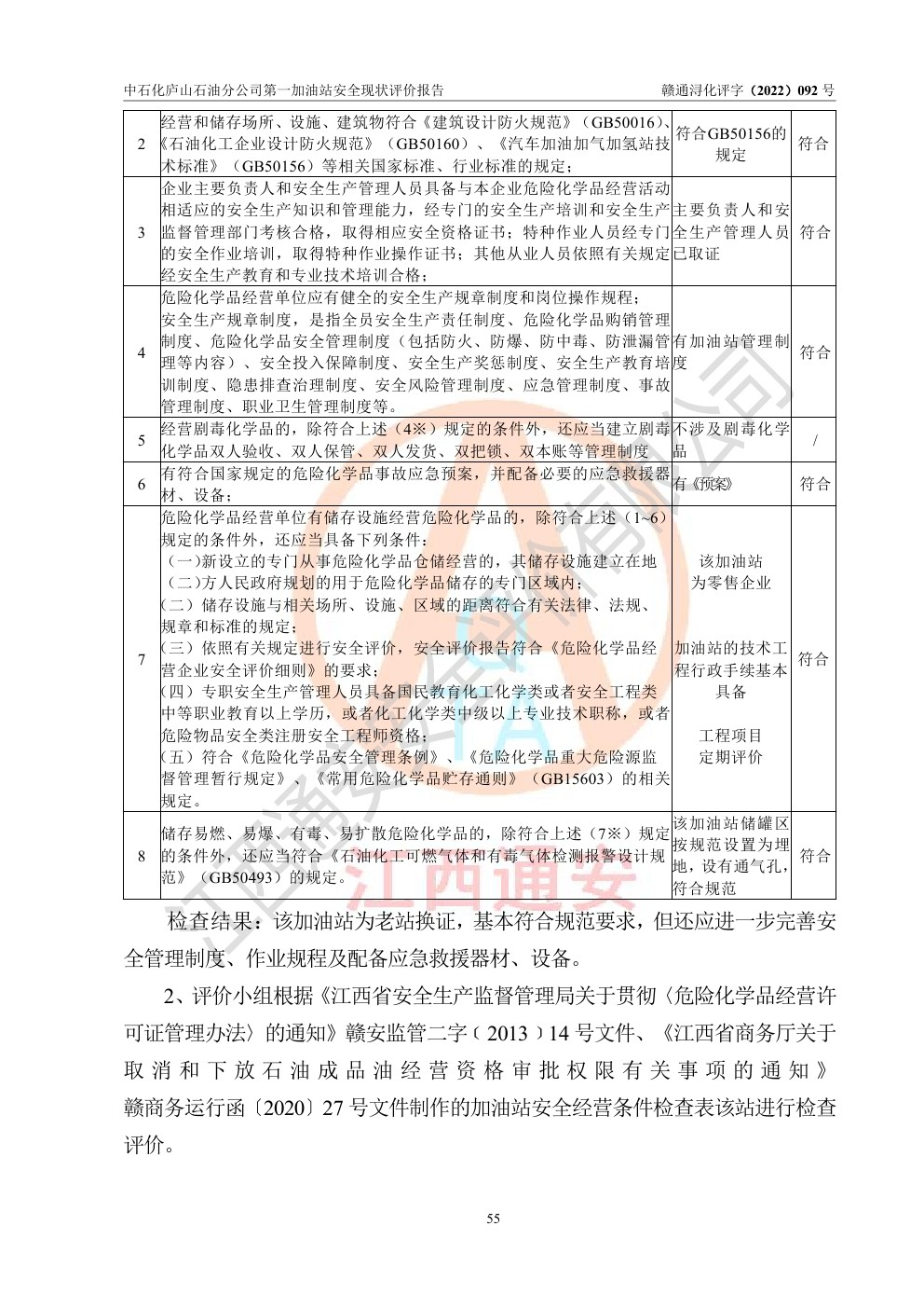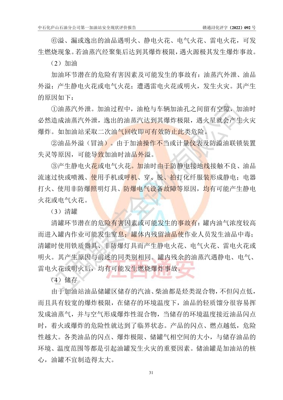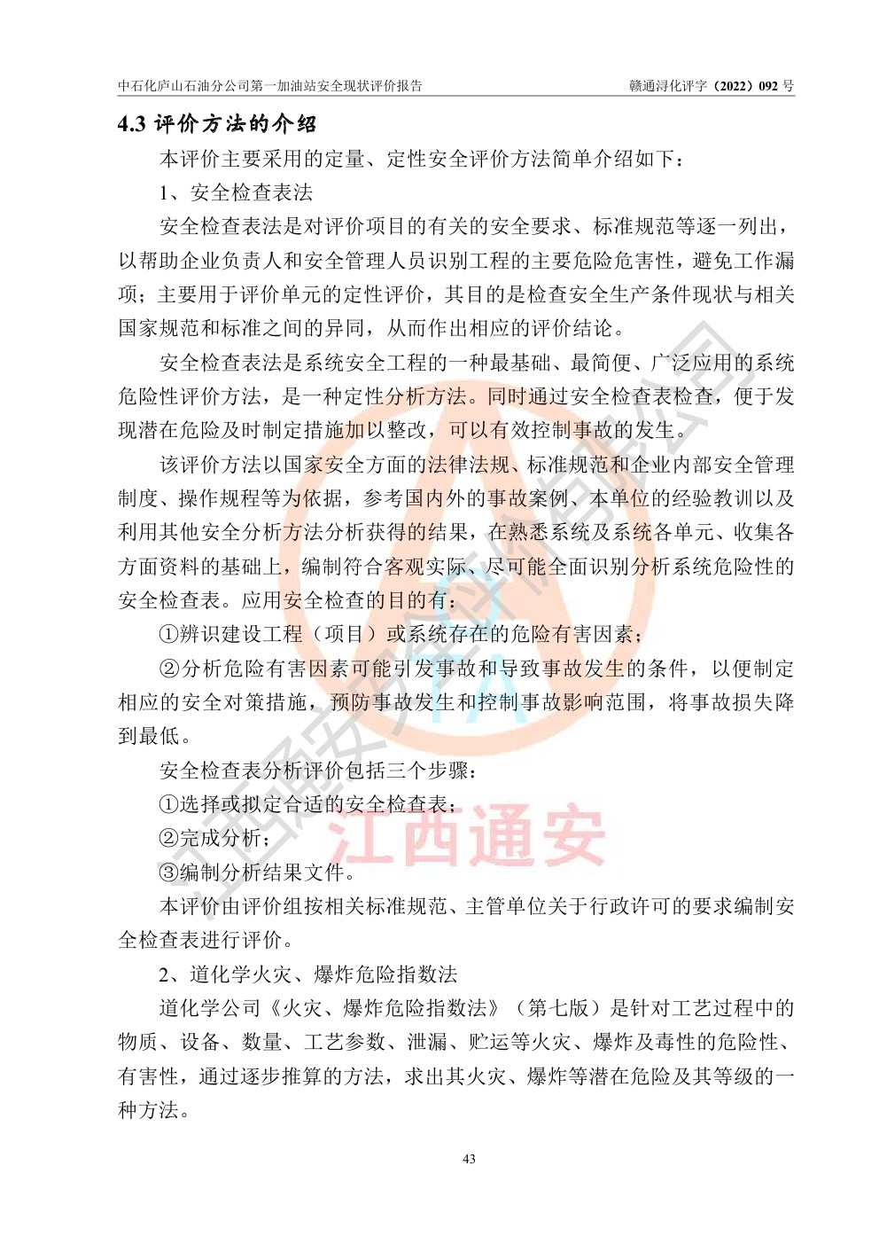 該企業(yè)屬三級加油站,主要從事成品油零售經(jīng)營,經(jīng)營的油品有0#柴油、92#汽油、95#汽油。 該項(xiàng)目為一功能集中的加油站,且設(shè)備設(shè)施集中在站區(qū)內(nèi),根據(jù)空間相對獨(dú)立、事故范圍相對固定、具有明顯特征界限的原則,評價(jià)小組確定將其劃分為一個評價(jià)單元。選擇安全檢查表法和危險(xiǎn)指數(shù)方法進(jìn)行評價(jià)。 1、加油站涉及的汽油、柴油屬于易燃液體,汽油屬于重點(diǎn)監(jiān)管的危險(xiǎn)化學(xué)品;不構(gòu)成《危險(xiǎn)化學(xué)品重大危險(xiǎn)源辨識》規(guī)定危險(xiǎn)化學(xué)品重大危險(xiǎn)源。 2、經(jīng)營過程中存在的主要危險(xiǎn)有:火災(zāi)、爆炸等。 3、中國石化銷售股份有限公司江西九江廬山石油分公司**加油站涉及的安全條件、安全經(jīng)營條件、安全生產(chǎn)管理符合《危險(xiǎn)化學(xué)品經(jīng)營許可證管理辦法》、《汽車加油加氣加氫站技術(shù)標(biāo)準(zhǔn)》等**有關(guān)法規(guī)、標(biāo)準(zhǔn)、規(guī)范要求,能滿足危險(xiǎn)化學(xué)品經(jīng)營安全條件。 |