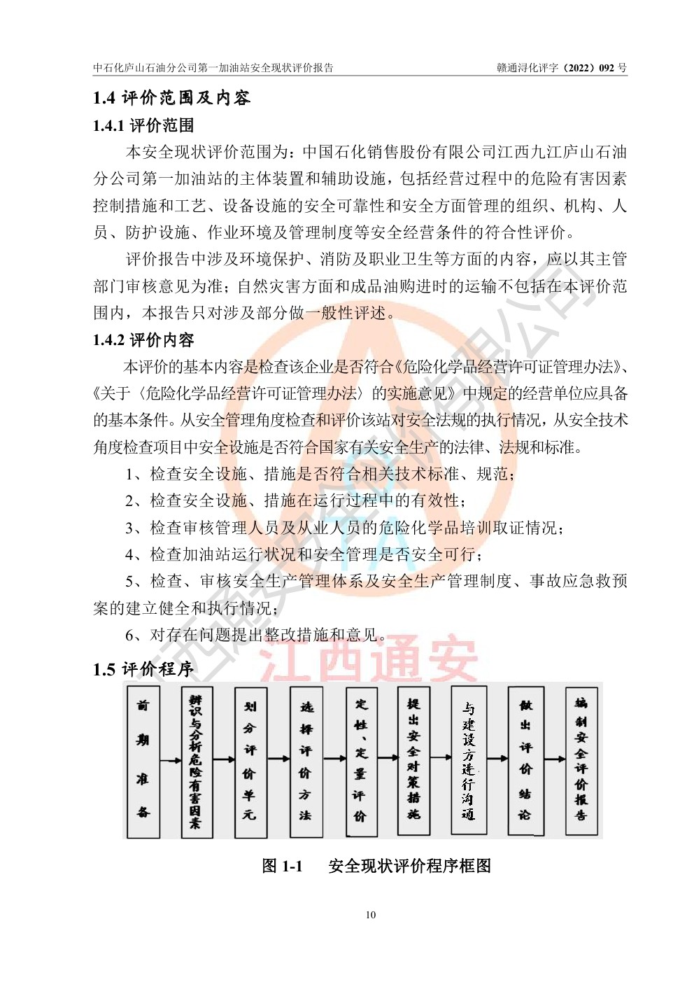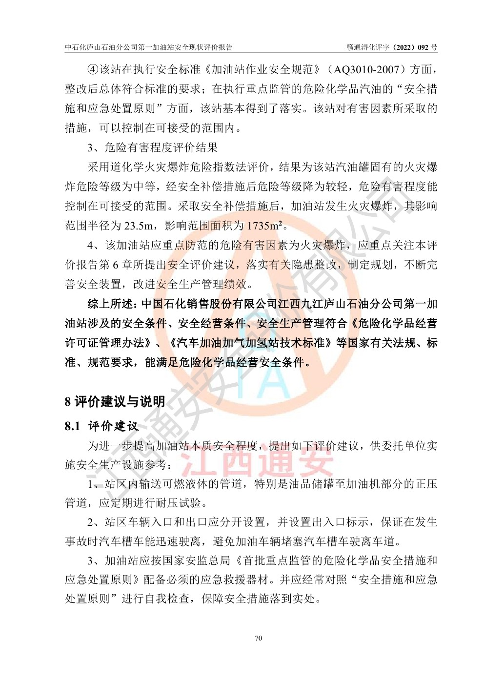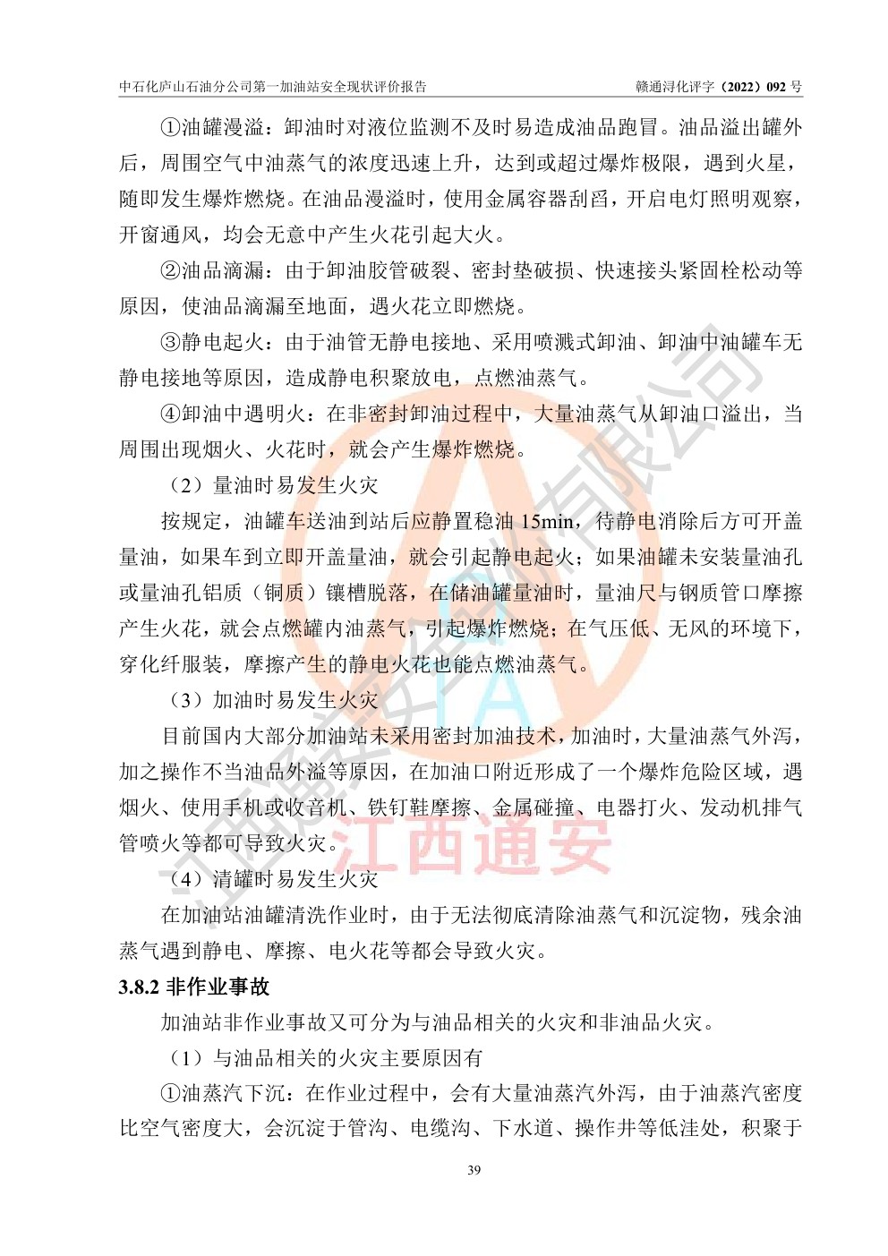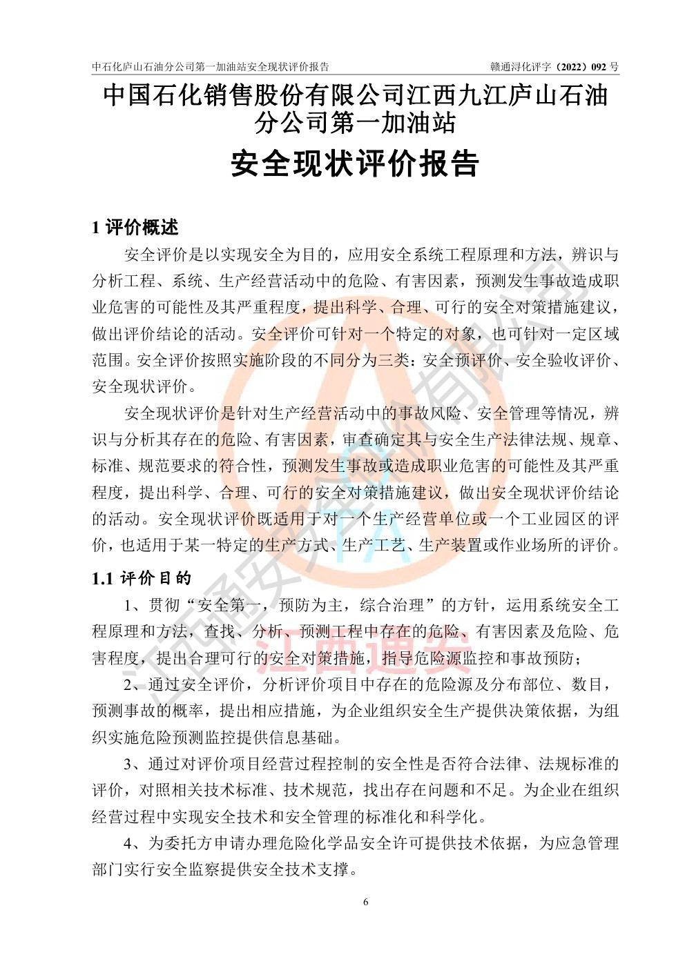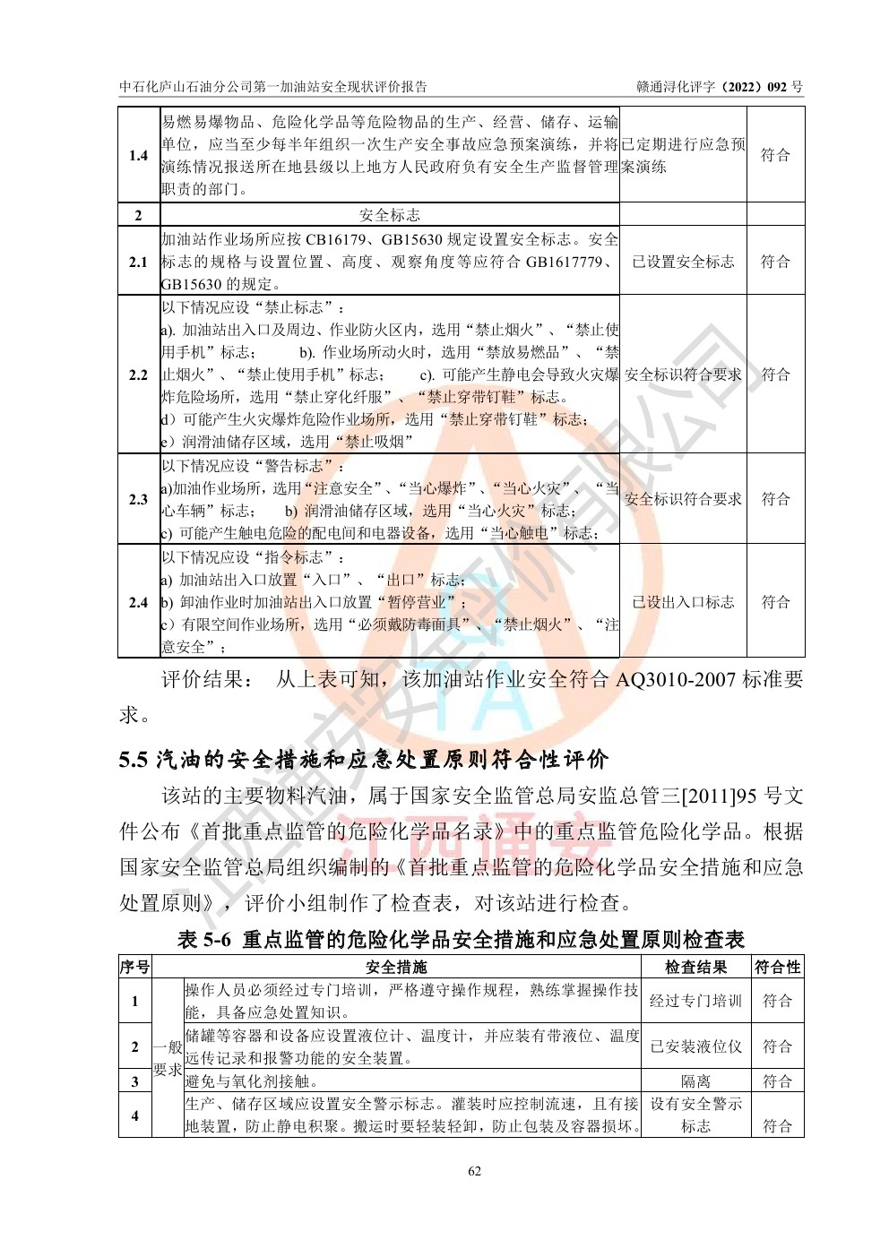 該企業(yè)屬三級加油站,主要從事成品油零售經(jīng)營,經(jīng)營的油品有0#柴油、92#汽油、95#汽油。 該項(xiàng)目為一功能集中的加油站,且設(shè)備設(shè)施集中在站區(qū)內(nèi),根據(jù)空間相對獨(dú)立、事故范圍相對固定、具有明顯特征界限的原則,評價(jià)小組確定將其劃分為一個評價(jià)單元。選擇安全檢查表法和危險(xiǎn)指數(shù)方法進(jìn)行評價(jià)。 1、加油站涉及的汽油、柴油屬于易燃液體,汽油屬于重點(diǎn)監(jiān)管的危險(xiǎn)化學(xué)品;不構(gòu)成《危險(xiǎn)化學(xué)品重大危險(xiǎn)源辨識》規(guī)定危險(xiǎn)化學(xué)品重大危險(xiǎn)源。 2、經(jīng)營過程中存在的主要危險(xiǎn)有:火災(zāi)、爆炸等。 3、中國石化銷售股份有限公司江西九江廬山石油分公司**加油站涉及的安全條件、安全經(jīng)營條件、安全生產(chǎn)管理符合《危險(xiǎn)化學(xué)品經(jīng)營許可證管理辦法》、《汽車加油加氣加氫站技術(shù)標(biāo)準(zhǔn)》等**有關(guān)法規(guī)、標(biāo)準(zhǔn)、規(guī)范要求,能滿足危險(xiǎn)化學(xué)品經(jīng)營安全條件。 |