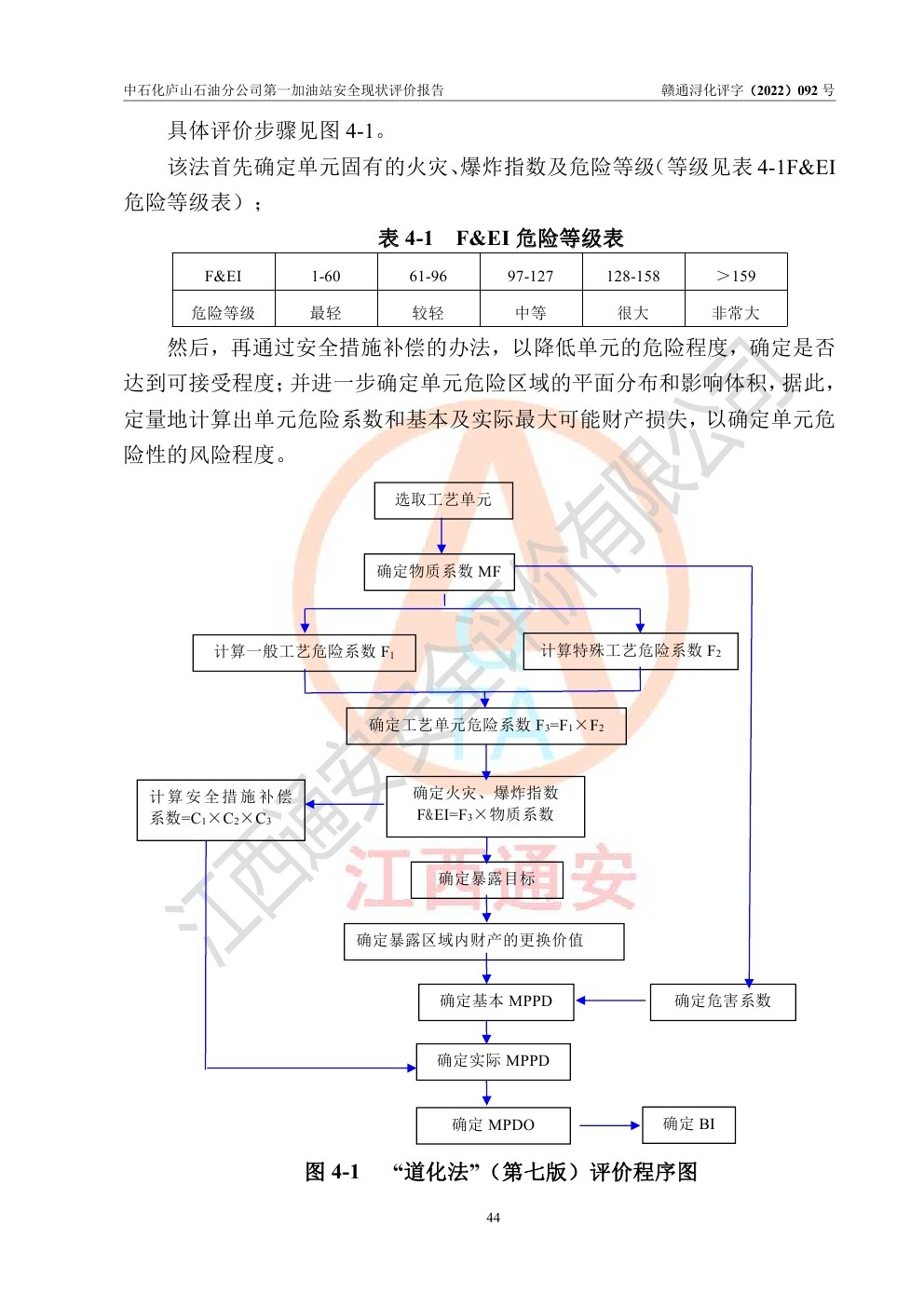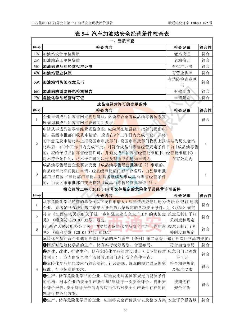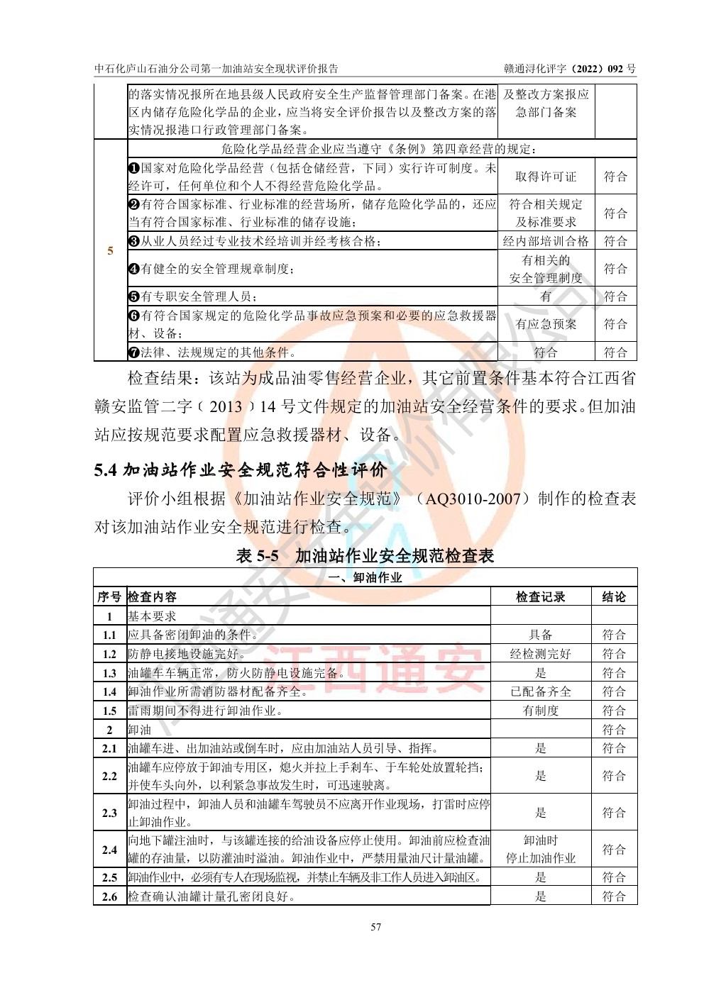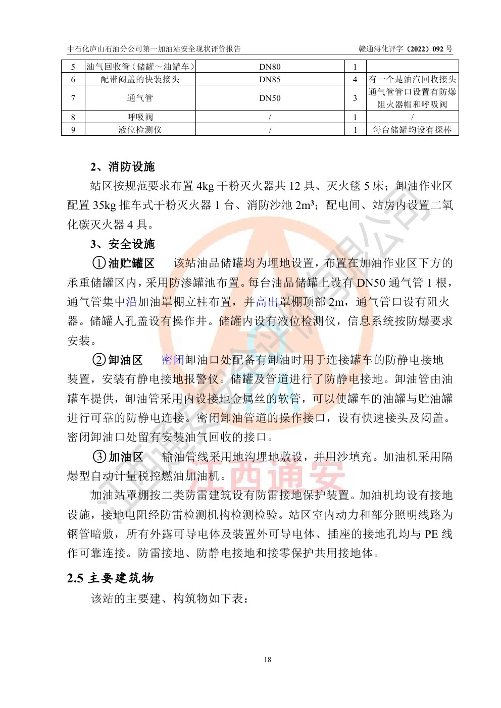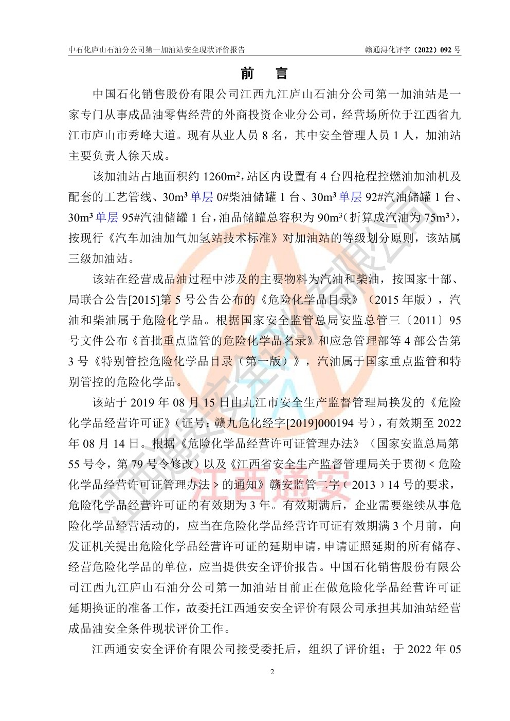 該企業(yè)屬三級加油站,主要從事成品油零售經(jīng)營,經(jīng)營的油品有0#柴油、92#汽油、95#汽油。 該項(xiàng)目為一功能集中的加油站,且設(shè)備設(shè)施集中在站區(qū)內(nèi),根據(jù)空間相對獨(dú)立、事故范圍相對固定、具有明顯特征界限的原則,評價(jià)小組確定將其劃分為一個評價(jià)單元。選擇安全檢查表法和危險(xiǎn)指數(shù)方法進(jìn)行評價(jià)。 1、加油站涉及的汽油、柴油屬于易燃液體,汽油屬于重點(diǎn)監(jiān)管的危險(xiǎn)化學(xué)品;不構(gòu)成《危險(xiǎn)化學(xué)品重大危險(xiǎn)源辨識》規(guī)定危險(xiǎn)化學(xué)品重大危險(xiǎn)源。 2、經(jīng)營過程中存在的主要危險(xiǎn)有:火災(zāi)、爆炸等。 3、中國石化銷售股份有限公司江西九江廬山石油分公司**加油站涉及的安全條件、安全經(jīng)營條件、安全生產(chǎn)管理符合《危險(xiǎn)化學(xué)品經(jīng)營許可證管理辦法》、《汽車加油加氣加氫站技術(shù)標(biāo)準(zhǔn)》等**有關(guān)法規(guī)、標(biāo)準(zhǔn)、規(guī)范要求,能滿足危險(xiǎn)化學(xué)品經(jīng)營安全條件。 |