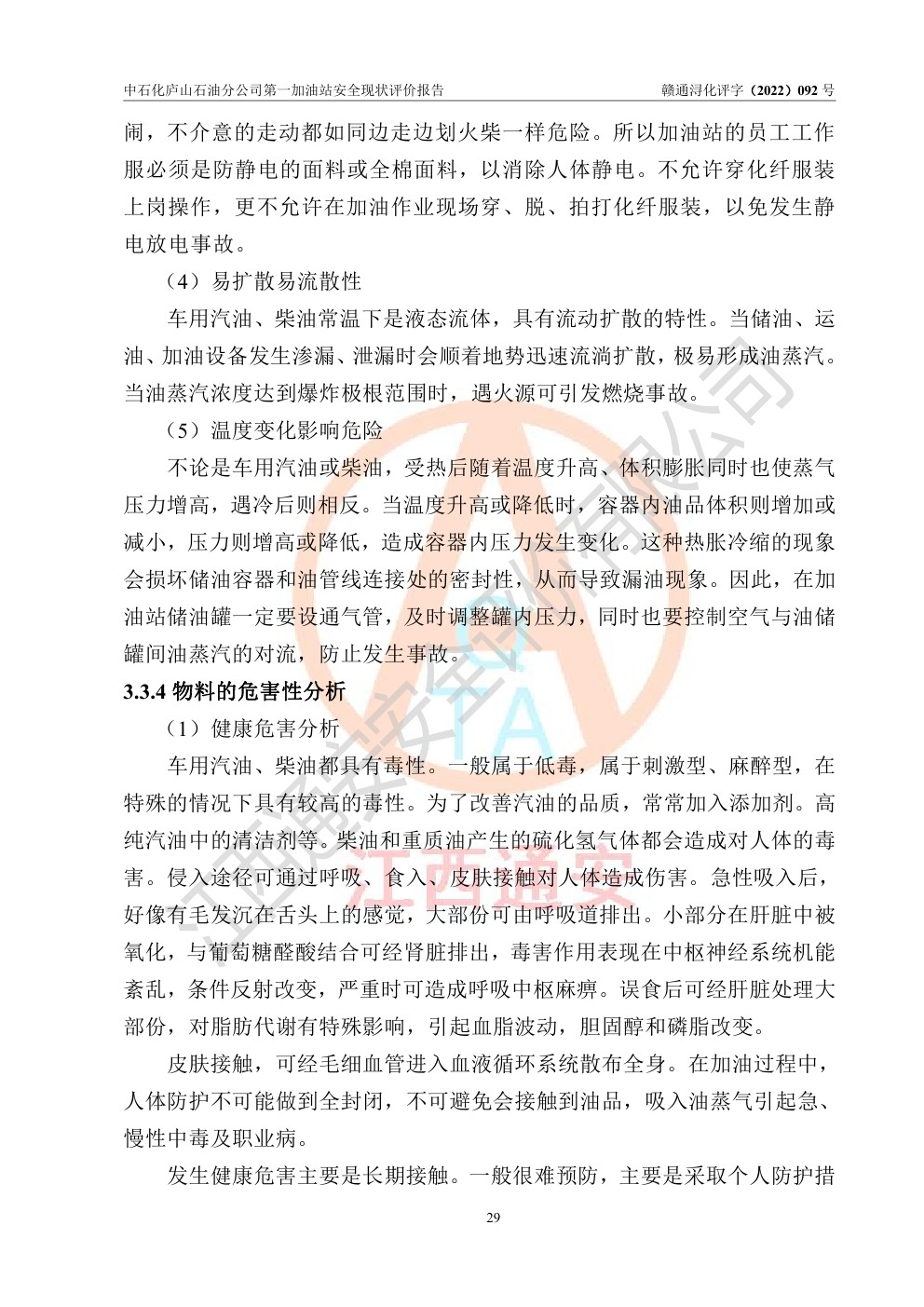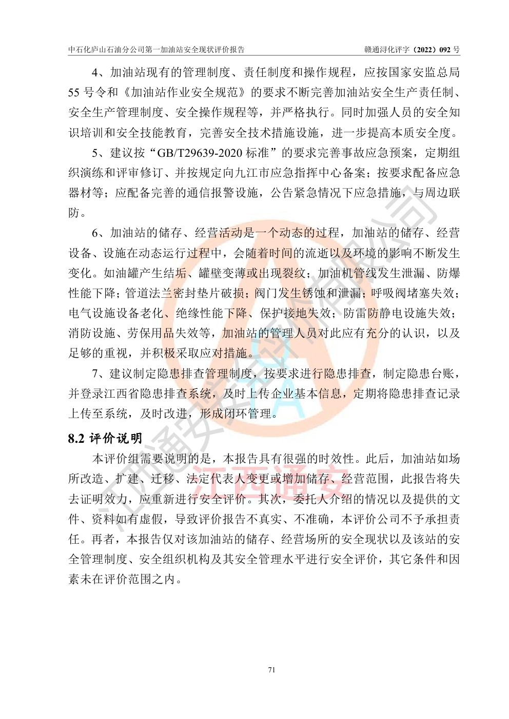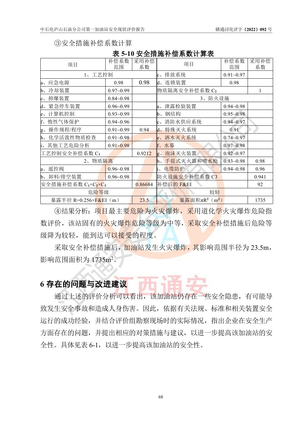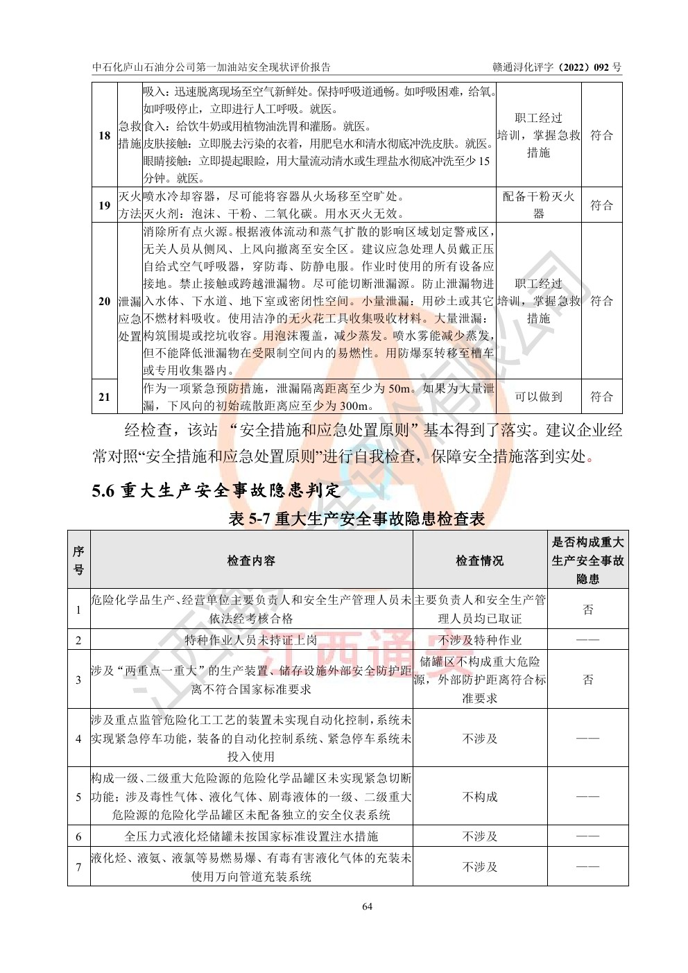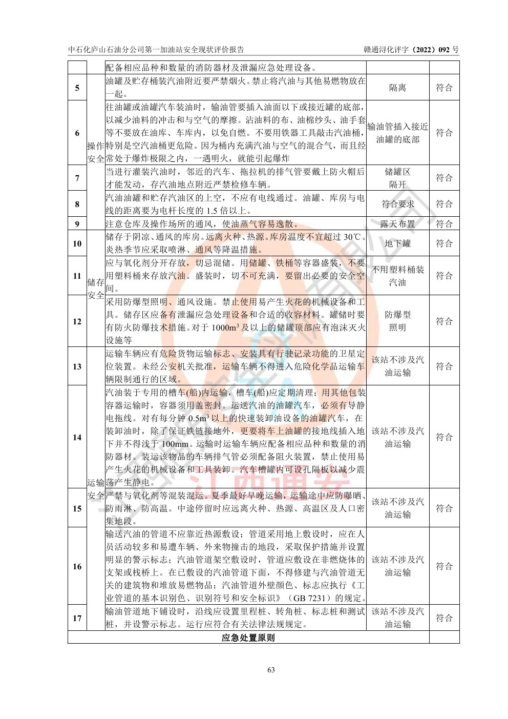 該企業(yè)屬三級加油站,主要從事成品油零售經(jīng)營,經(jīng)營的油品有0#柴油、92#汽油、95#汽油。 該項(xiàng)目為一功能集中的加油站,且設(shè)備設(shè)施集中在站區(qū)內(nèi),根據(jù)空間相對獨(dú)立、事故范圍相對固定、具有明顯特征界限的原則,評價(jià)小組確定將其劃分為一個評價(jià)單元。選擇安全檢查表法和危險(xiǎn)指數(shù)方法進(jìn)行評價(jià)。 1、加油站涉及的汽油、柴油屬于易燃液體,汽油屬于重點(diǎn)監(jiān)管的危險(xiǎn)化學(xué)品;不構(gòu)成《危險(xiǎn)化學(xué)品重大危險(xiǎn)源辨識》規(guī)定危險(xiǎn)化學(xué)品重大危險(xiǎn)源。 2、經(jīng)營過程中存在的主要危險(xiǎn)有:火災(zāi)、爆炸等。 3、中國石化銷售股份有限公司江西九江廬山石油分公司**加油站涉及的安全條件、安全經(jīng)營條件、安全生產(chǎn)管理符合《危險(xiǎn)化學(xué)品經(jīng)營許可證管理辦法》、《汽車加油加氣加氫站技術(shù)標(biāo)準(zhǔn)》等**有關(guān)法規(guī)、標(biāo)準(zhǔn)、規(guī)范要求,能滿足危險(xiǎn)化學(xué)品經(jīng)營安全條件。 |
