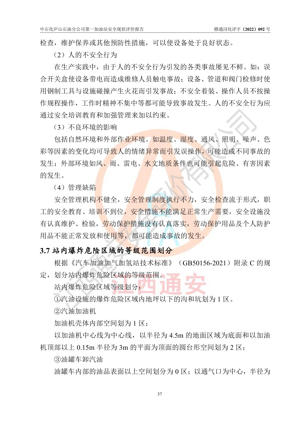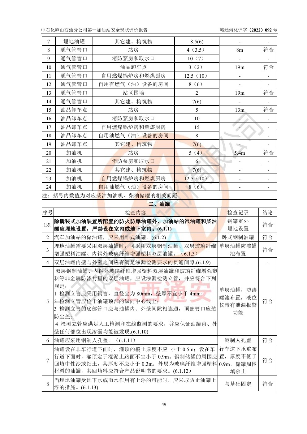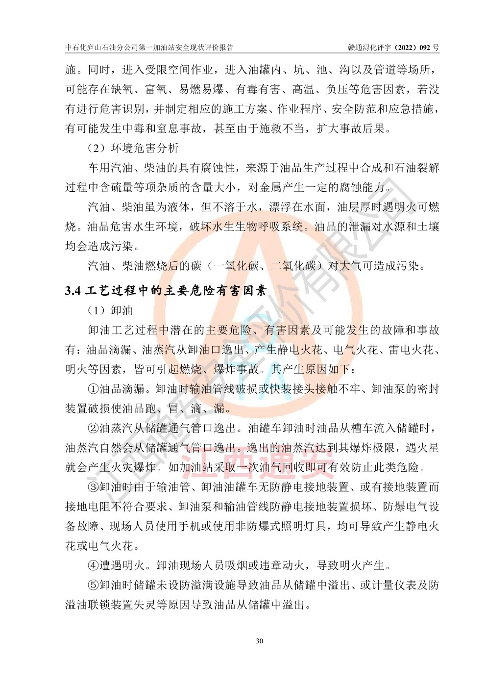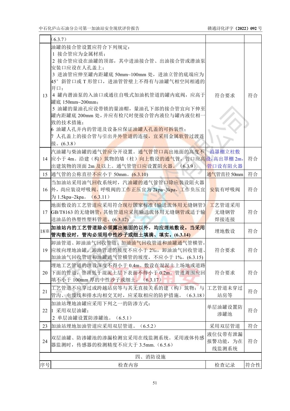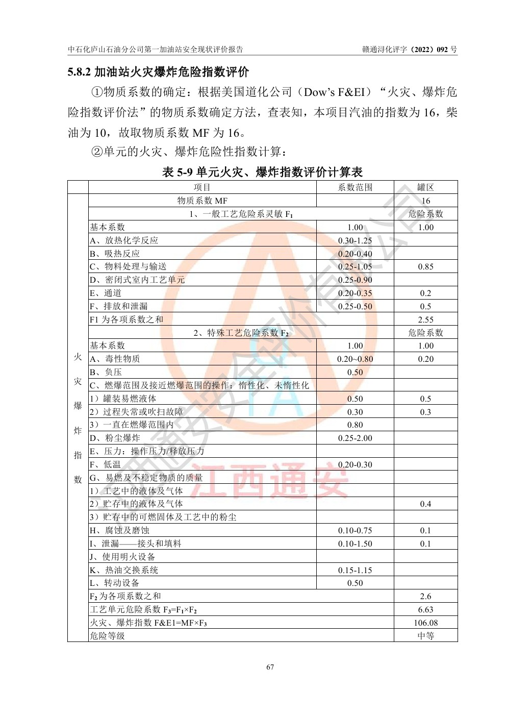 該企業(yè)屬三級加油站,主要從事成品油零售經(jīng)營,經(jīng)營的油品有0#柴油、92#汽油、95#汽油。 該項(xiàng)目為一功能集中的加油站,且設(shè)備設(shè)施集中在站區(qū)內(nèi),根據(jù)空間相對獨(dú)立、事故范圍相對固定、具有明顯特征界限的原則,評價(jià)小組確定將其劃分為一個評價(jià)單元。選擇安全檢查表法和危險(xiǎn)指數(shù)方法進(jìn)行評價(jià)。 1、加油站涉及的汽油、柴油屬于易燃液體,汽油屬于重點(diǎn)監(jiān)管的危險(xiǎn)化學(xué)品;不構(gòu)成《危險(xiǎn)化學(xué)品重大危險(xiǎn)源辨識》規(guī)定危險(xiǎn)化學(xué)品重大危險(xiǎn)源。 2、經(jīng)營過程中存在的主要危險(xiǎn)有:火災(zāi)、爆炸等。 3、中國石化銷售股份有限公司江西九江廬山石油分公司**加油站涉及的安全條件、安全經(jīng)營條件、安全生產(chǎn)管理符合《危險(xiǎn)化學(xué)品經(jīng)營許可證管理辦法》、《汽車加油加氣加氫站技術(shù)標(biāo)準(zhǔn)》等**有關(guān)法規(guī)、標(biāo)準(zhǔn)、規(guī)范要求,能滿足危險(xiǎn)化學(xué)品經(jīng)營安全條件。 |